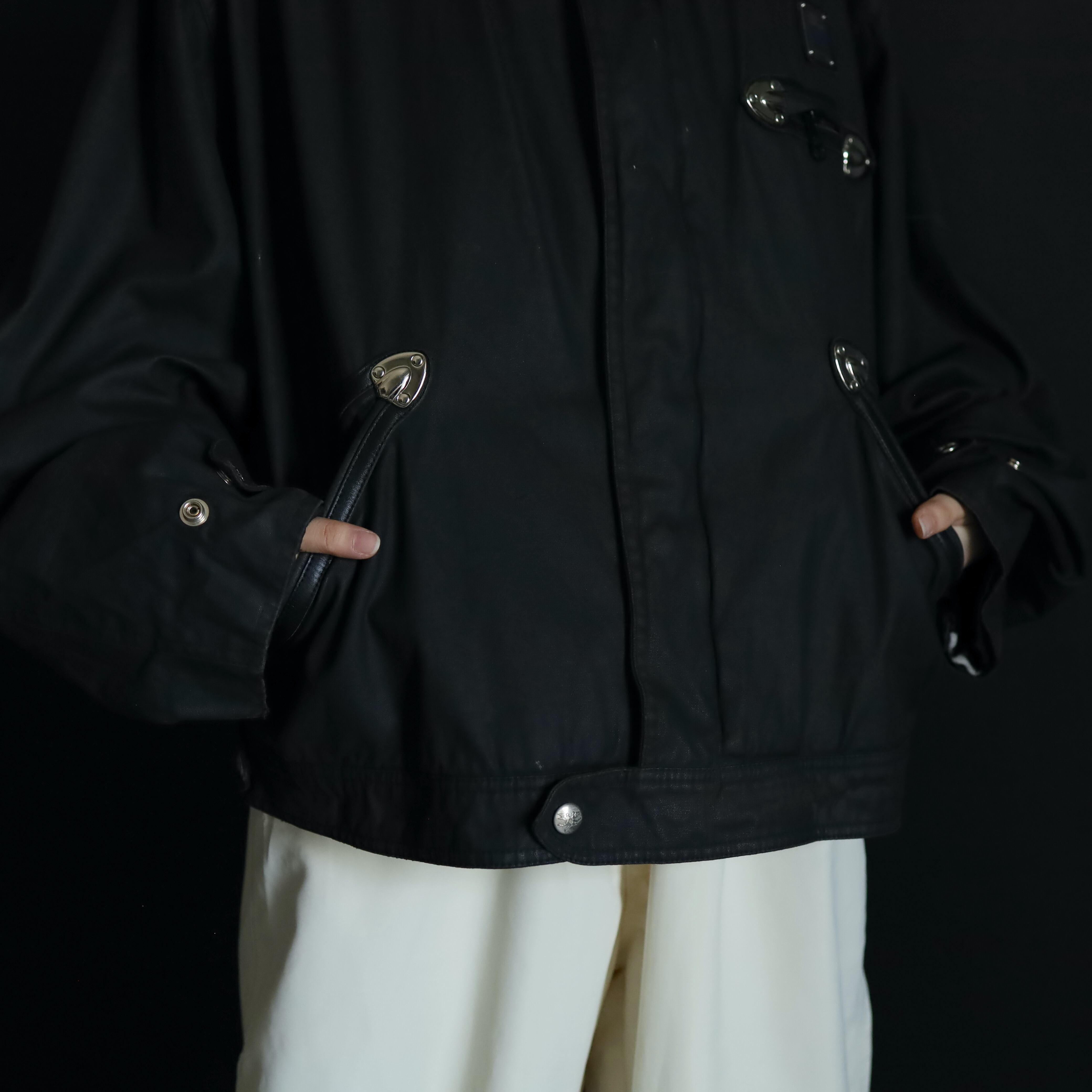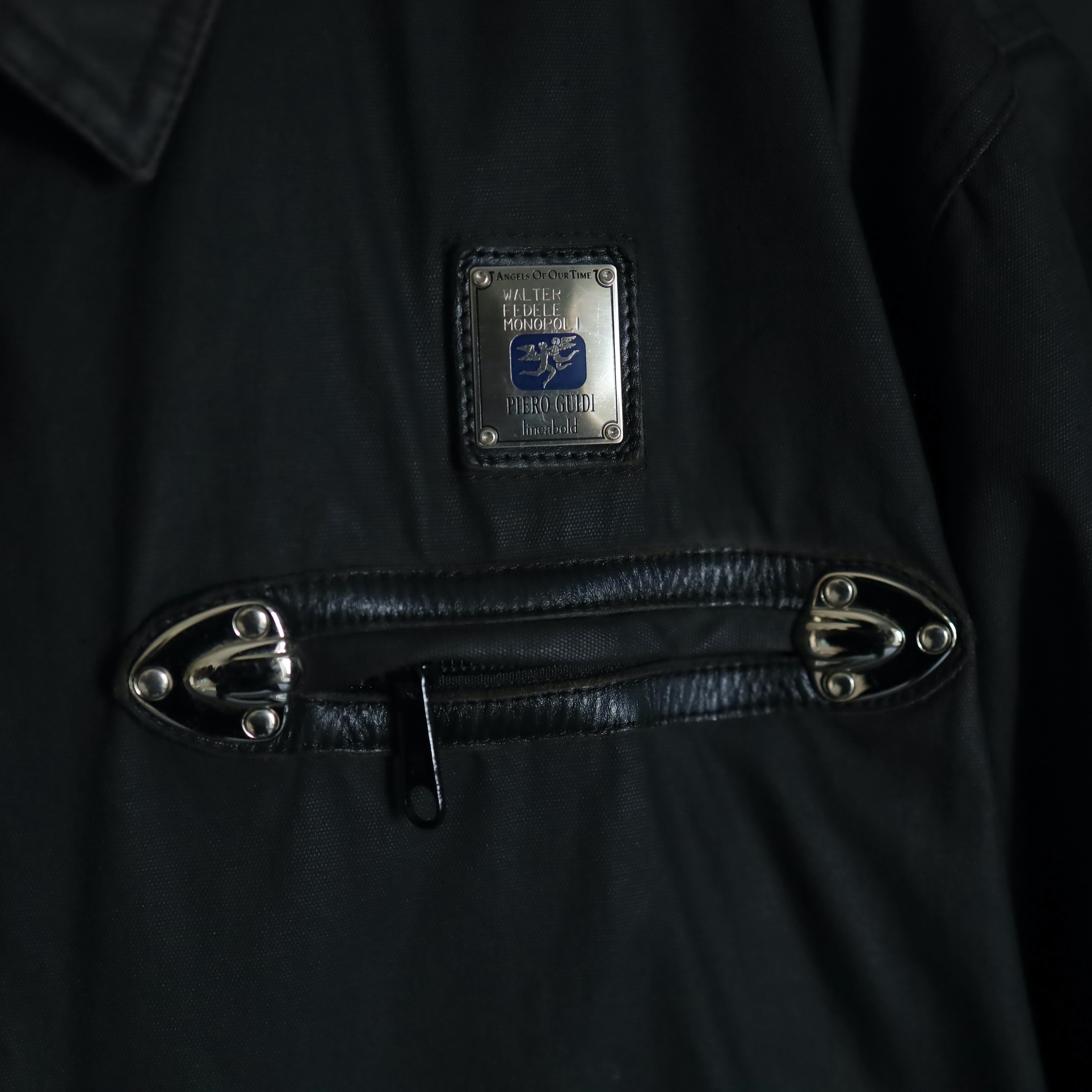 ポケットはクレセントポケット風にレザーで縁取り,両端はシルバーの留め具が埋め込まれたデザイン.