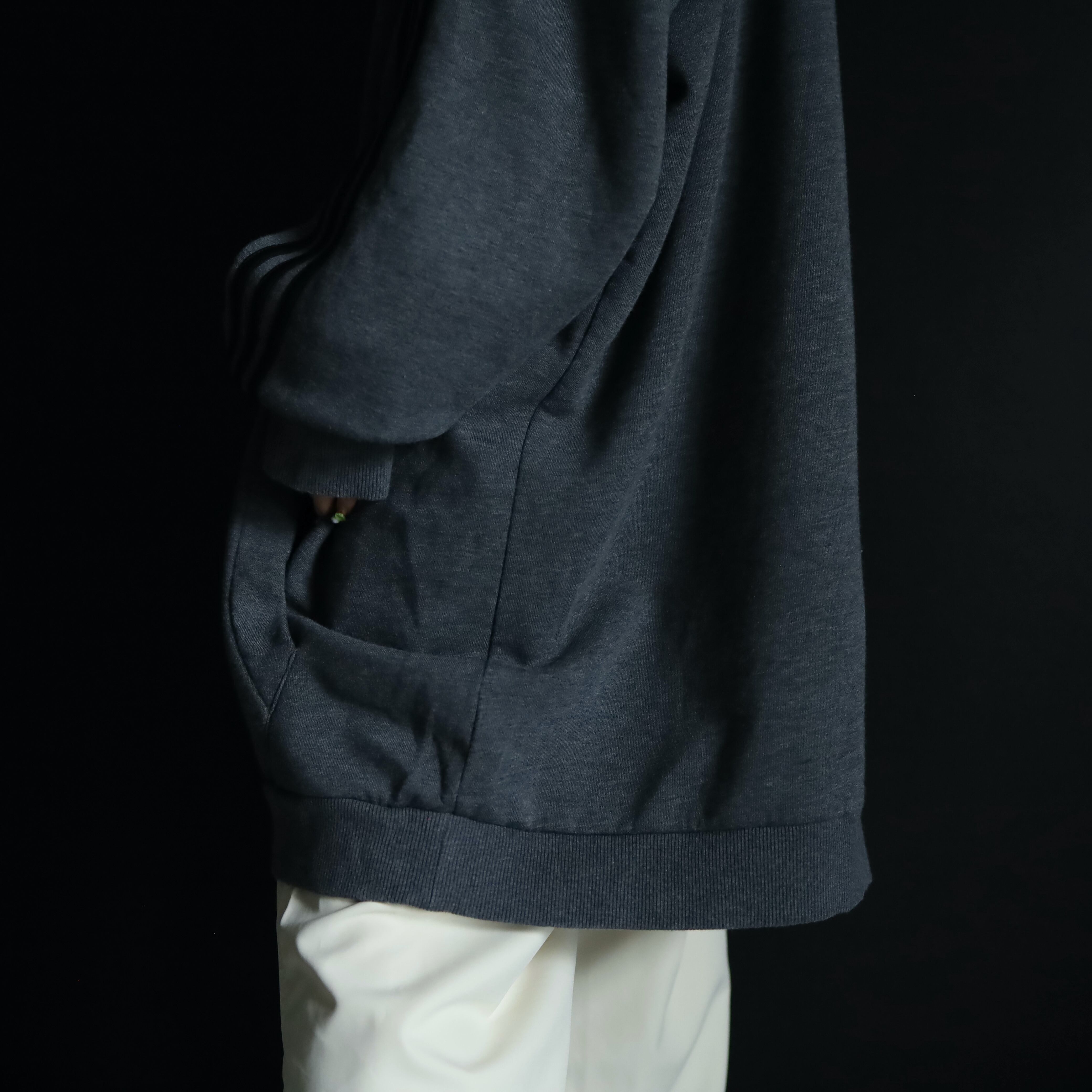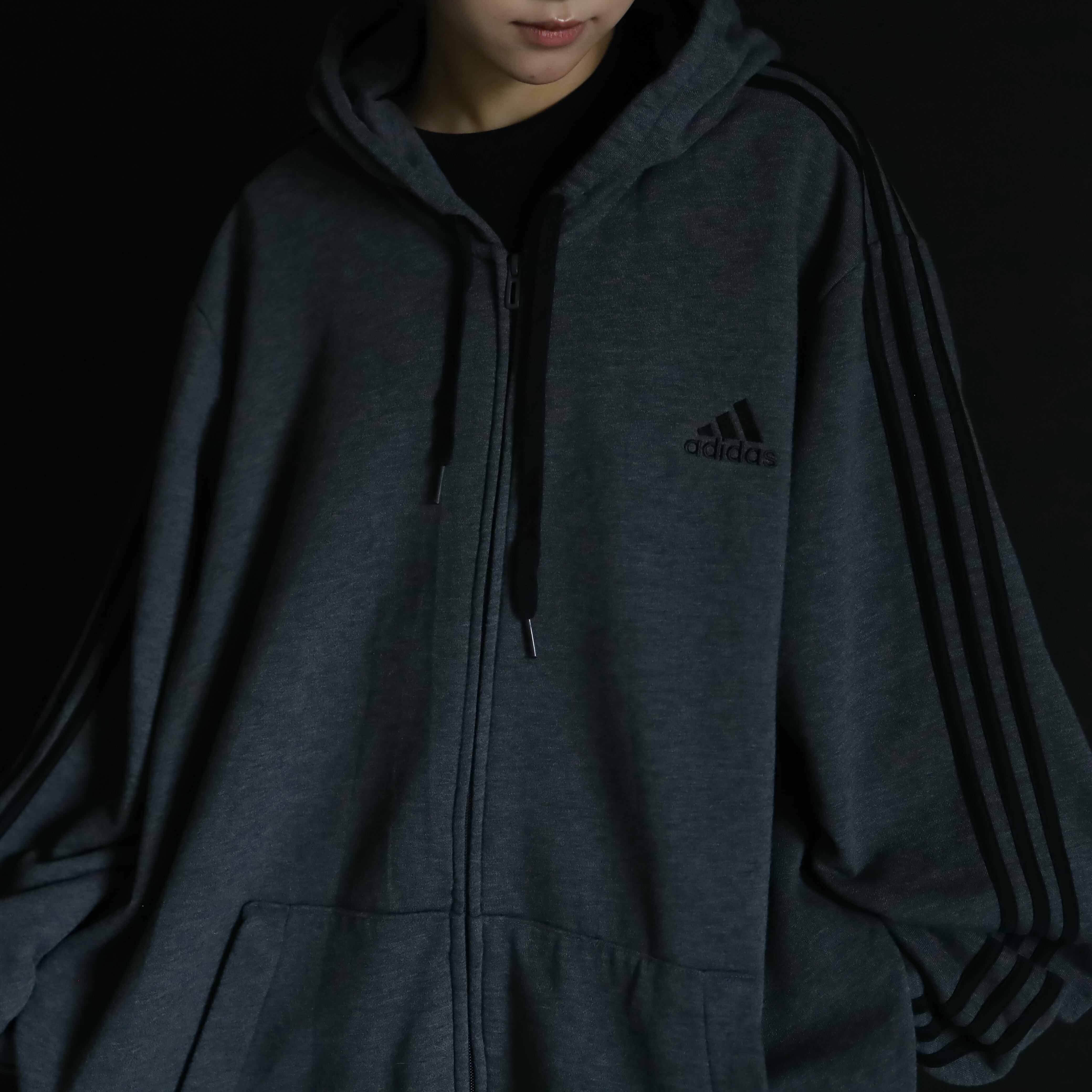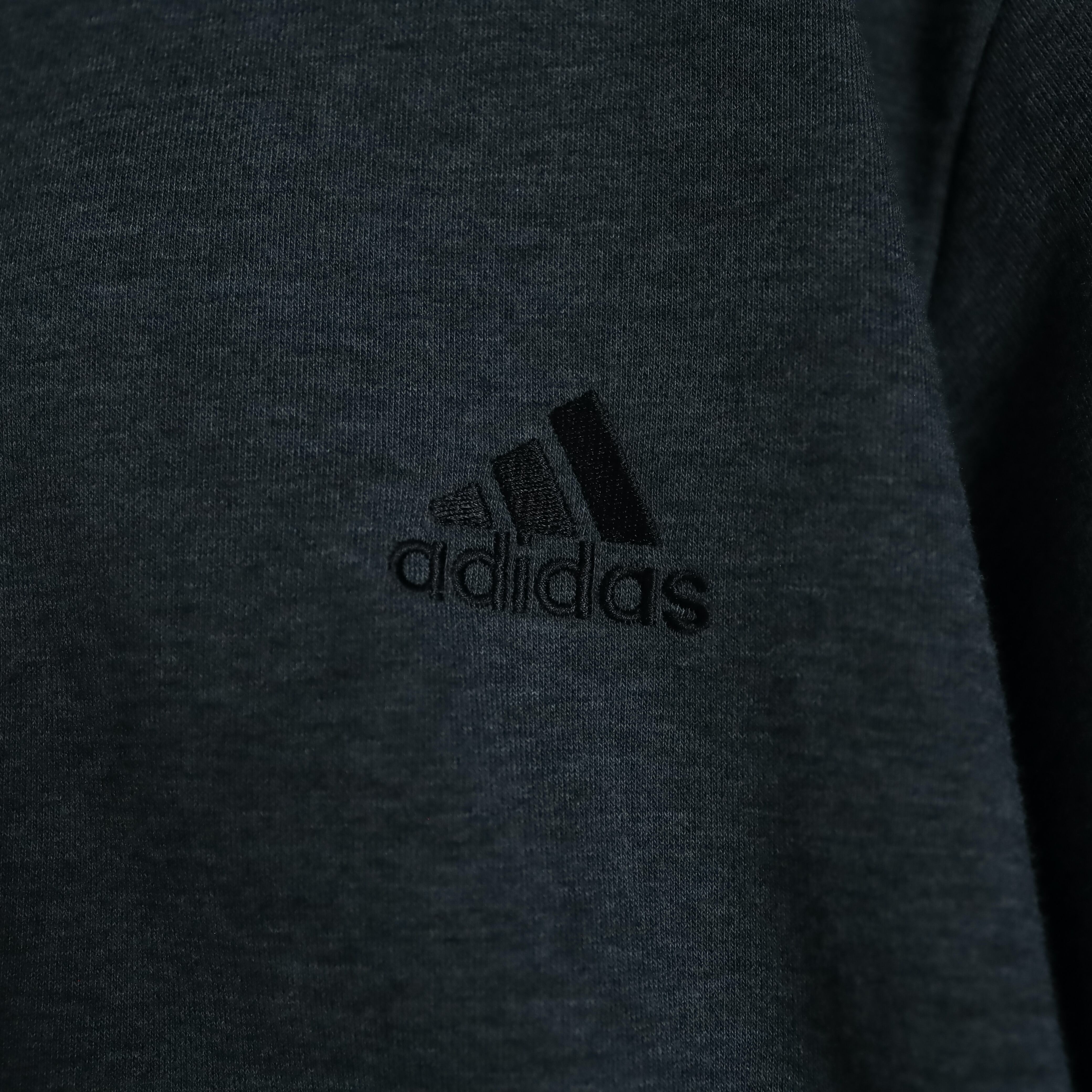 やや深めのトーンのグレーカラースウェットをベースに,左胸にadidasパフォーマンスロゴ刺繍.