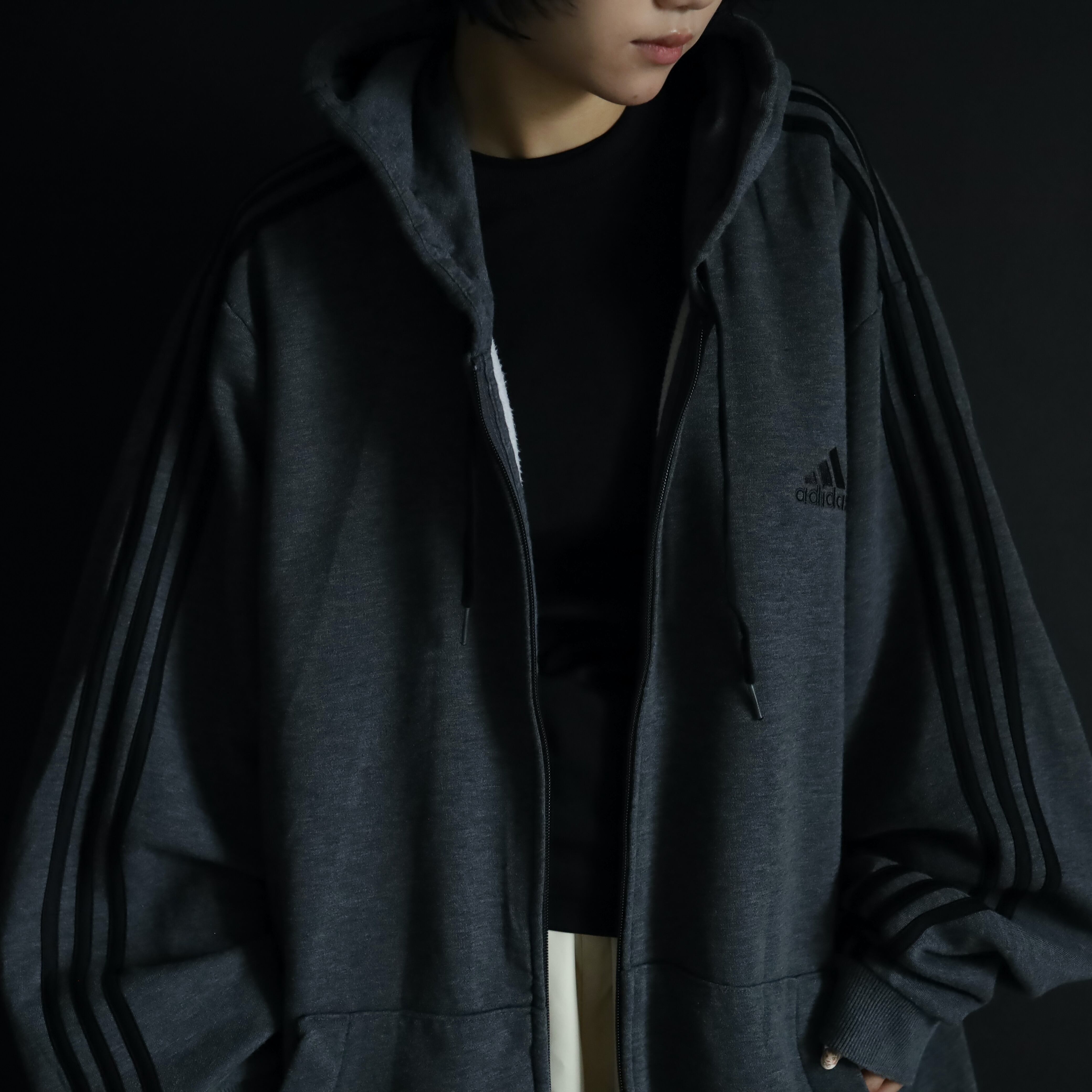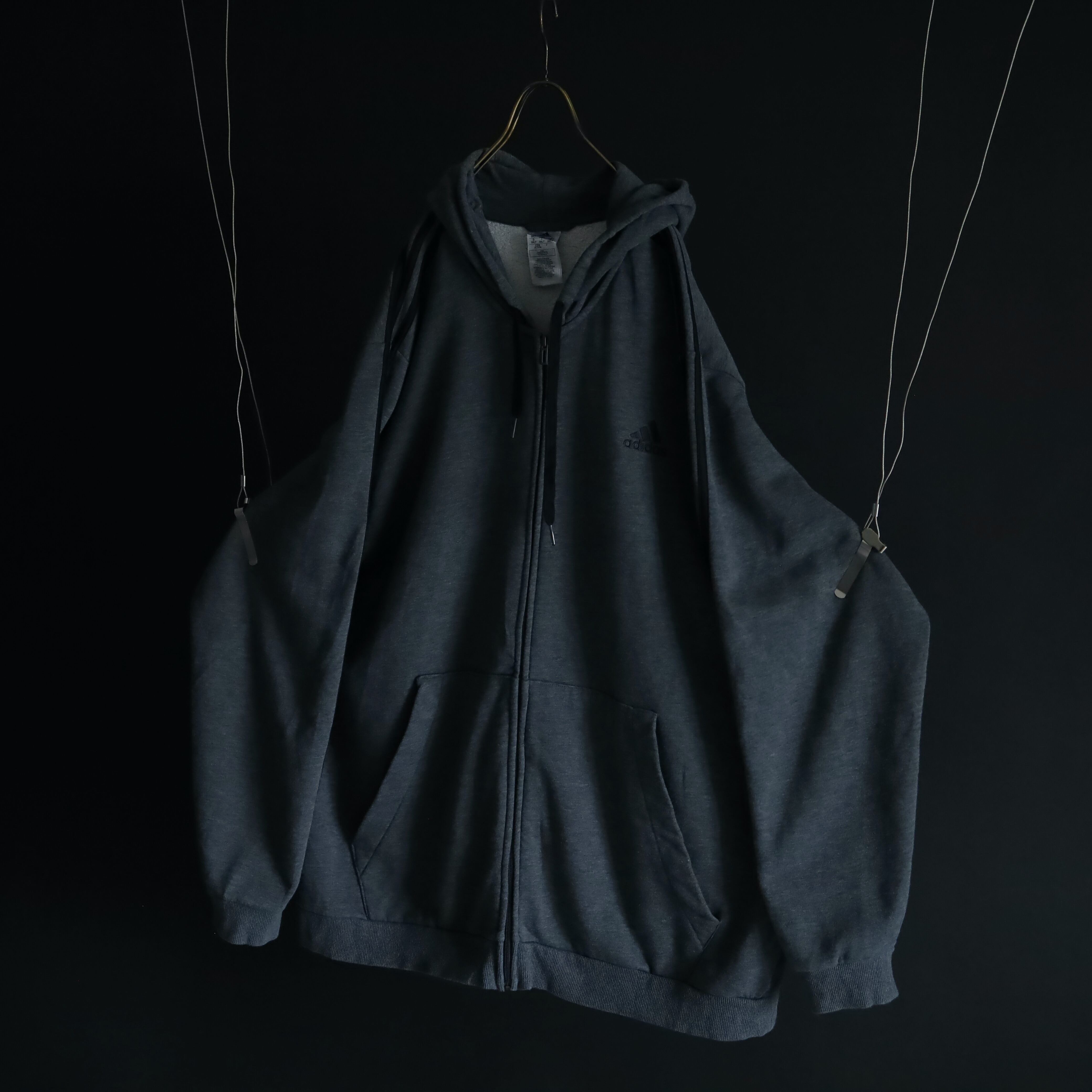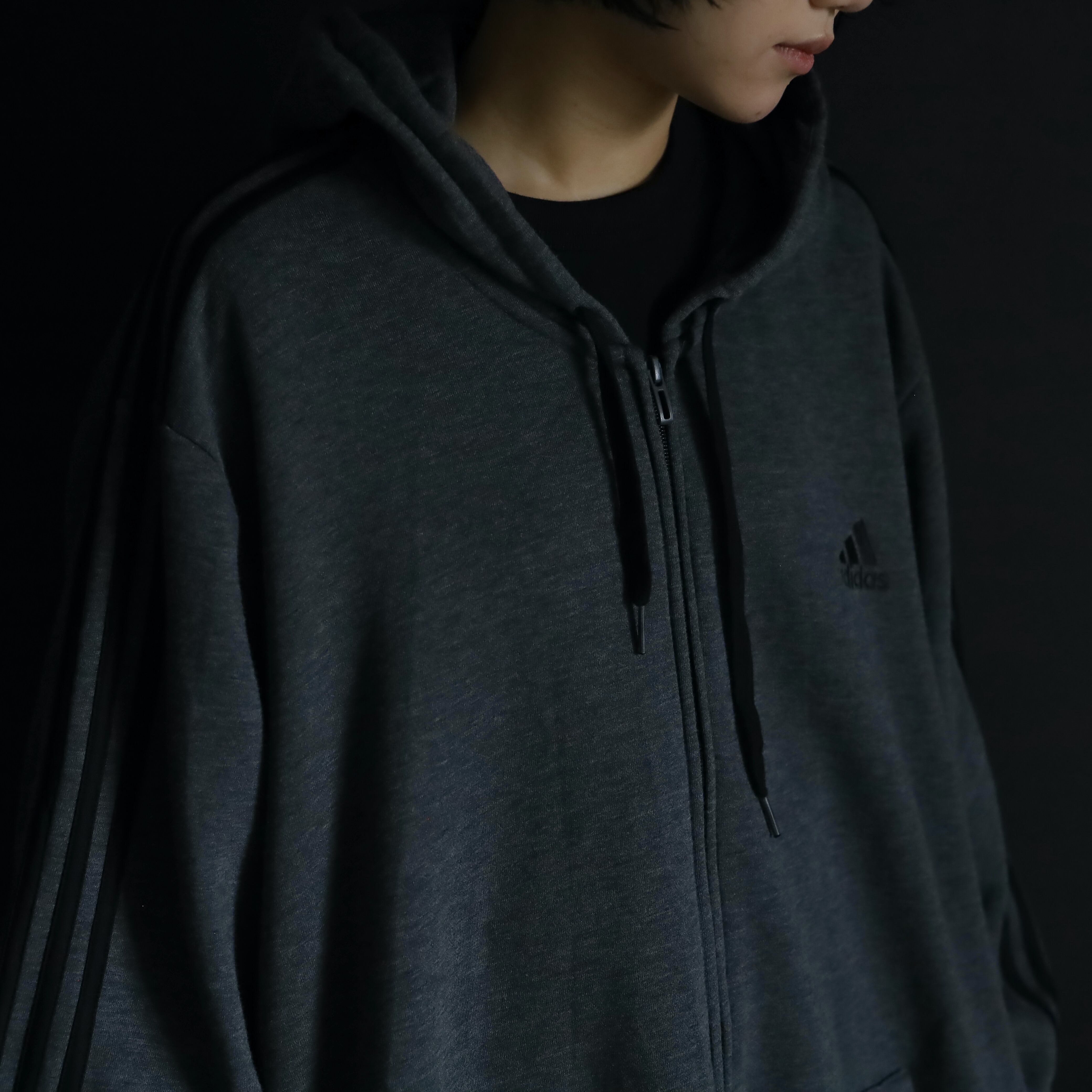 やや深めのトーンのグレーカラースウェットをベースに,左胸にadidasパフォーマンスロゴ刺繍.