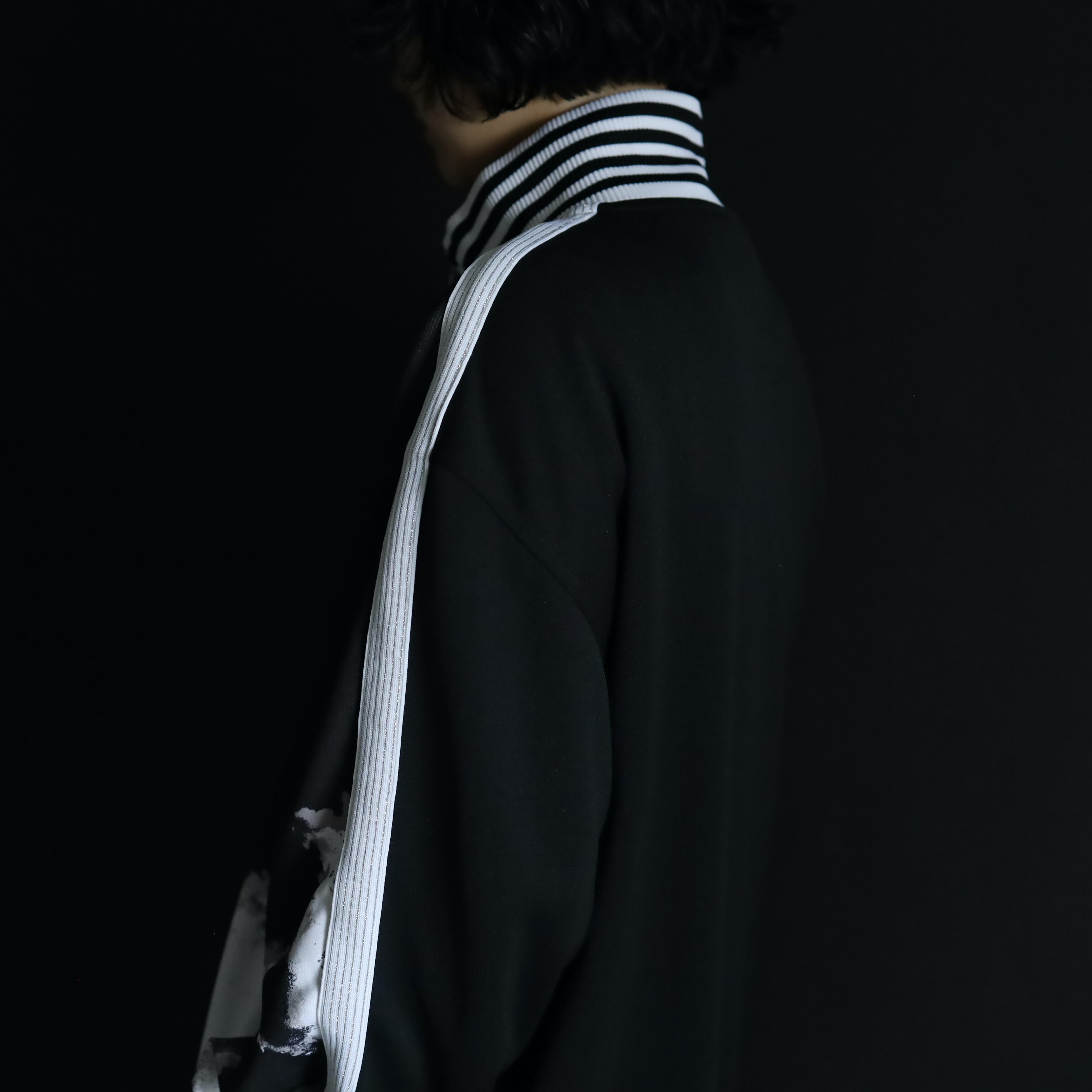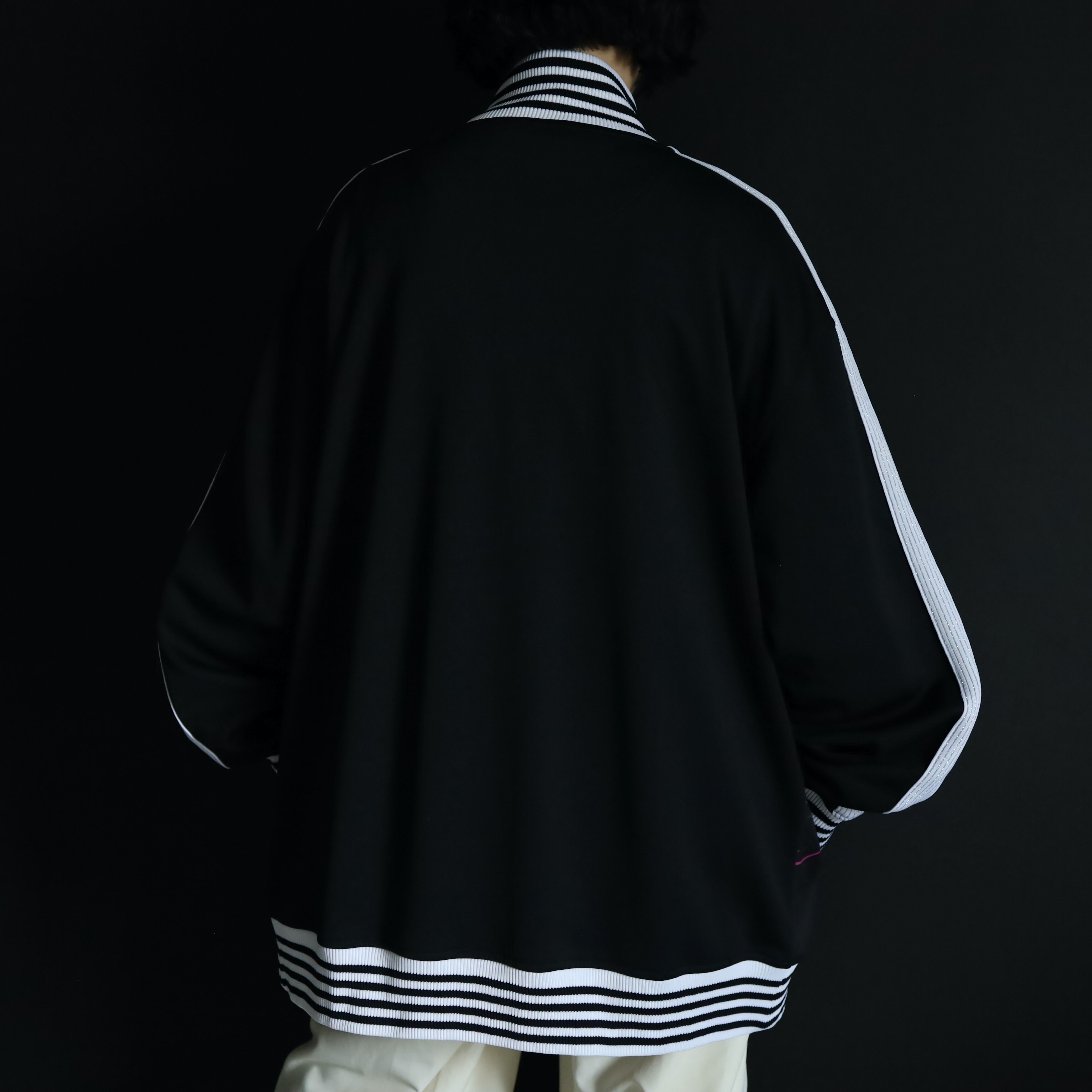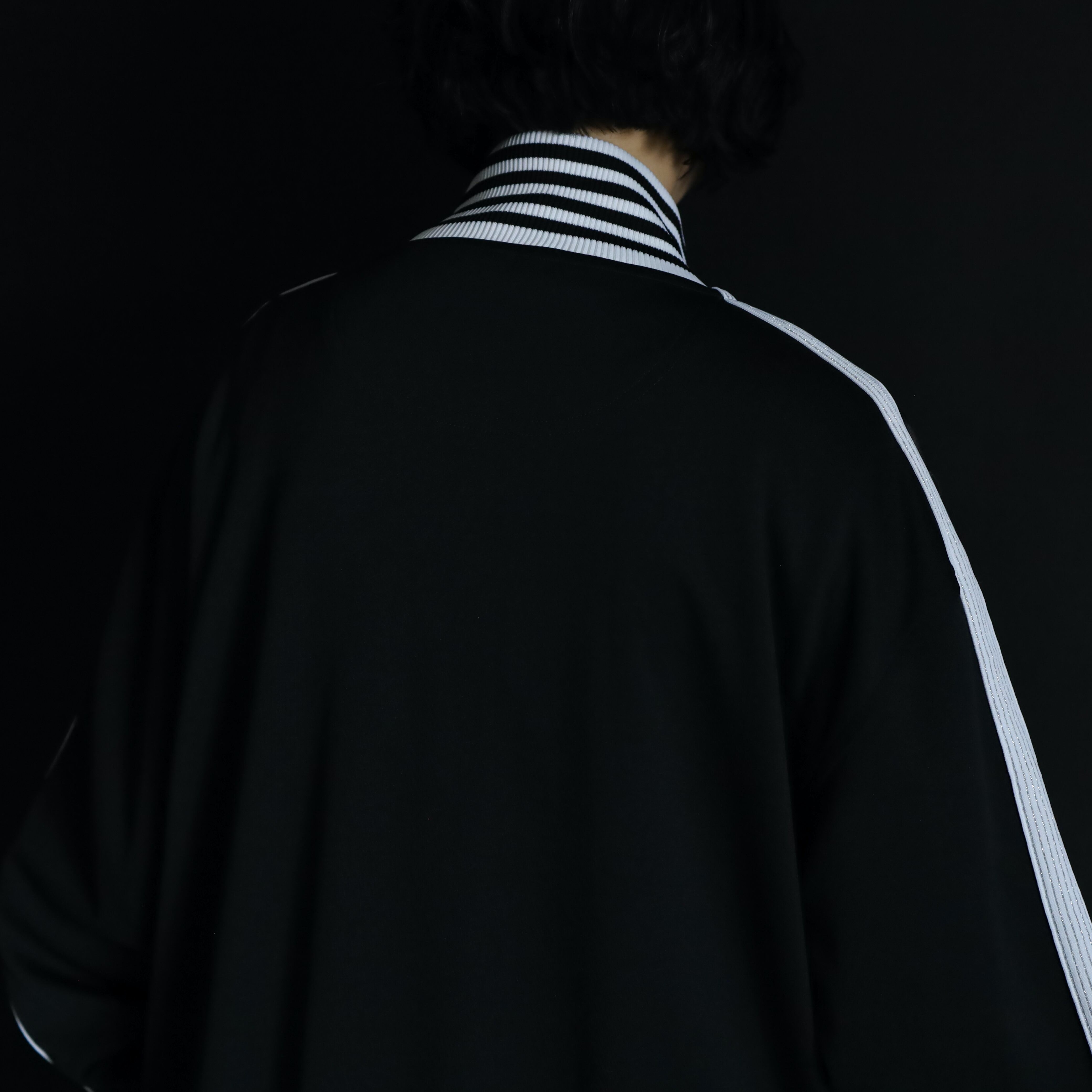 ブラックカラーのハリのあるジャージボディをベースに,袖,裾,ネックリブはブラック×ホワイトのラインデザイン.