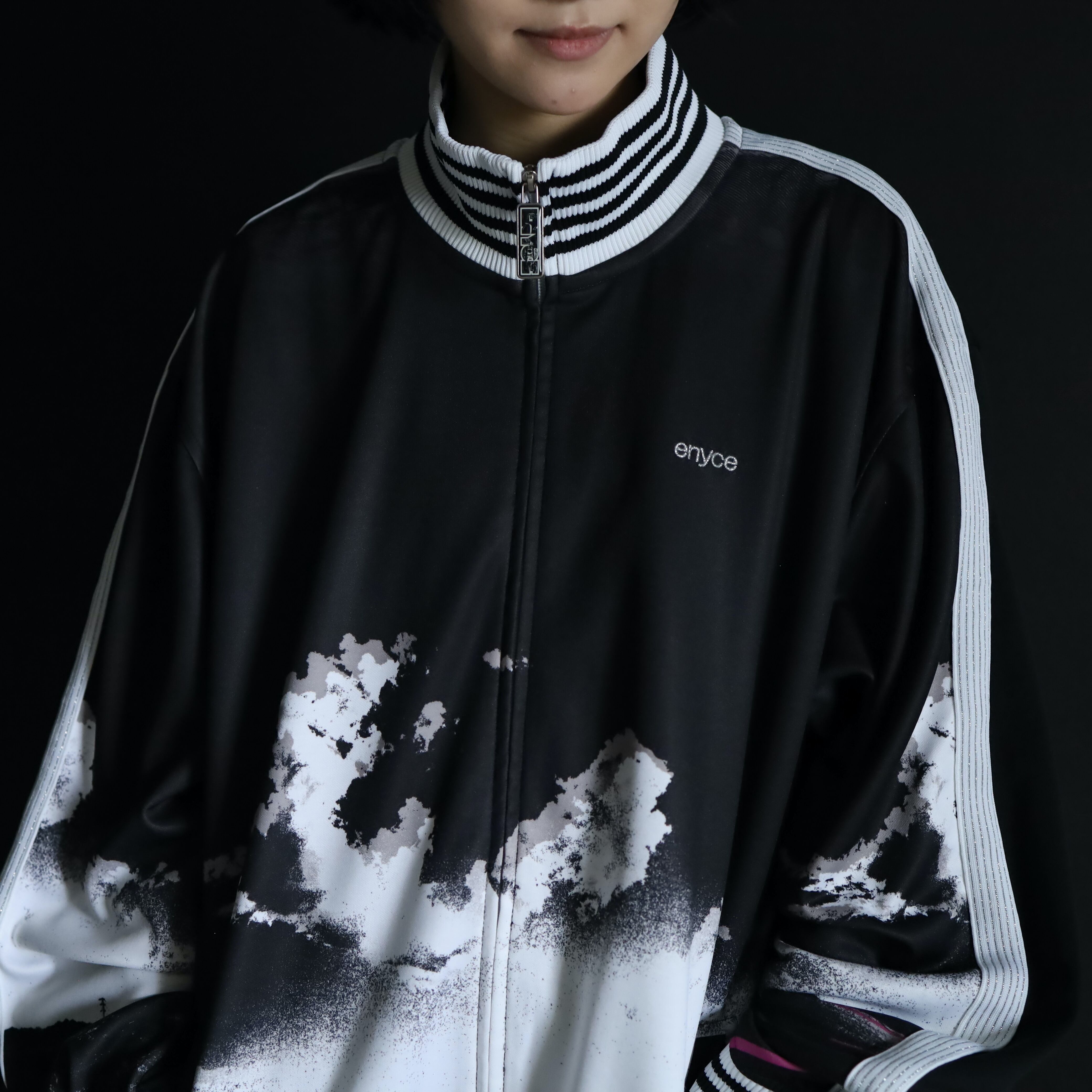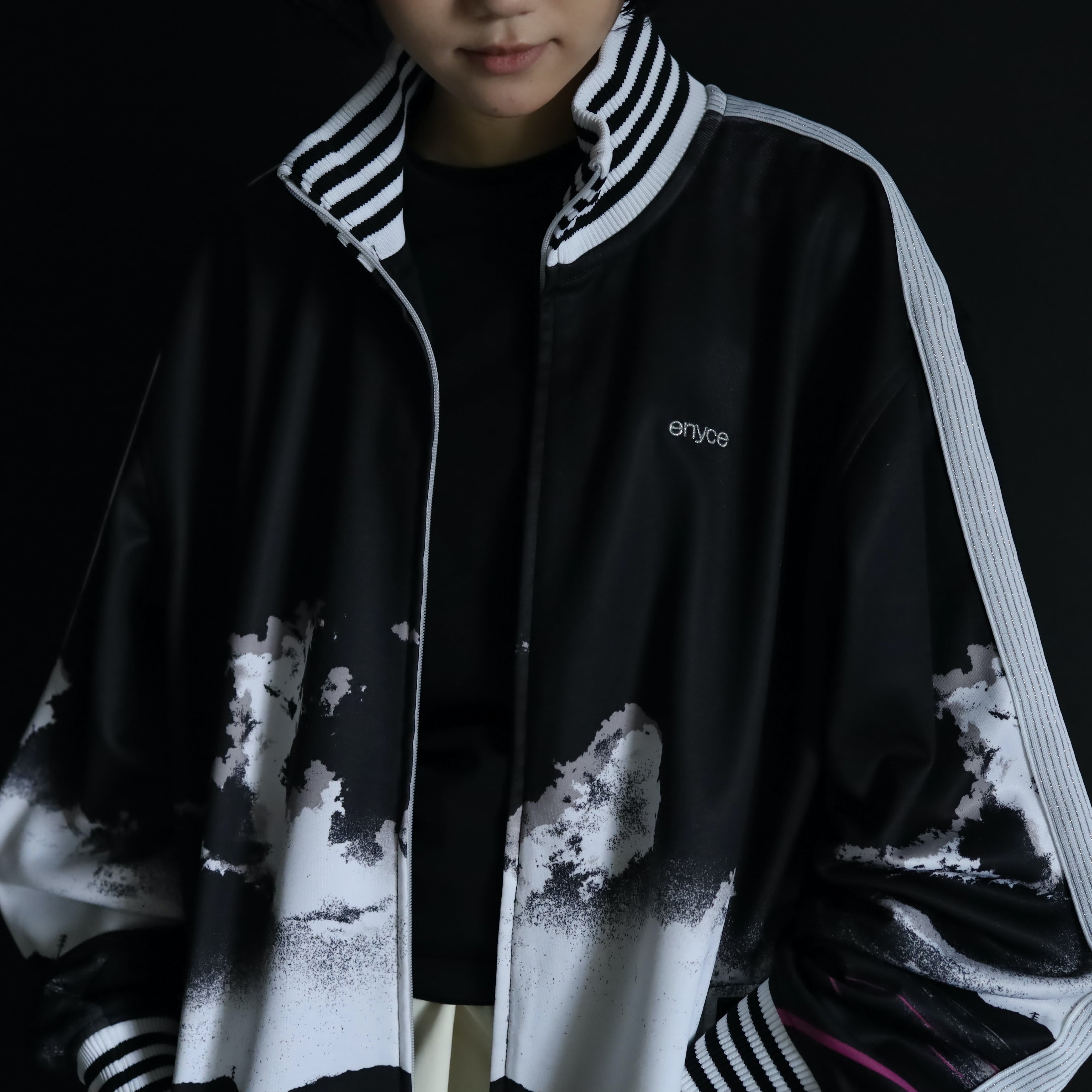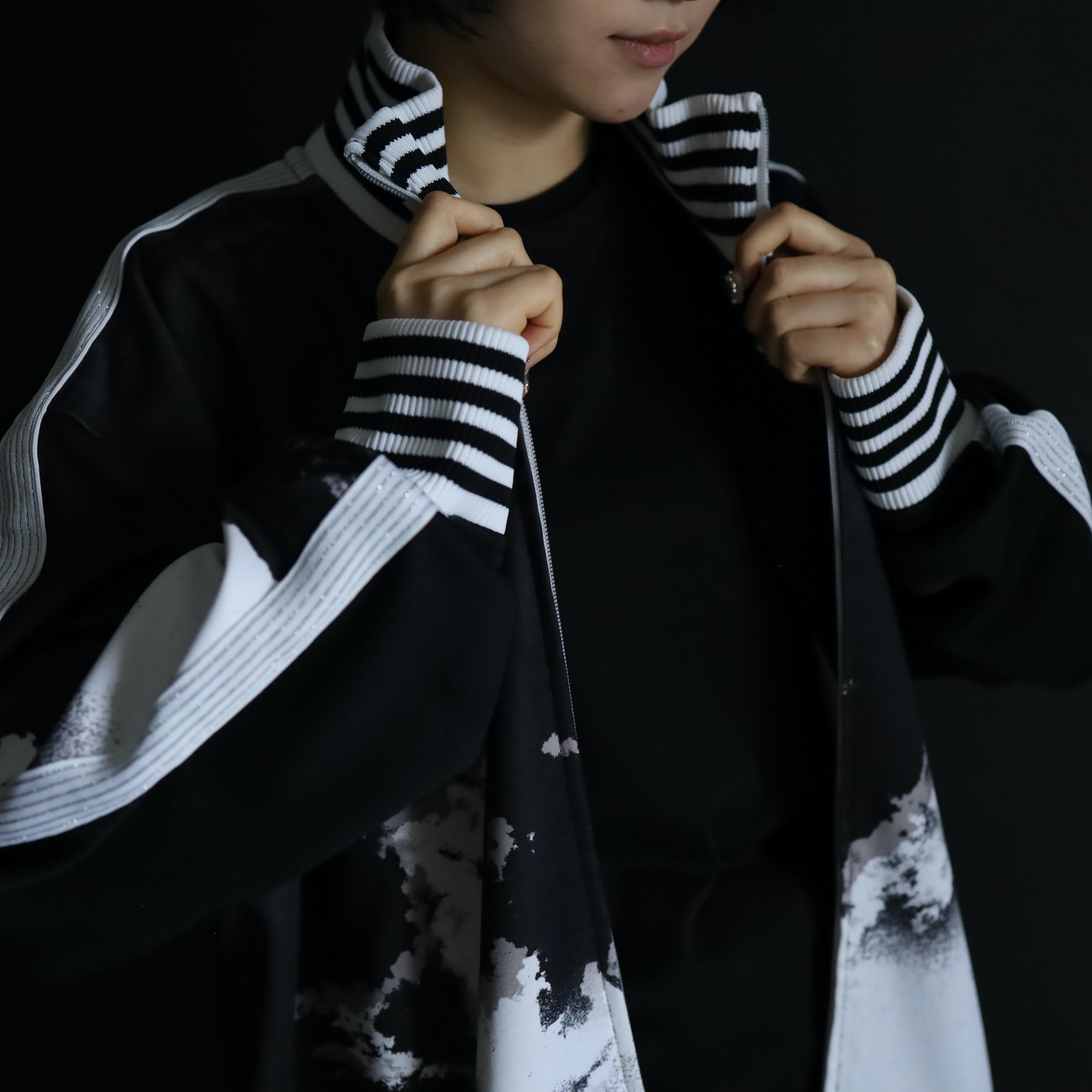 ブラックカラーのハリのあるジャージボディをベースに,袖,裾,ネックリブはブラック×ホワイトのラインデザイン.