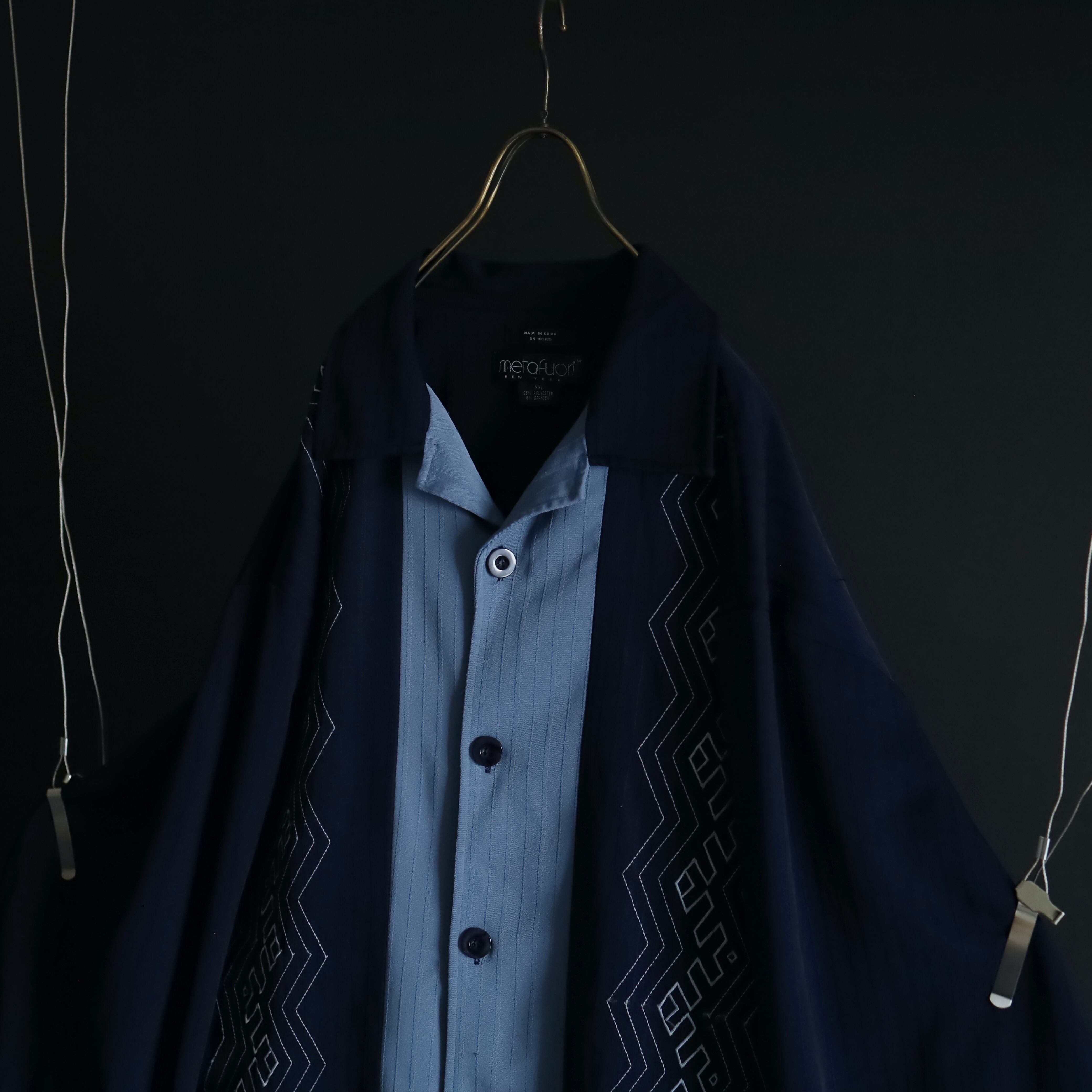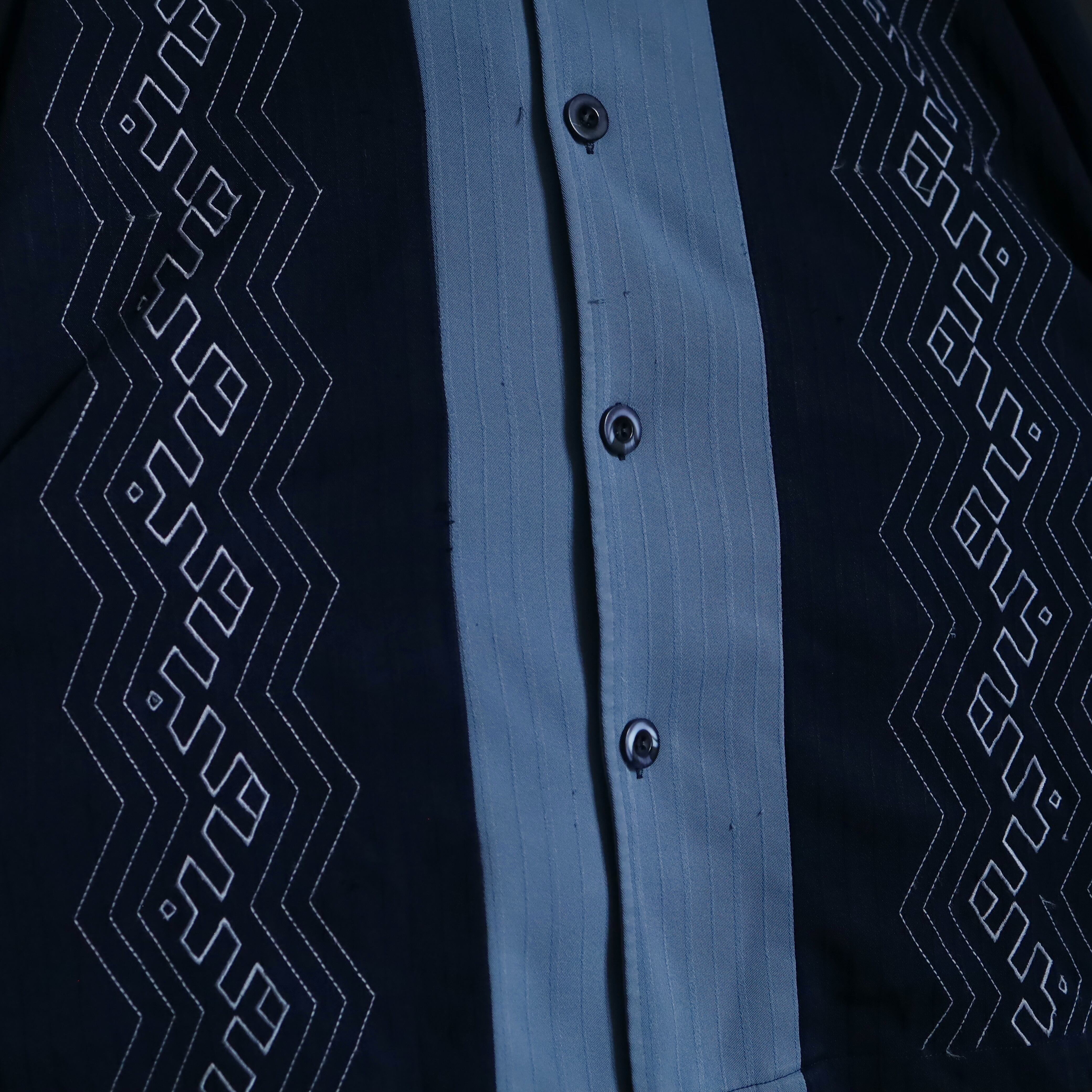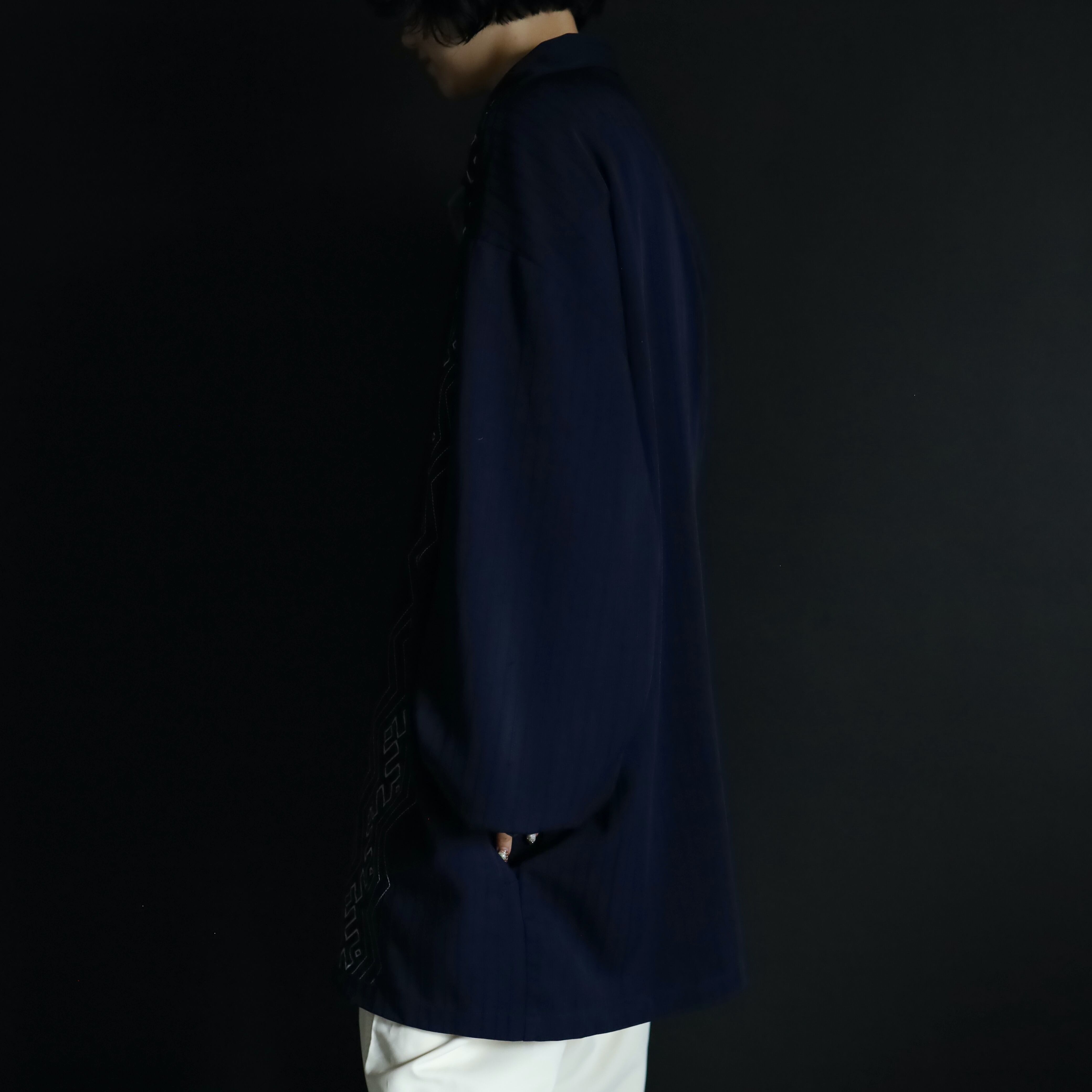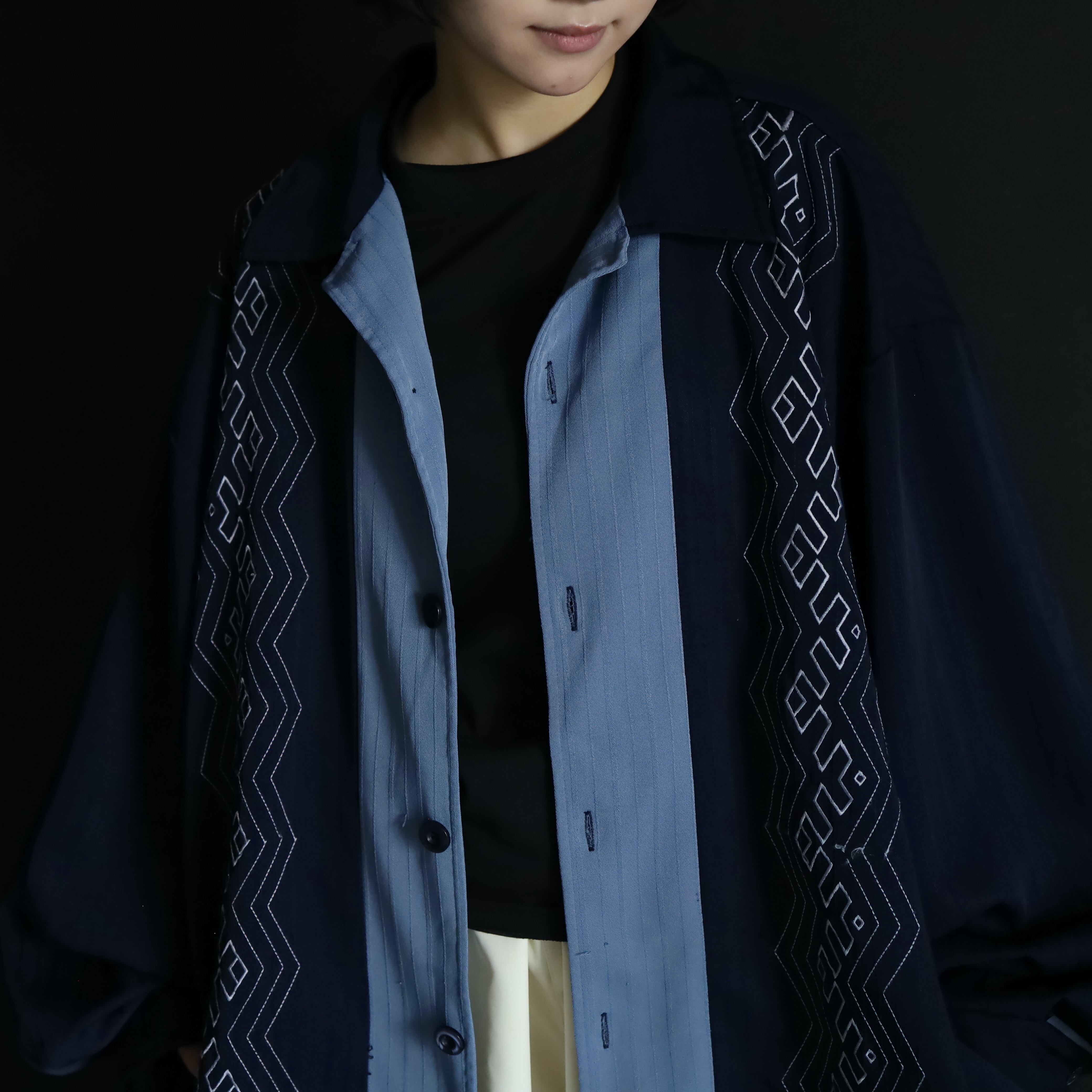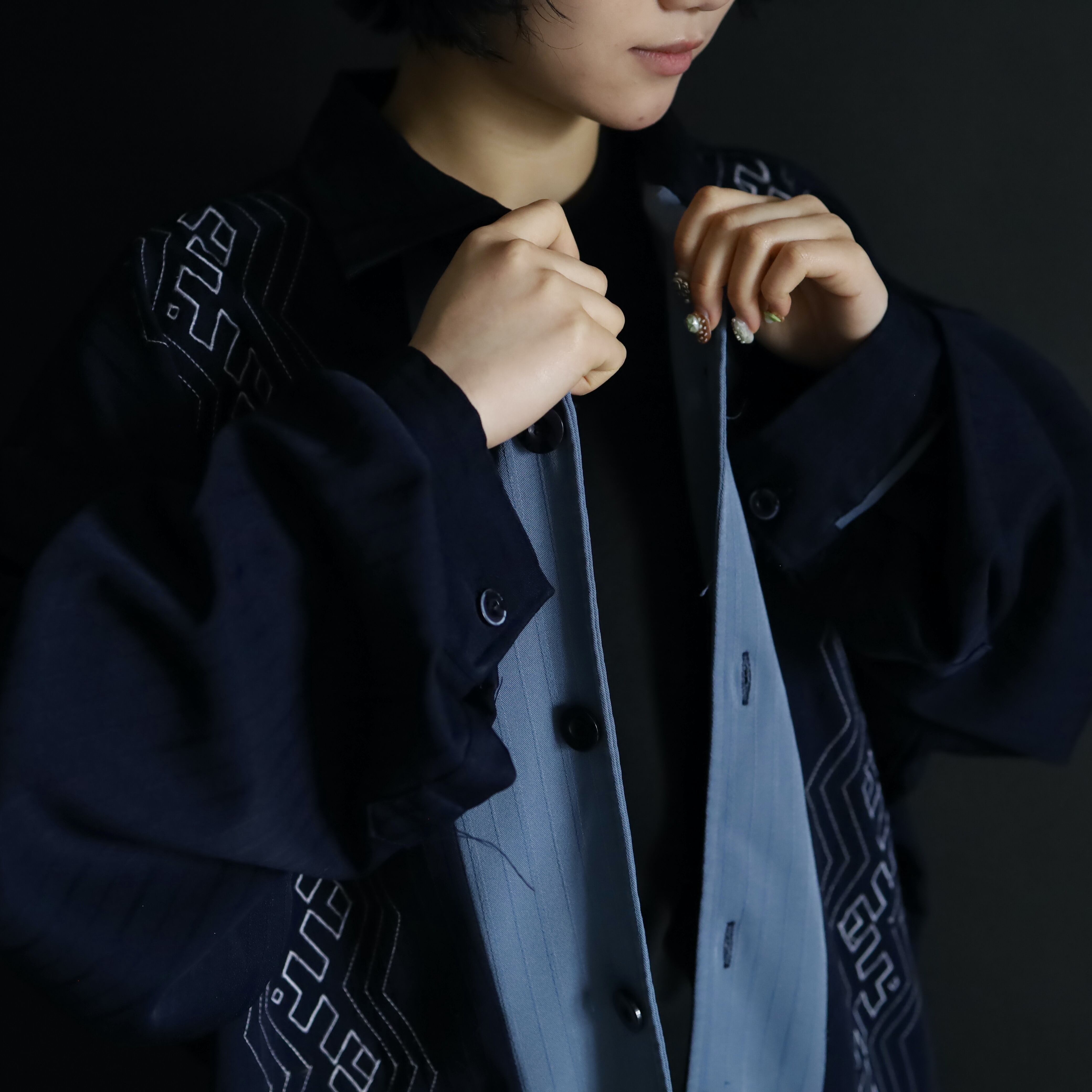 前身頃の肩から裾にかけてのラインに白の刺繍デザイン.