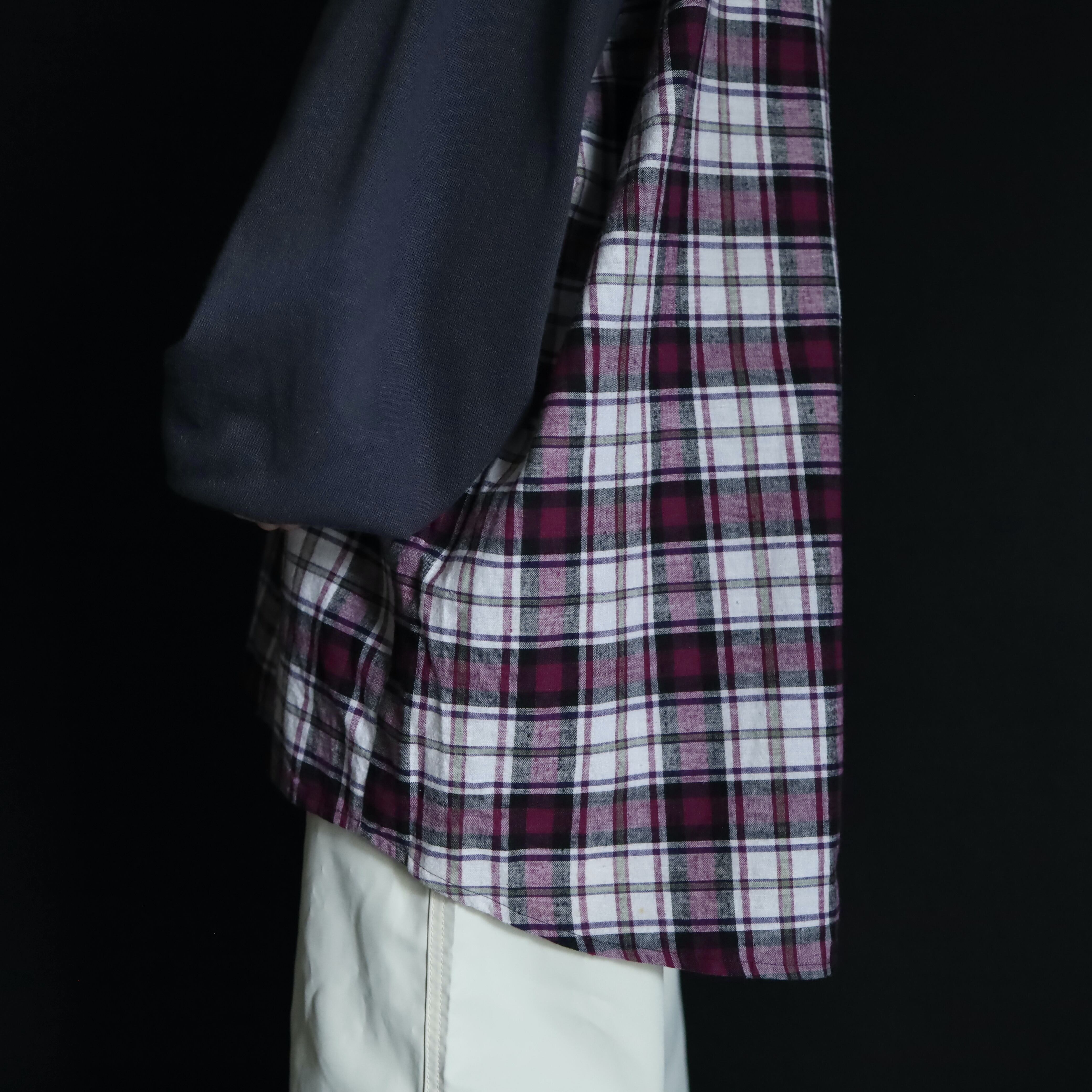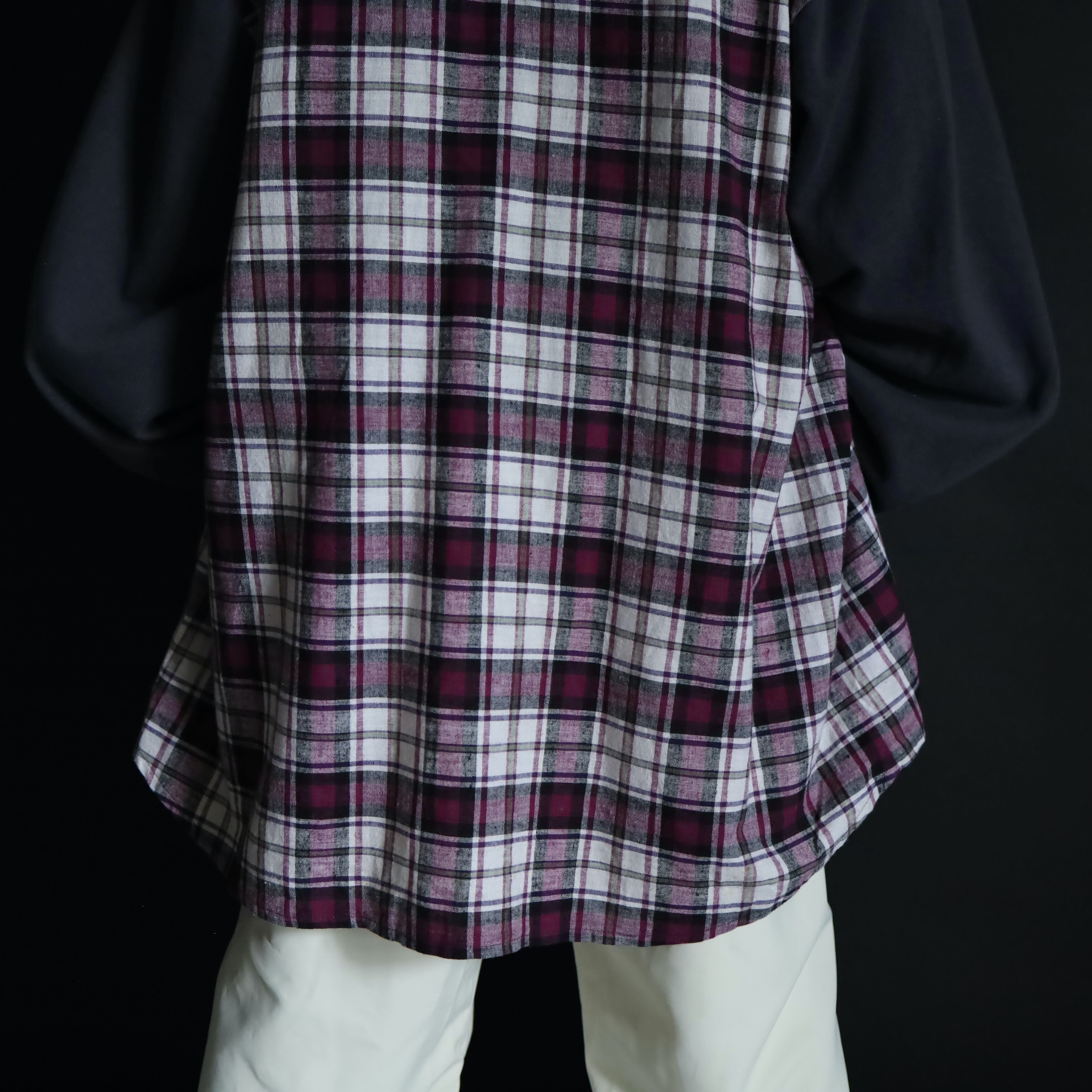 ブラック,ホワイト,パープルで構成された,コシのあるコットン×ポリのチェックシャツ.