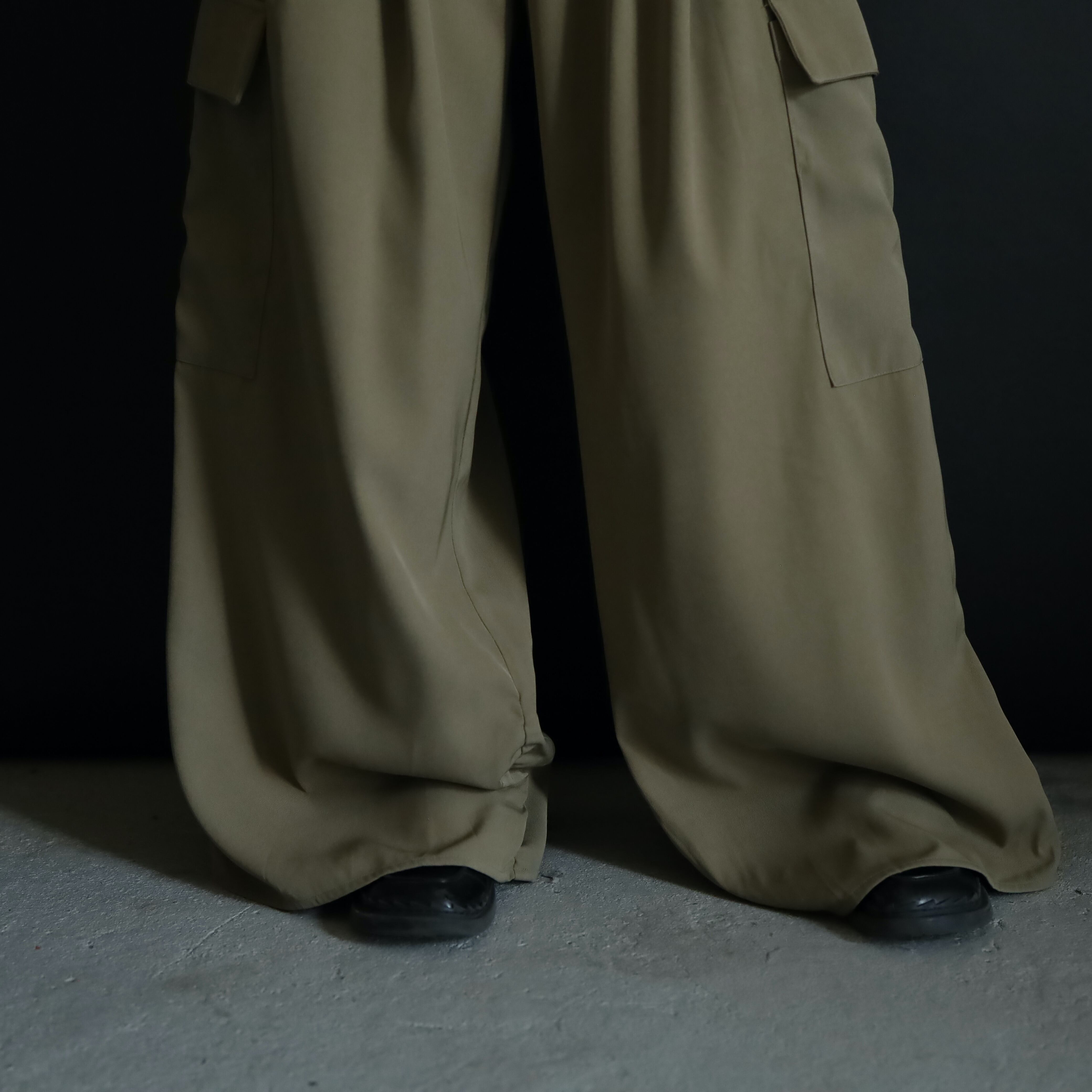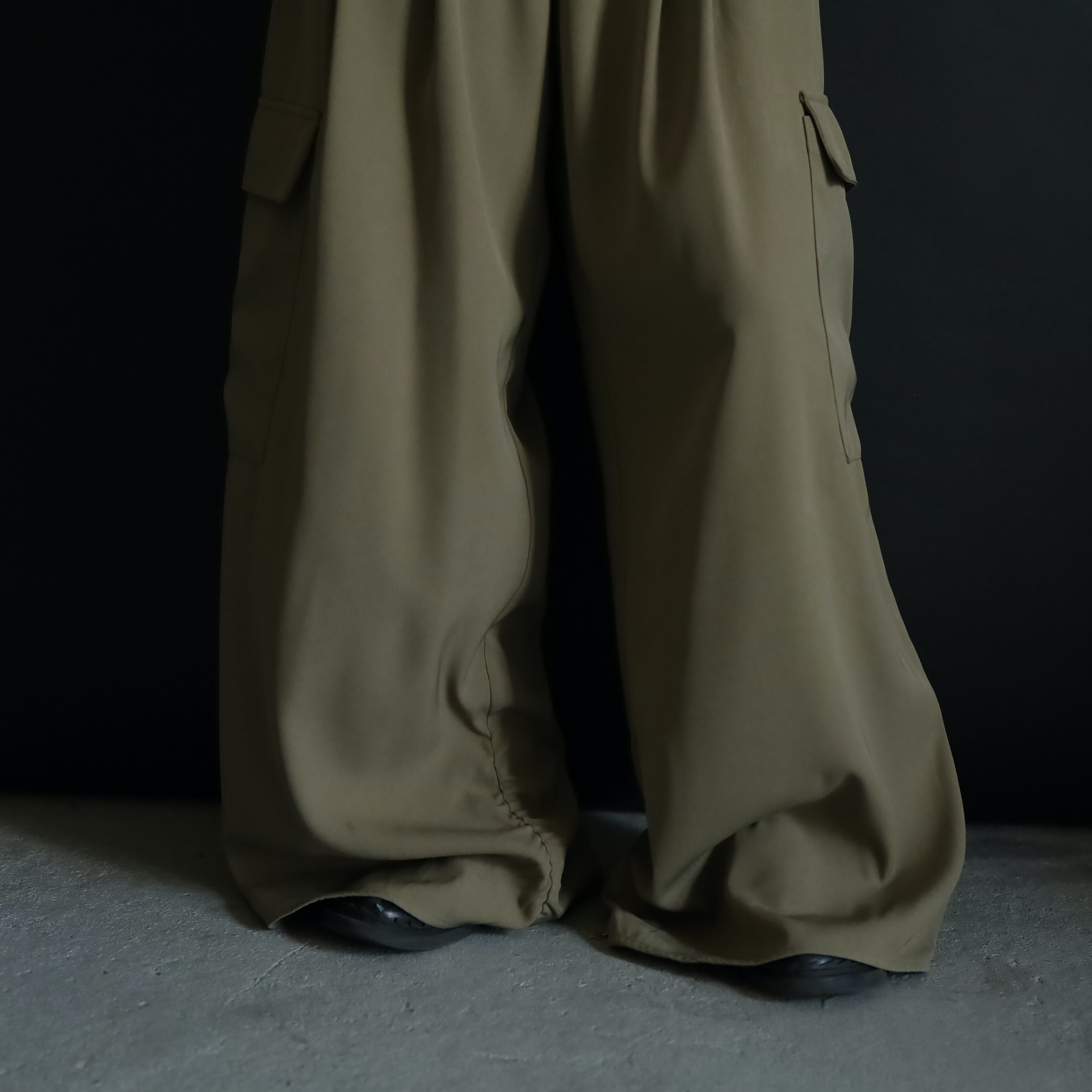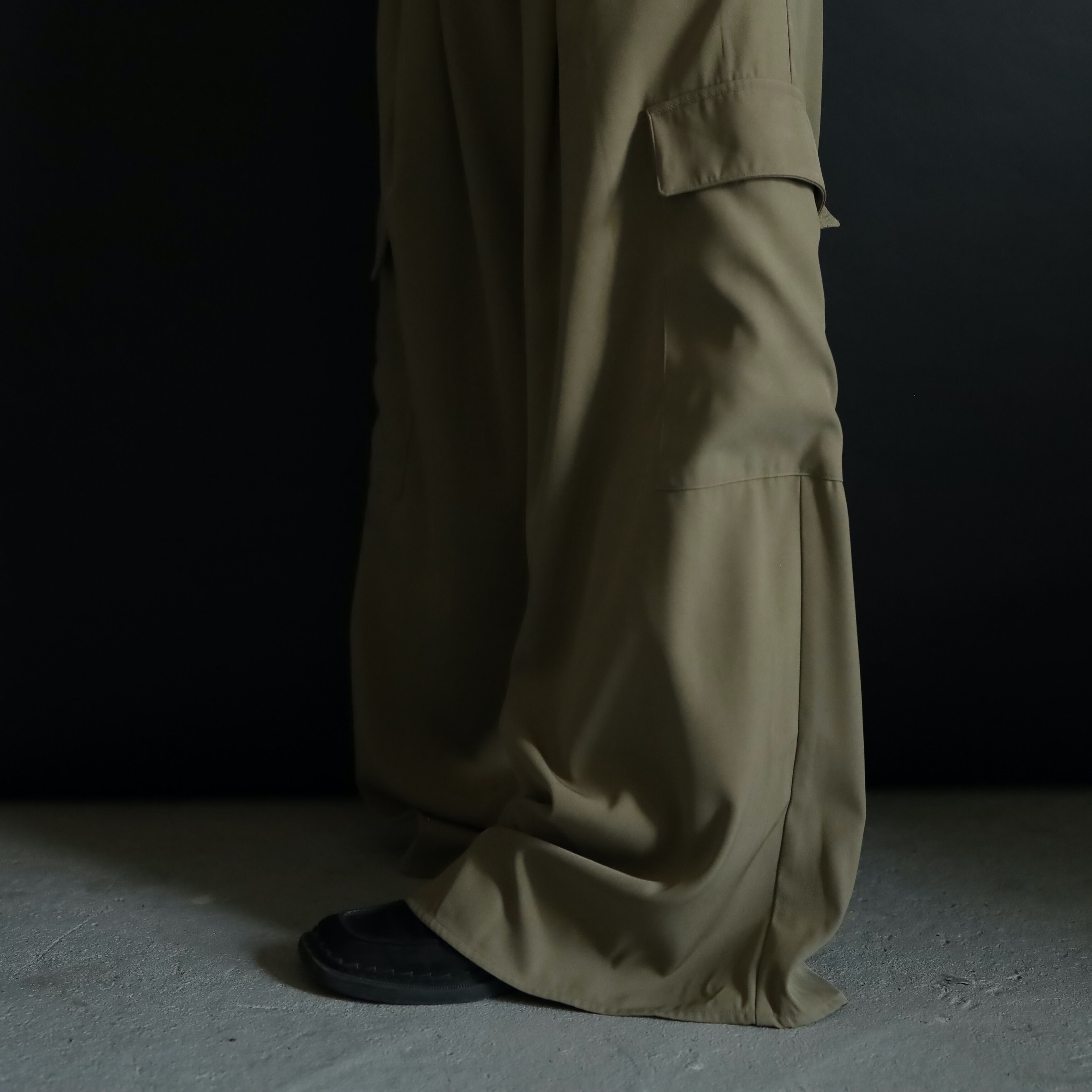 品のいいワイドストレートなスラックスに,大きなカーゴポケットを加えたディテール.