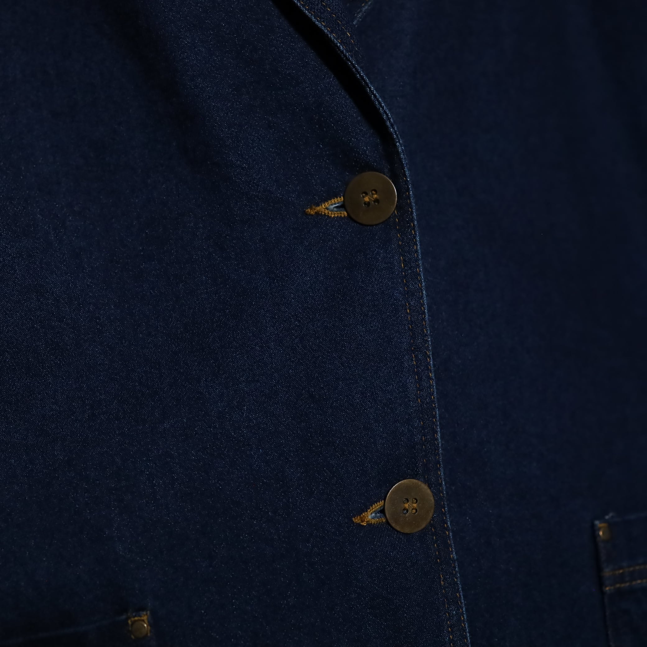 カシメのついたパッチポケット,真鍮製の2ボタン仕様で,ややヴィンテージライクな雰囲気も◎