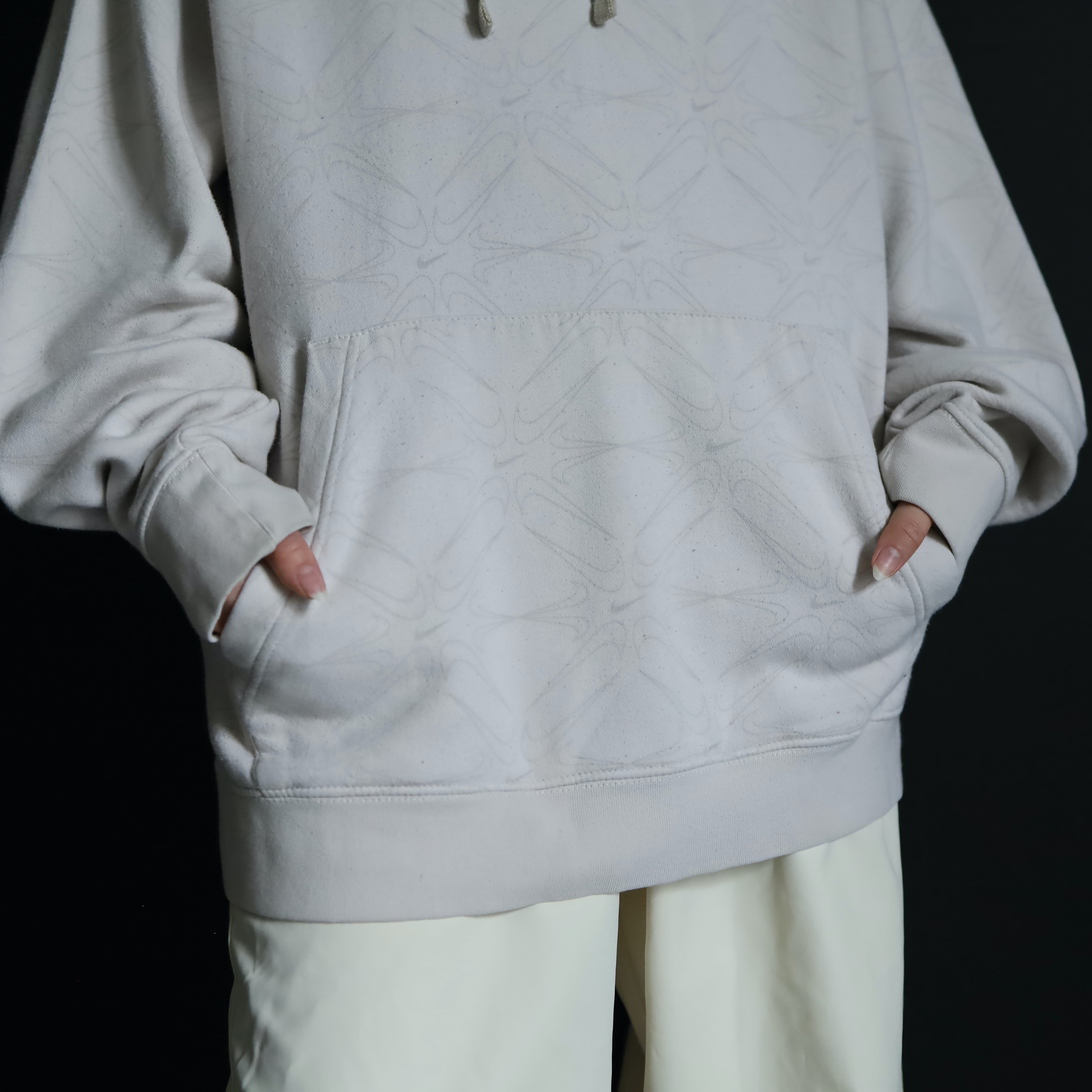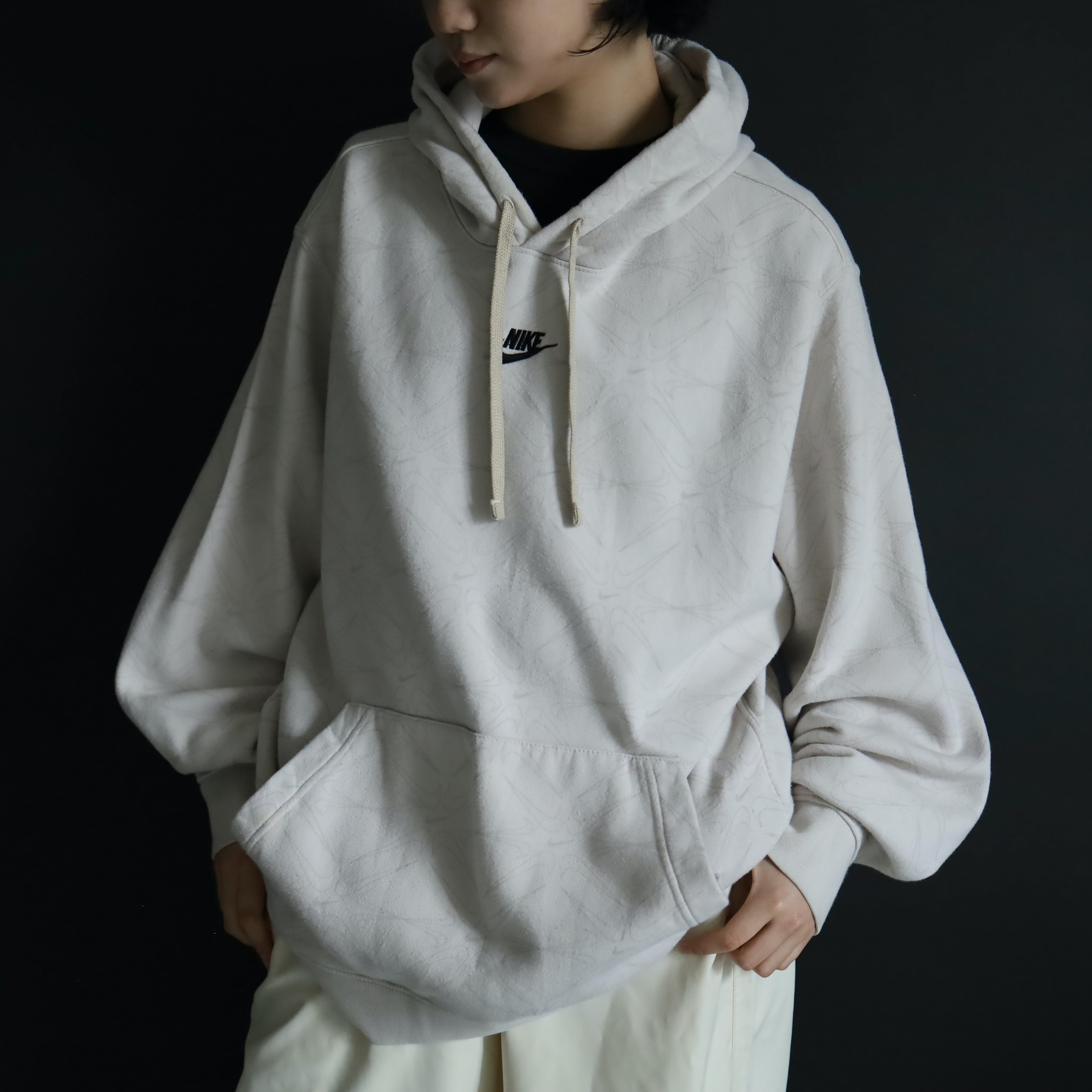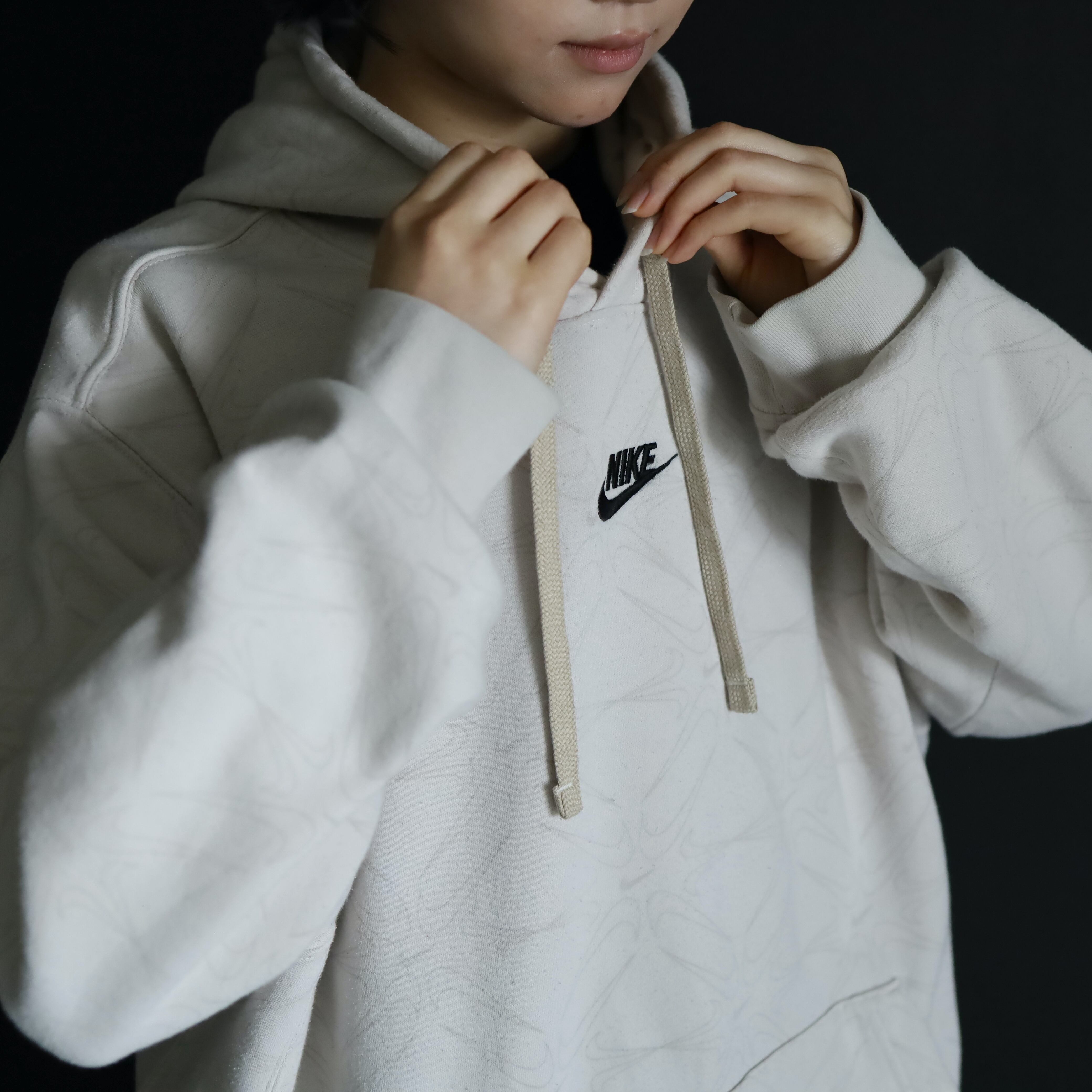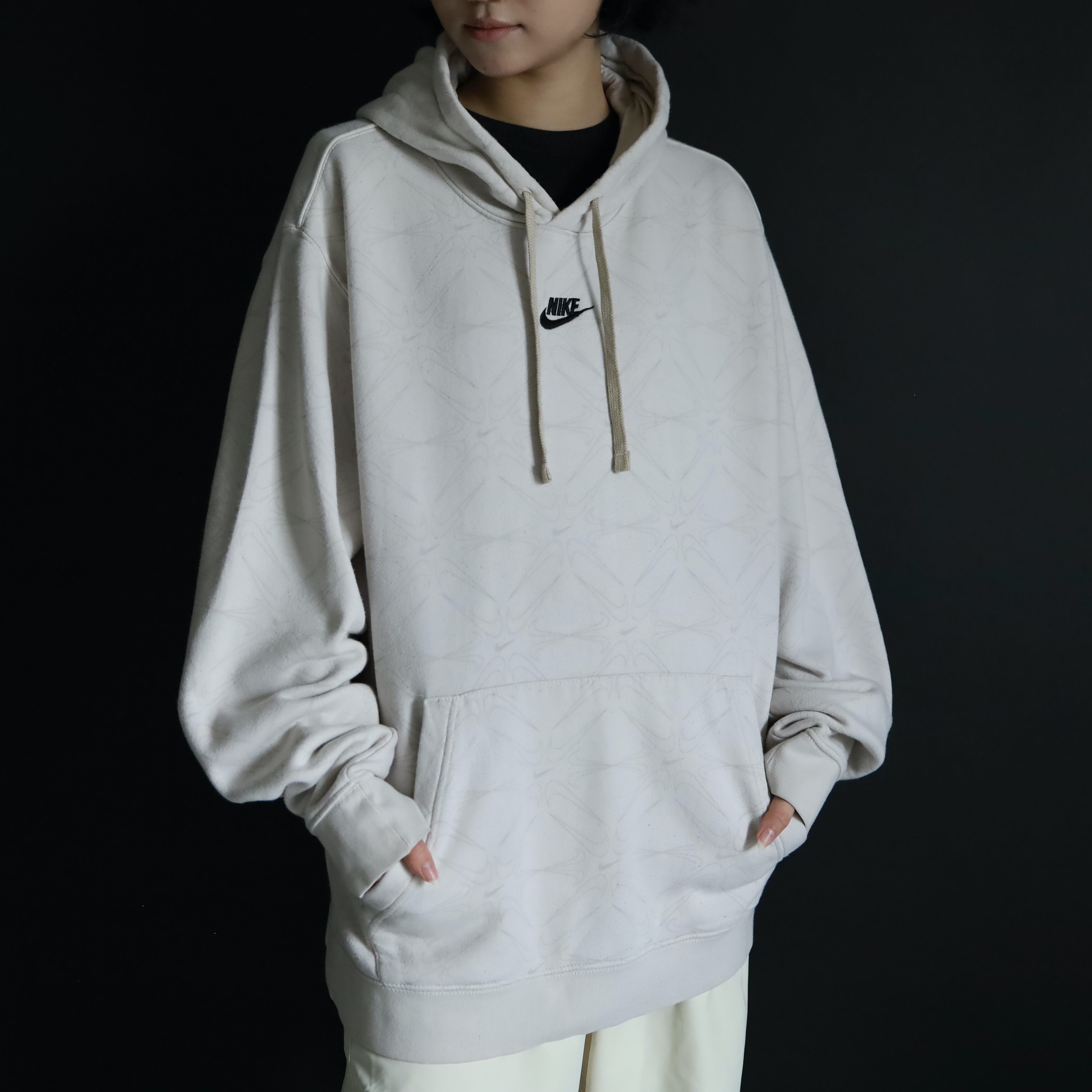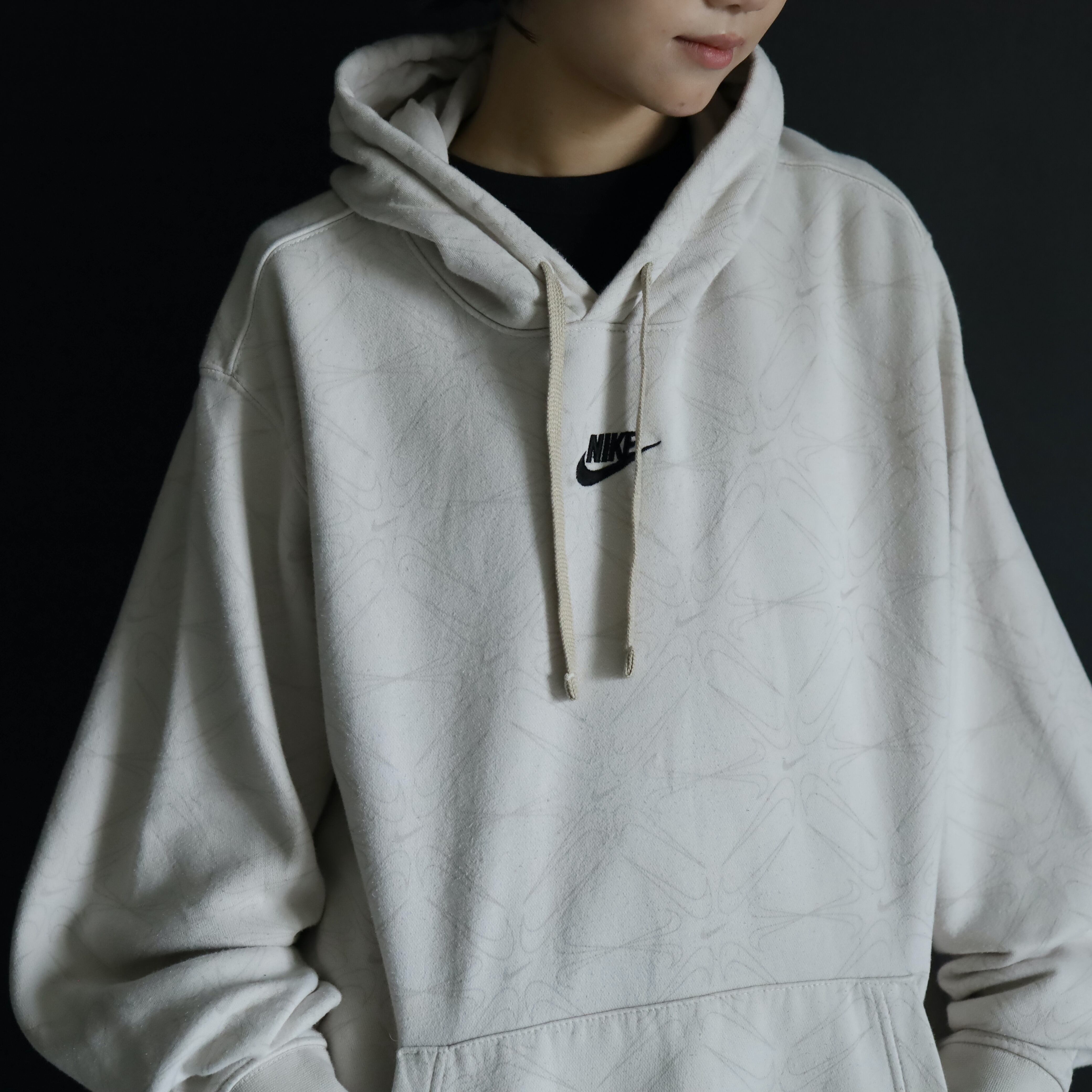フロントにブラックのNIKEとスウッシュロゴ刺繍,全体に幾何学調のスウッシュプリントデザイン.