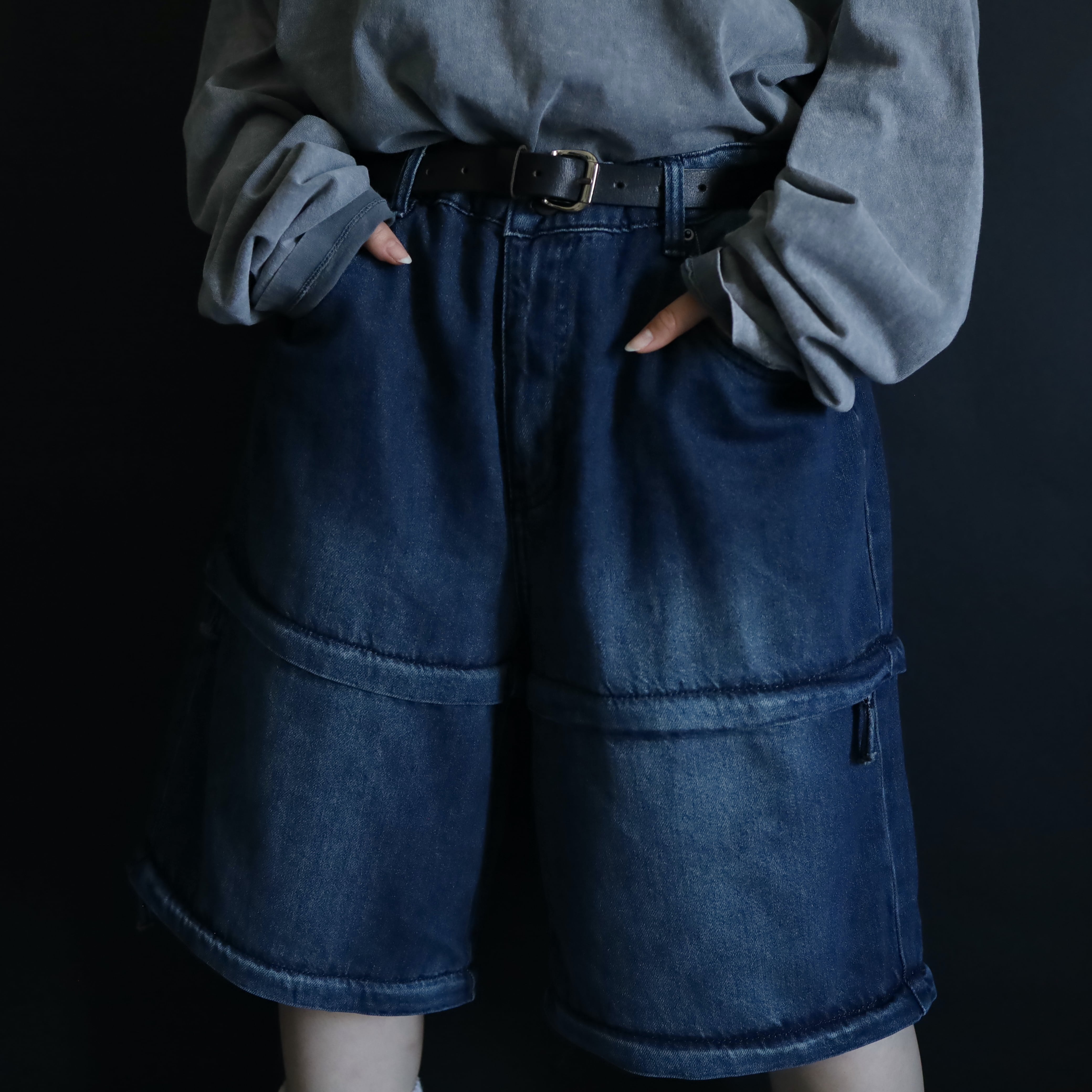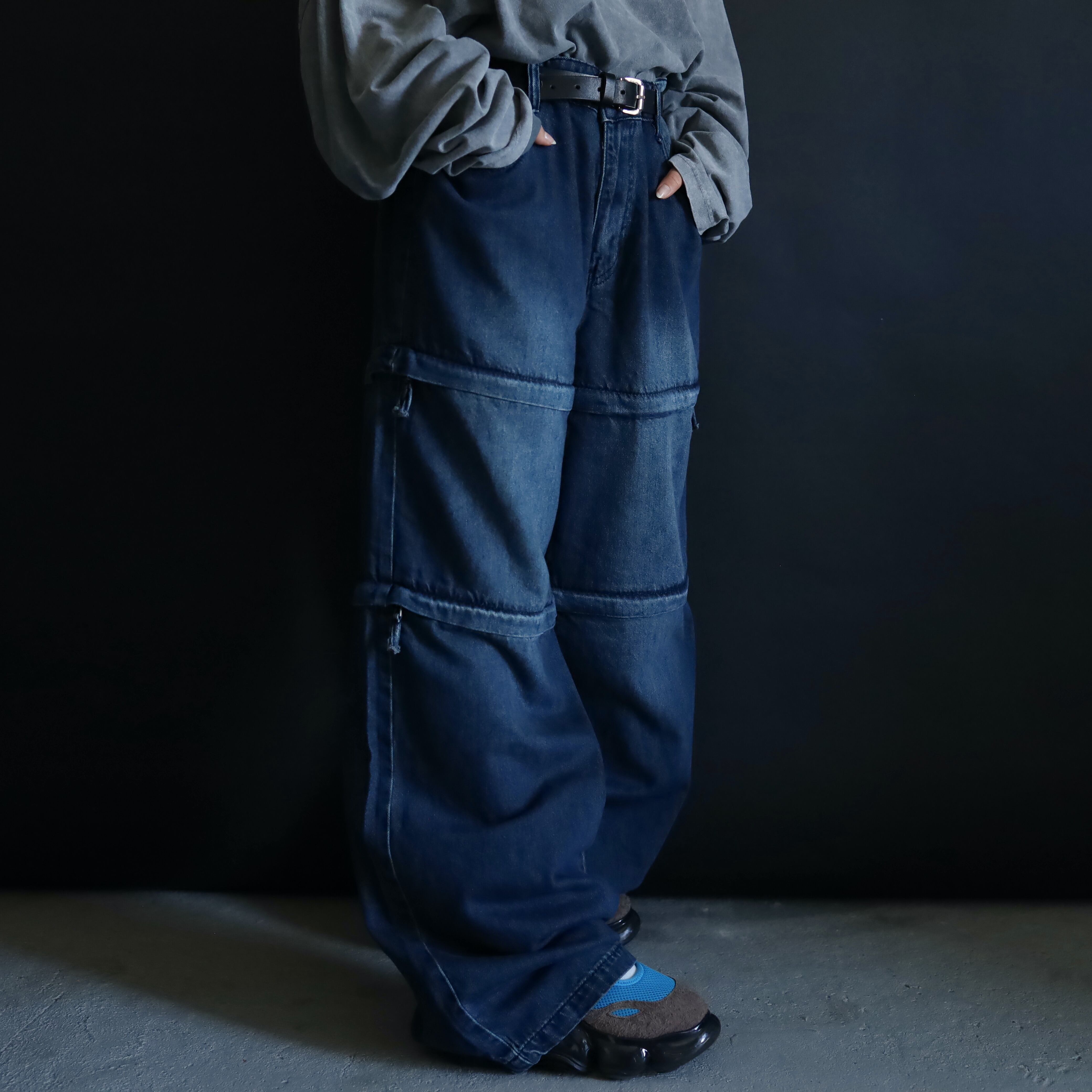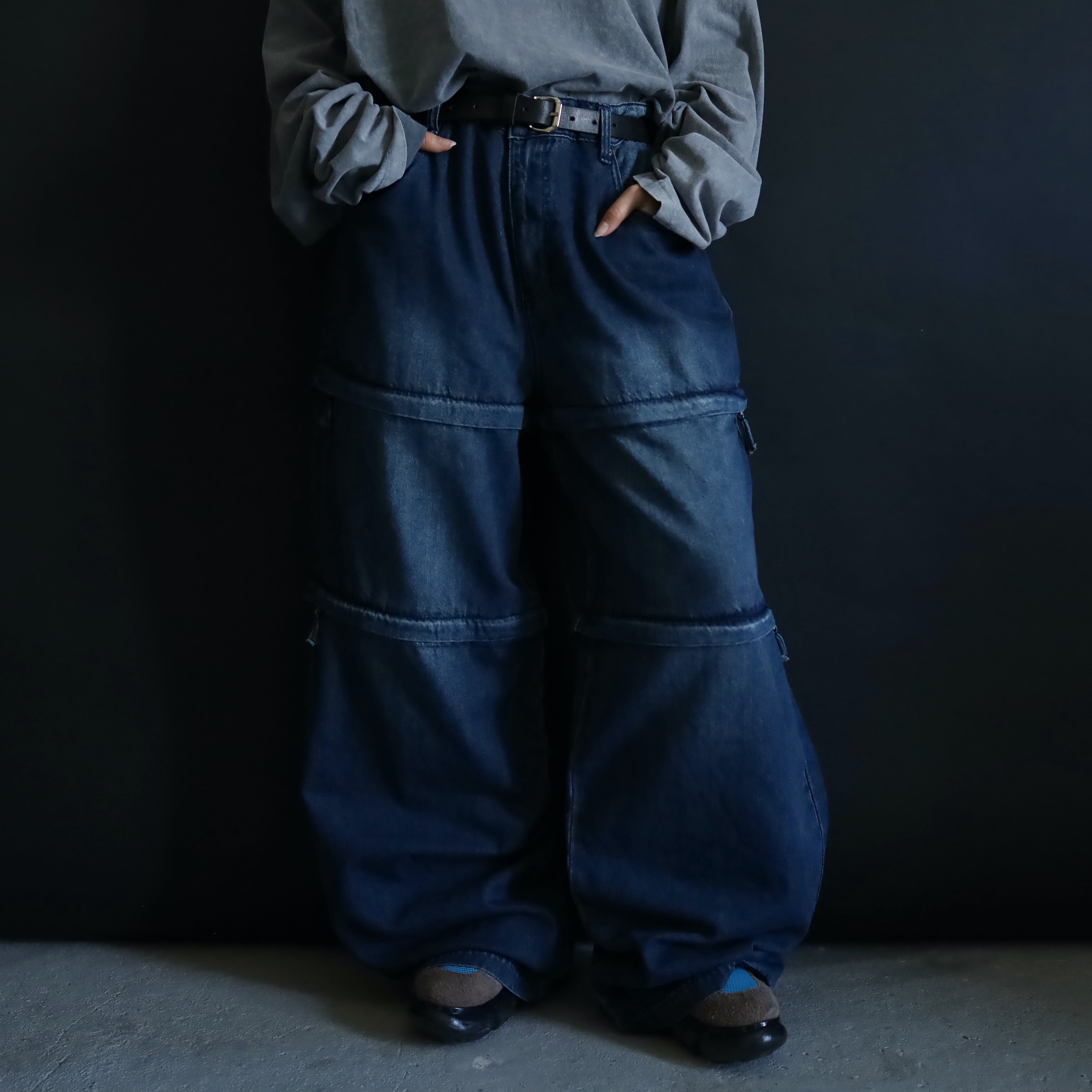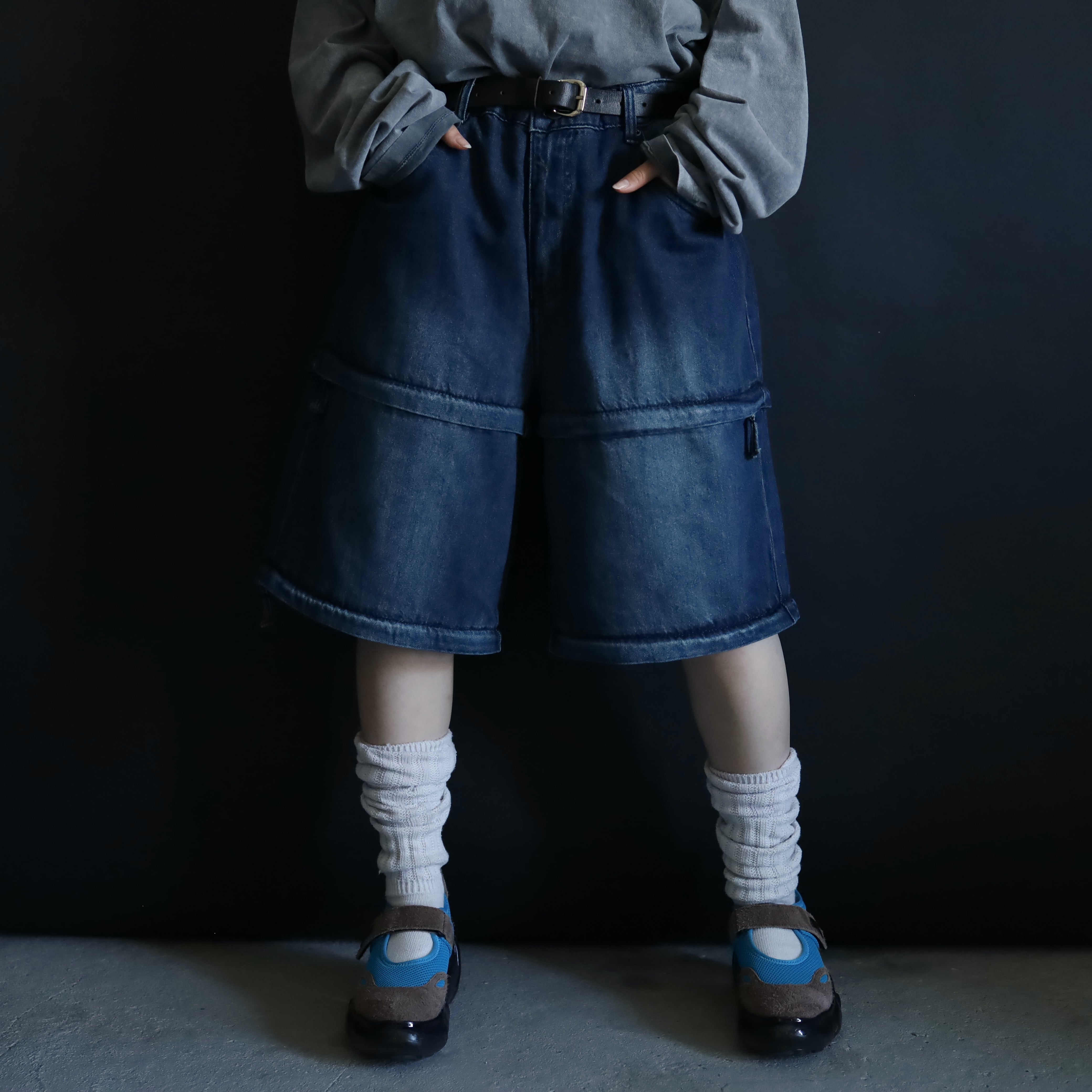 膝あたりと太もも中腹にジッパーが仕込まれており,そのラインで丈の長さを切替られます.