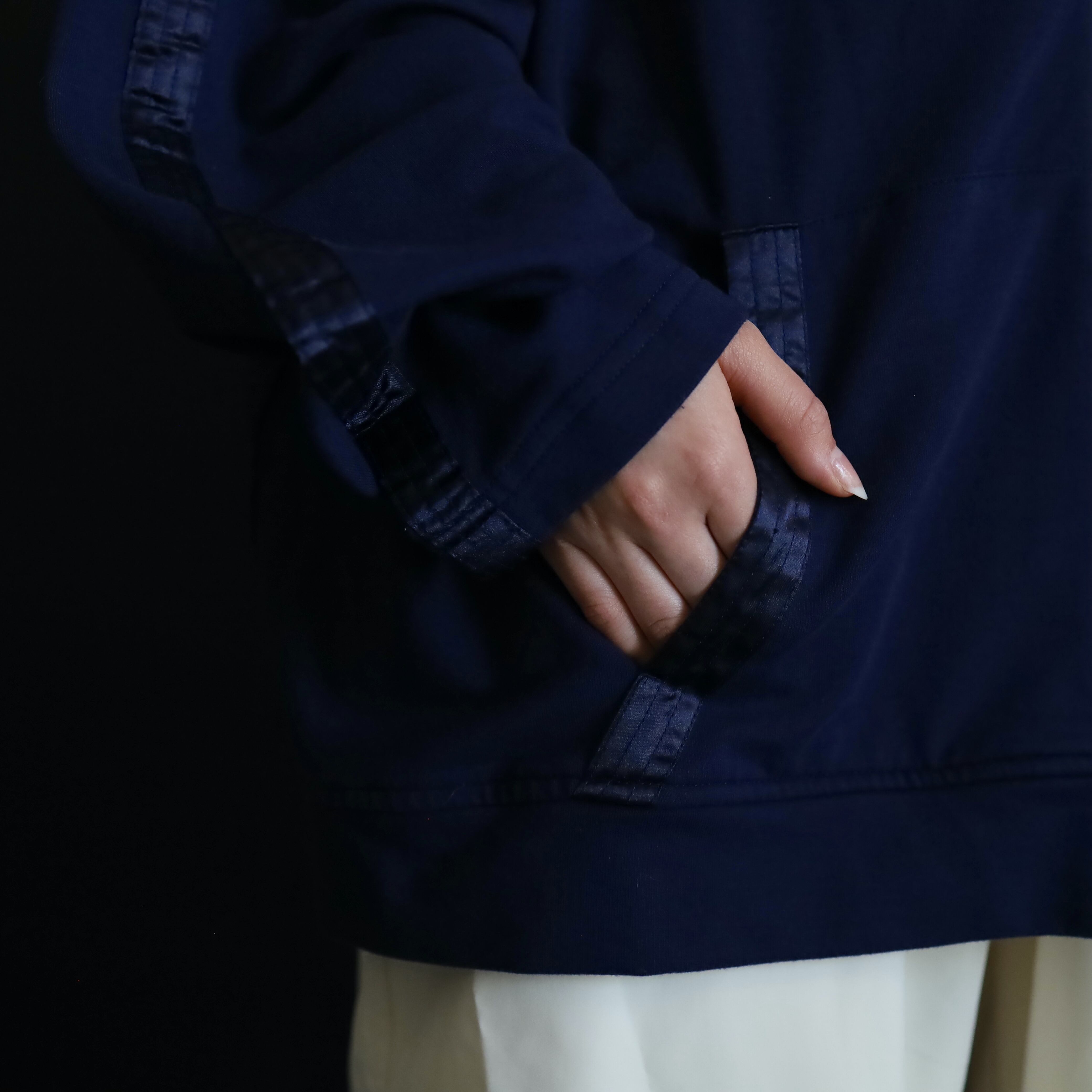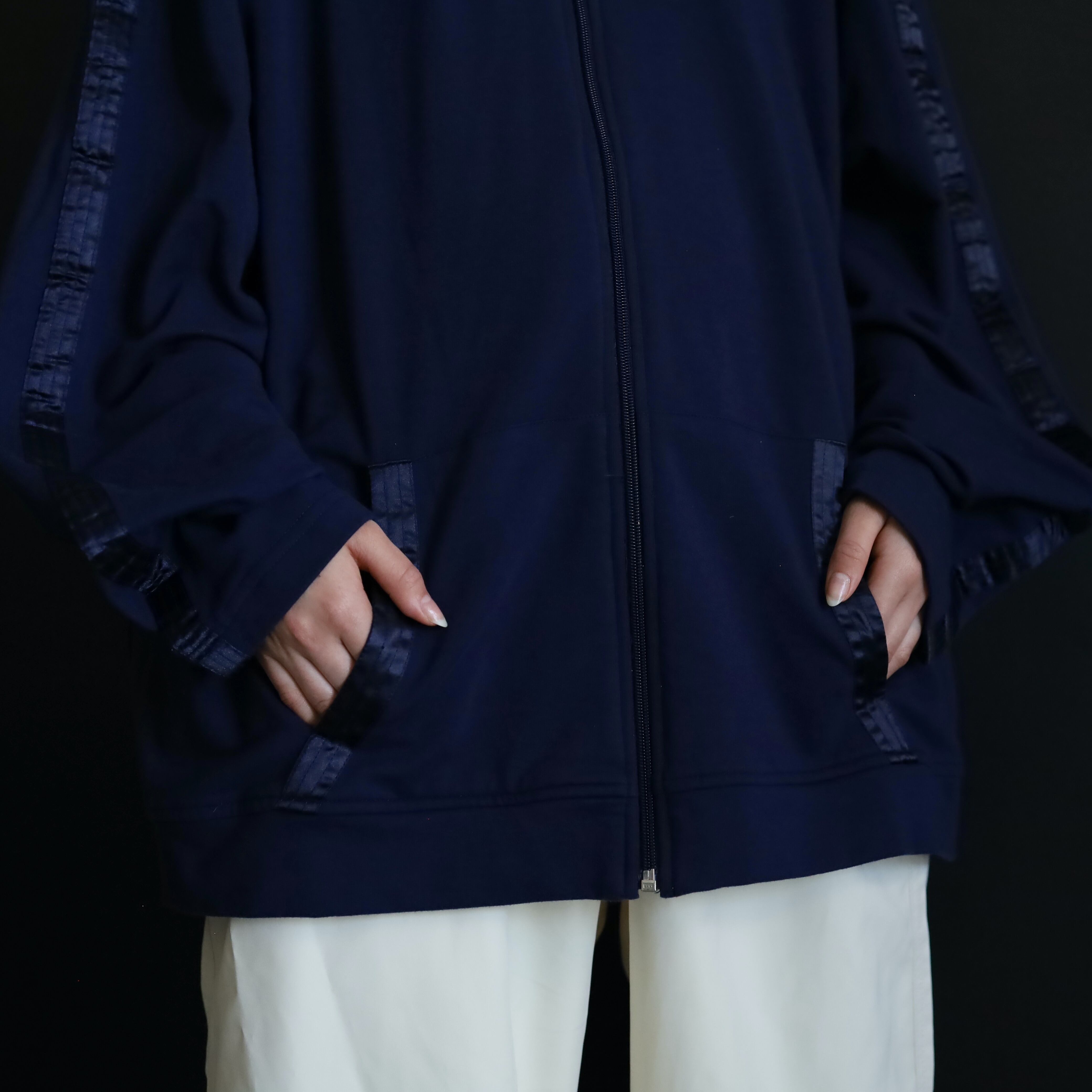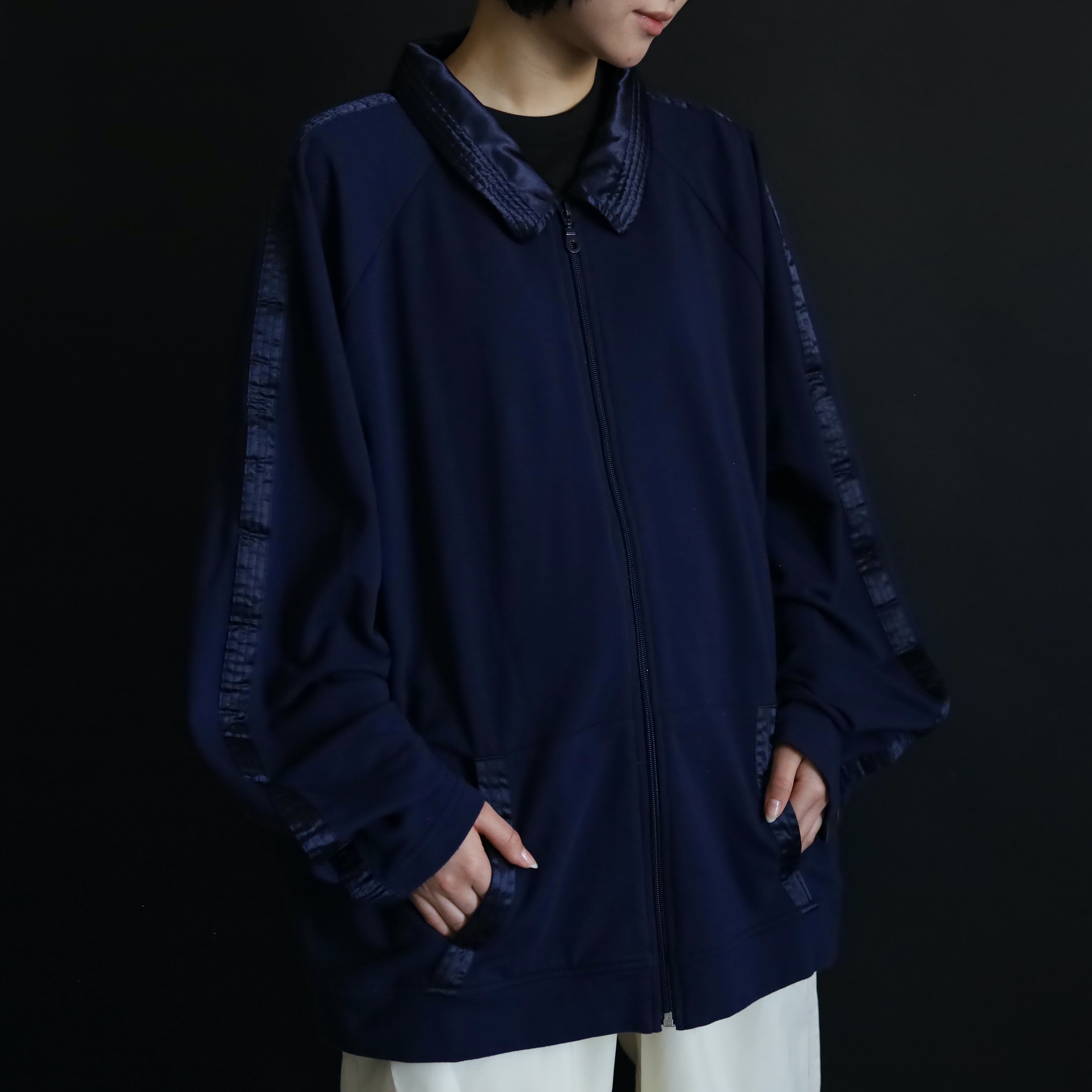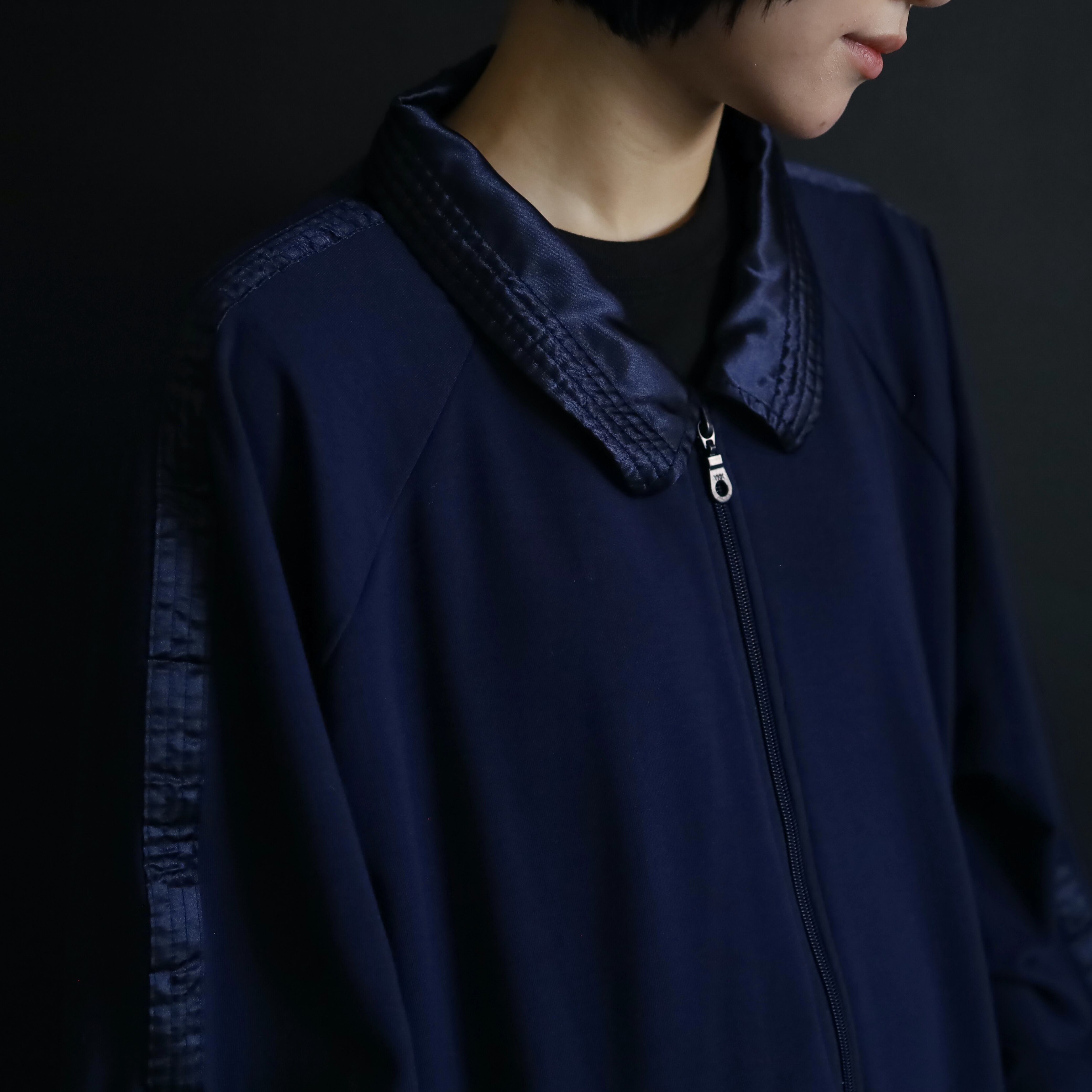 肩から袖先にかけても同様のサテン生地のラインが走る,同色異素材スイッチングデザイン.
