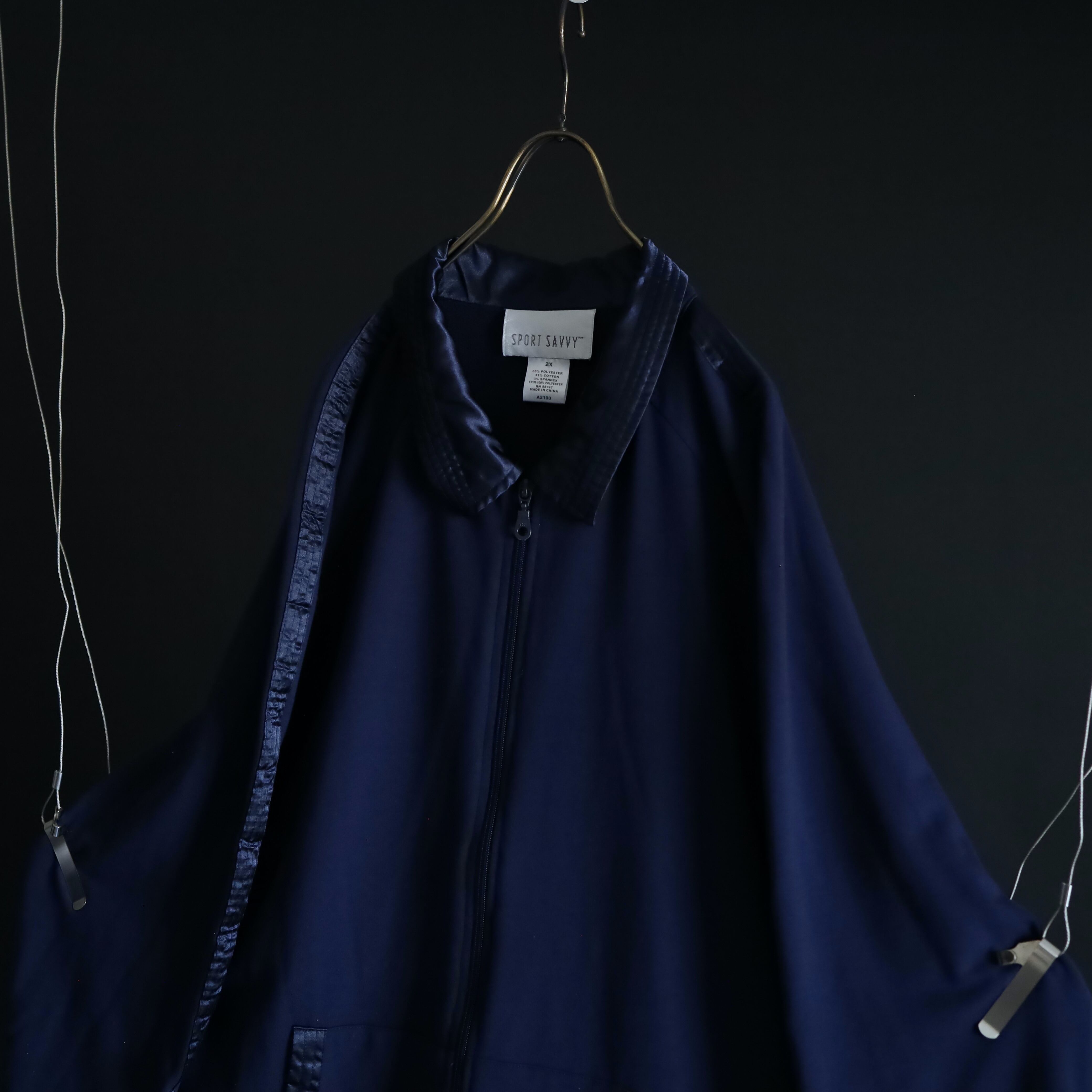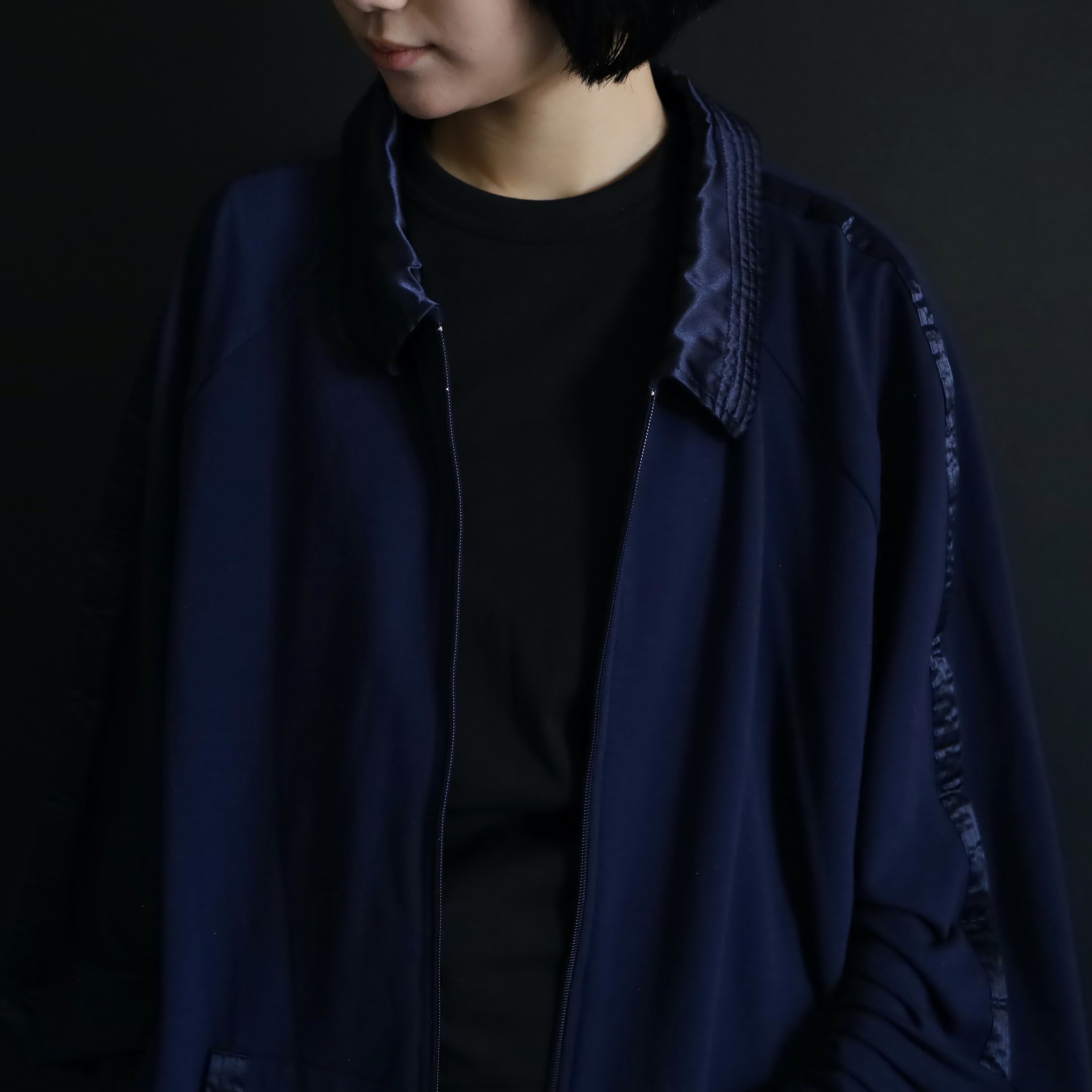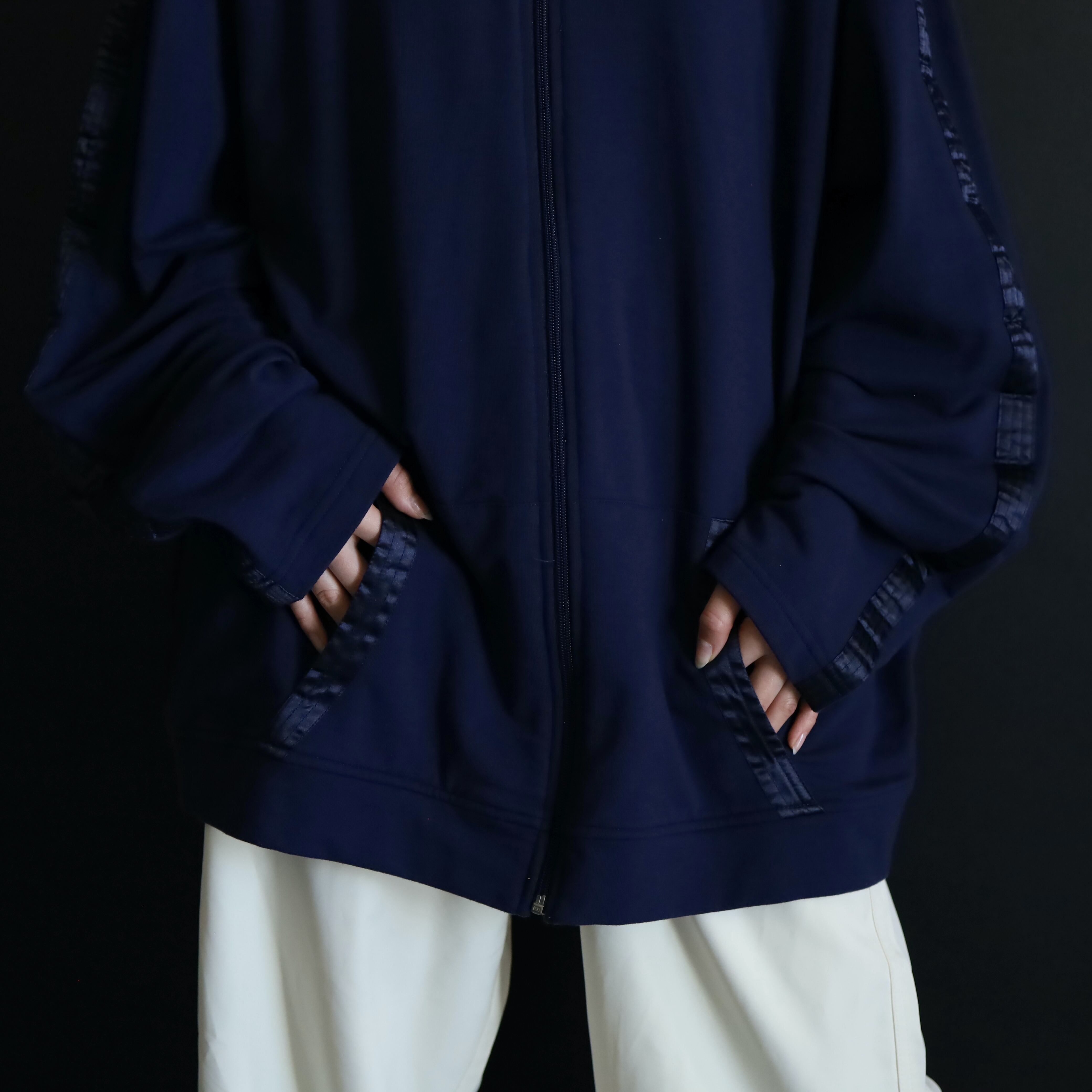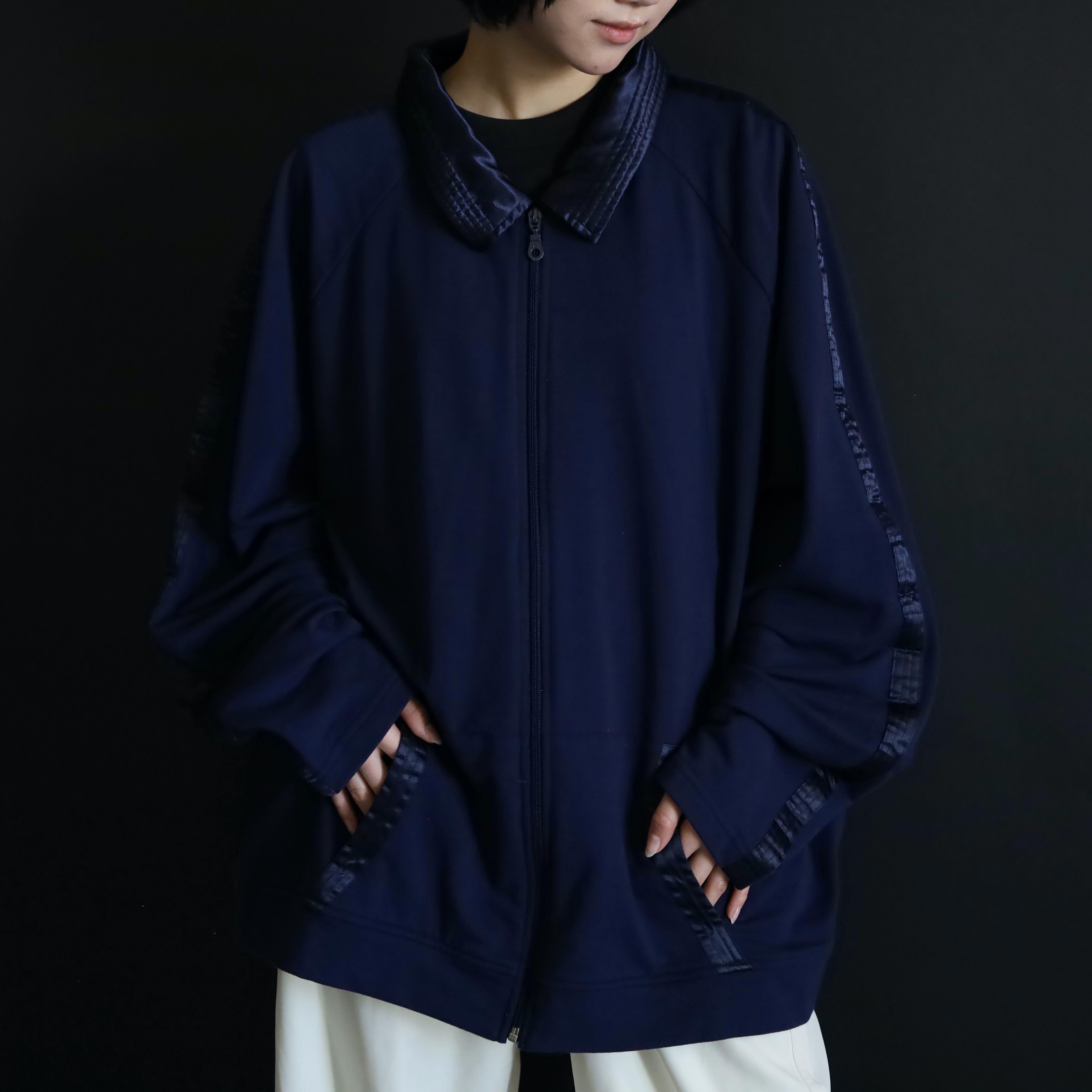 肩から袖先にかけても同様のサテン生地のラインが走る,同色異素材スイッチングデザイン.