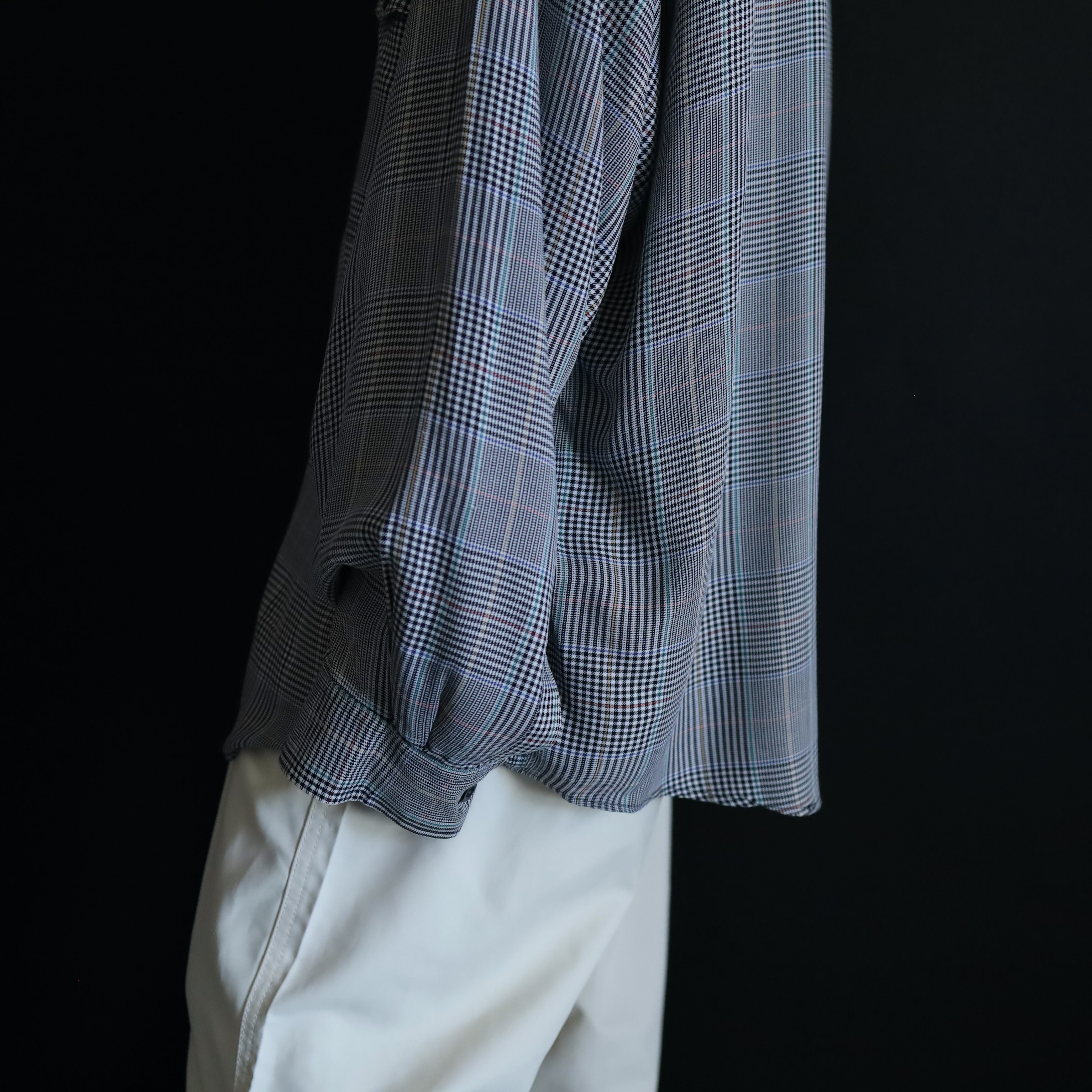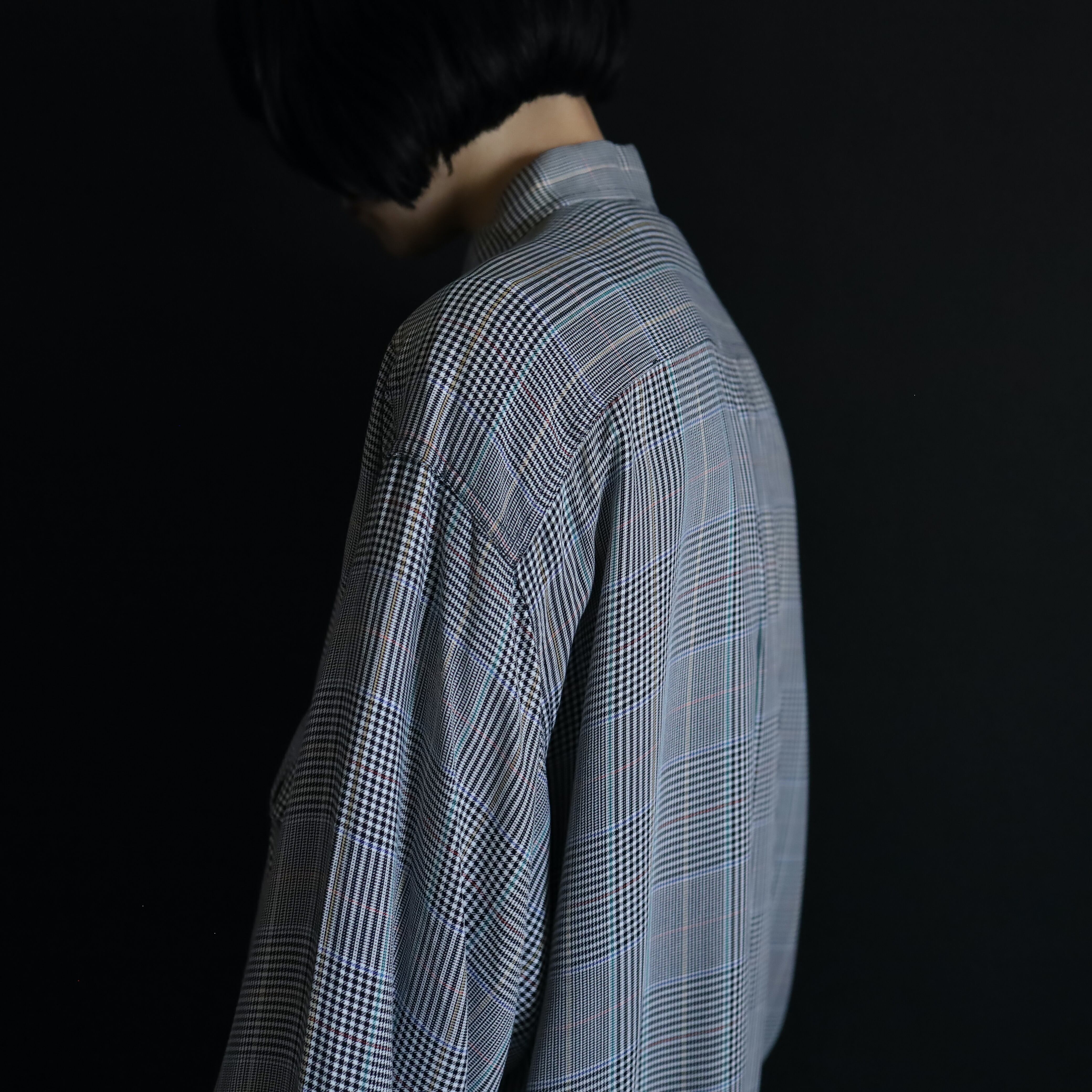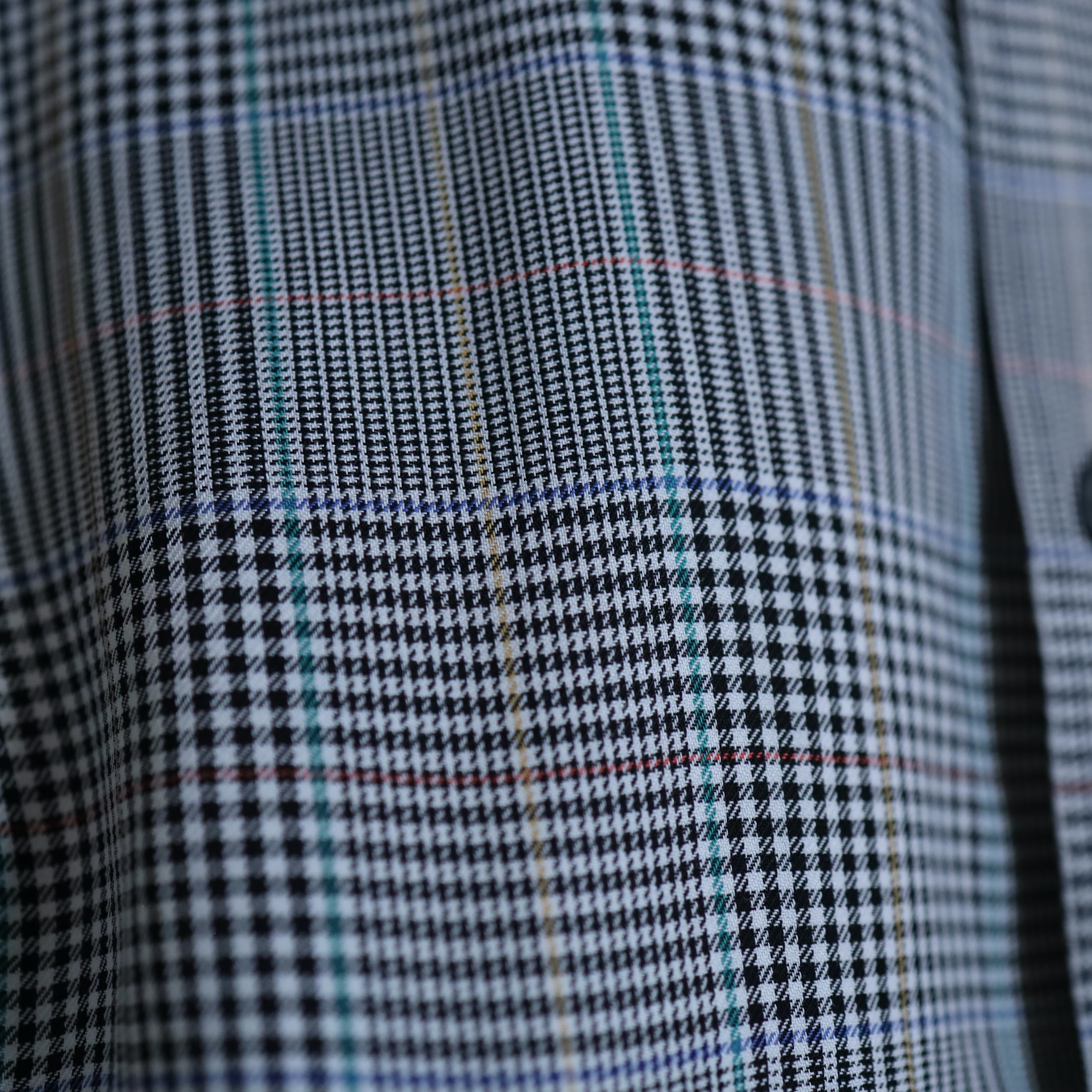 ブラックとホワイトを織り交ぜることで,グレーっぽく見えるボディをベースに,全体に細かくデザインされたグレンチェック.