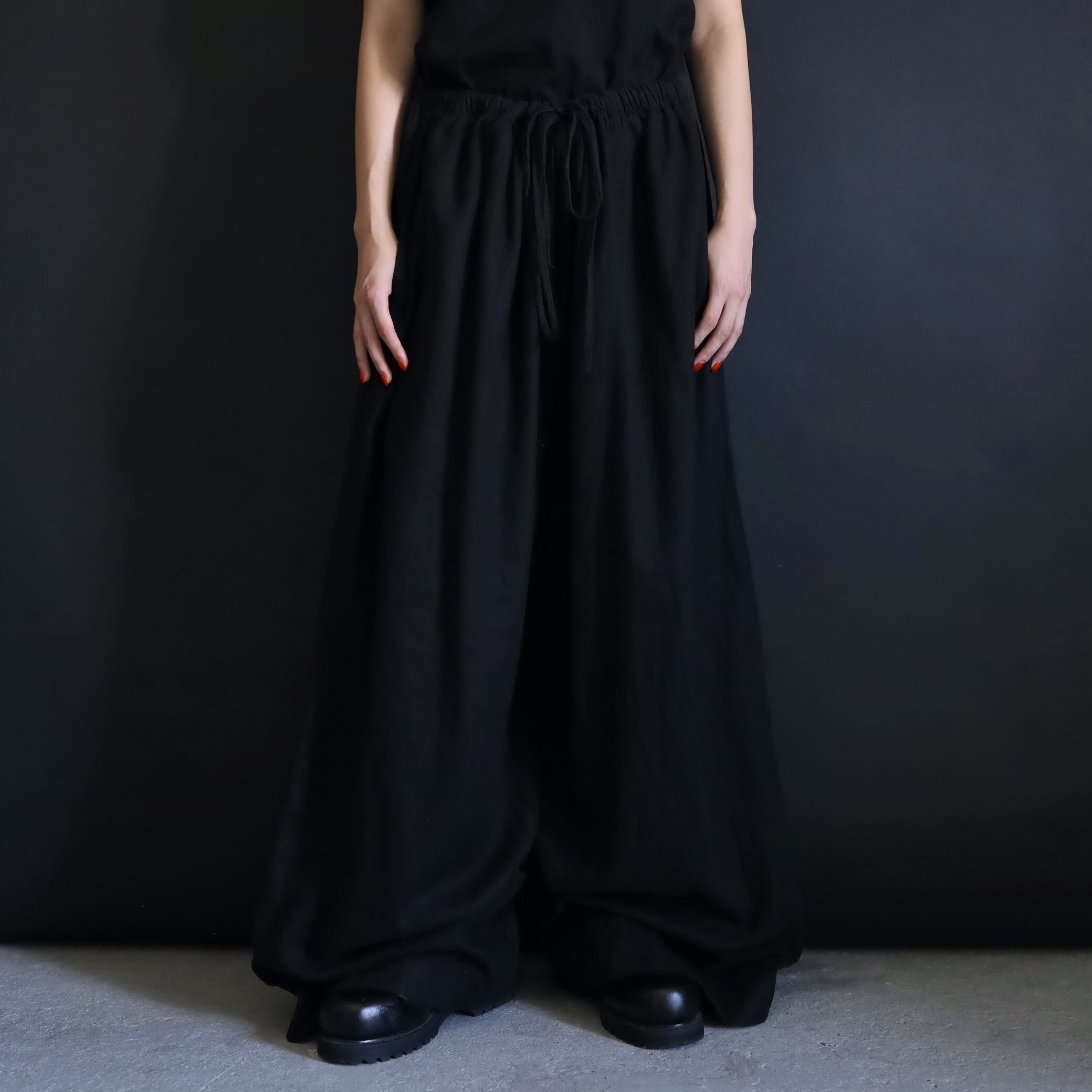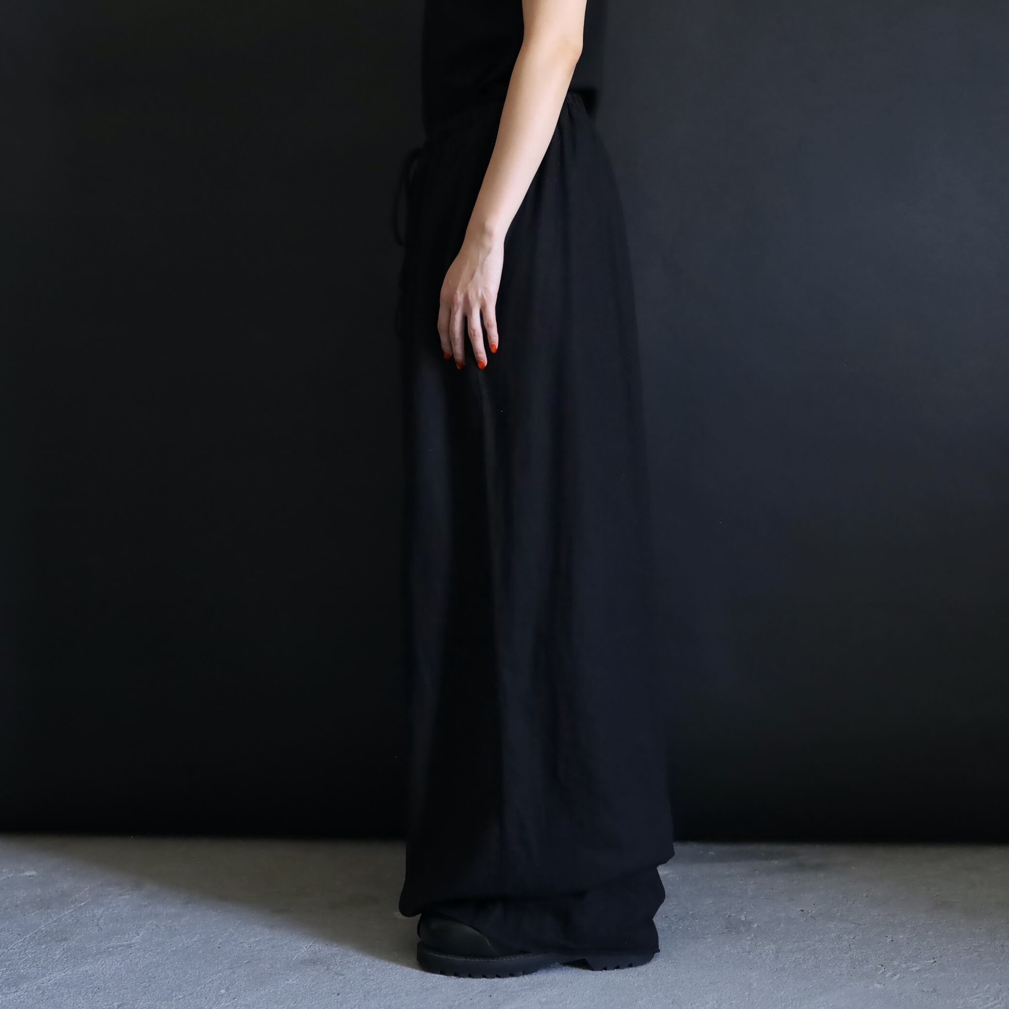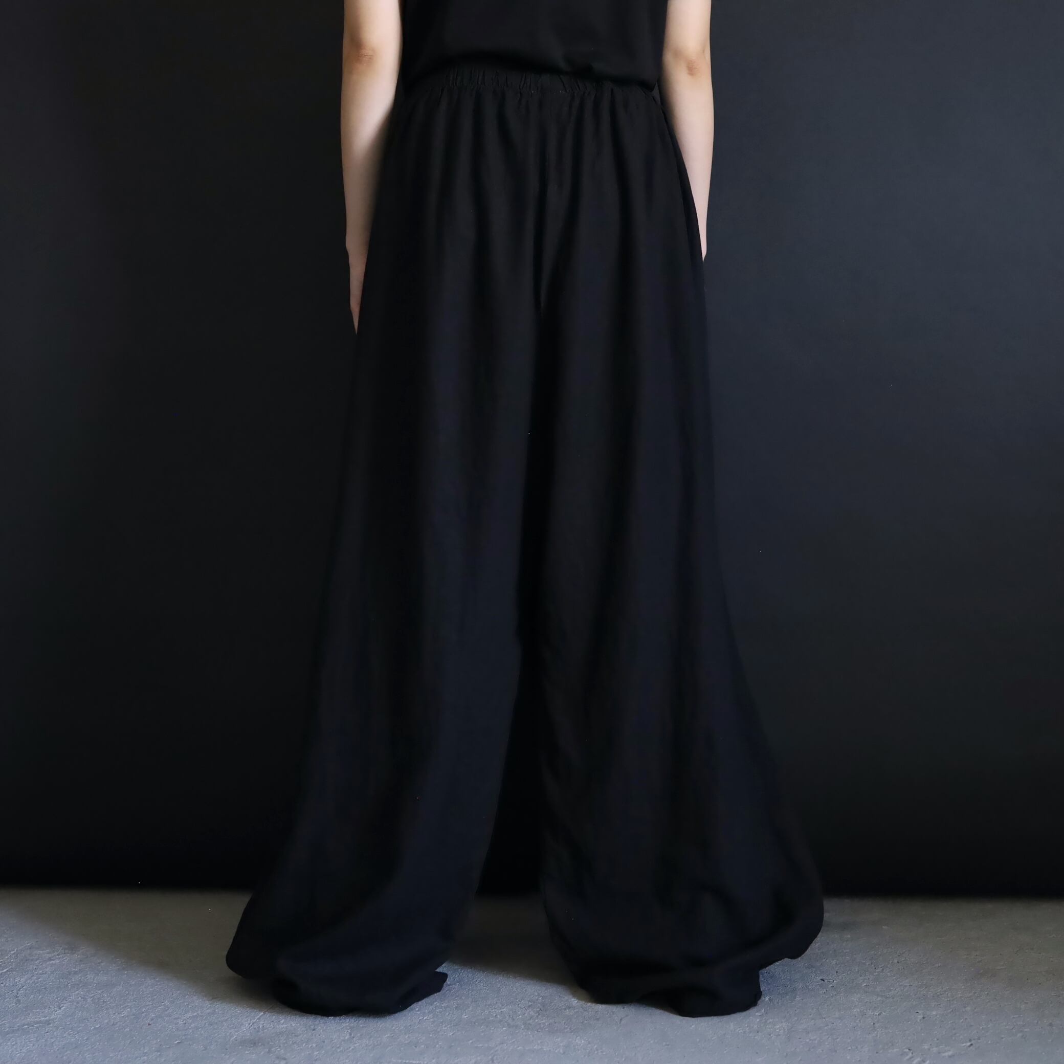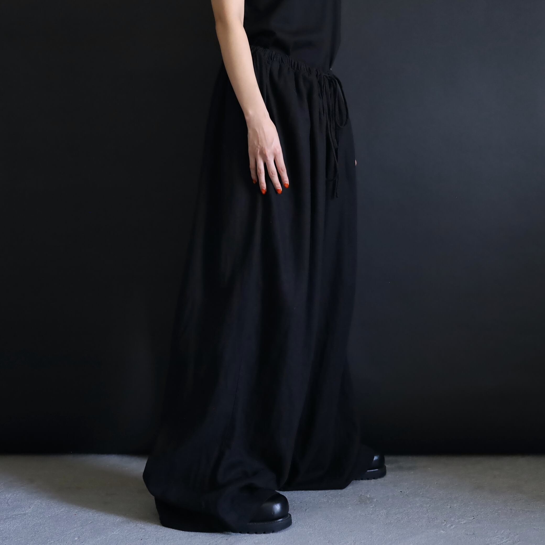 生地の落ち感や揺れる表情によるこのルーズ具合,ワイドパンツファンには堪らない一本かと.