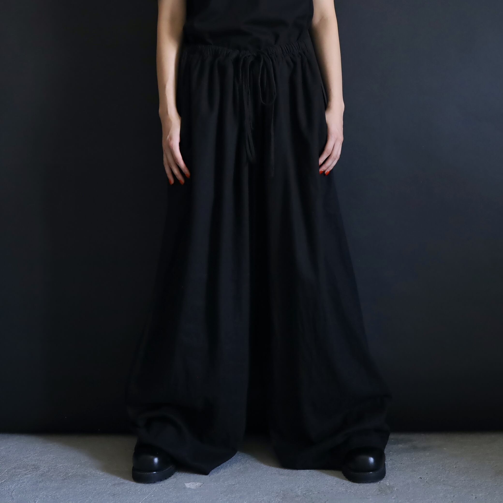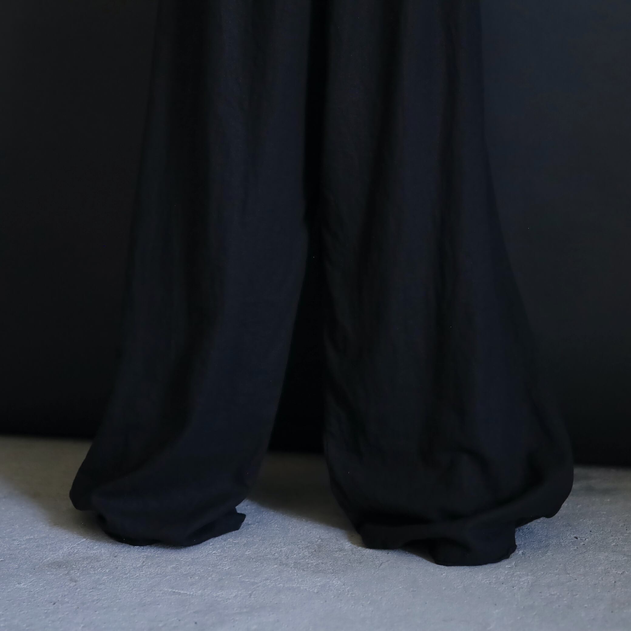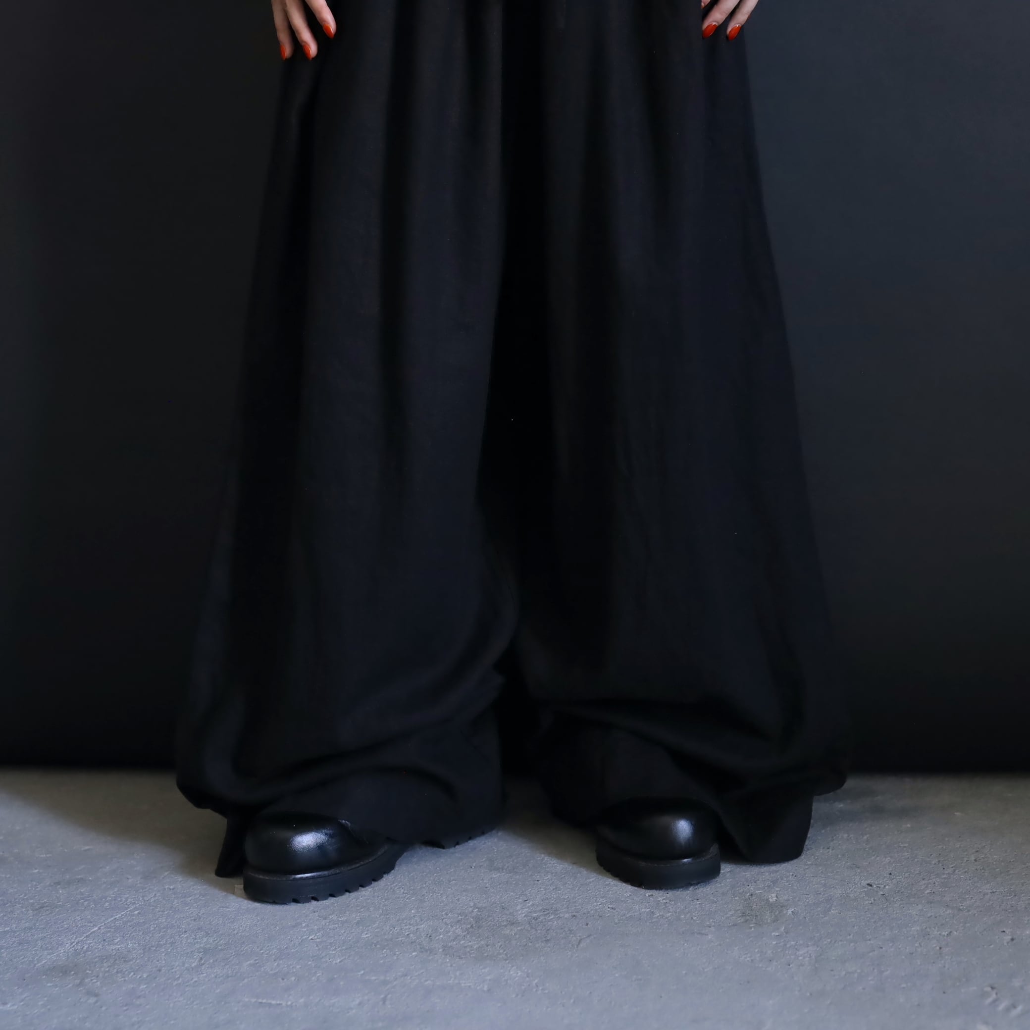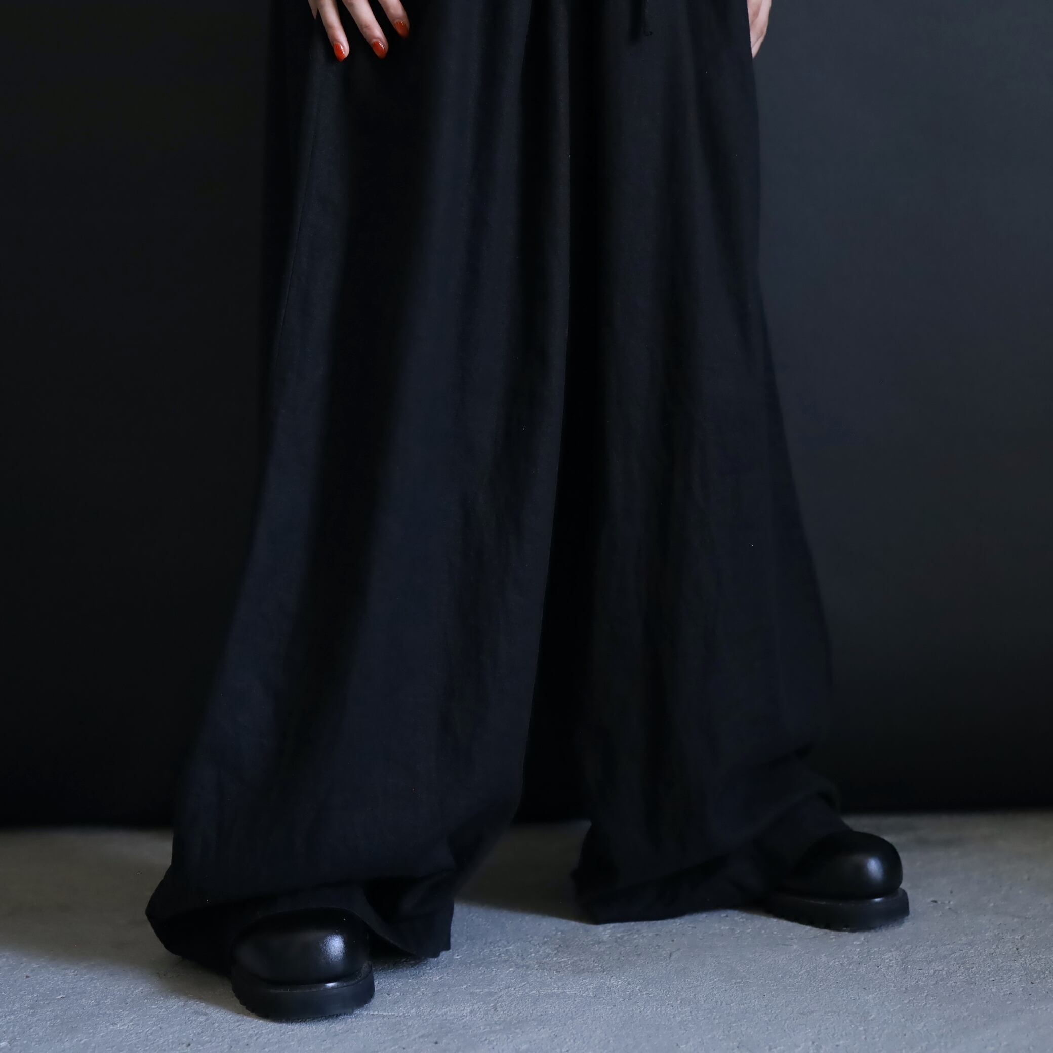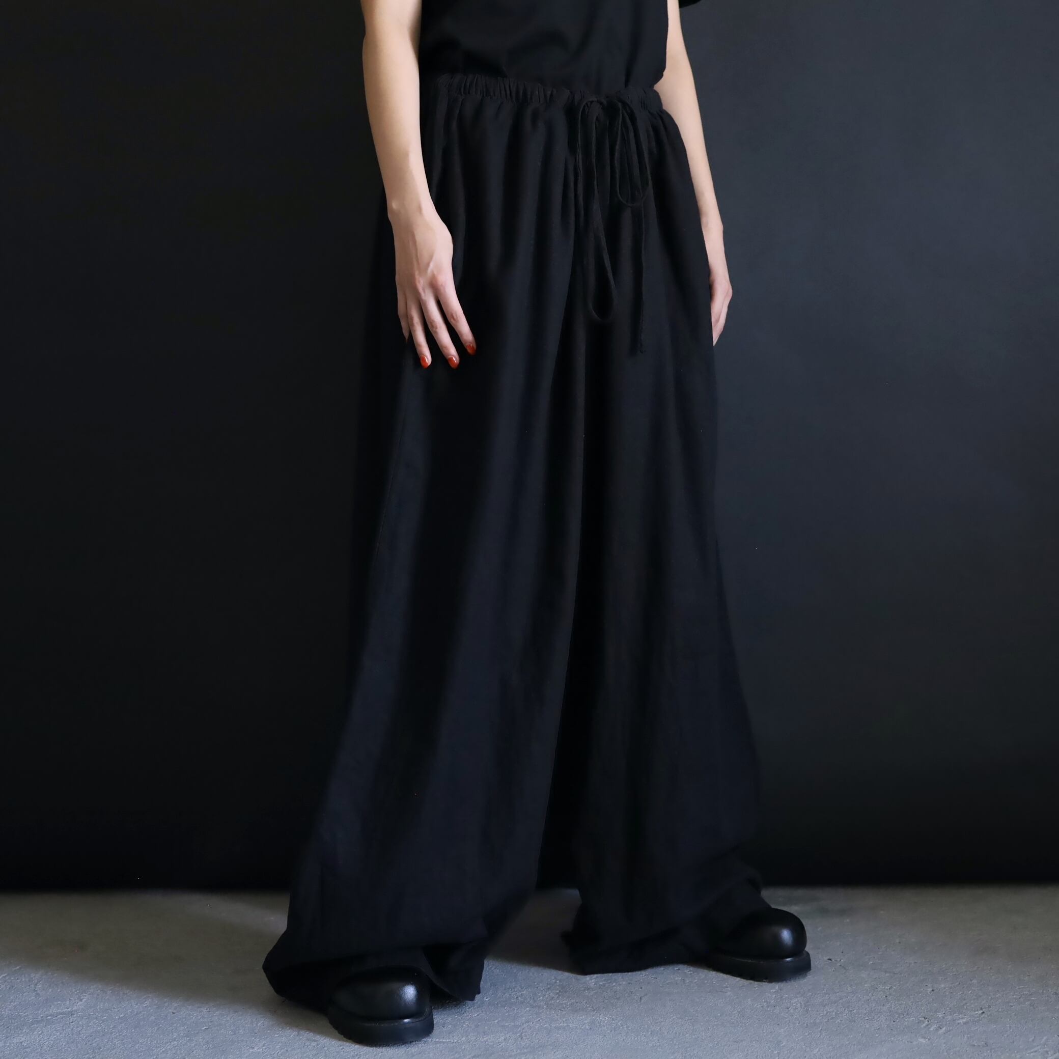 生地の落ち感や揺れる表情によるこのルーズ具合,ワイドパンツファンには堪らない一本かと.