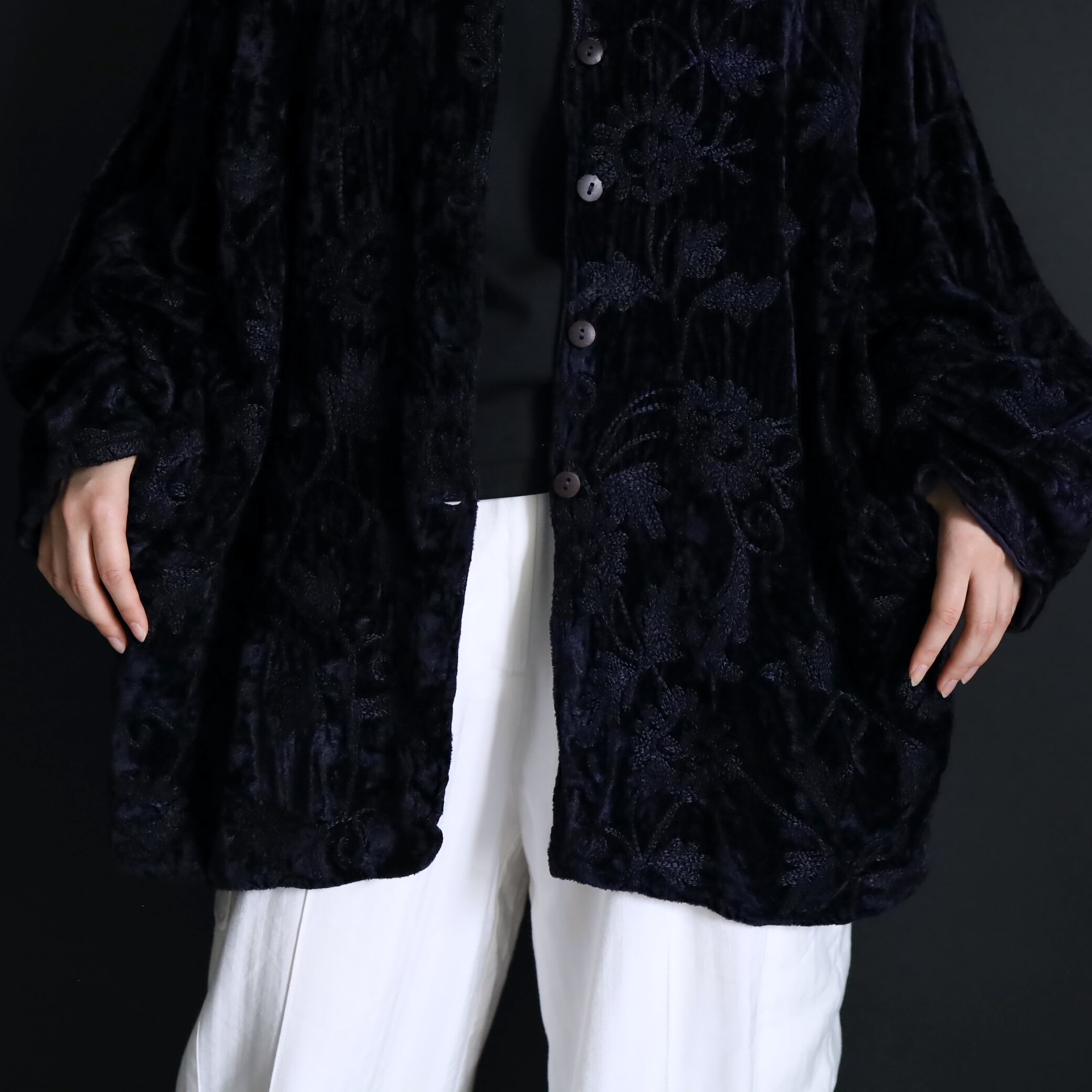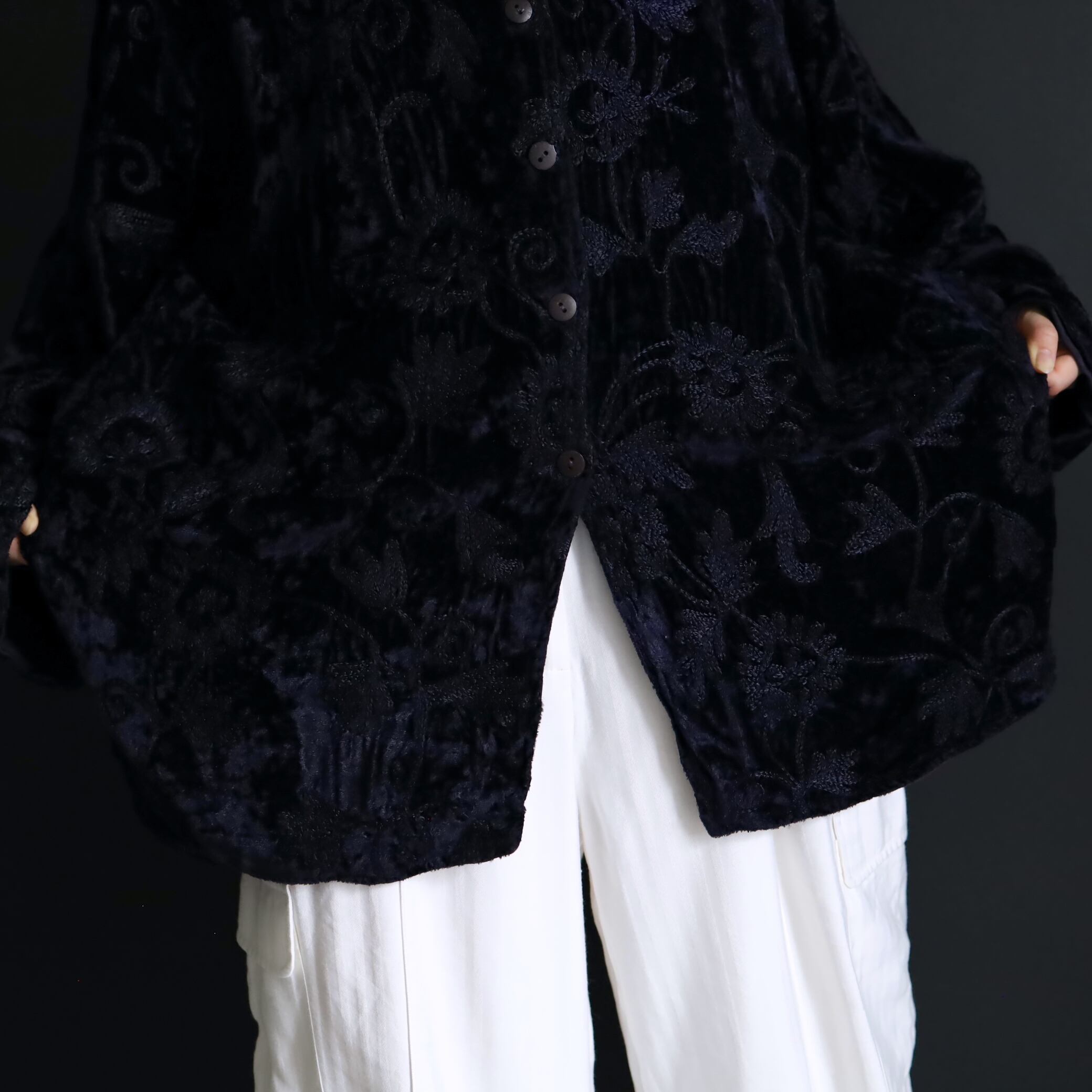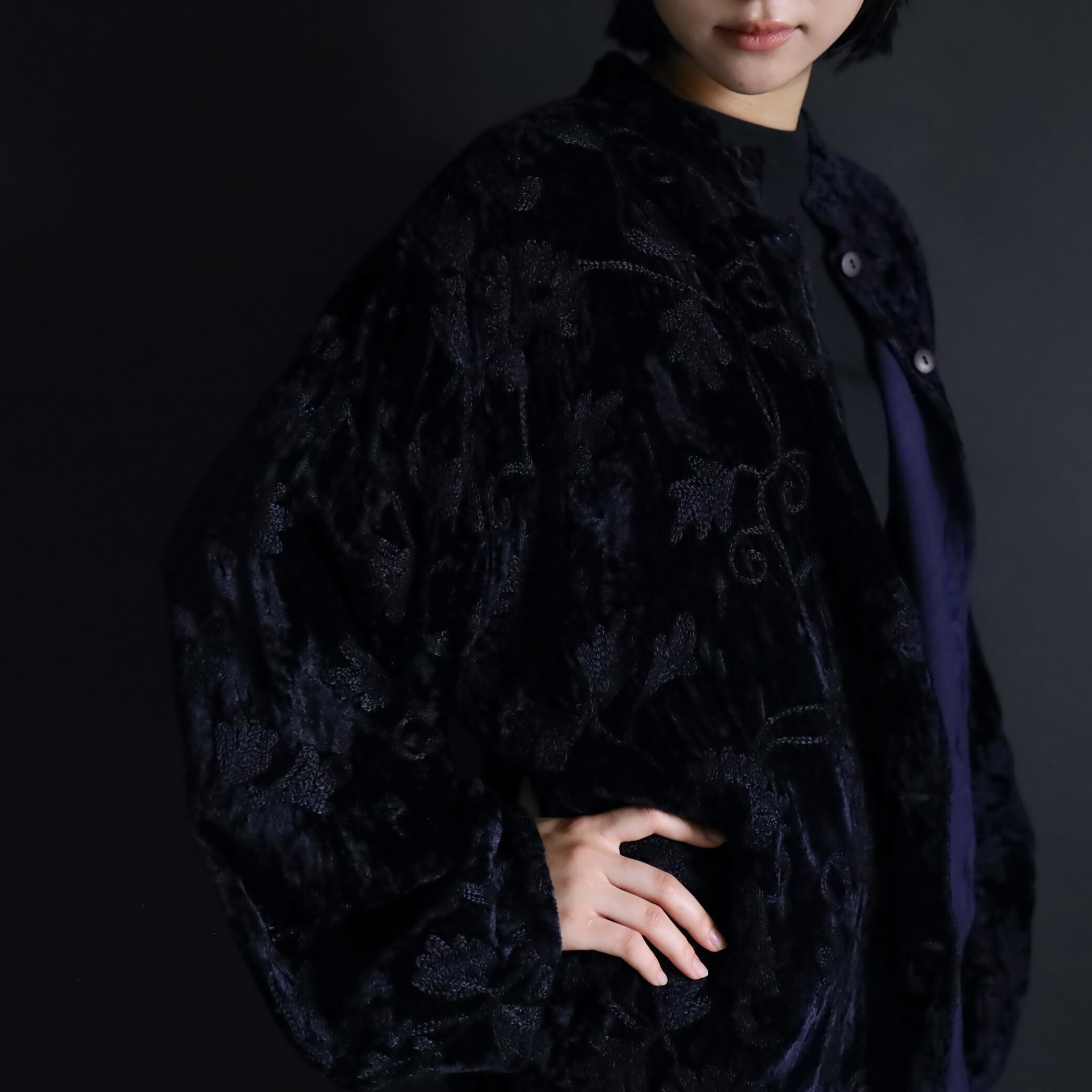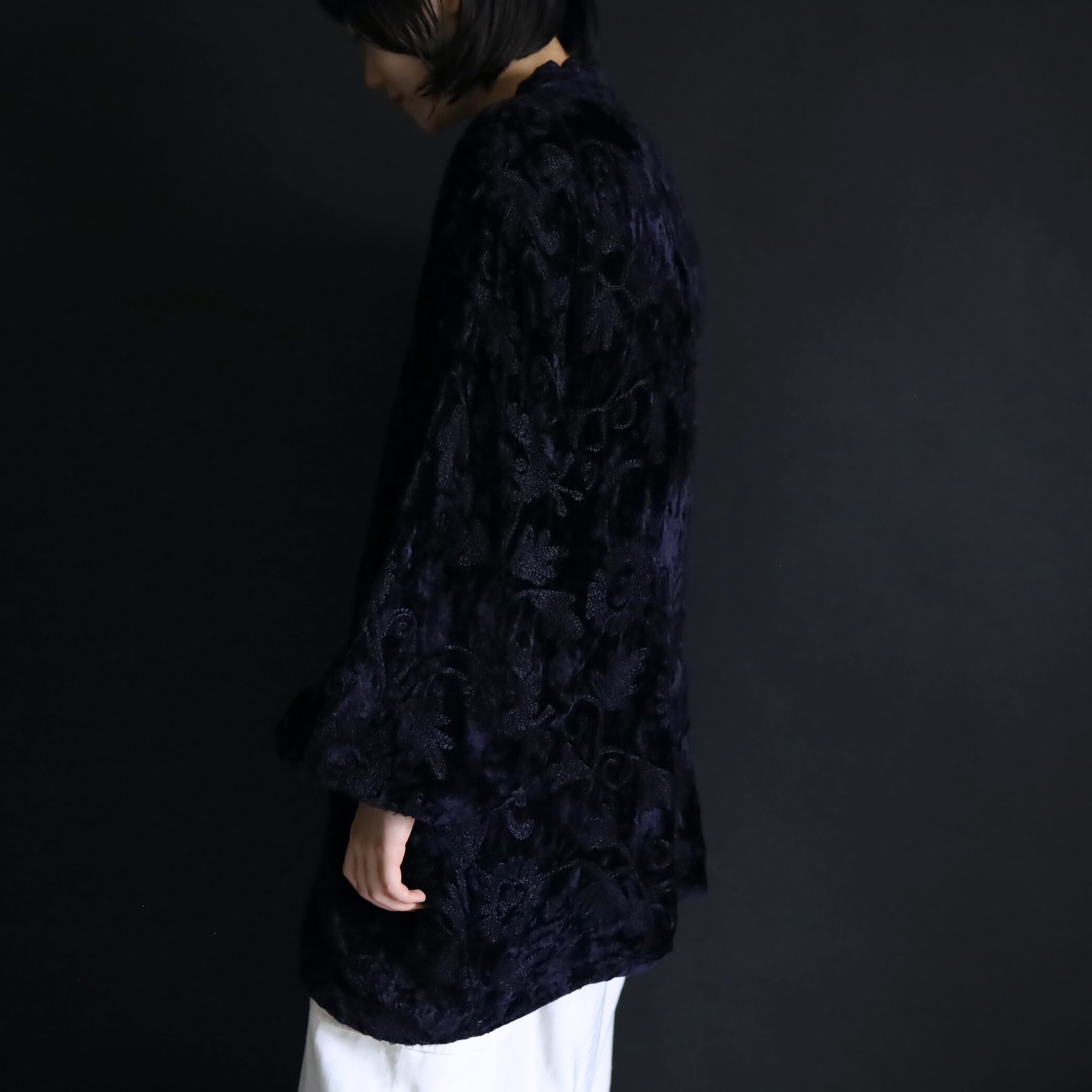 総刺繍でデザインされたスタンドカラージャケット.