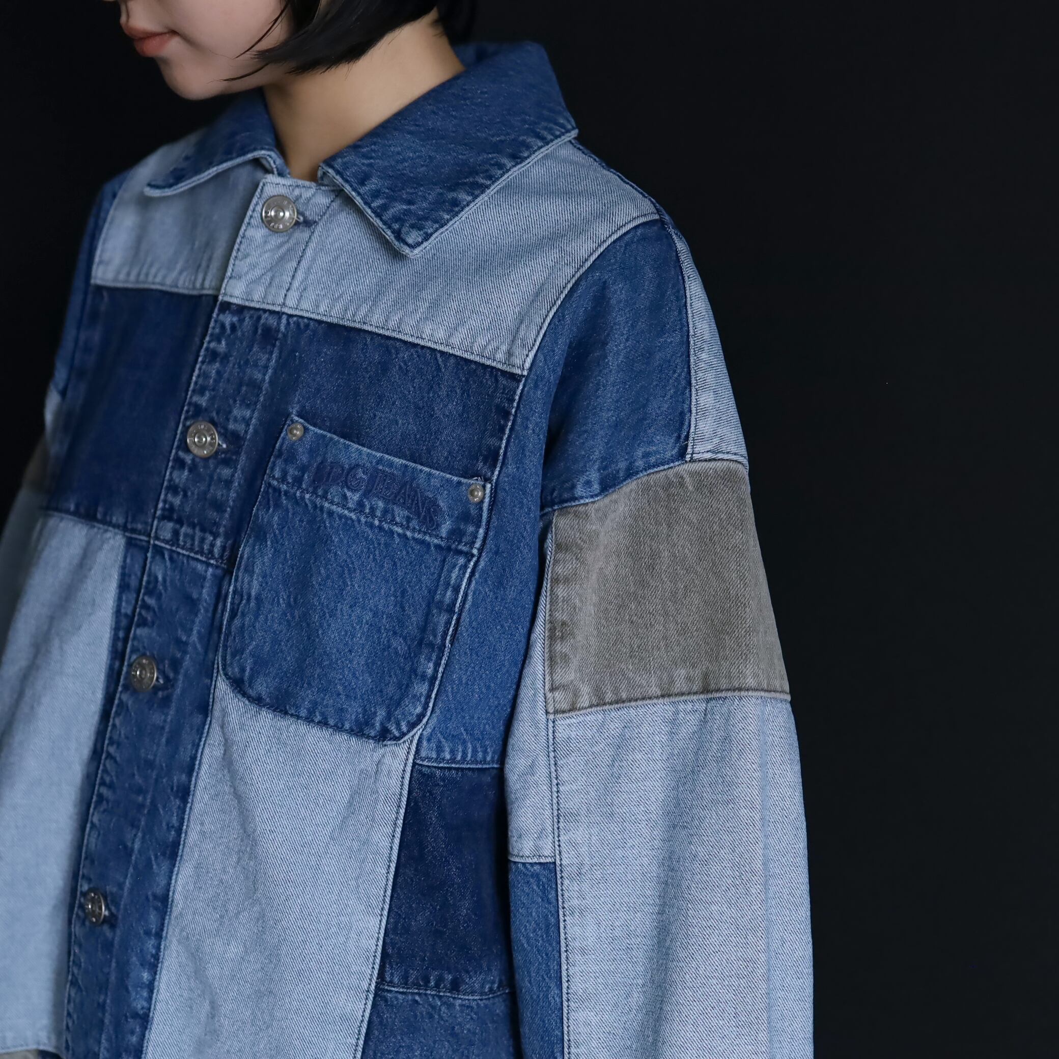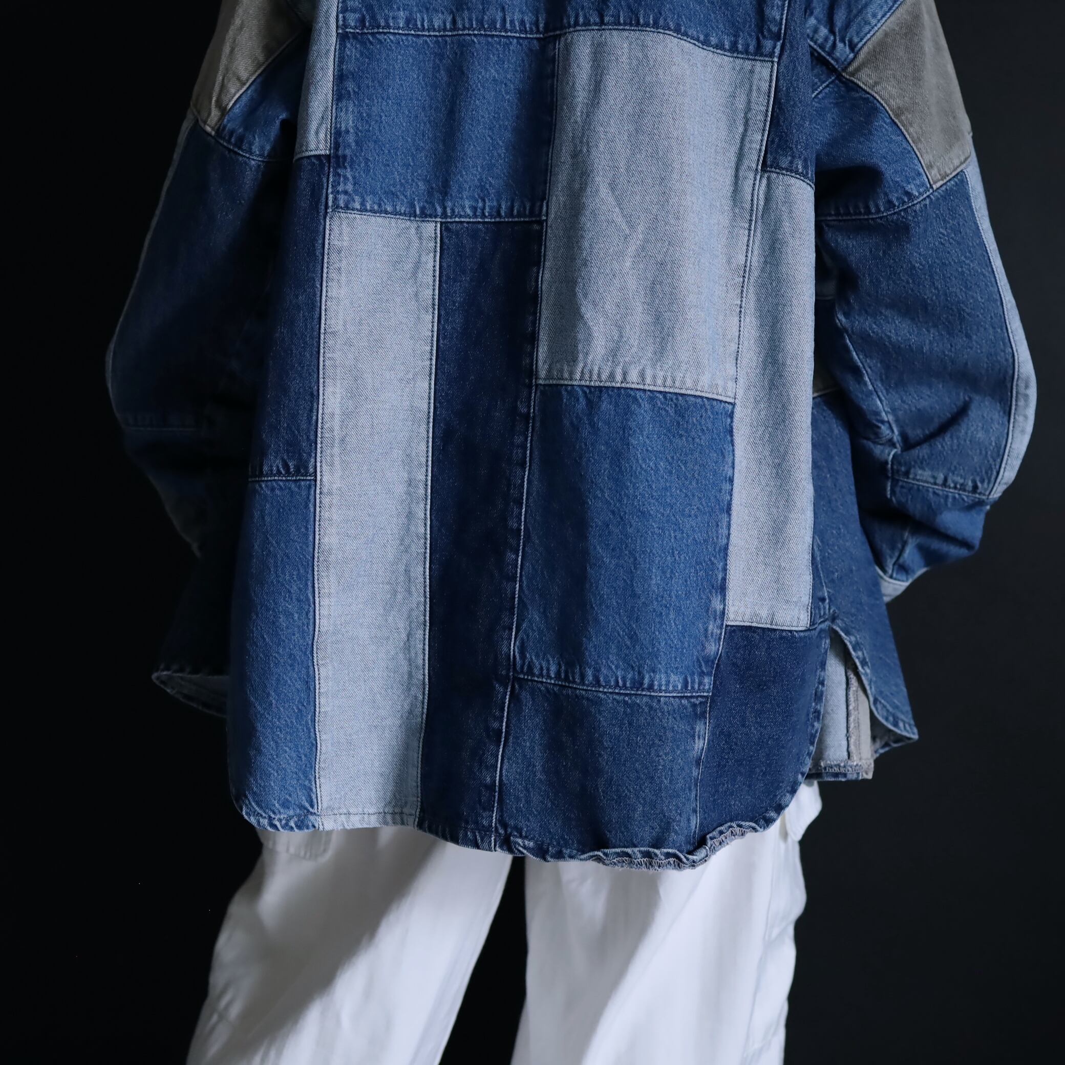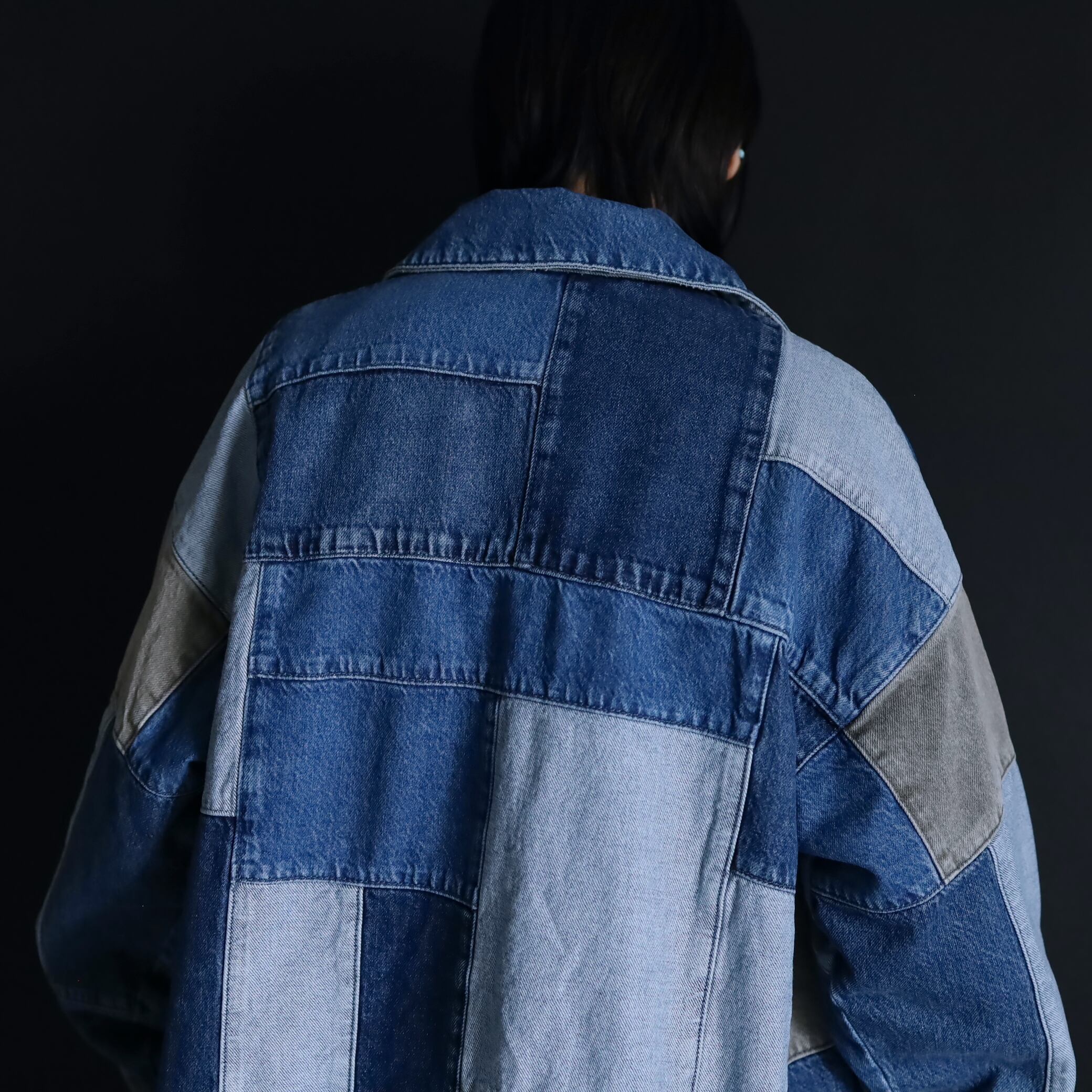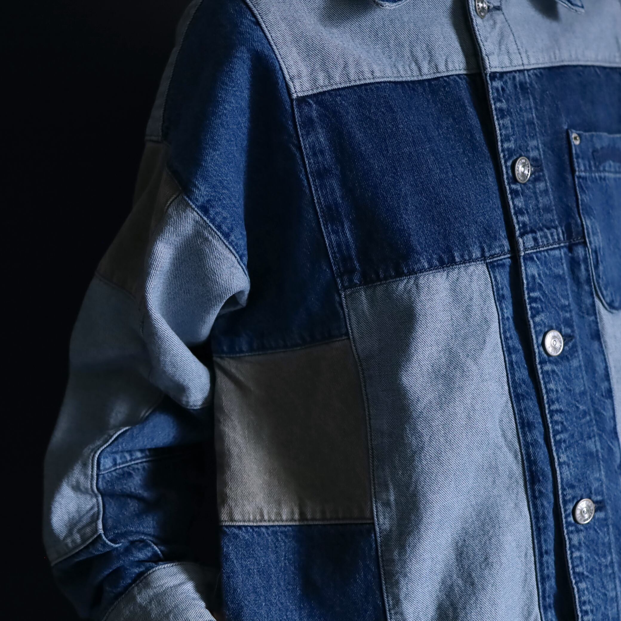 ミドルインディゴ,ブルー,アイスブルーの寒色と,グレージュの計4色のデニムで構成された一枚.