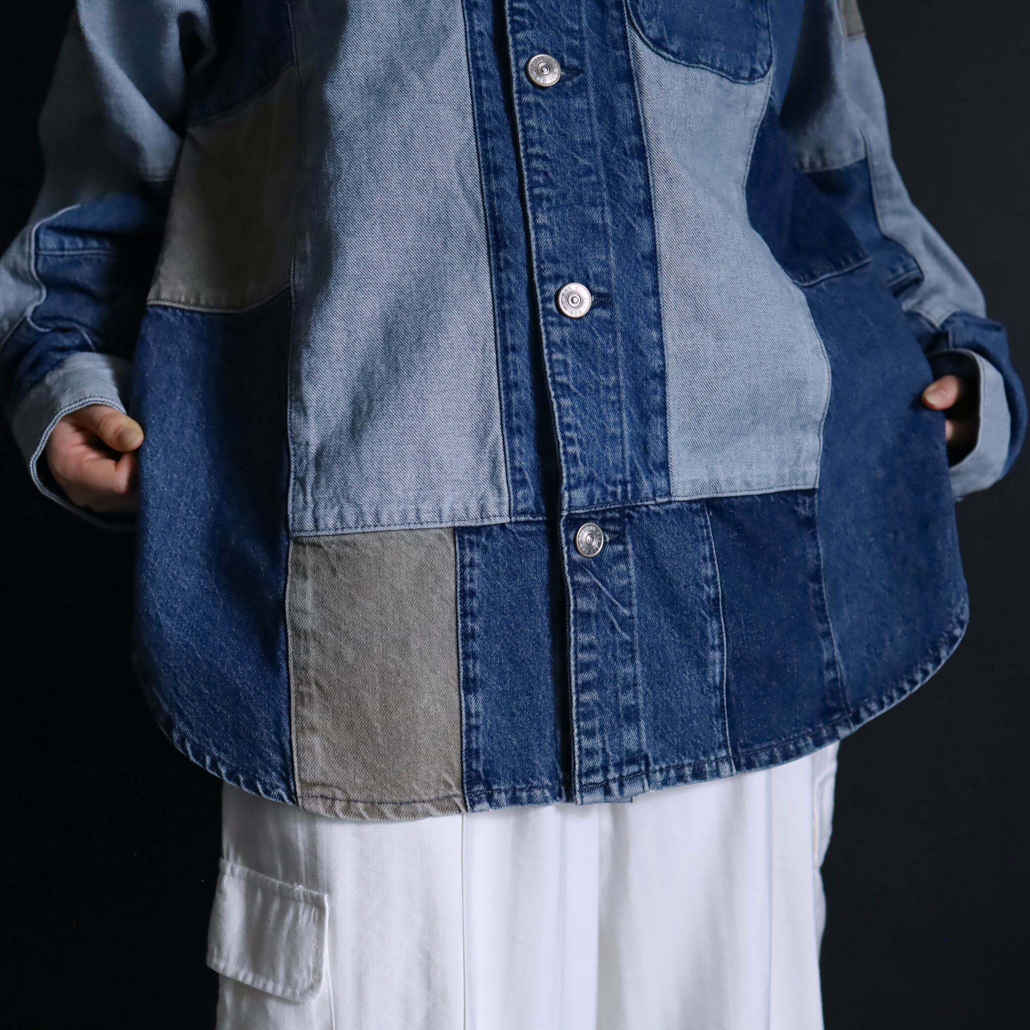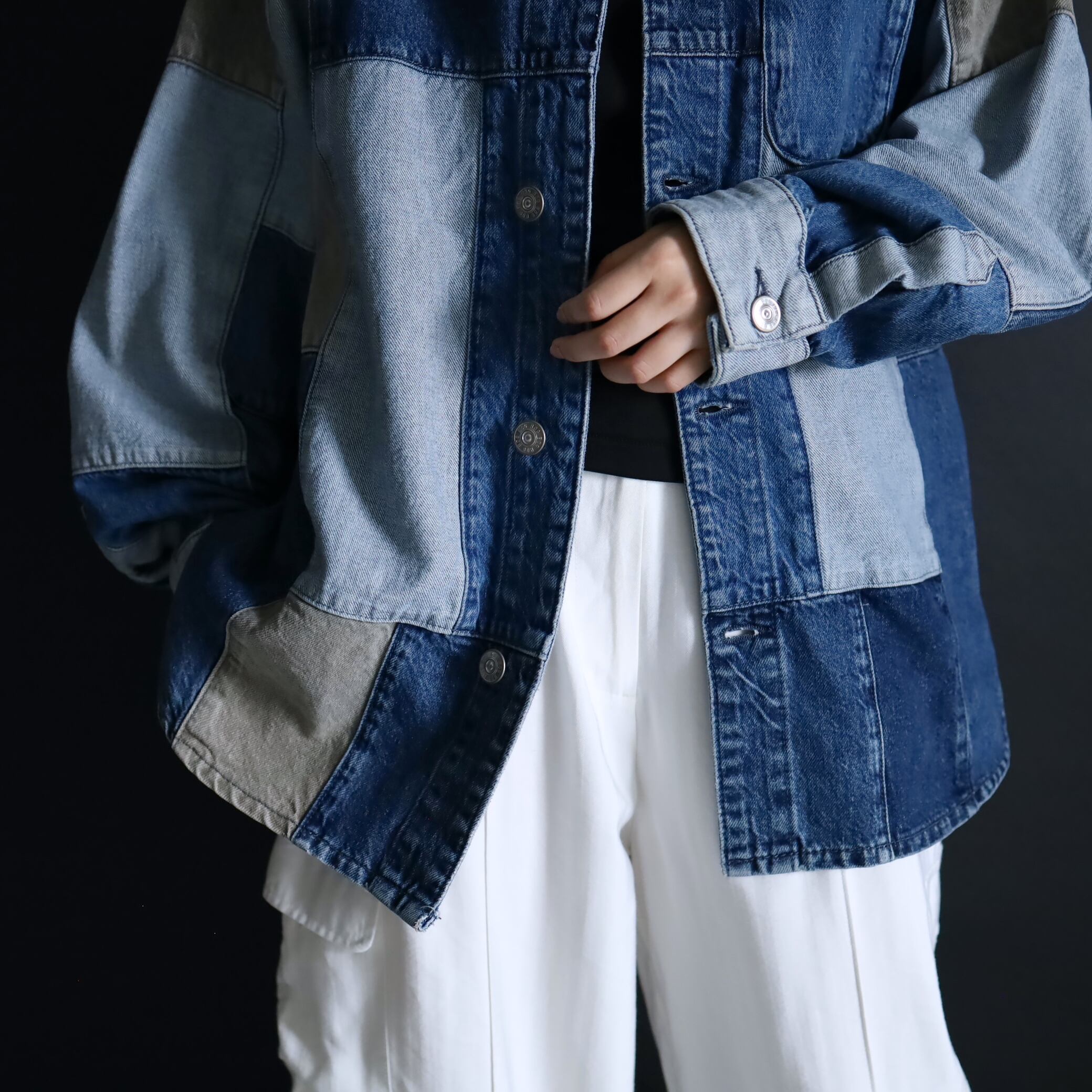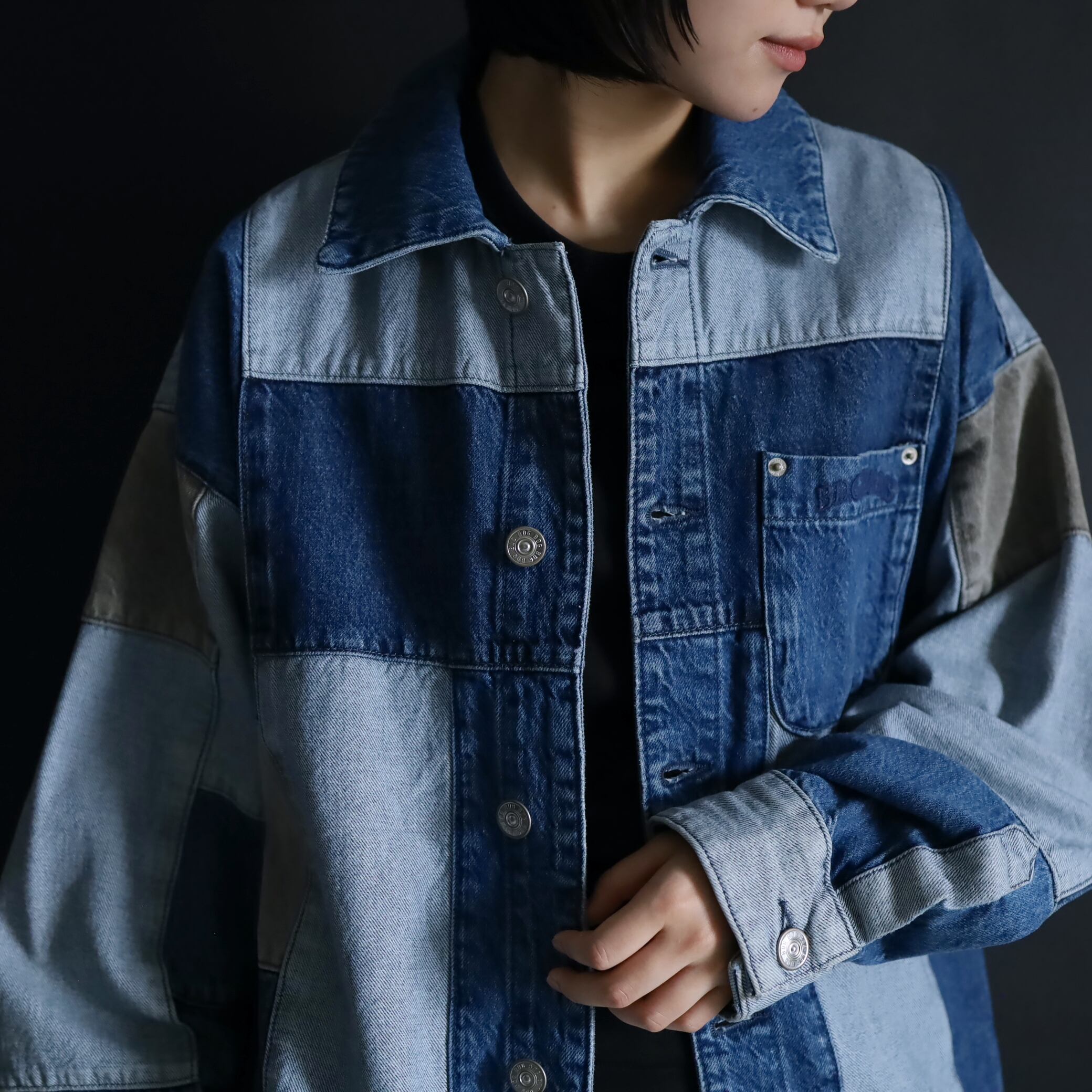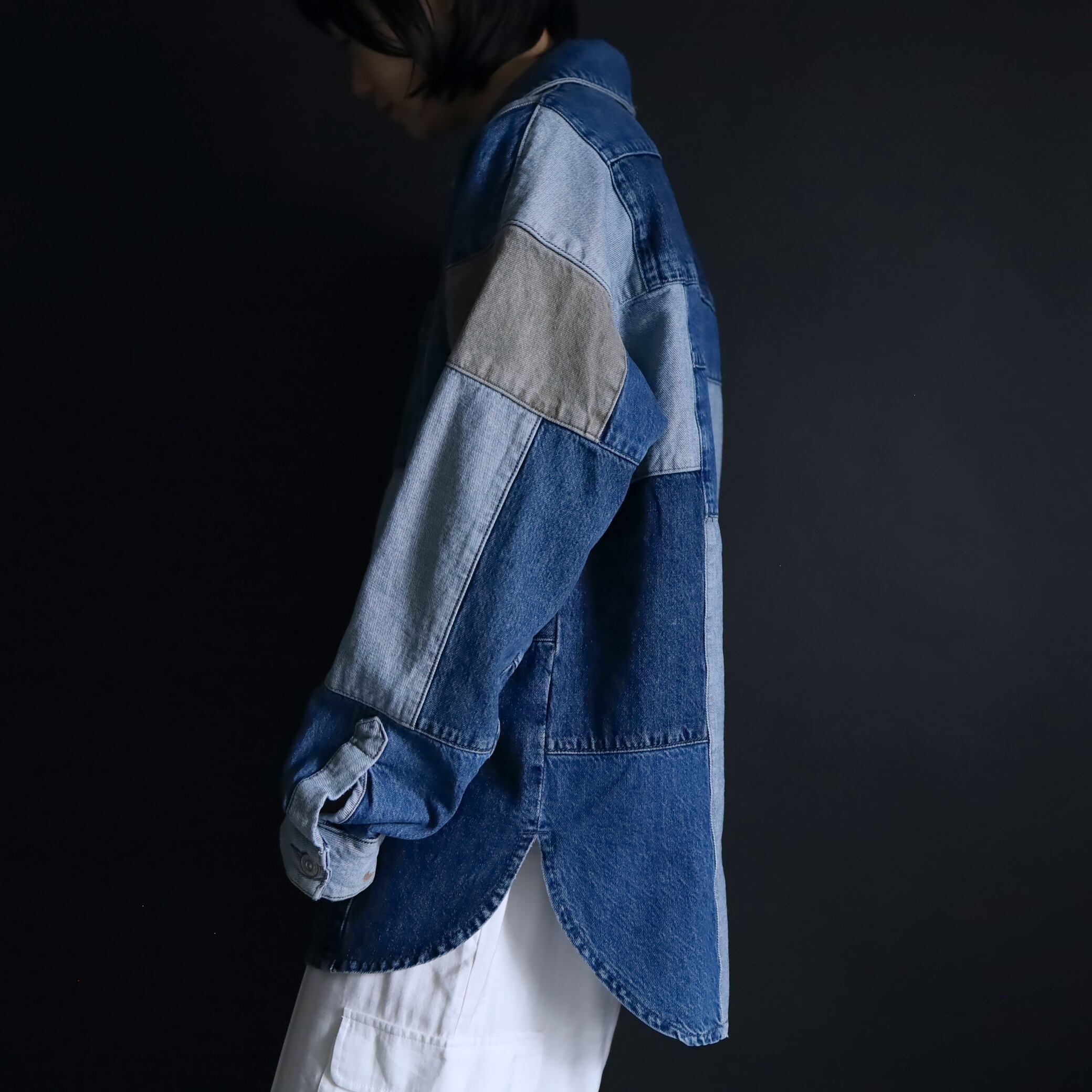 ミドルインディゴ,ブルー,アイスブルーの寒色と,グレージュの計4色のデニムで構成された一枚.