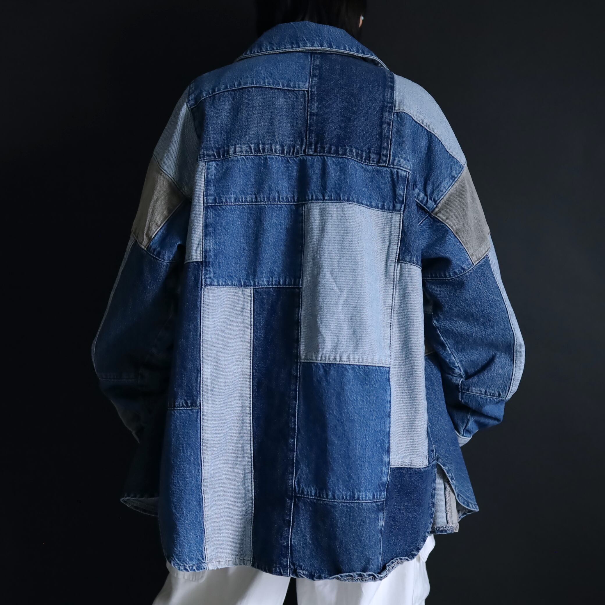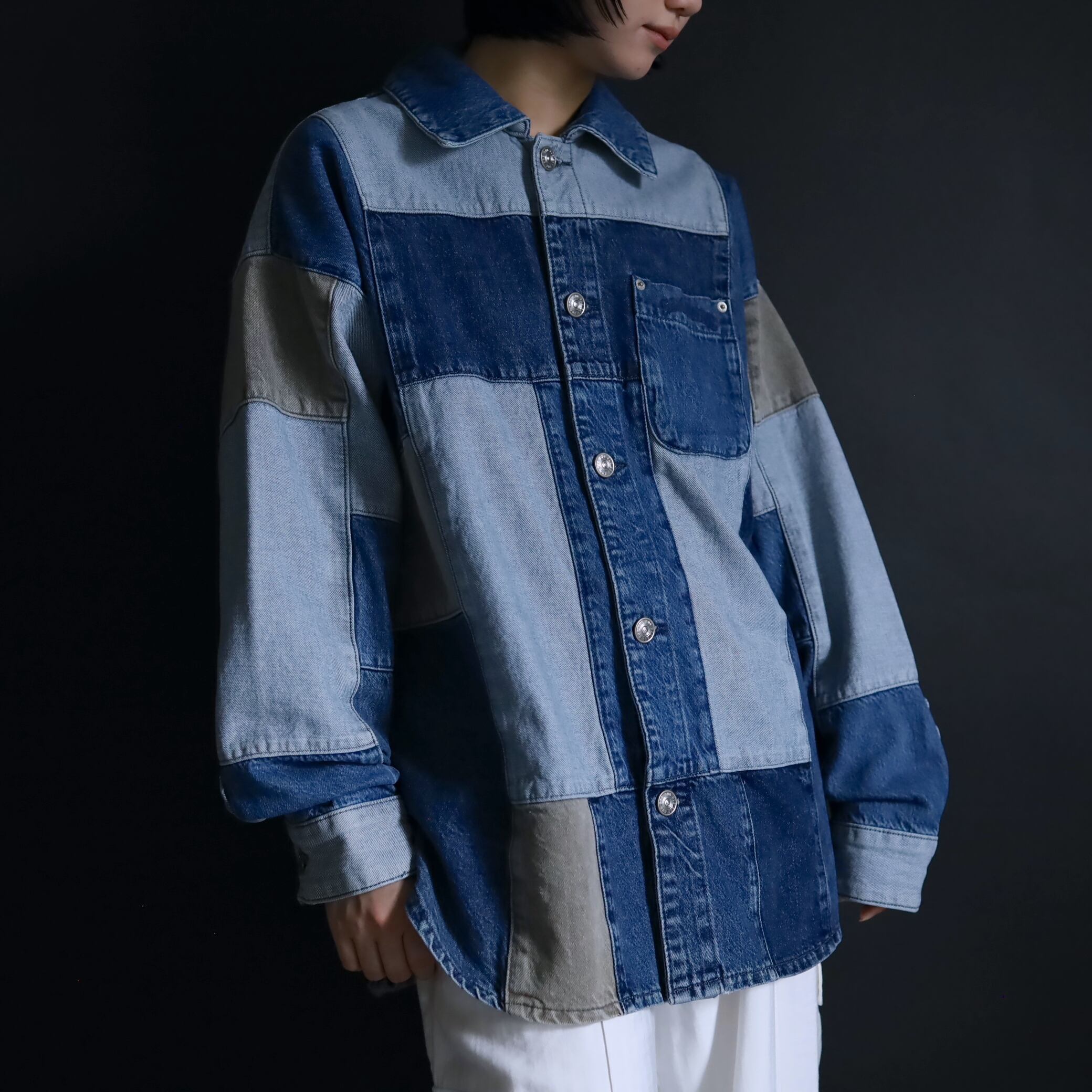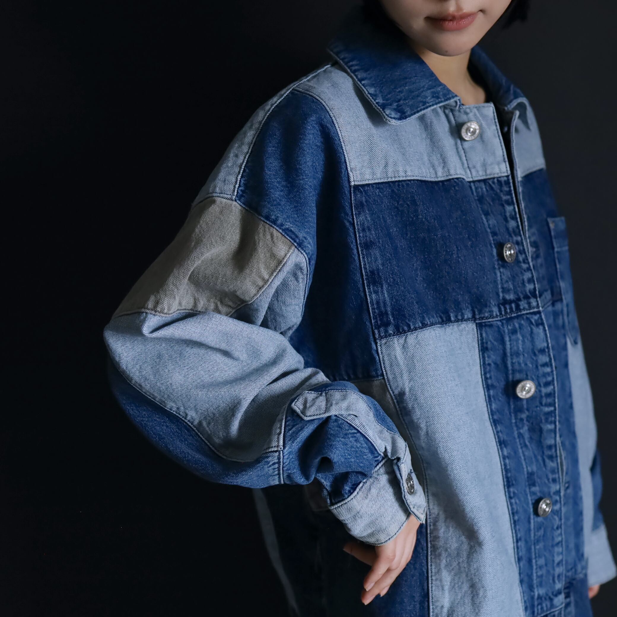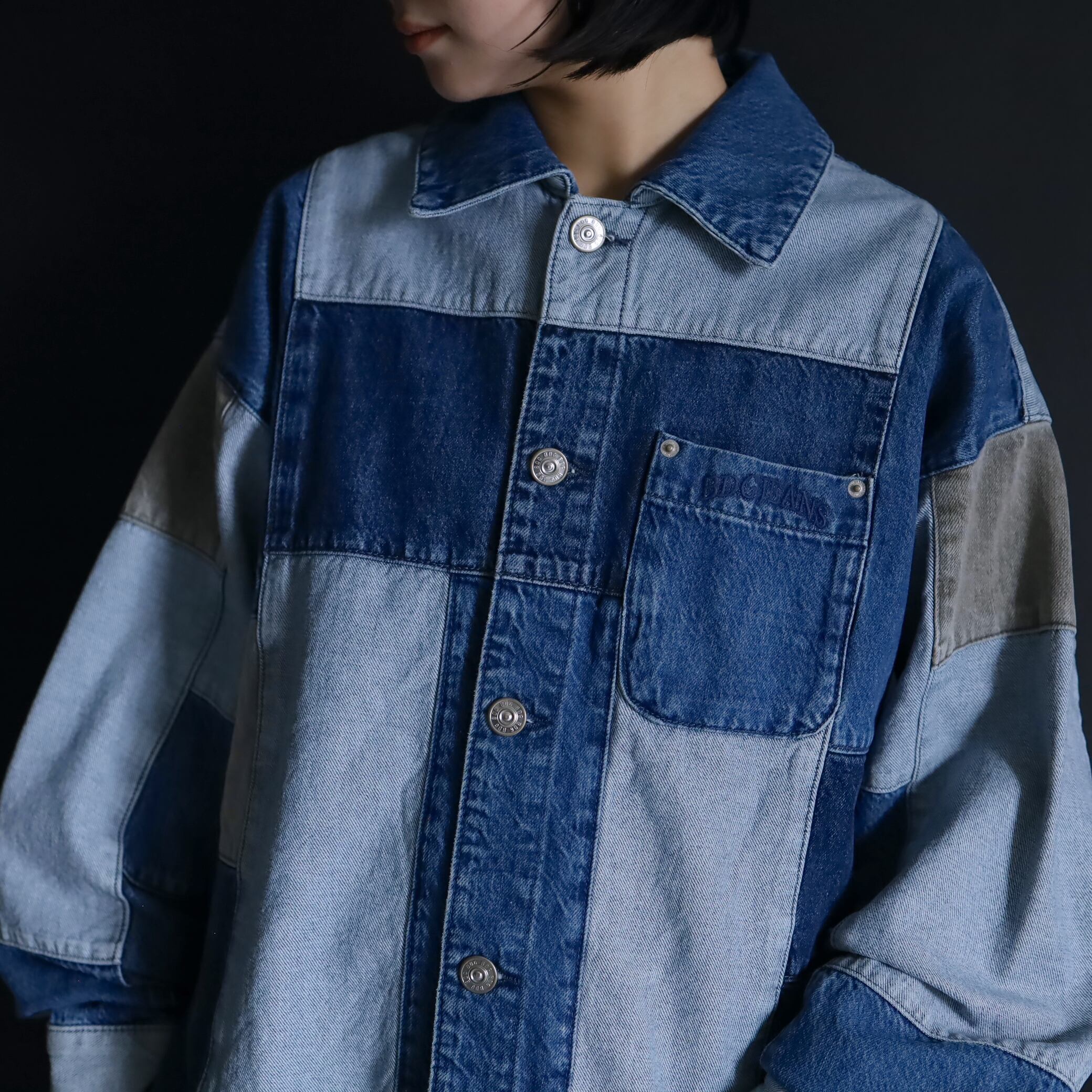 ミドルインディゴ,ブルー,アイスブルーの寒色と,グレージュの計4色のデニムで構成された一枚.