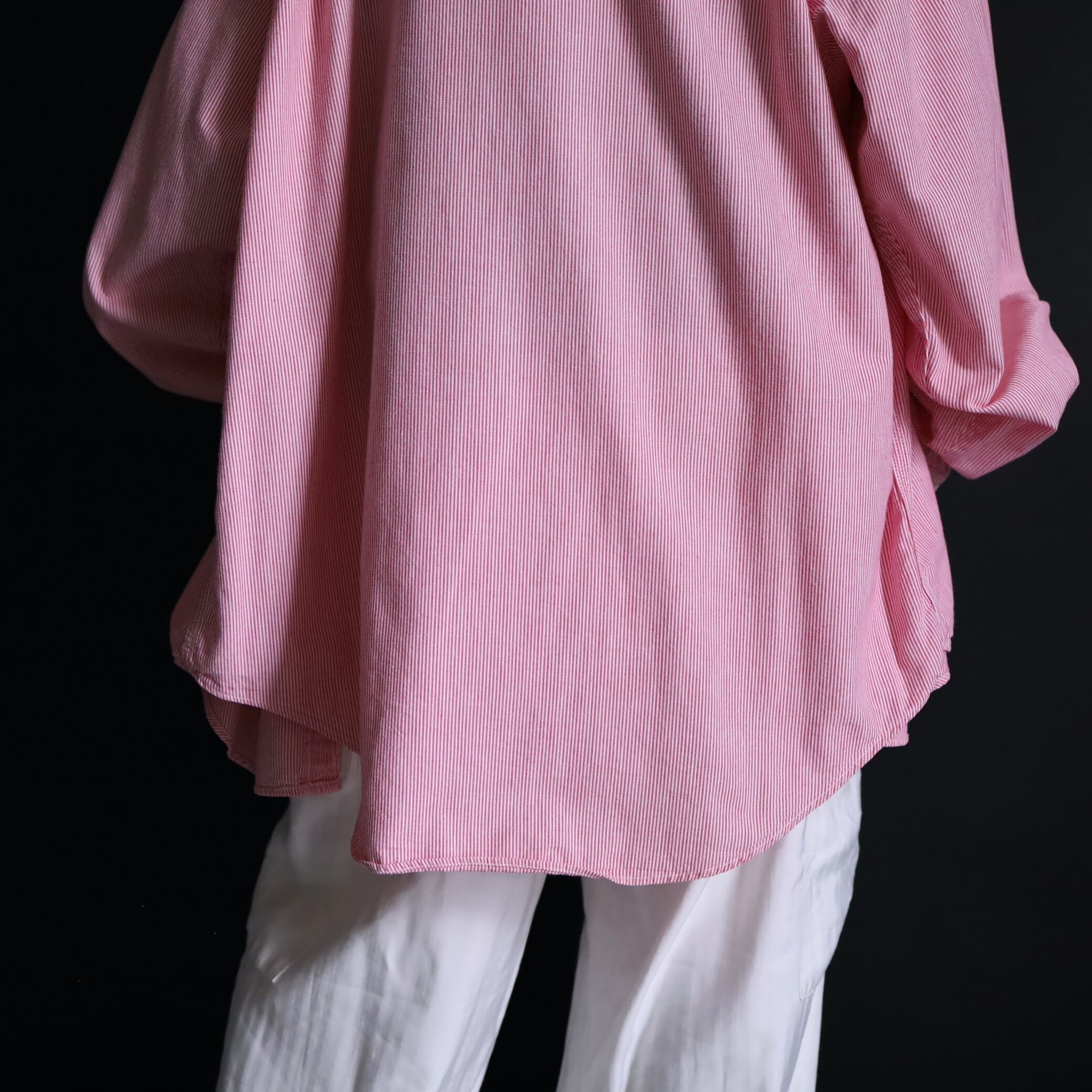 裾はラウンドカットでコシの位置を曖昧に見せるため,オーバーサイズで着ても野暮ったさを抑えてくれます.