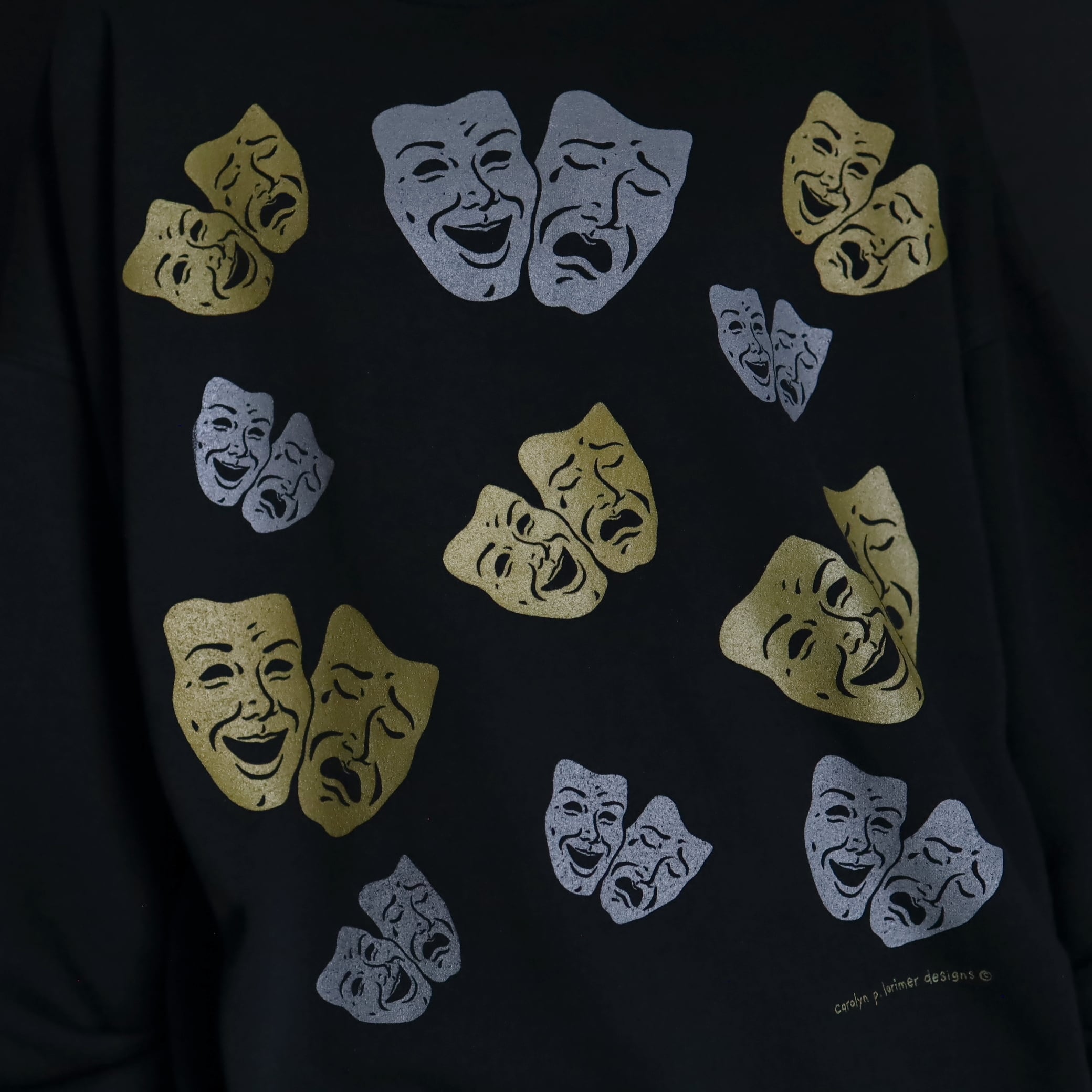 フロントに多数,金銀の喜劇と悲劇の仮面プリント.
