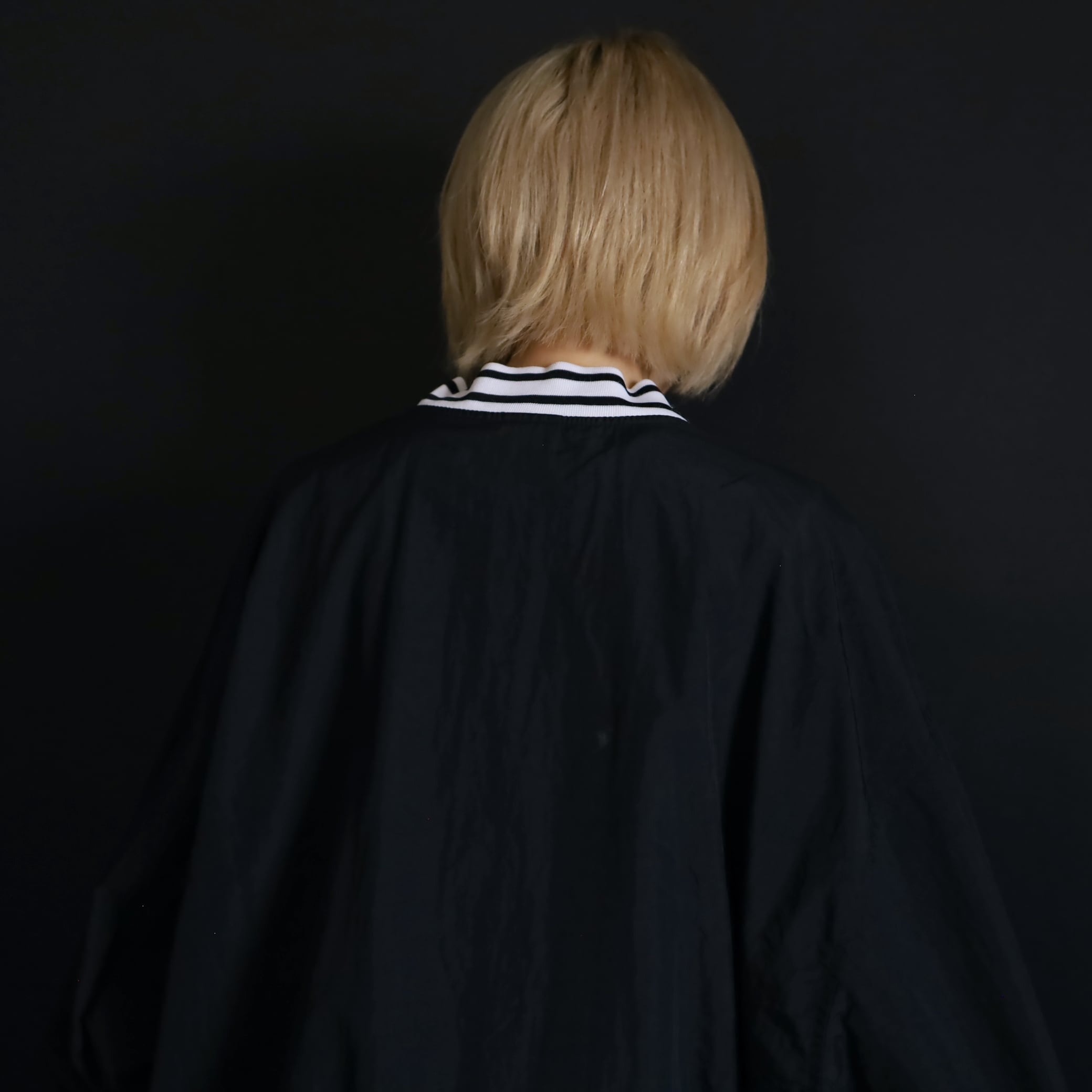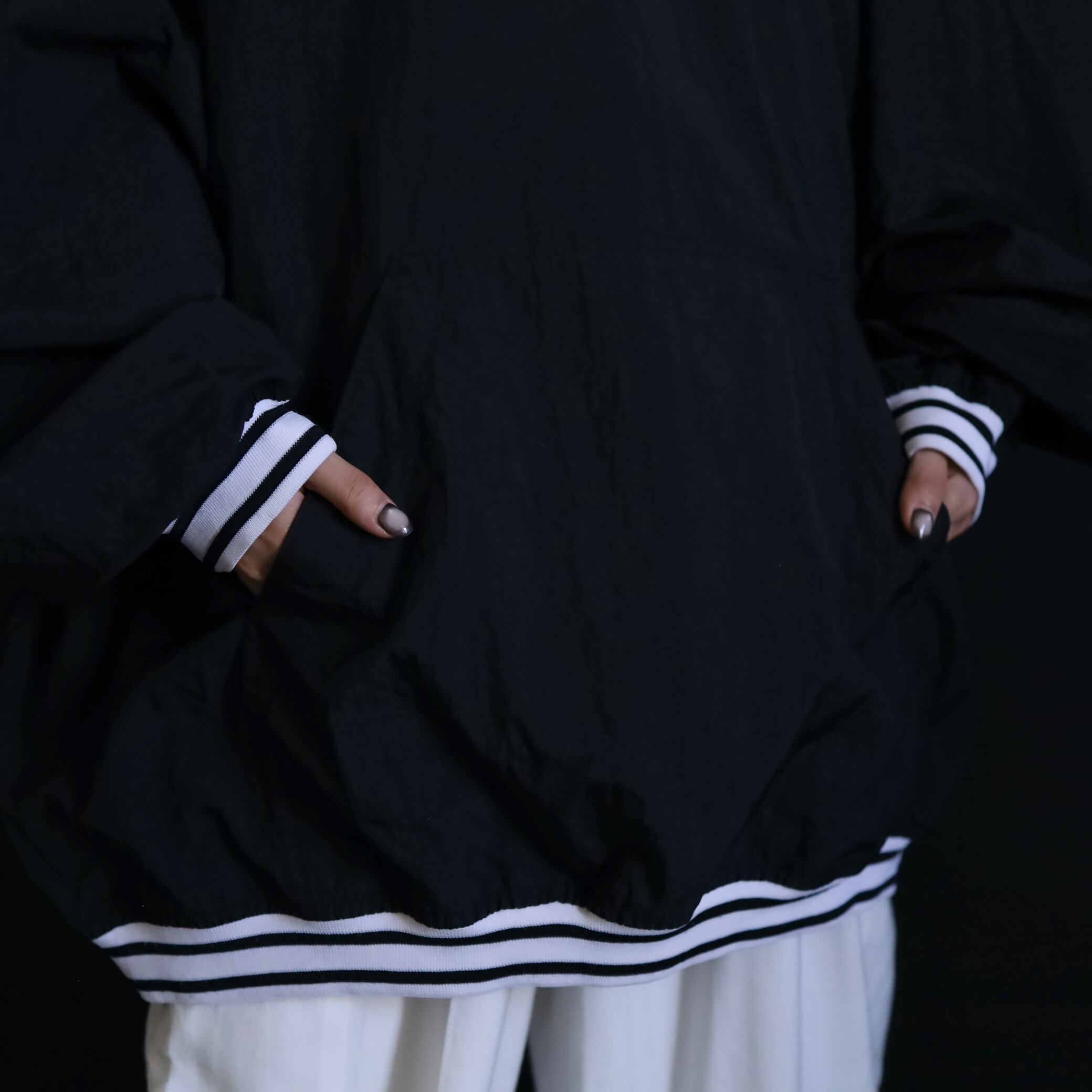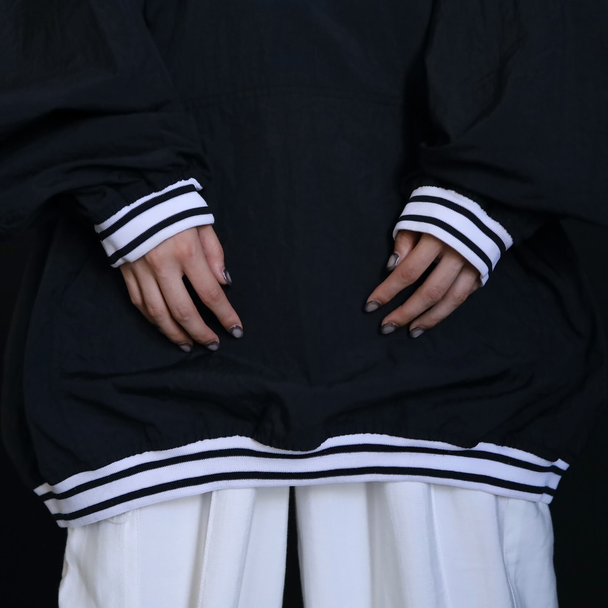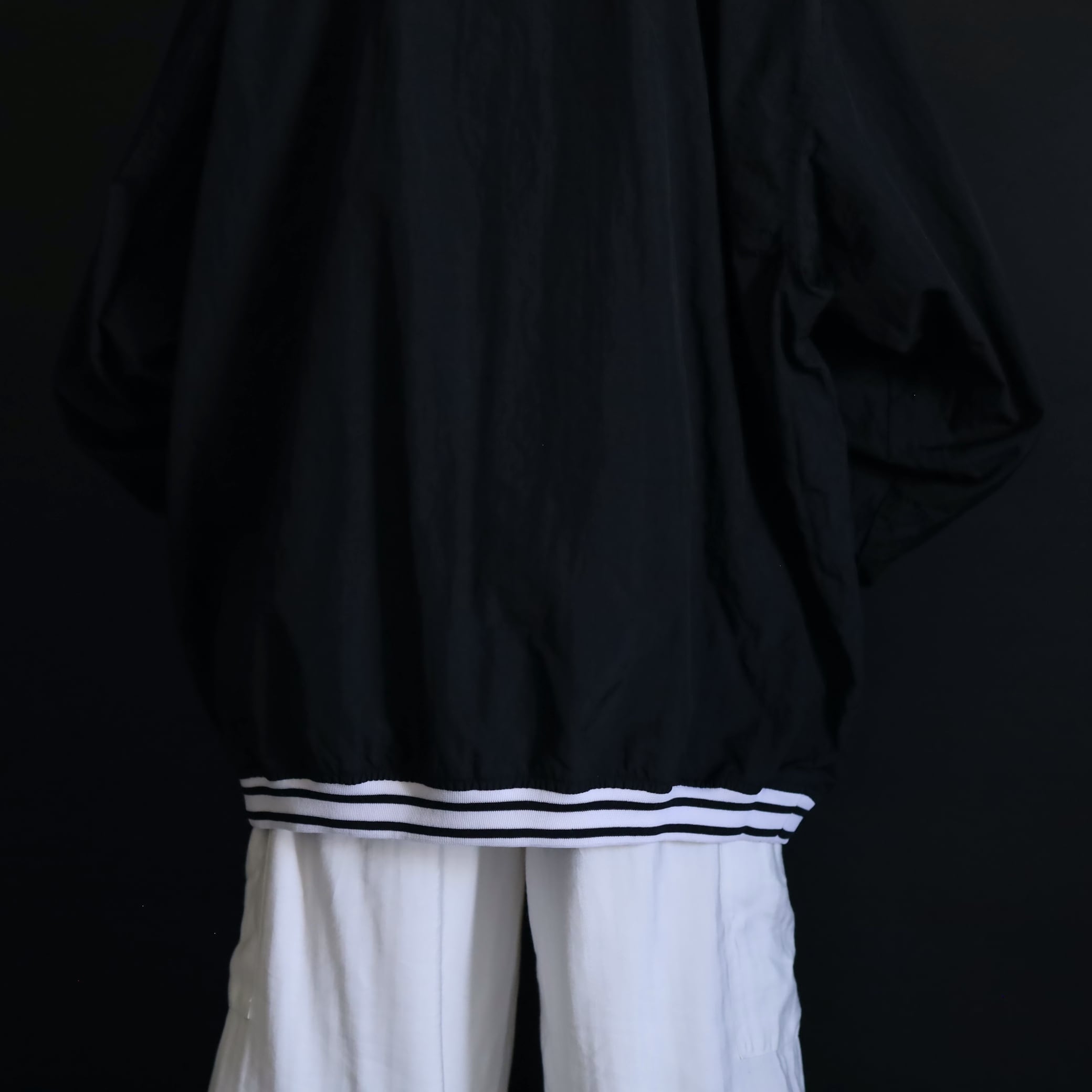 ブラックカラーナイロンボディをベースに,ネック,袖先は白黒ラインのリブ切替.