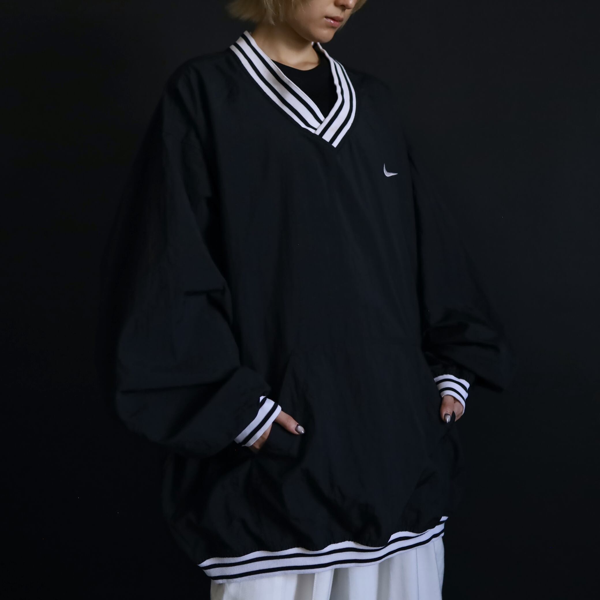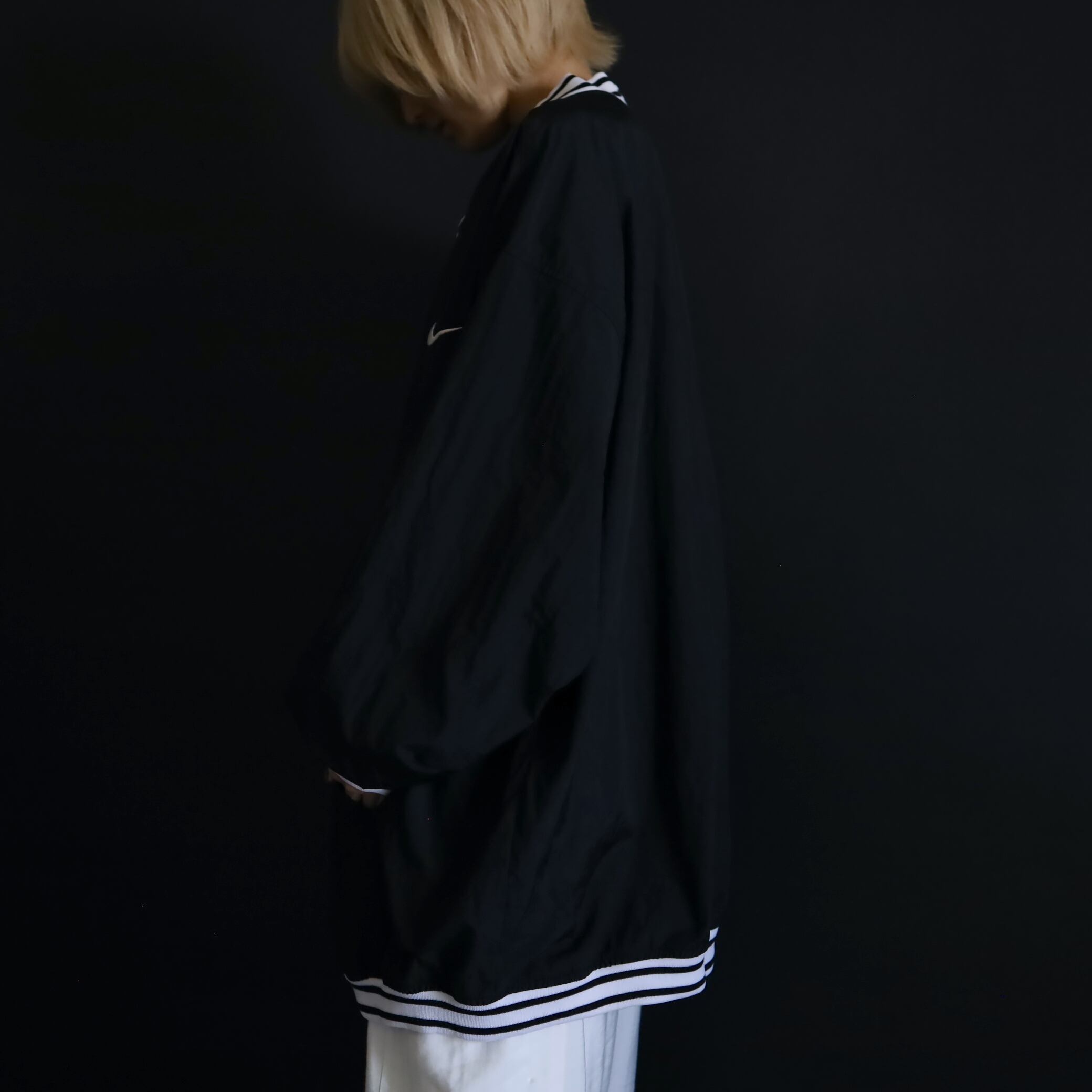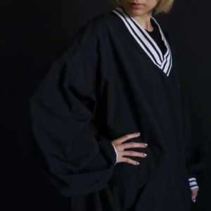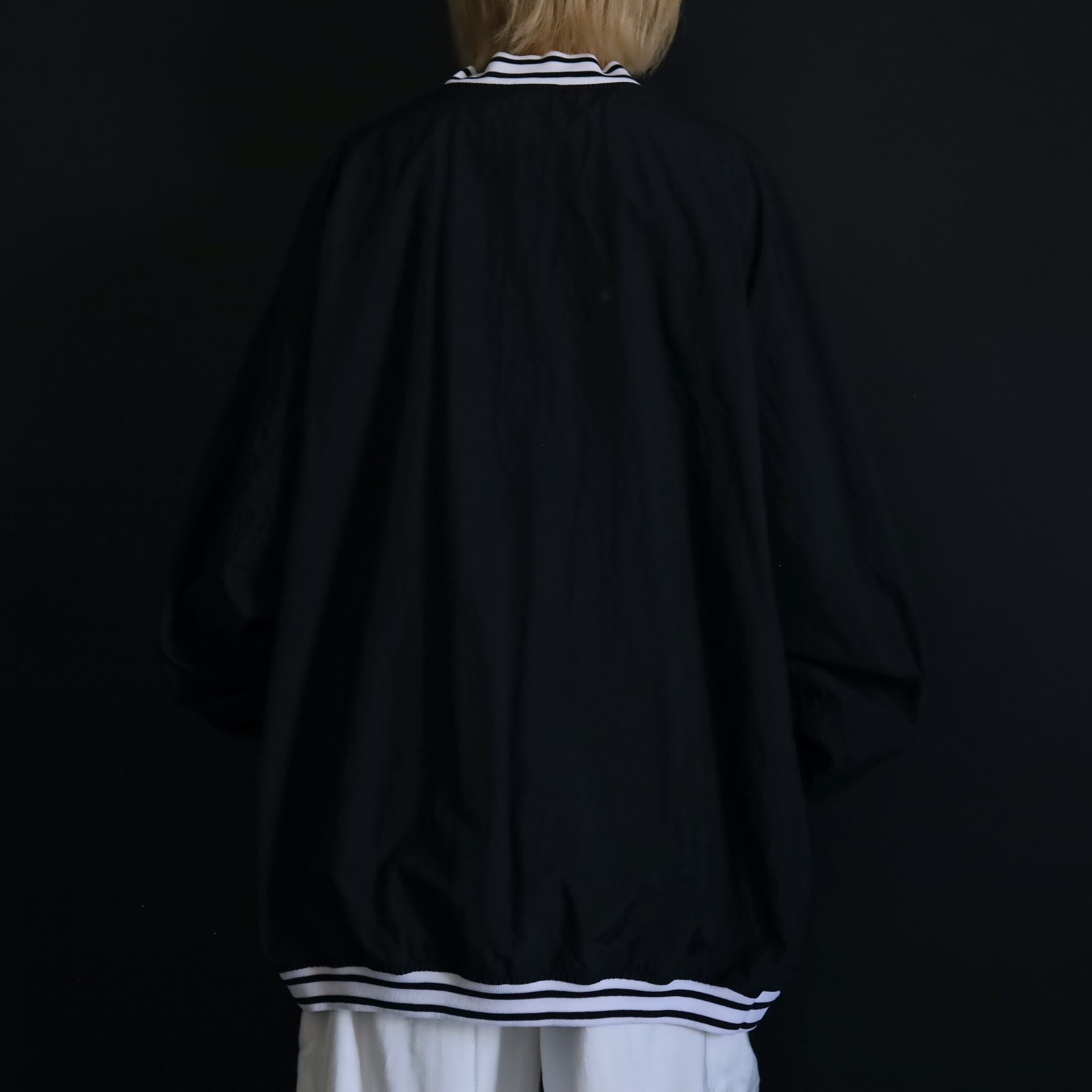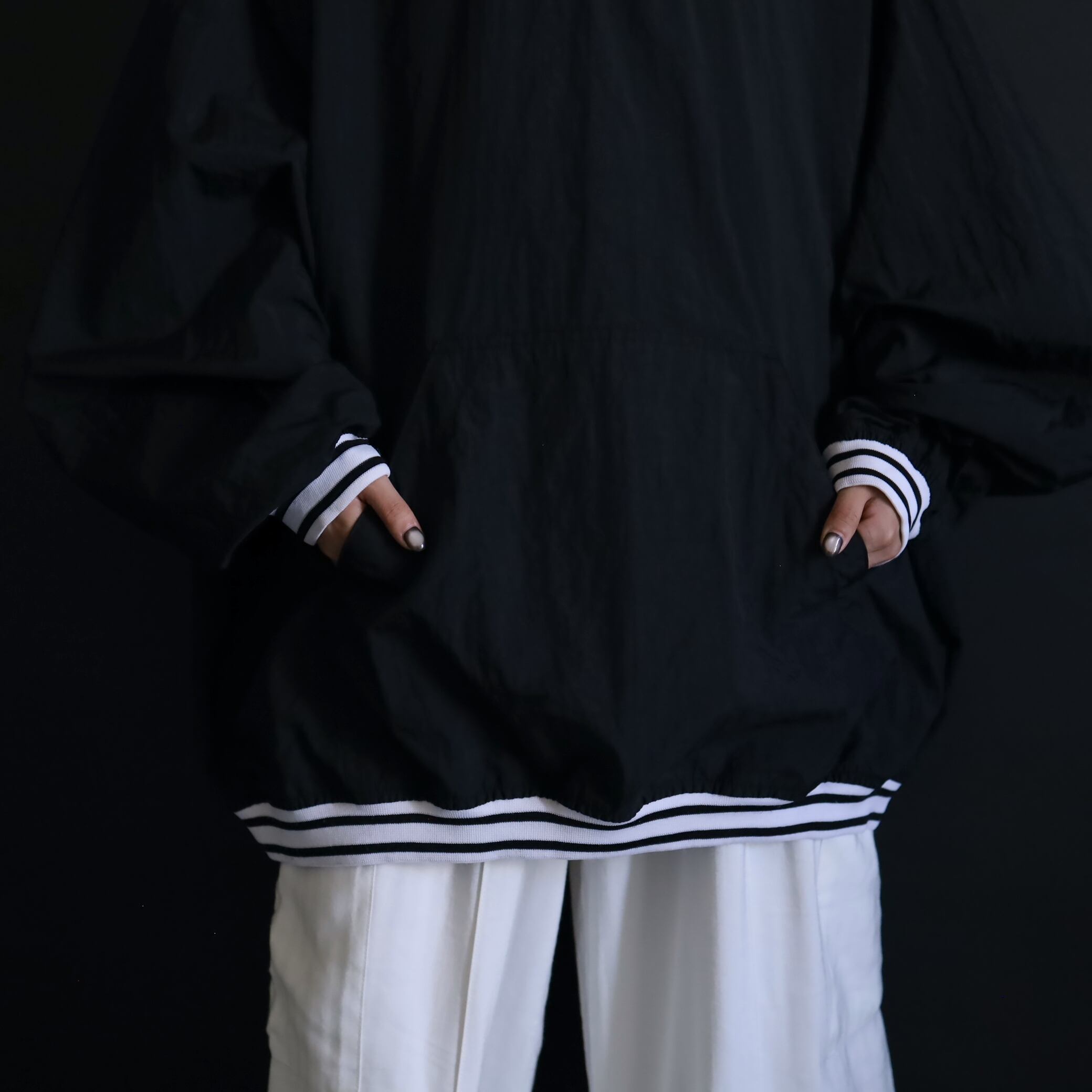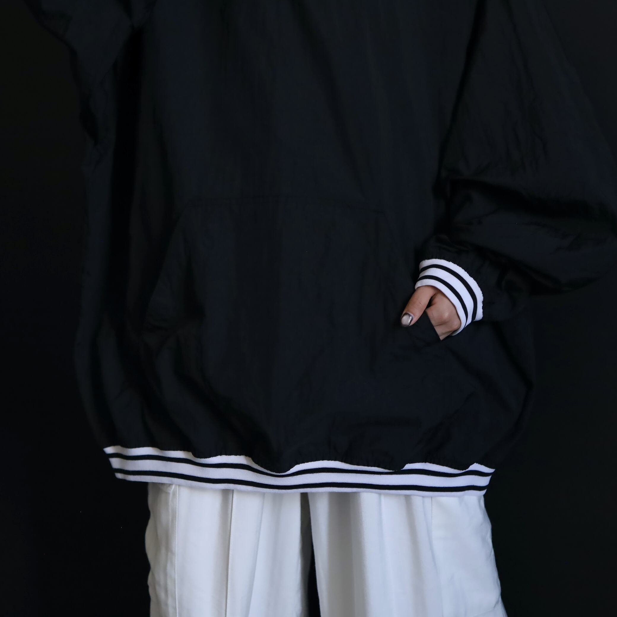 ブラックカラーナイロンボディをベースに,ネック,袖先は白黒ラインのリブ切替.