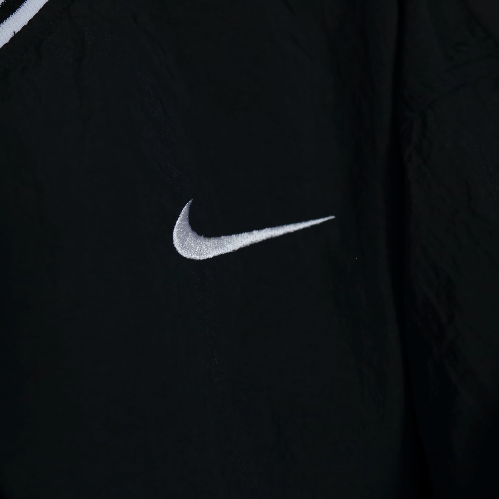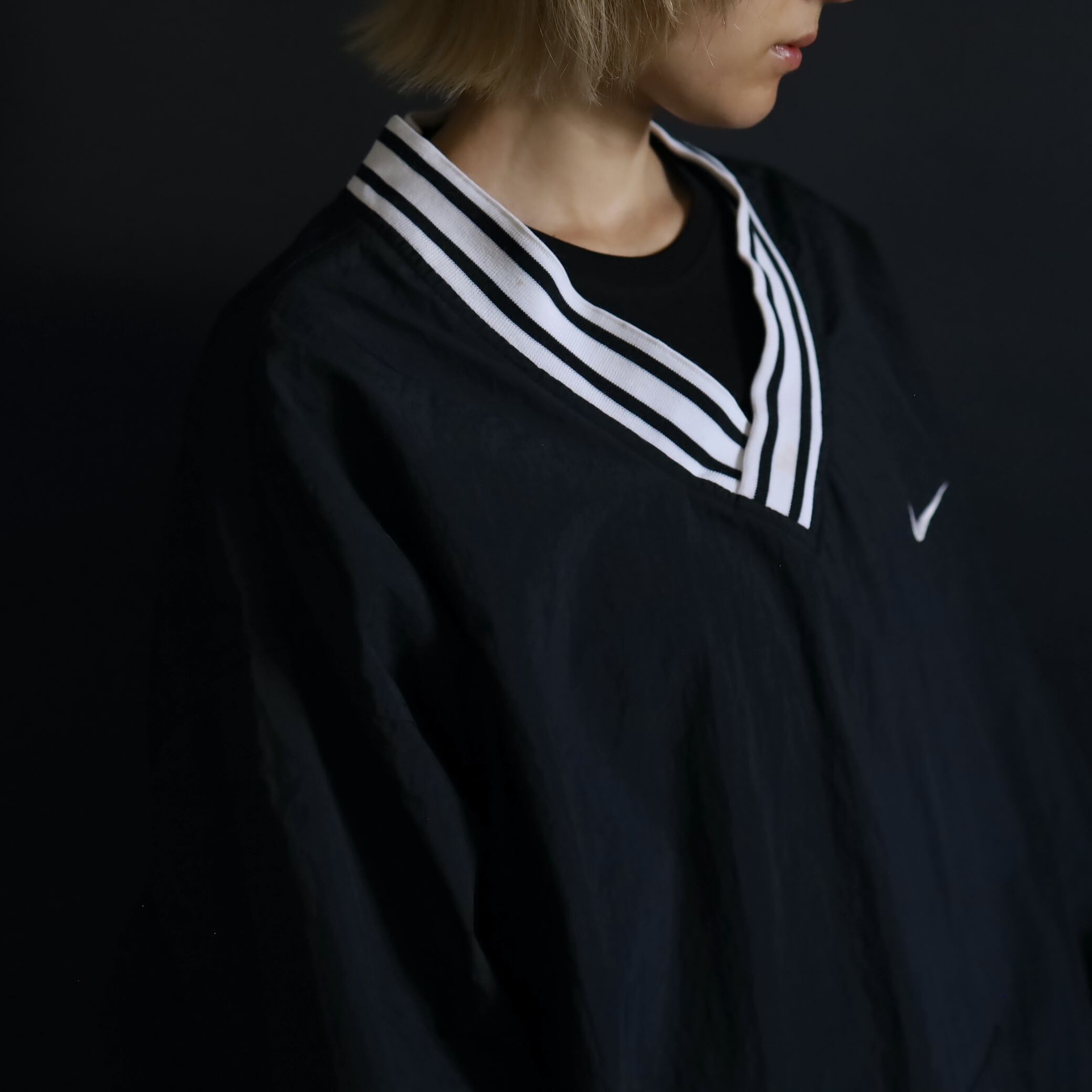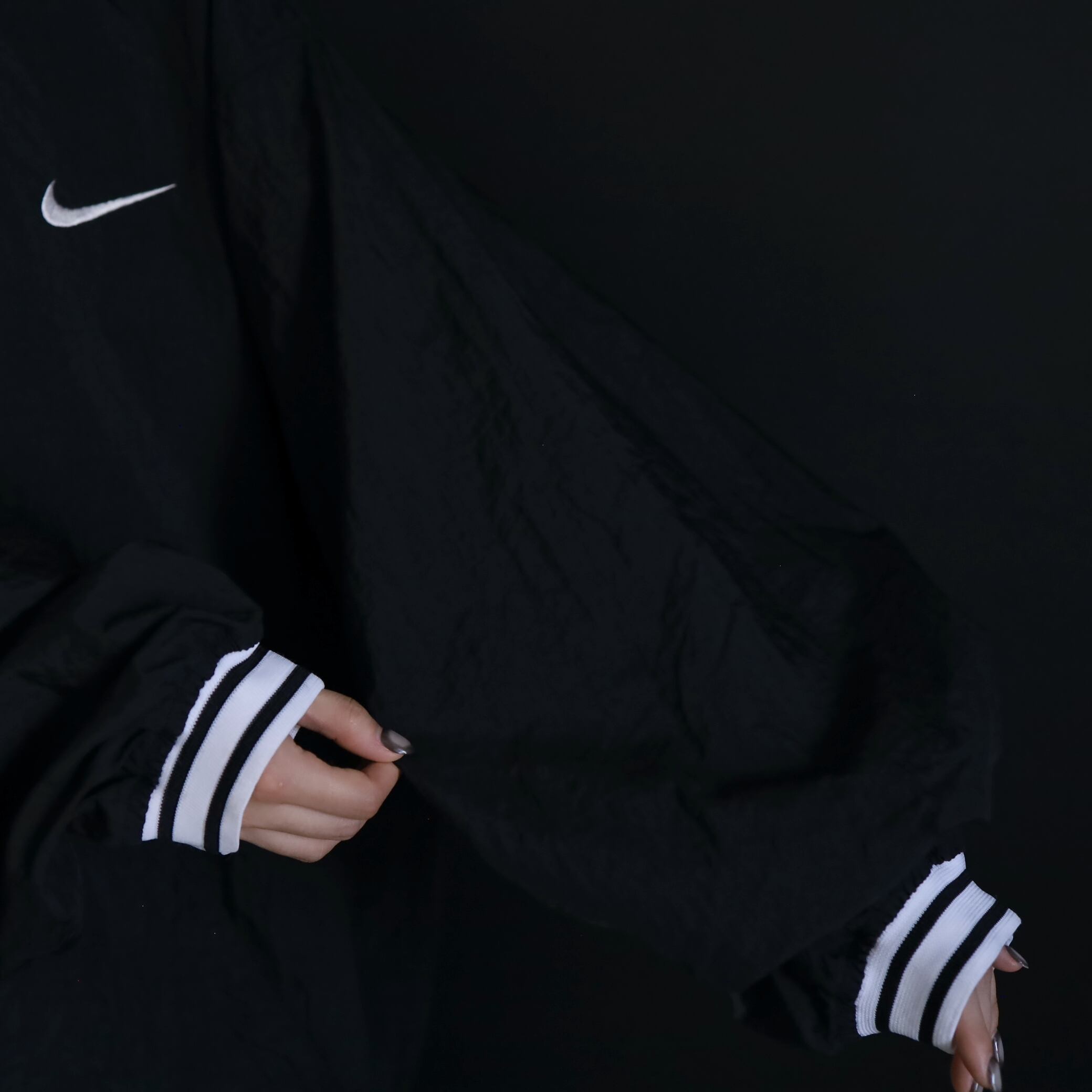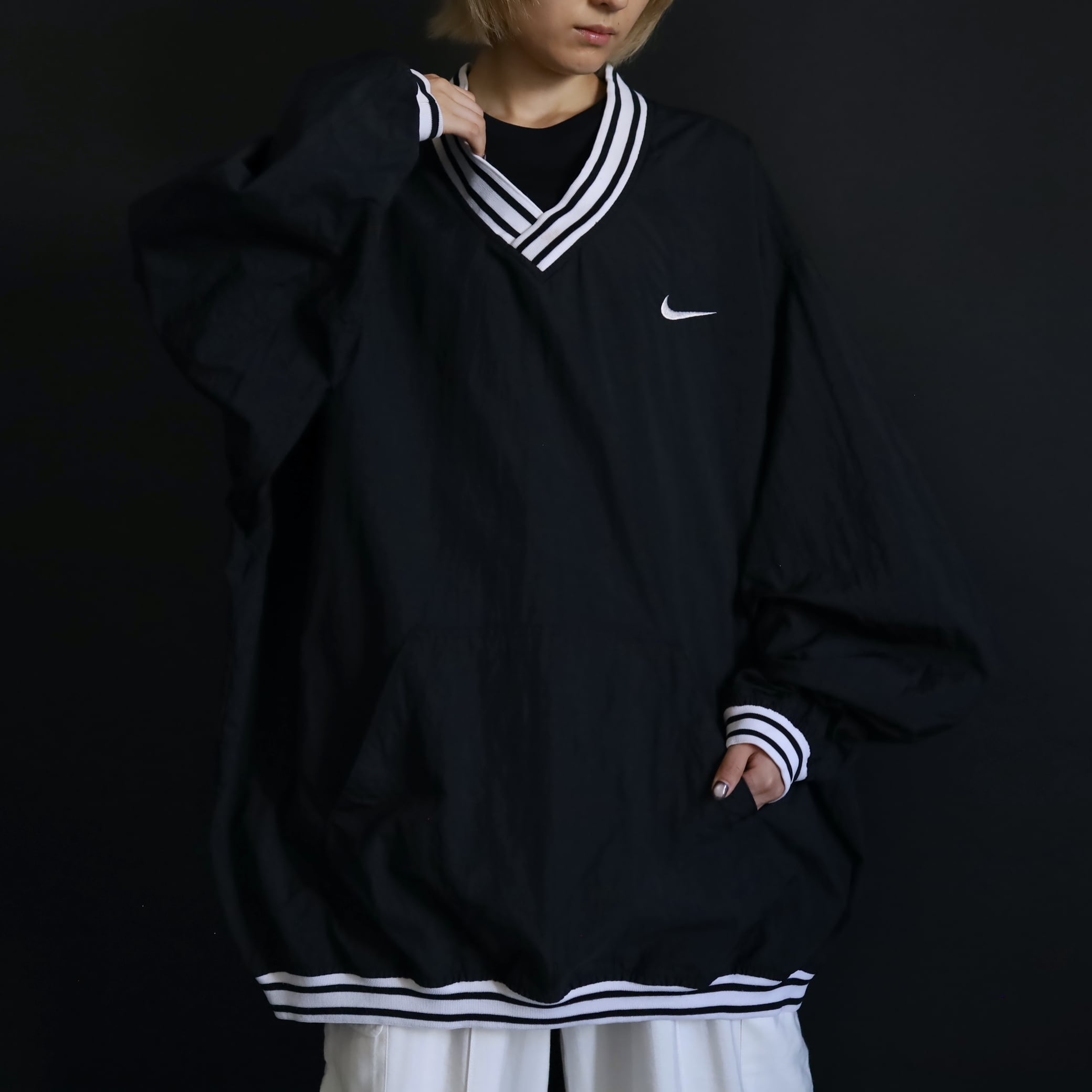 ブラックカラーナイロンボディをベースに,ネック,袖先は白黒ラインのリブ切替.