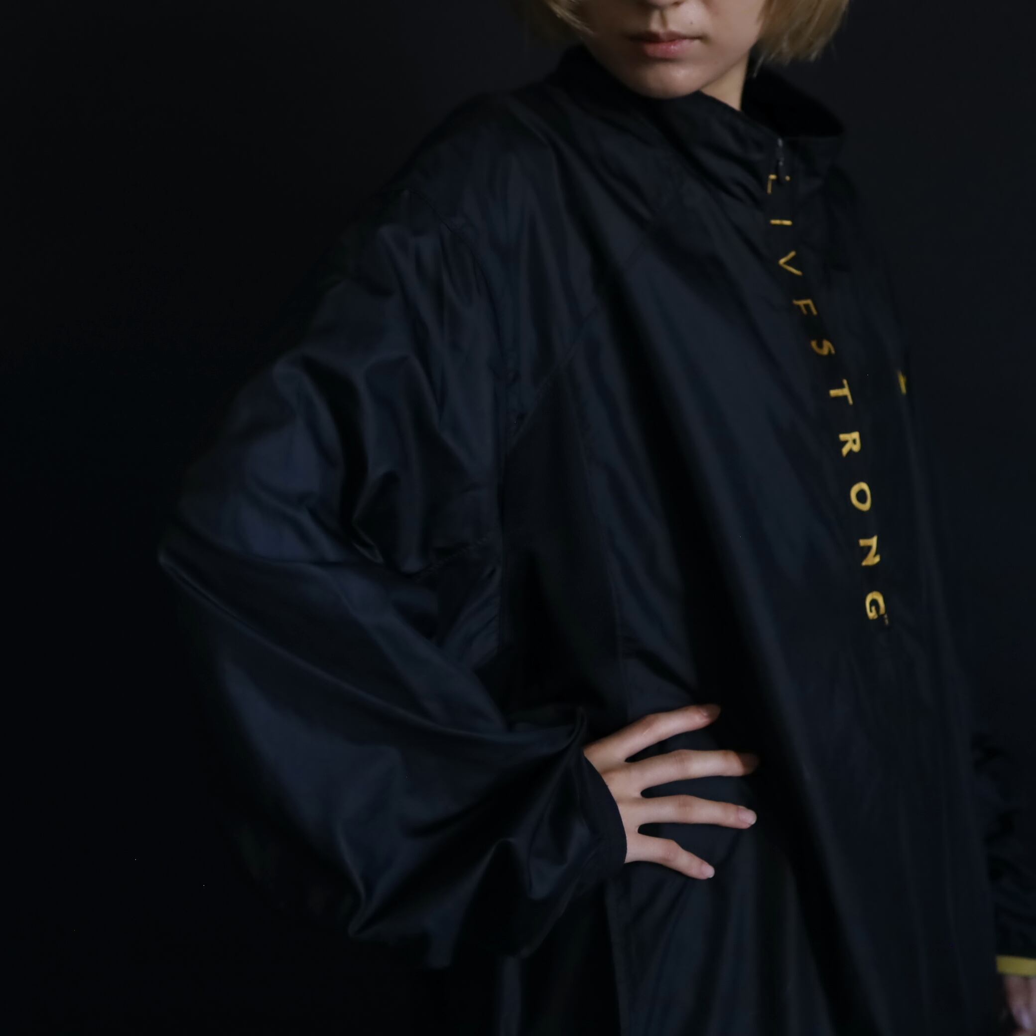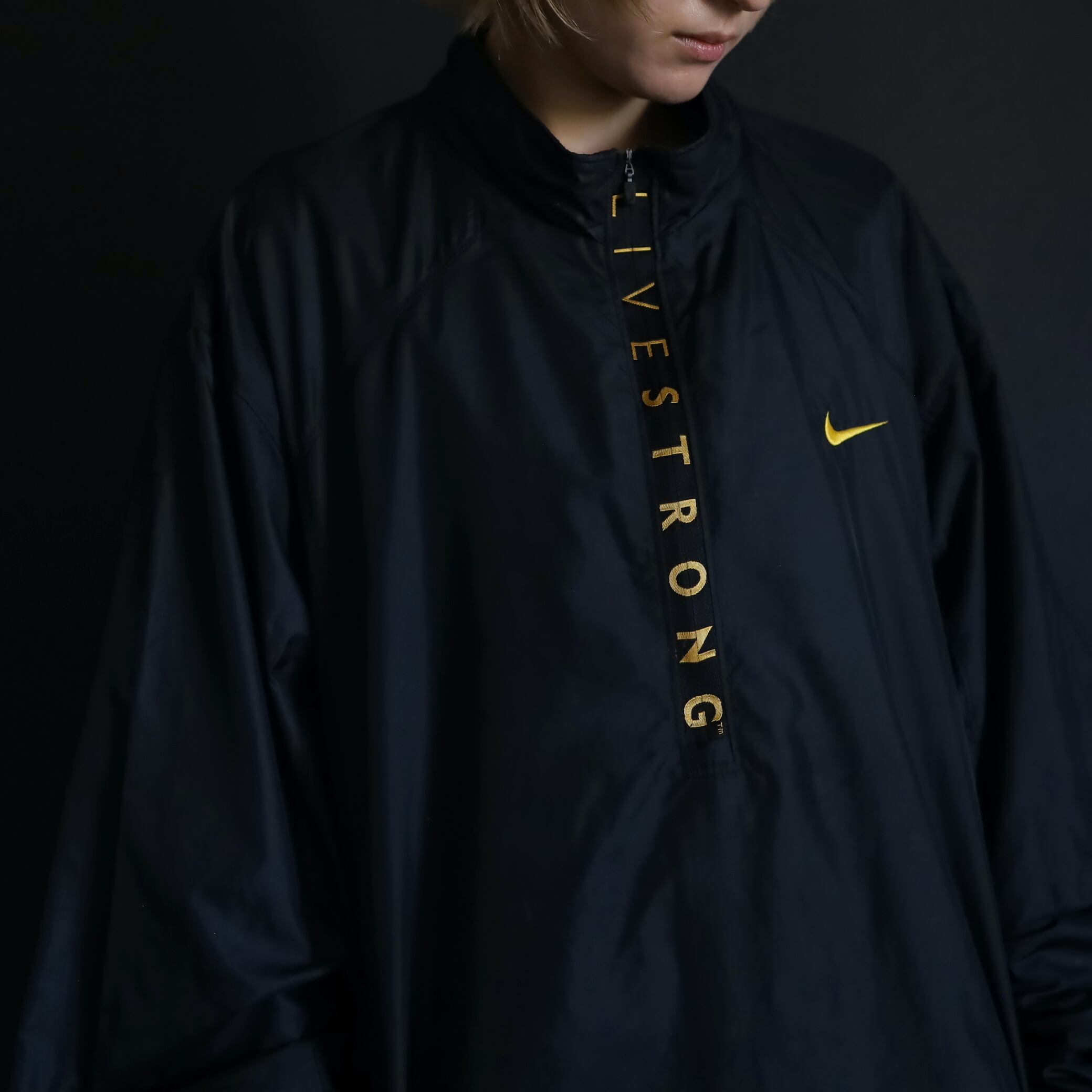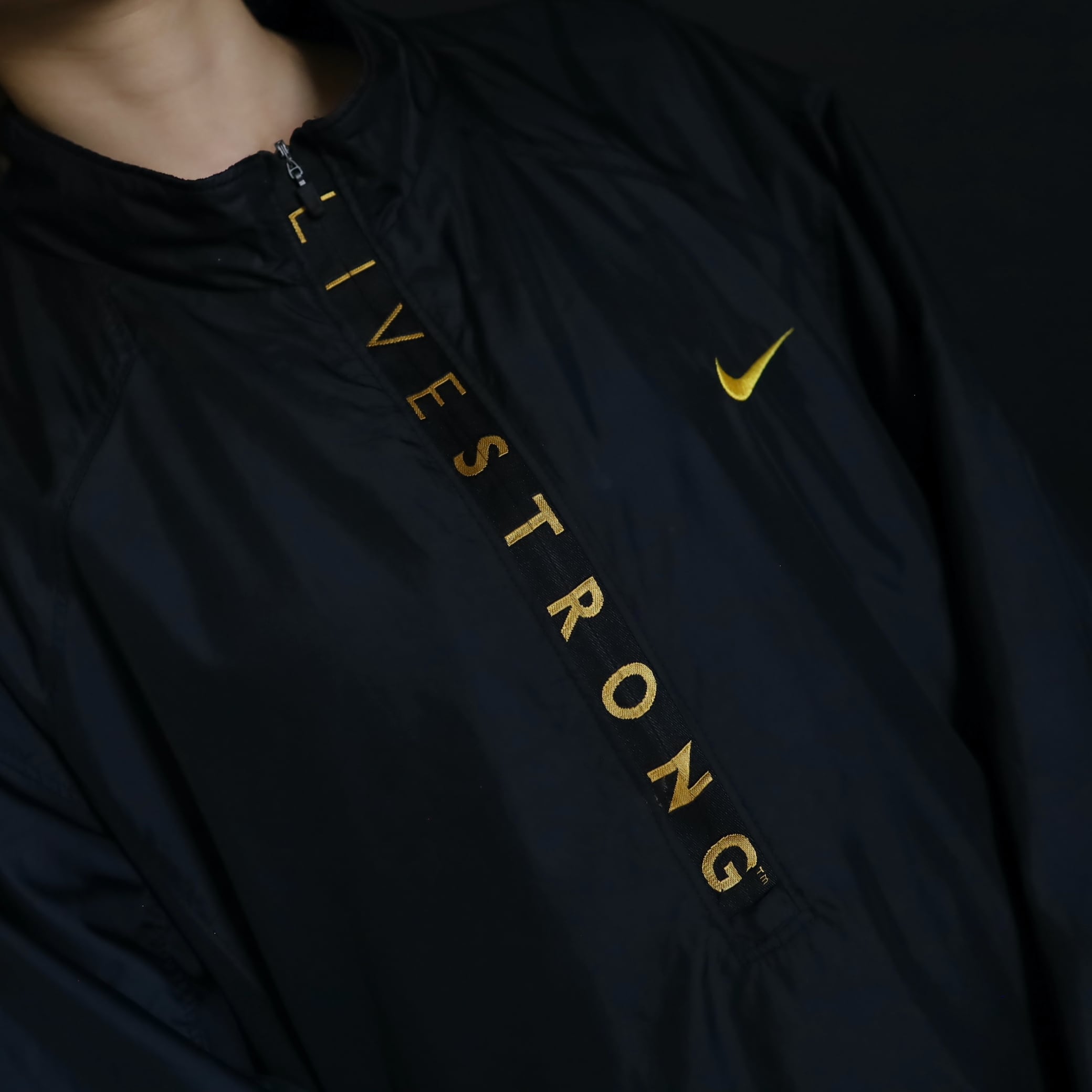 ハーフジップ上にLIVESTRONGのプリントデザイン.
