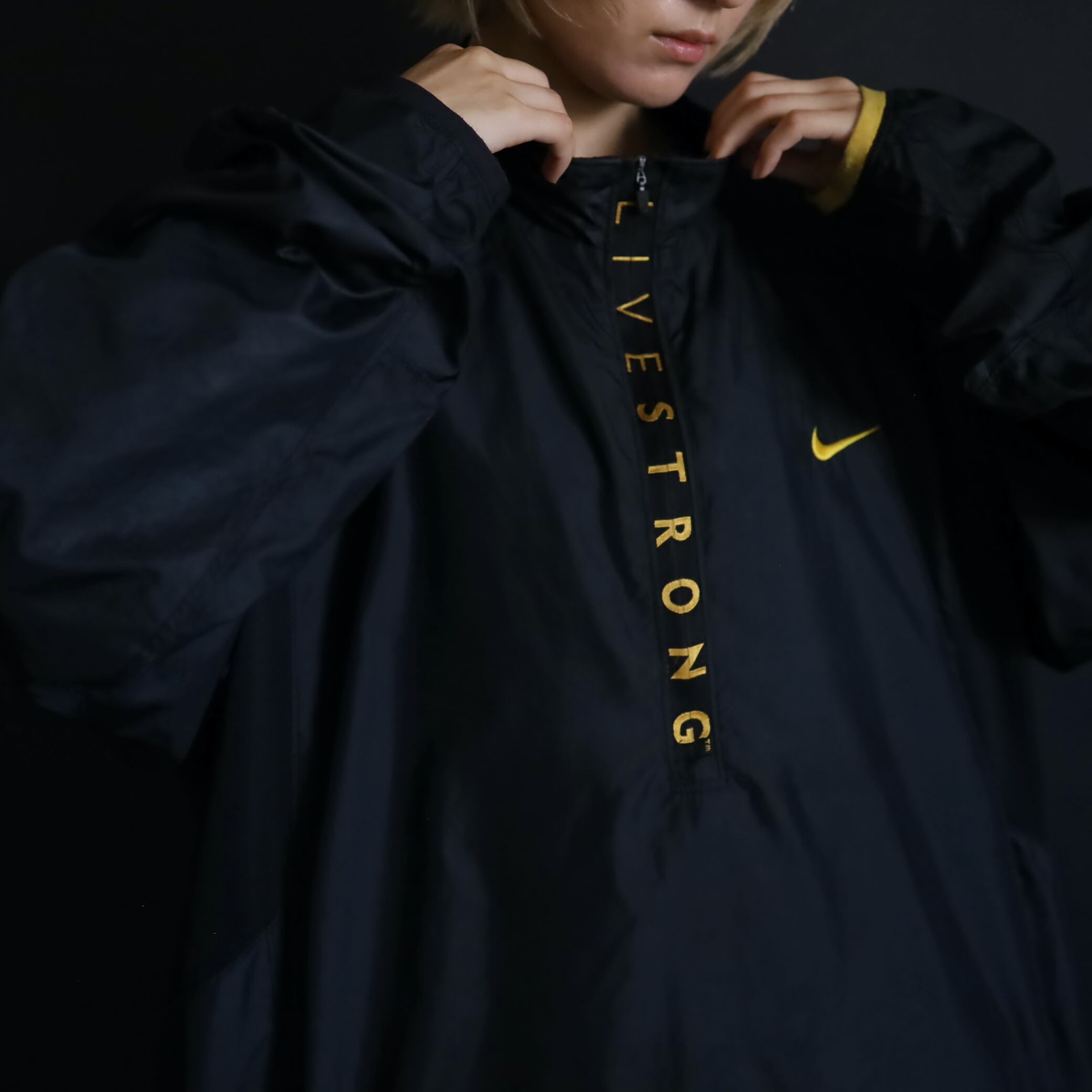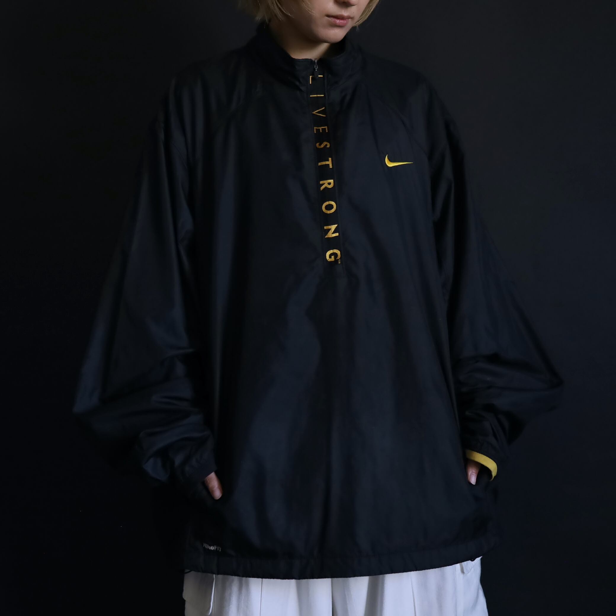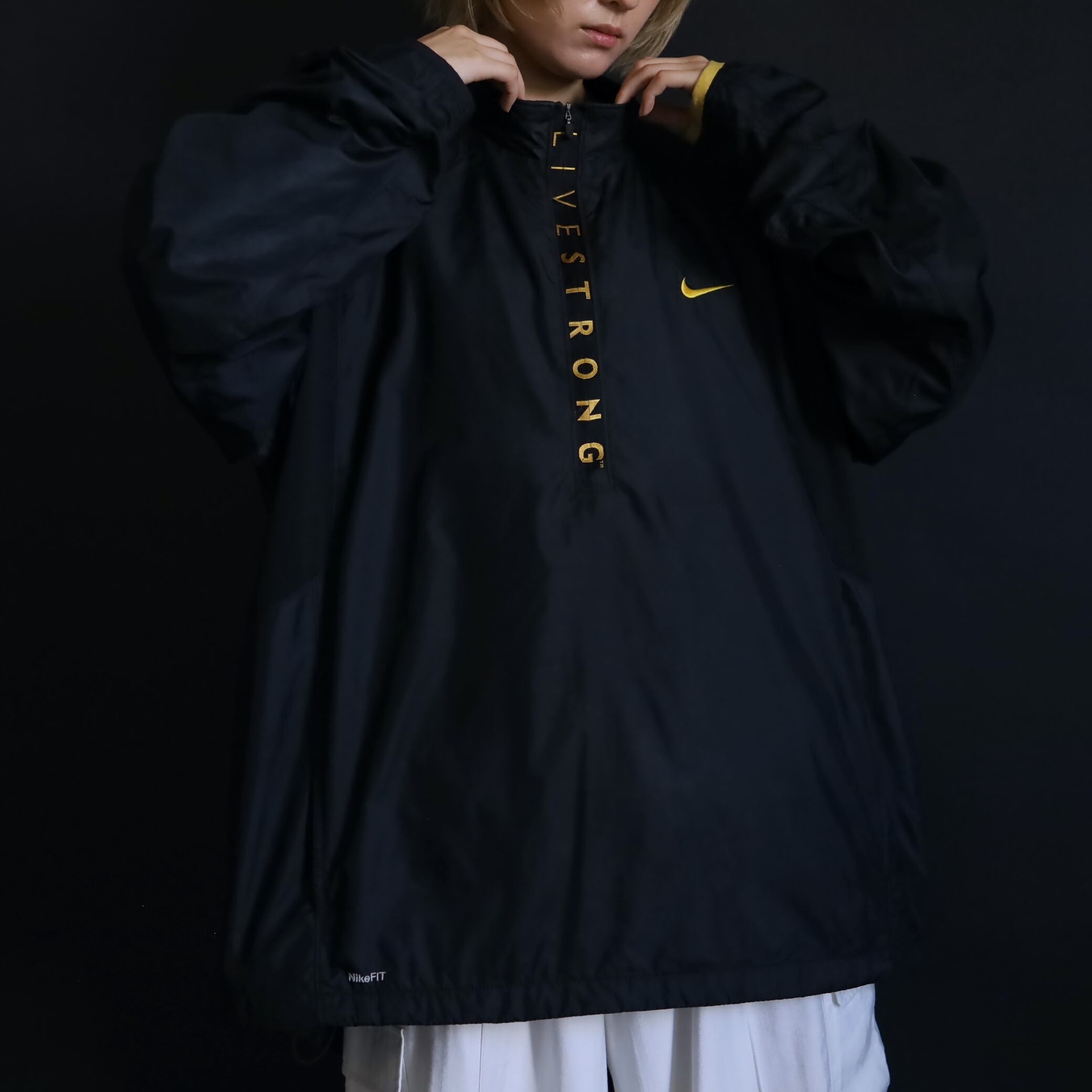 ハーフジップ上にLIVESTRONGのプリントデザイン.