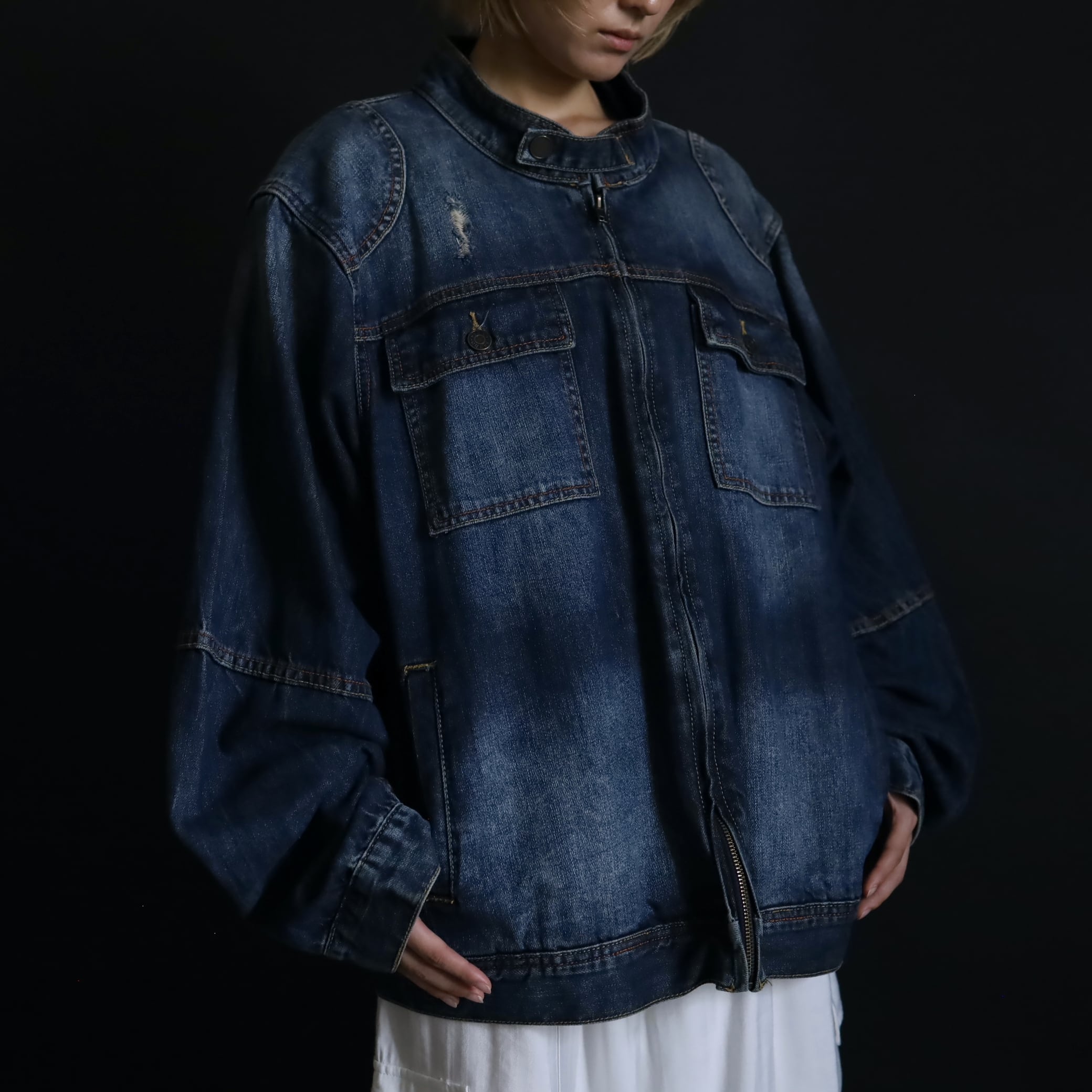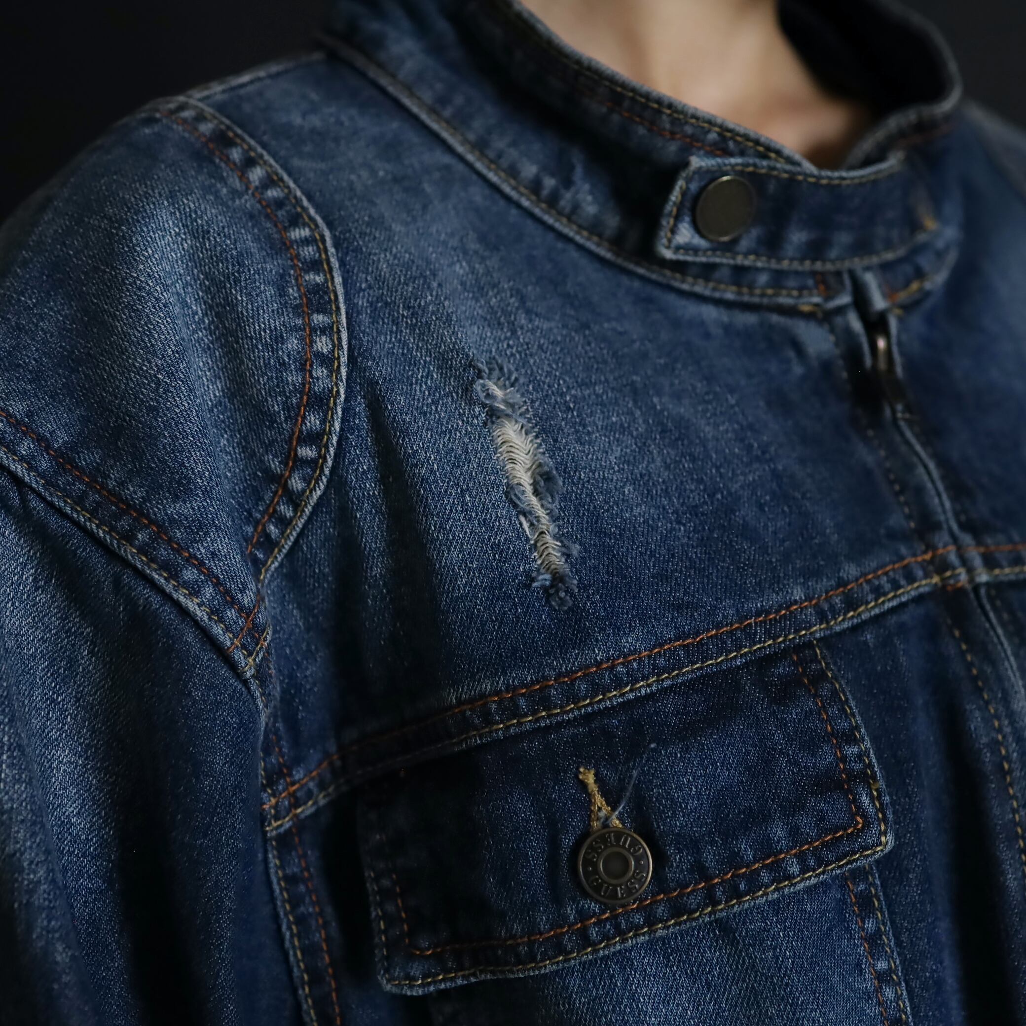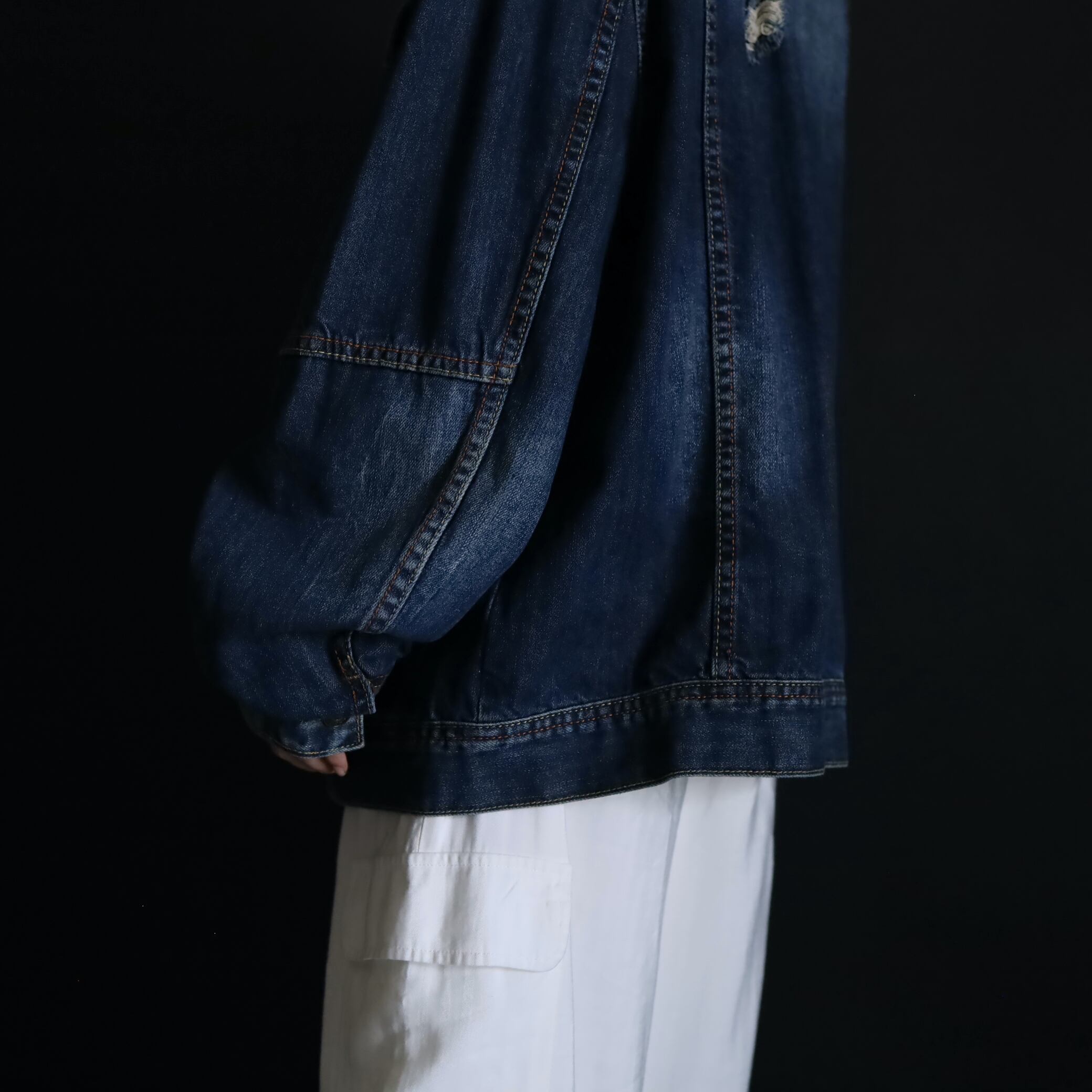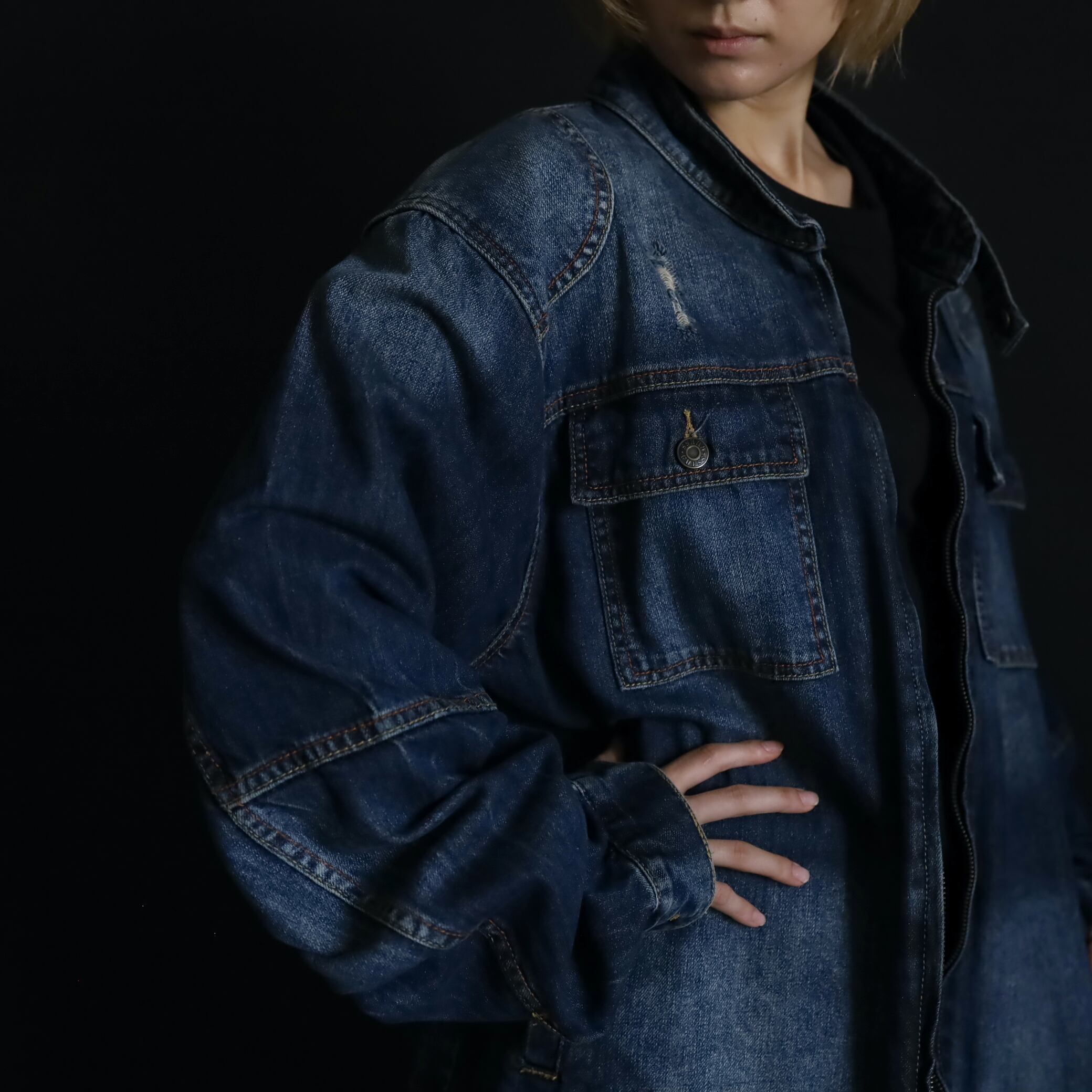 デニムジャケットで数少ないスタンドカラー仕様で,首元がスッキリとした印象.