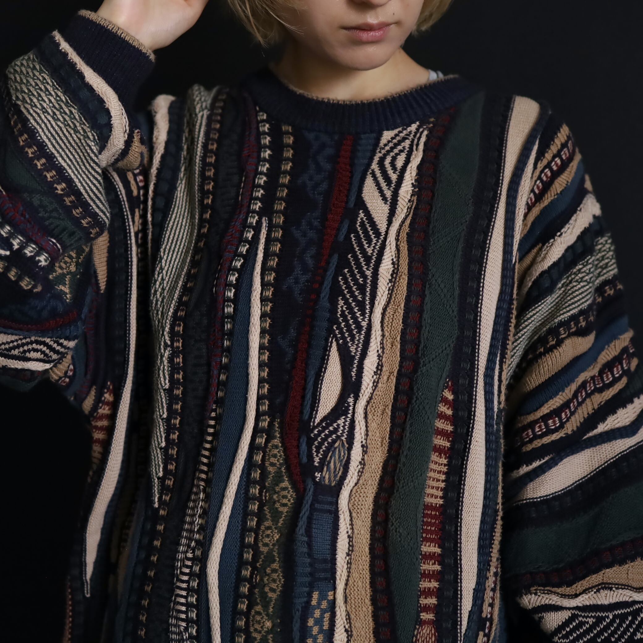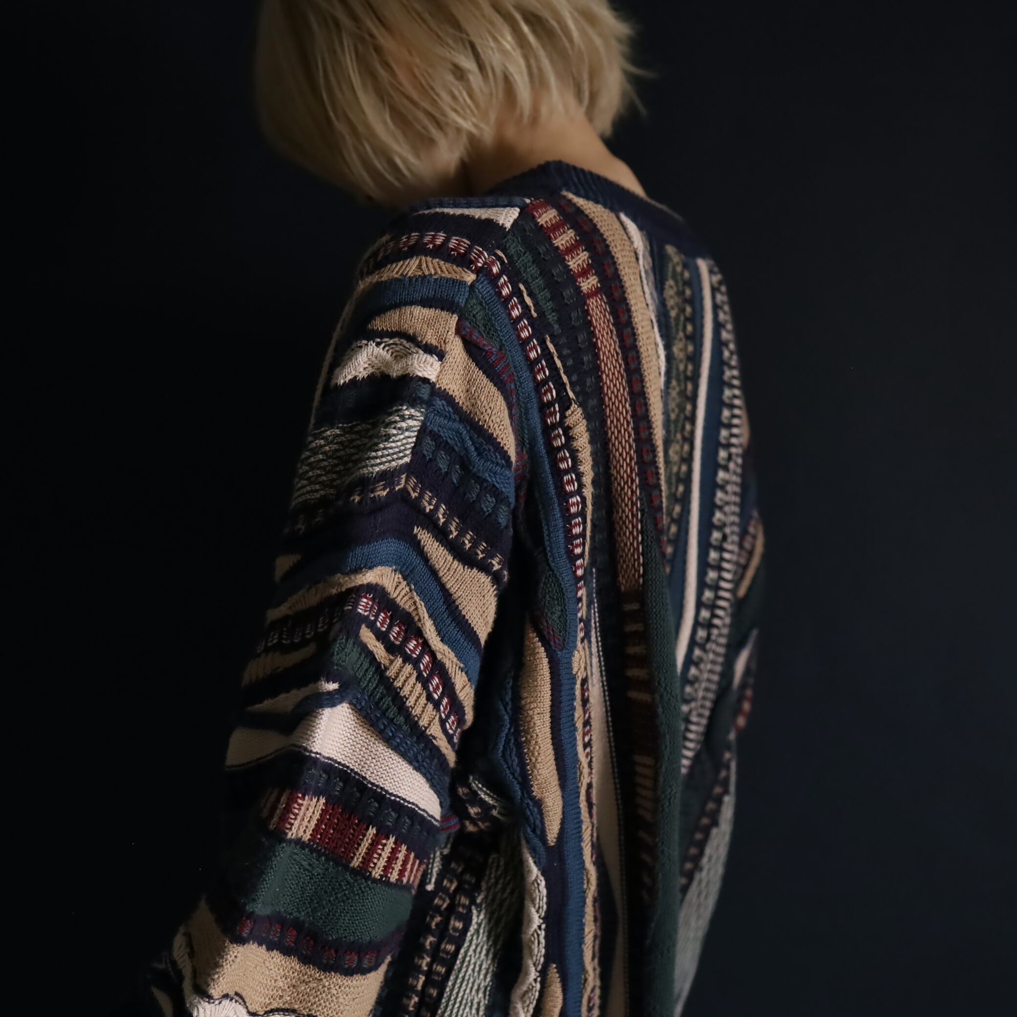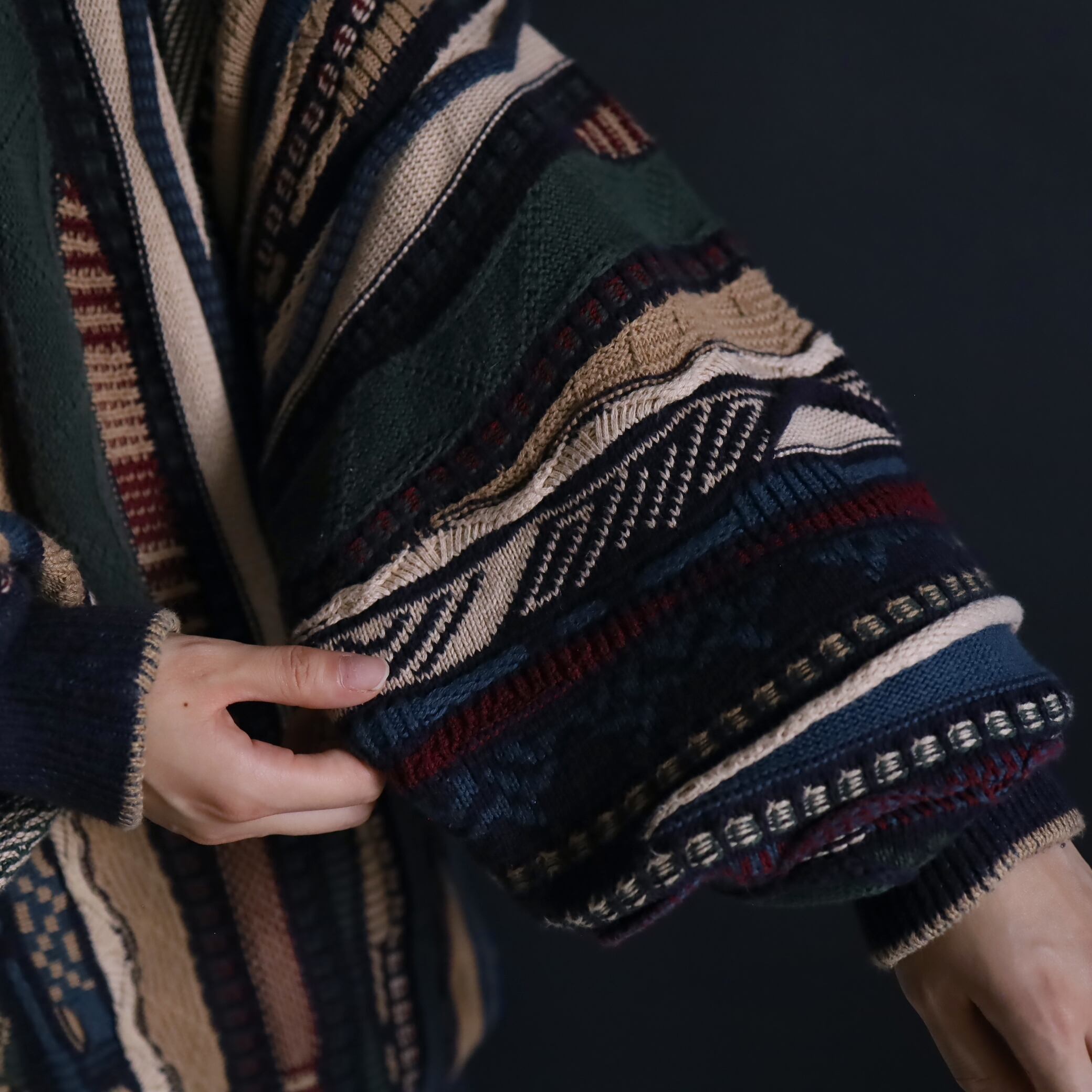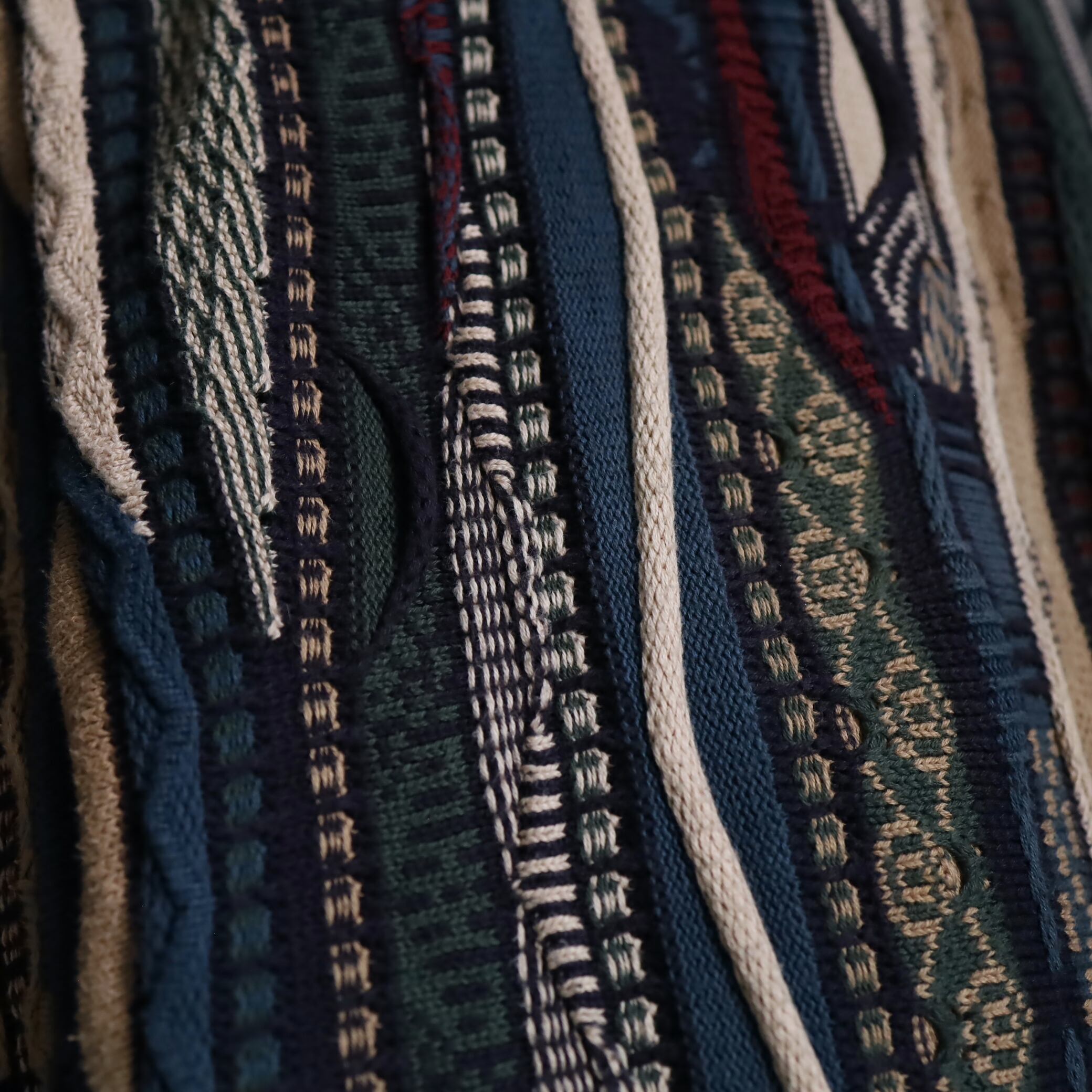 グリーン,ブルー,ベージュ,ワインレッドなどなど,多色を編み込んだ立体的な畝のある一枚.