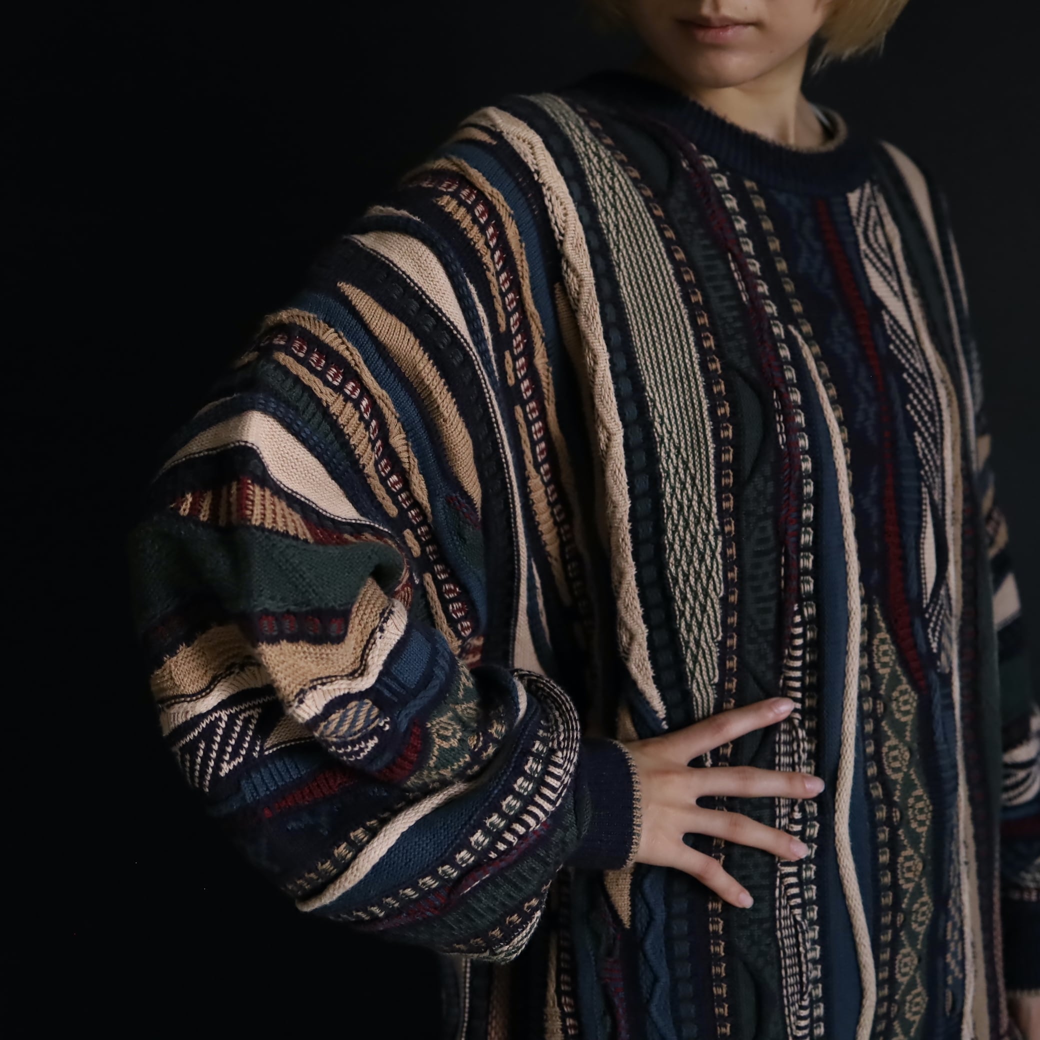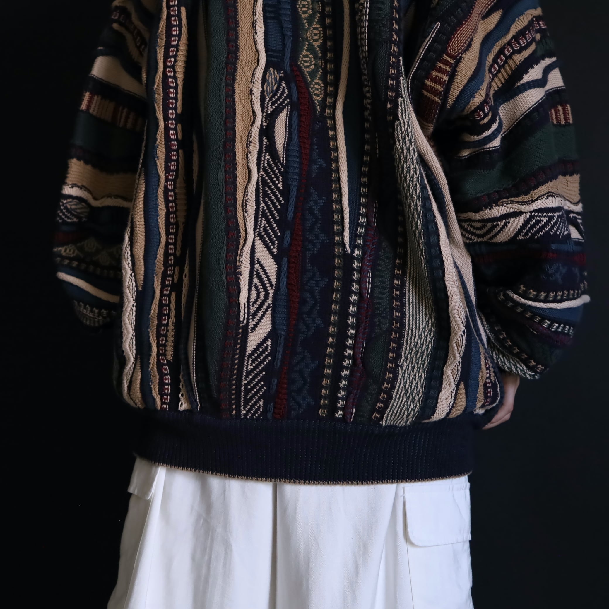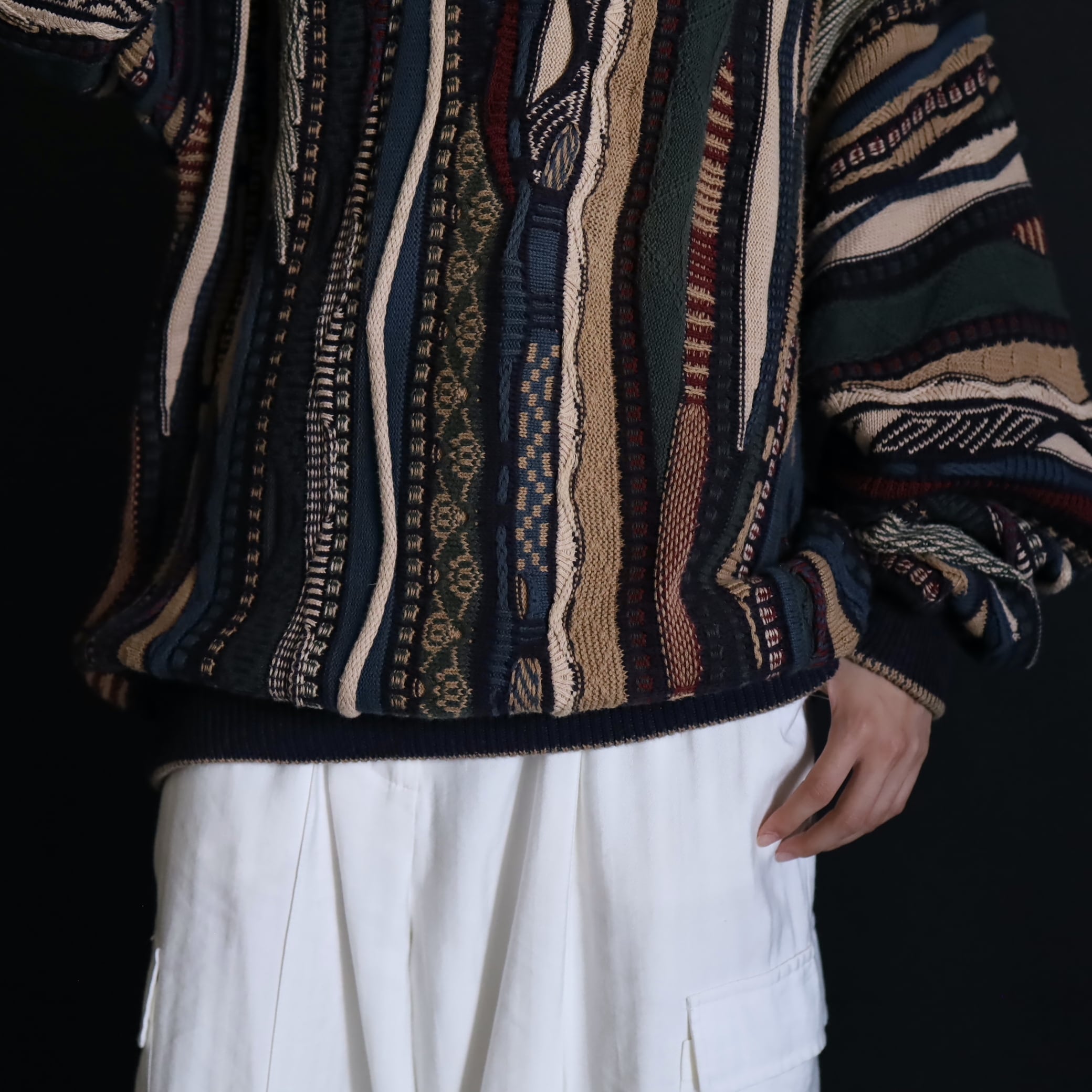 グリーン,ブルー,ベージュ,ワインレッドなどなど,多色を編み込んだ立体的な畝のある一枚.