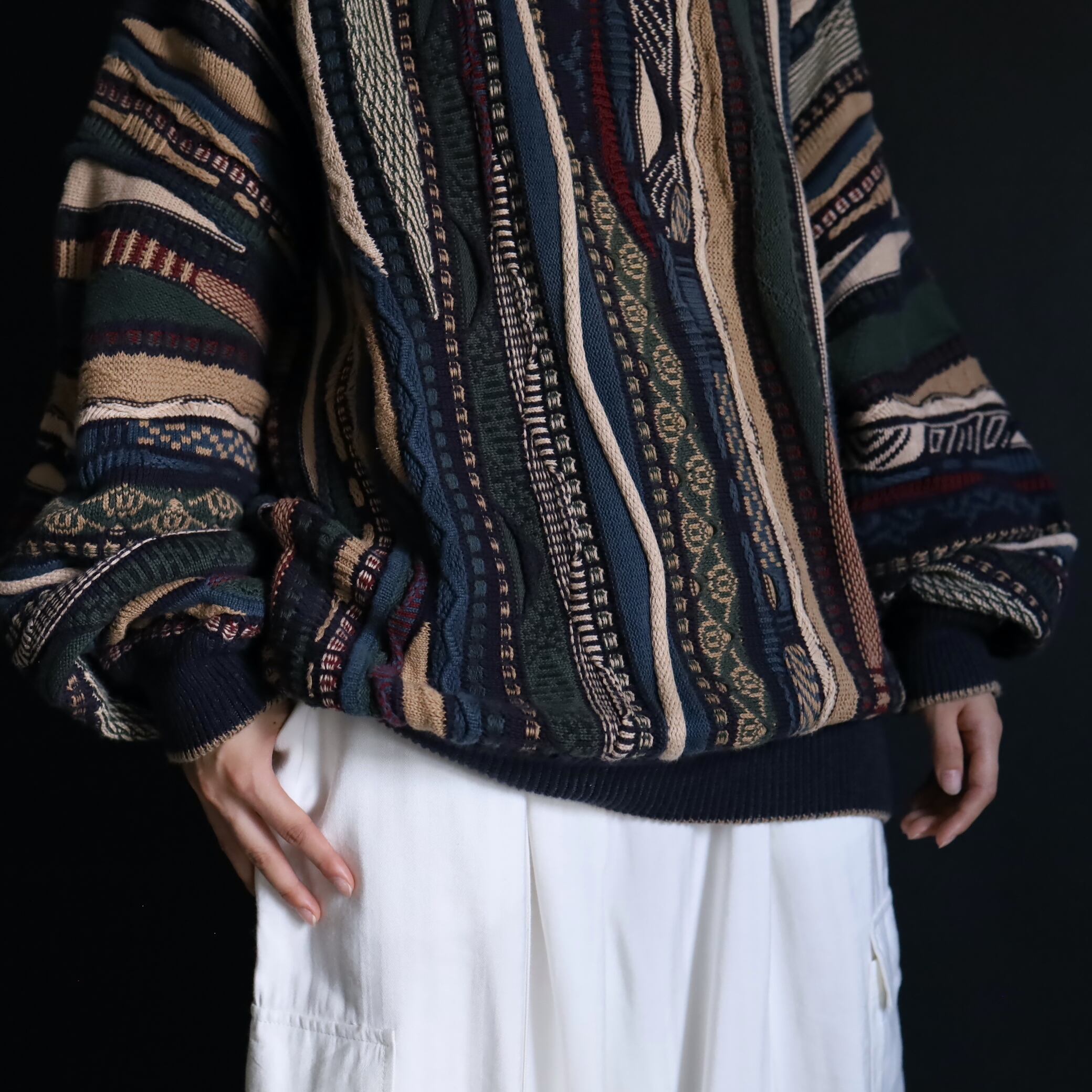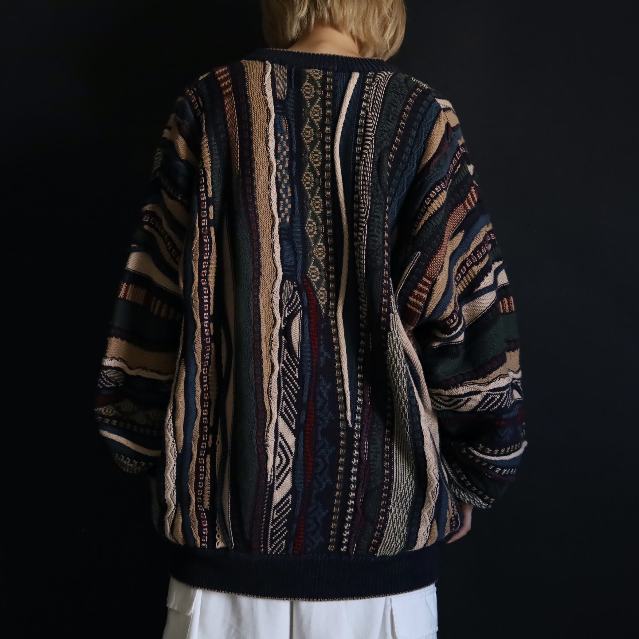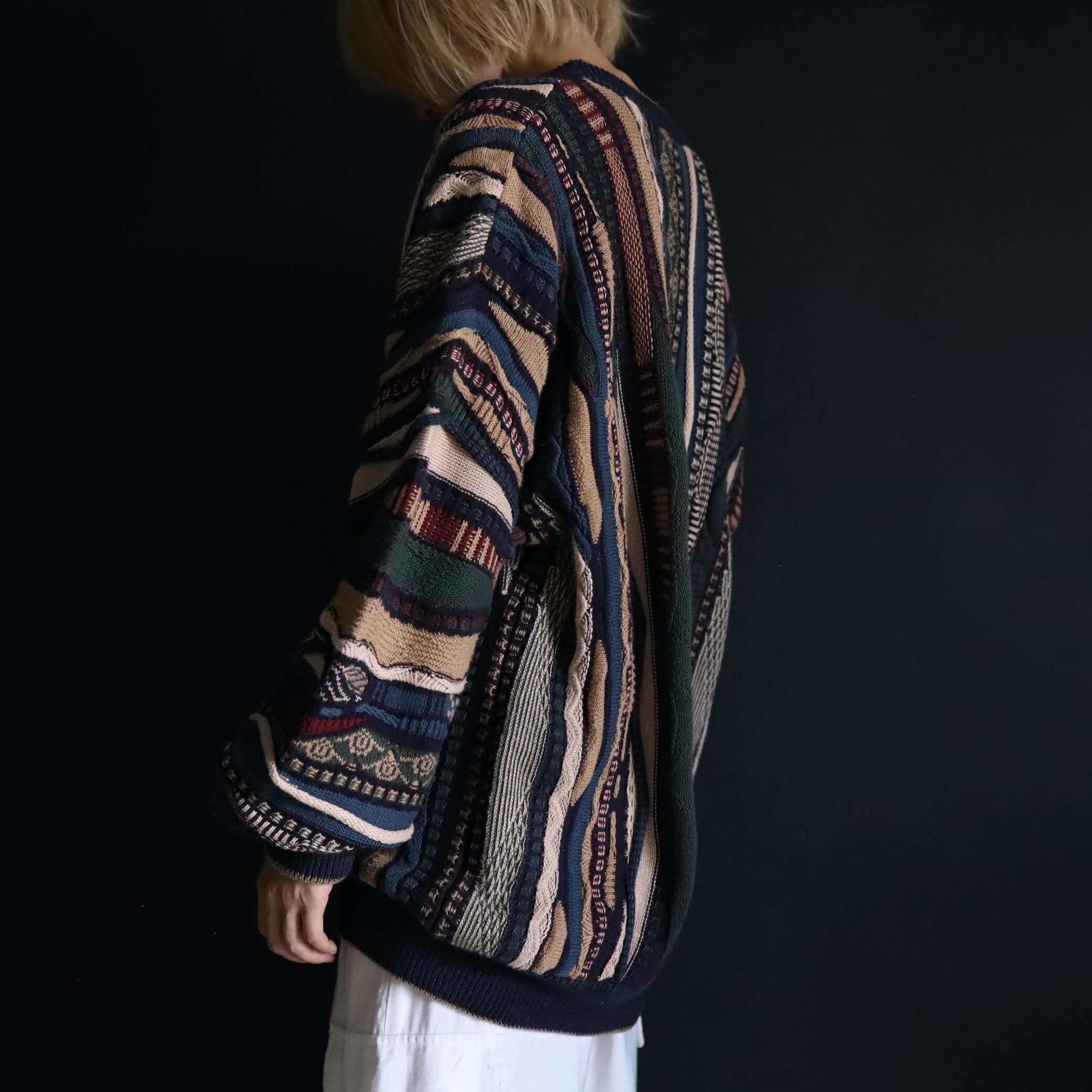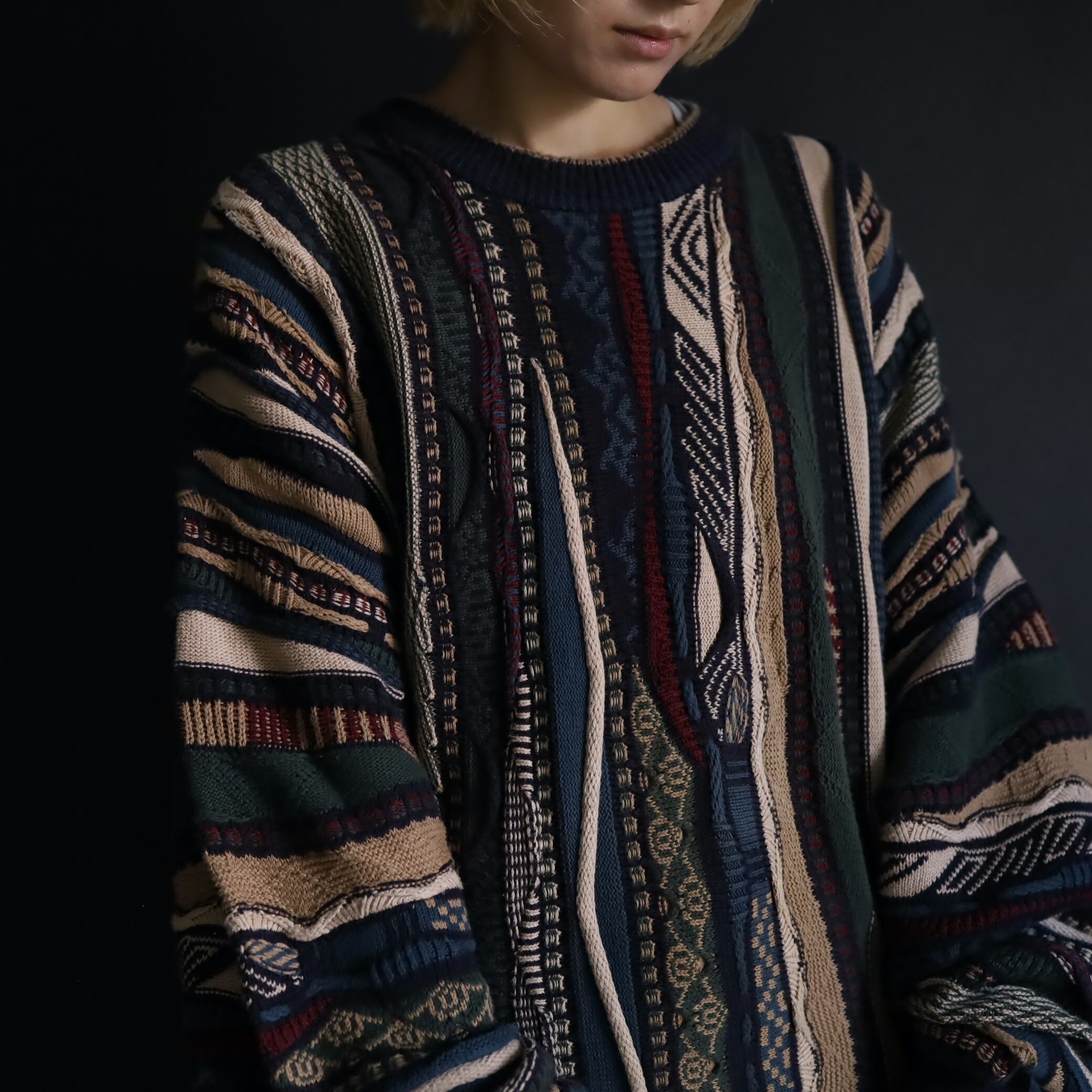 グリーン,ブルー,ベージュ,ワインレッドなどなど,多色を編み込んだ立体的な畝のある一枚.
