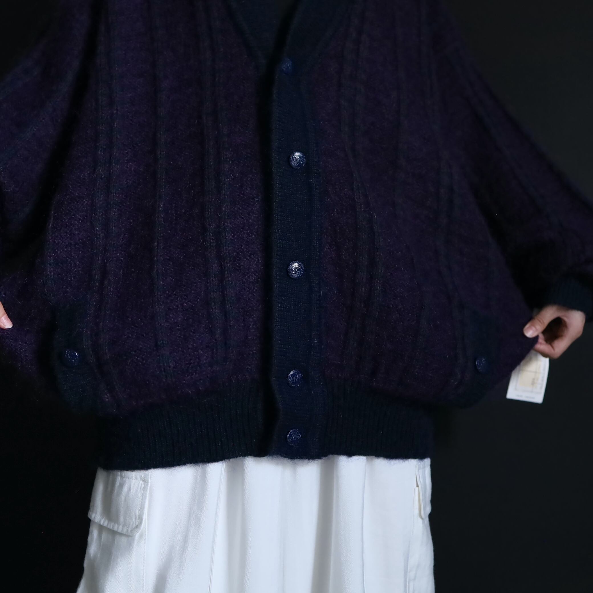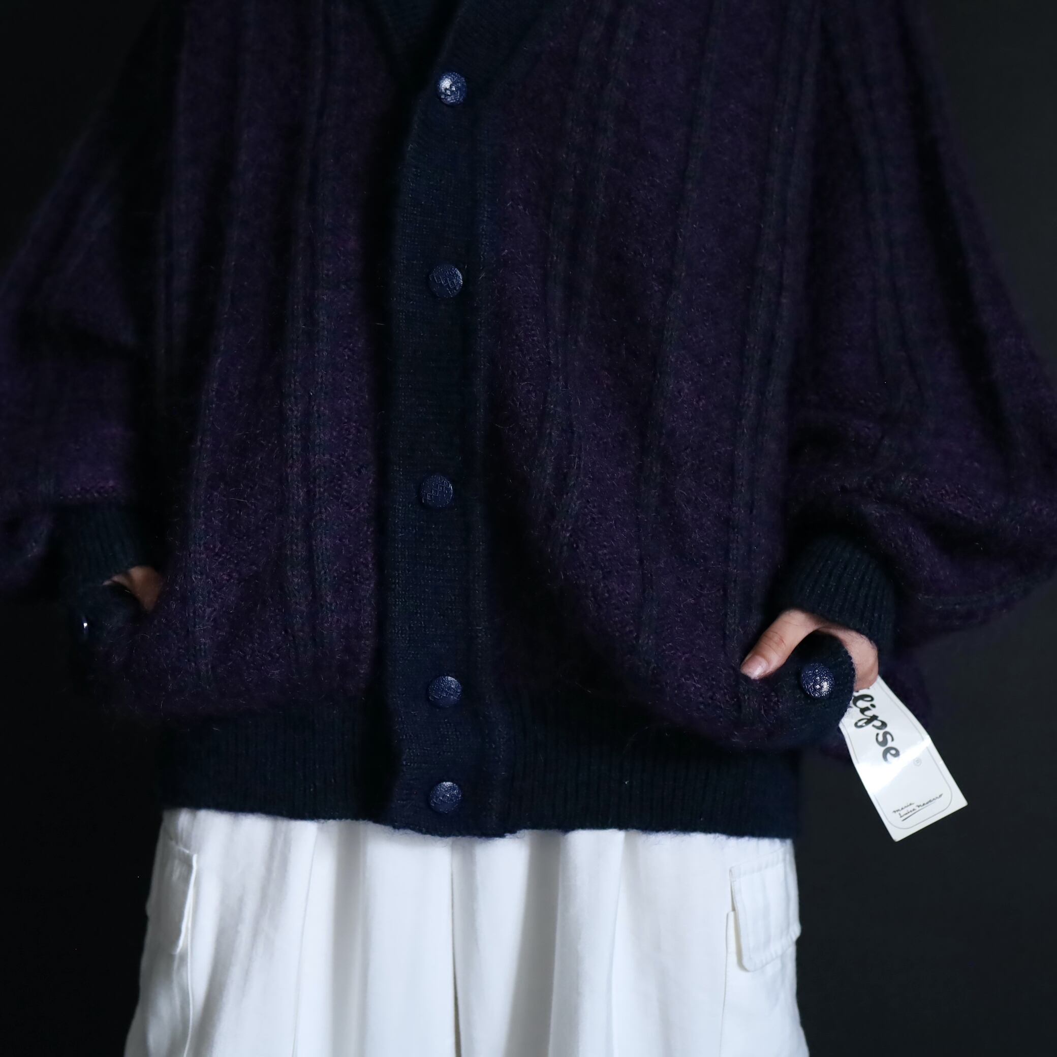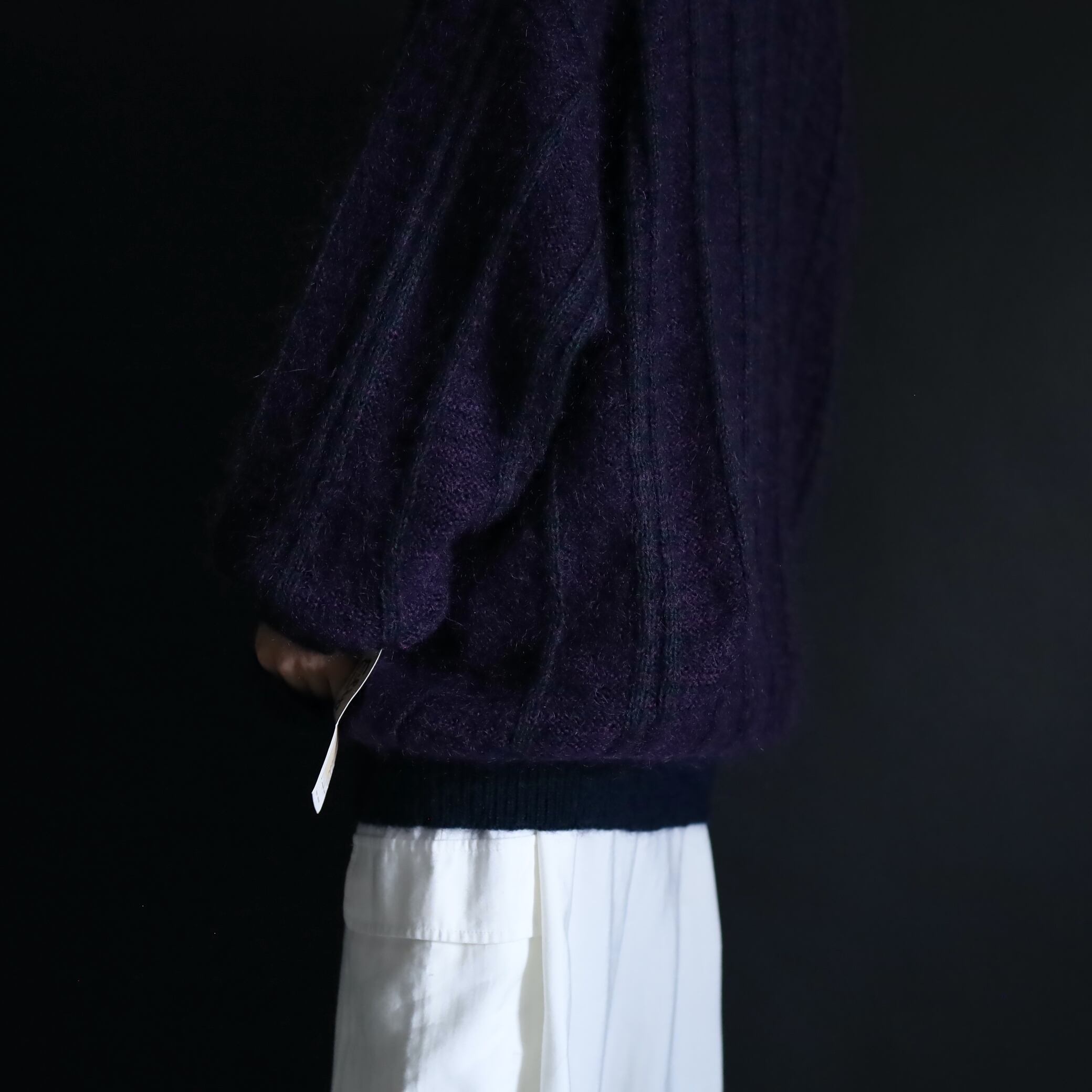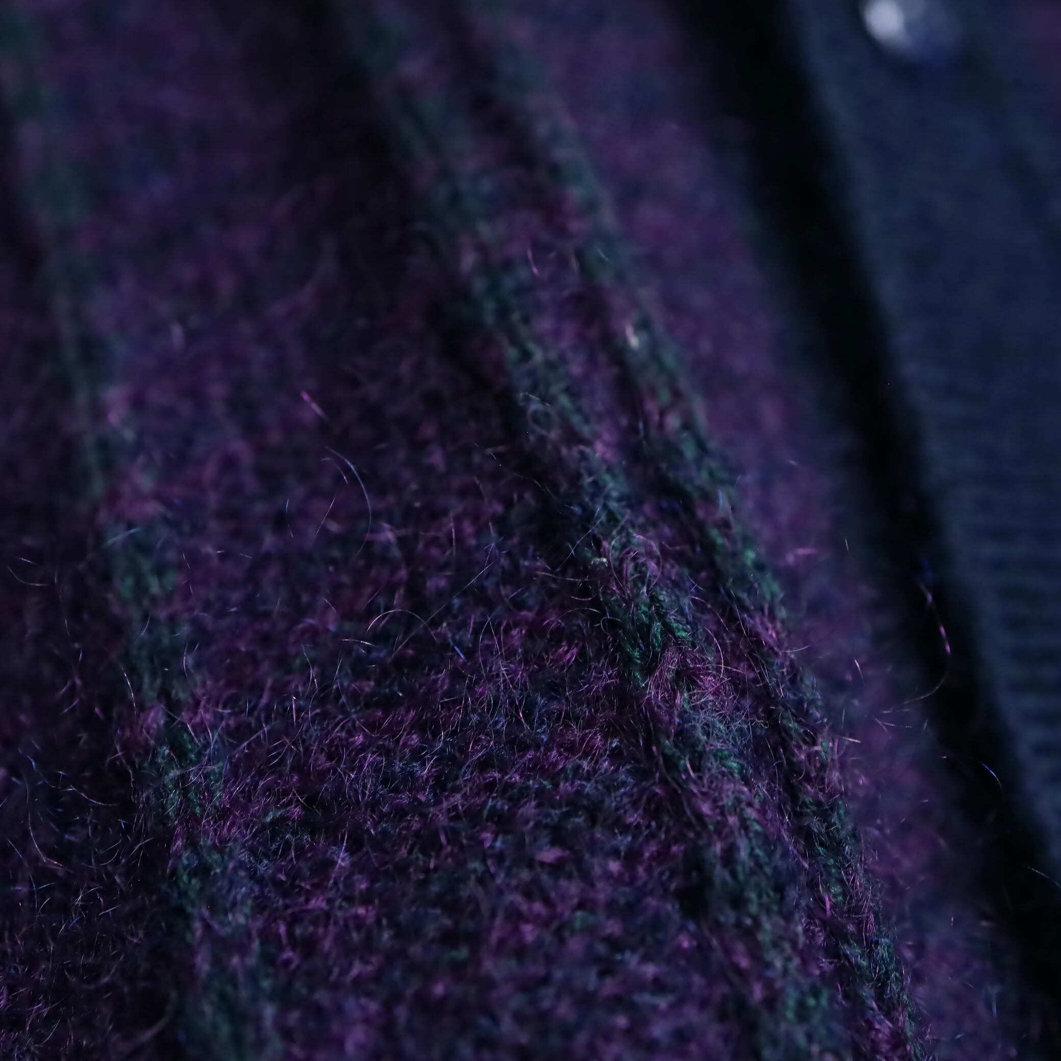 パープルとグリーンを編み込んだ,毒々しい配色.