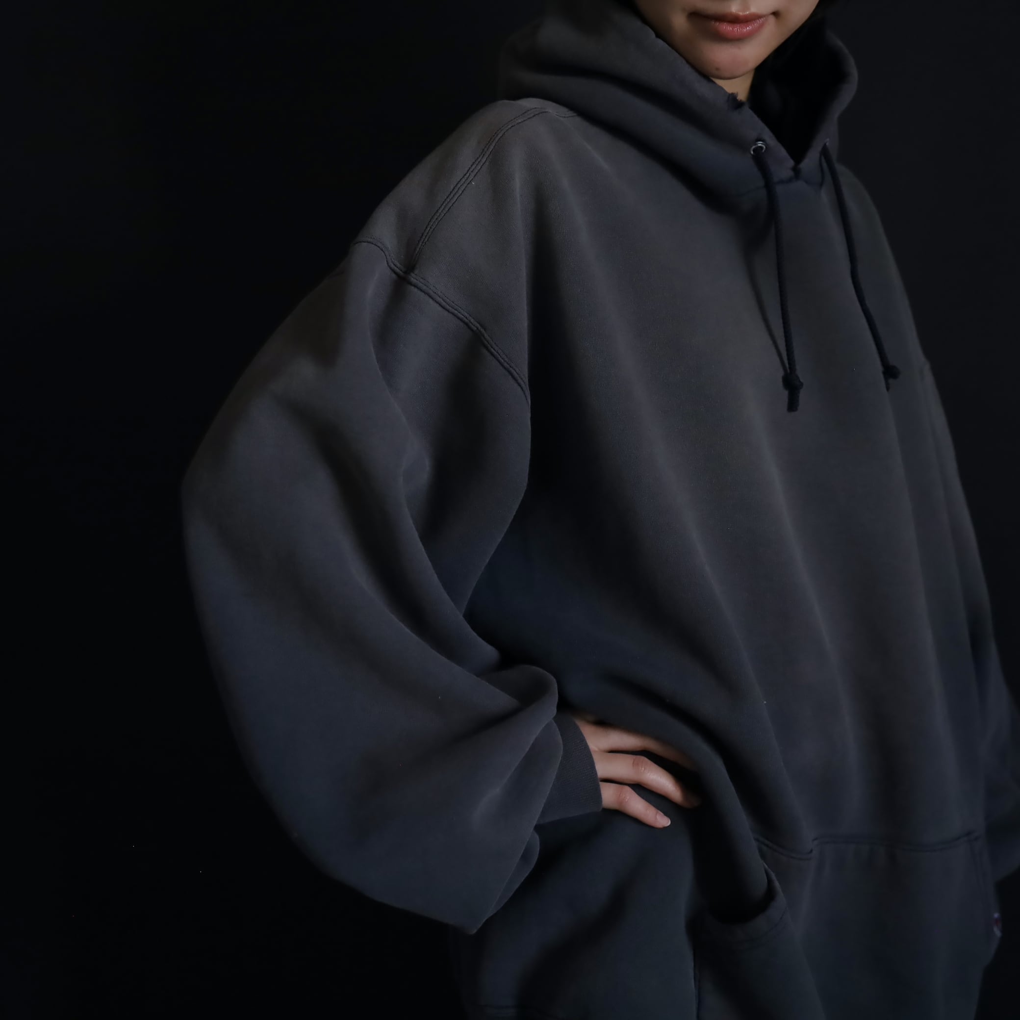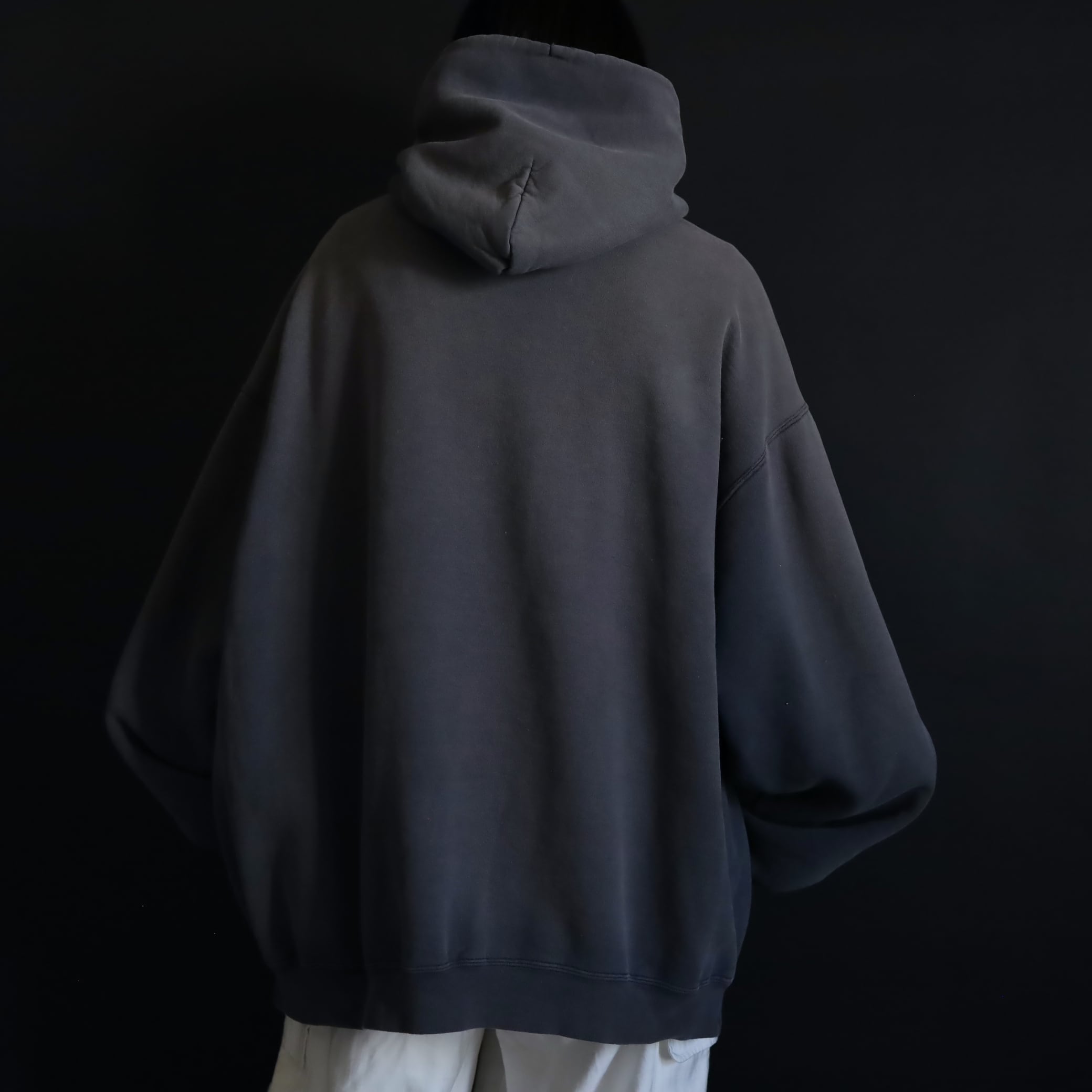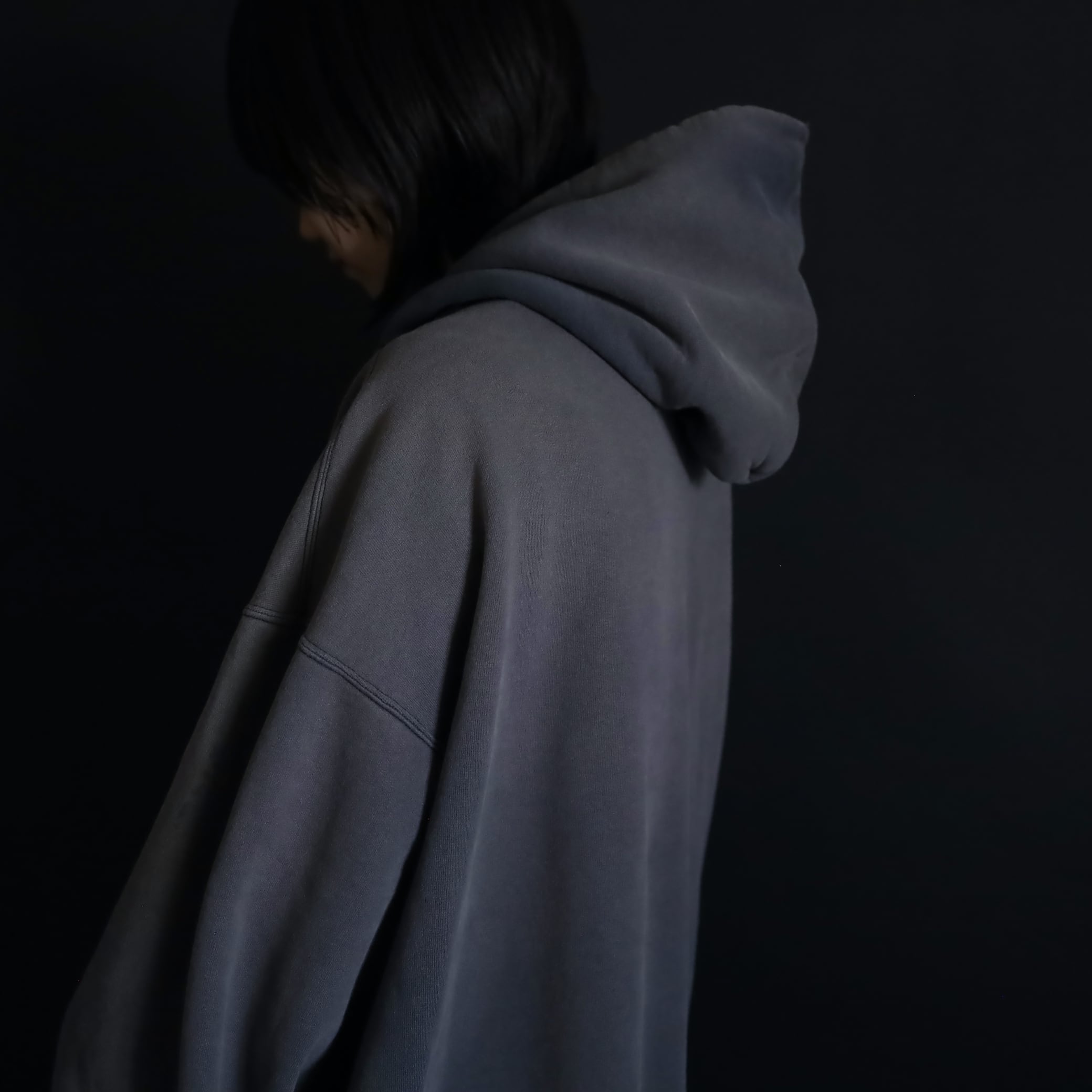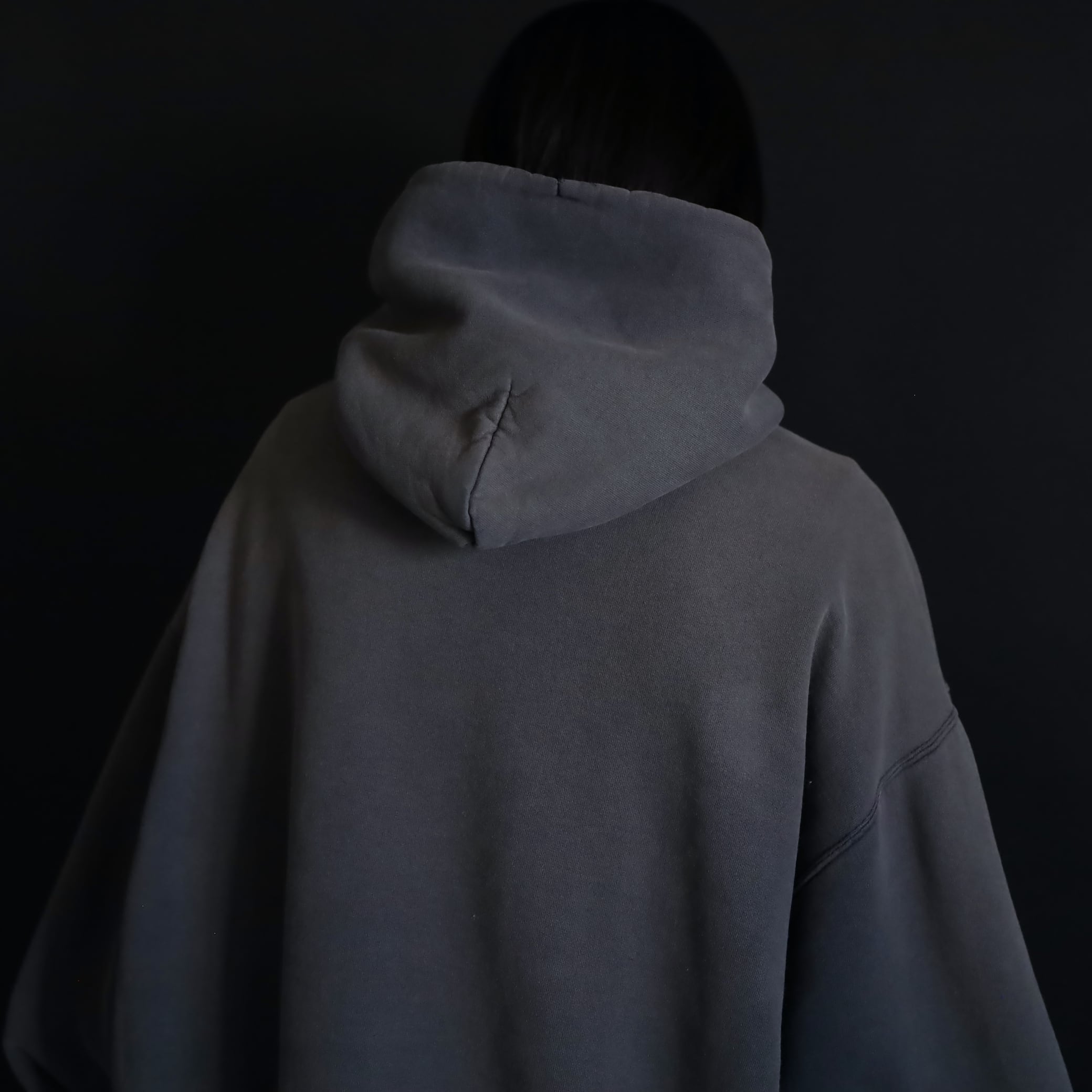 色落ちによるグラデーション味のある表情と,フードや各所に入ったクラッシュや生地の擦れで,グランジ感抜群の一枚に仕上がってます.