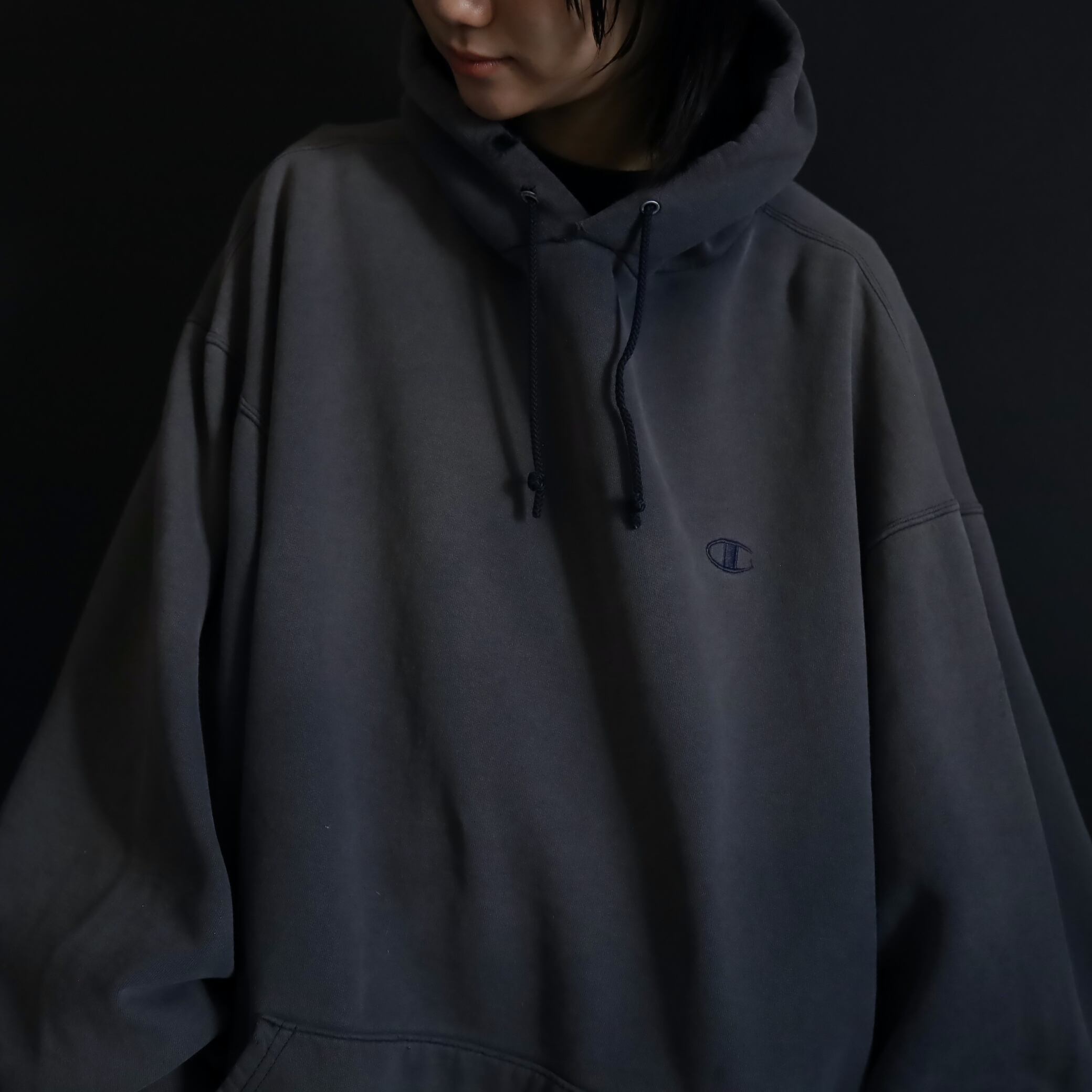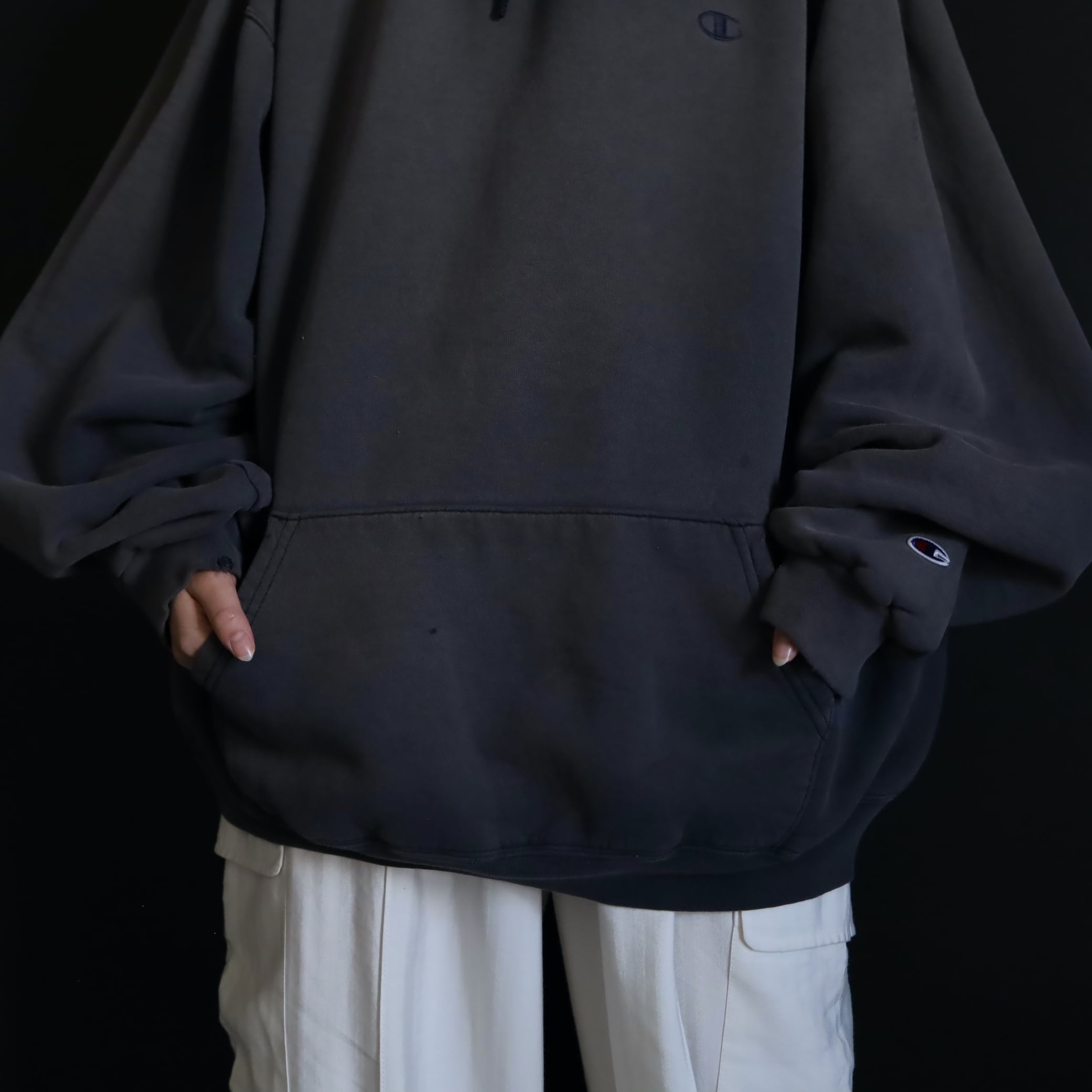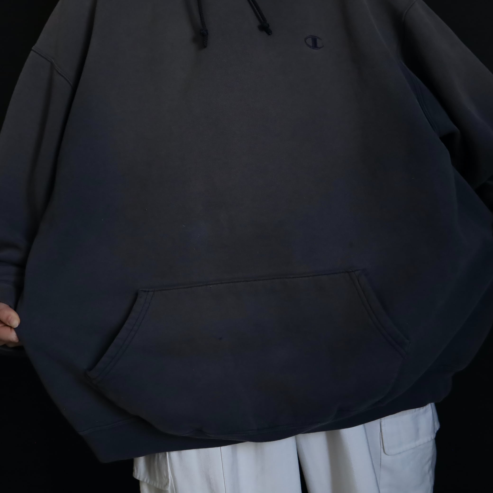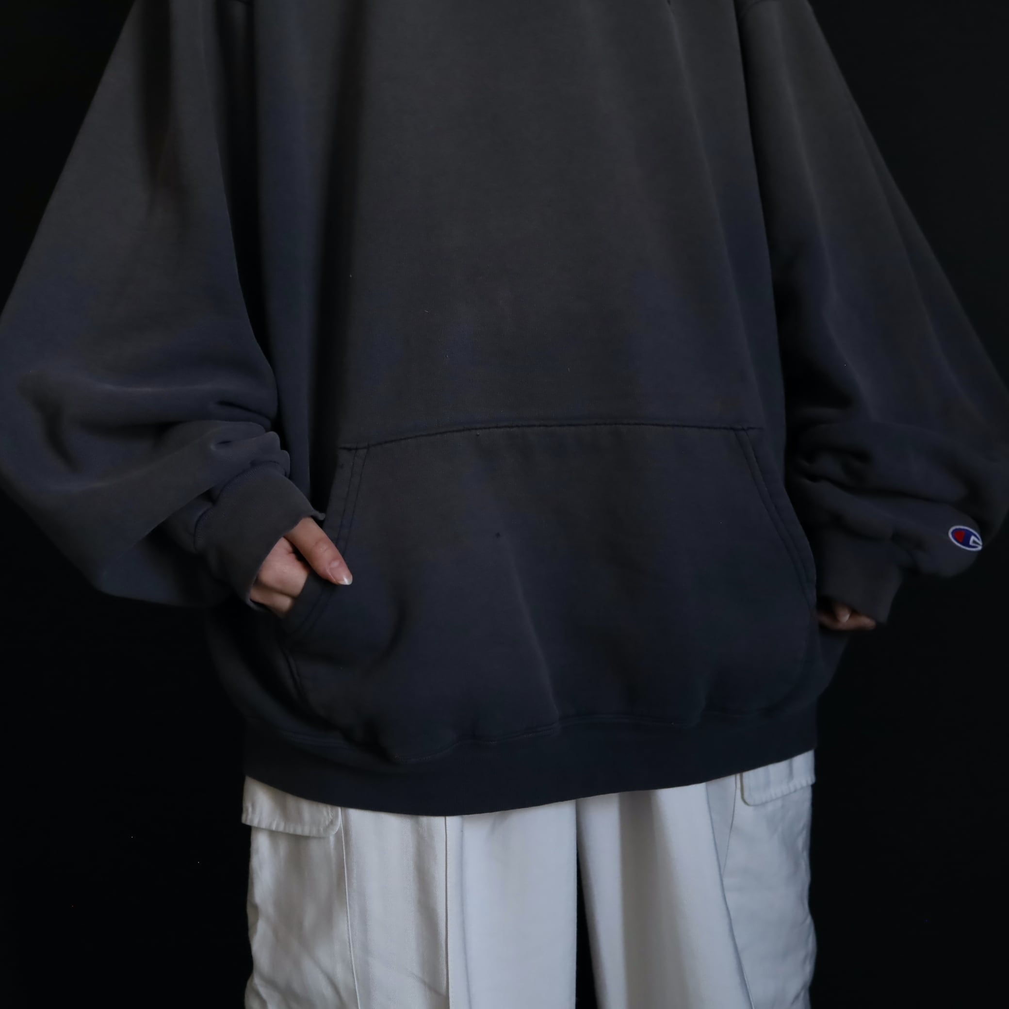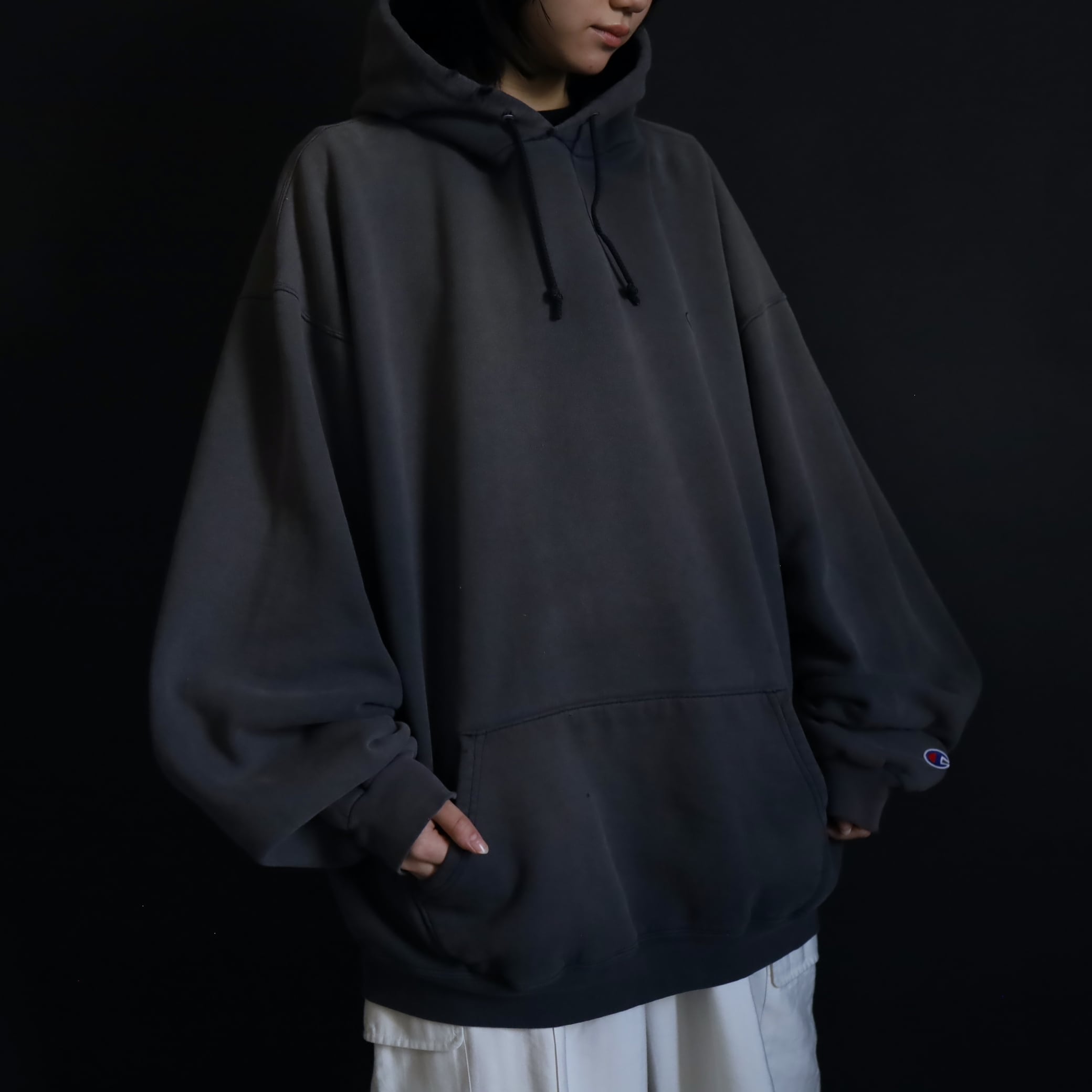色落ちによるグラデーション味のある表情と,フードや各所に入ったクラッシュや生地の擦れで,グランジ感抜群の一枚に仕上がってます.