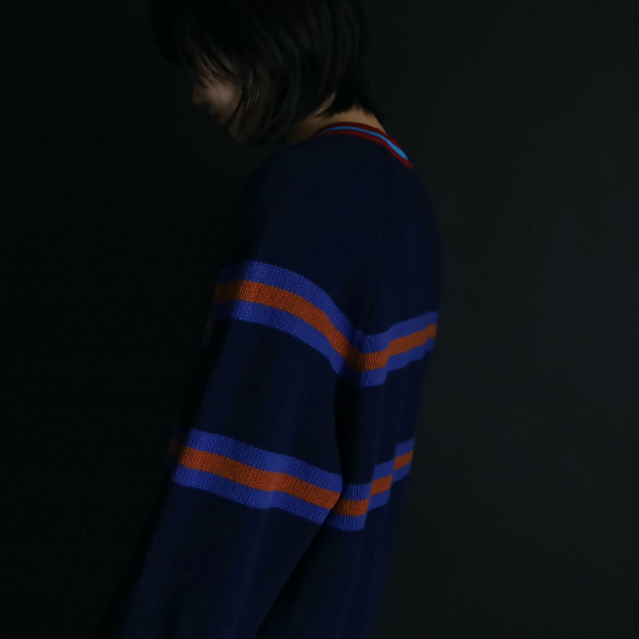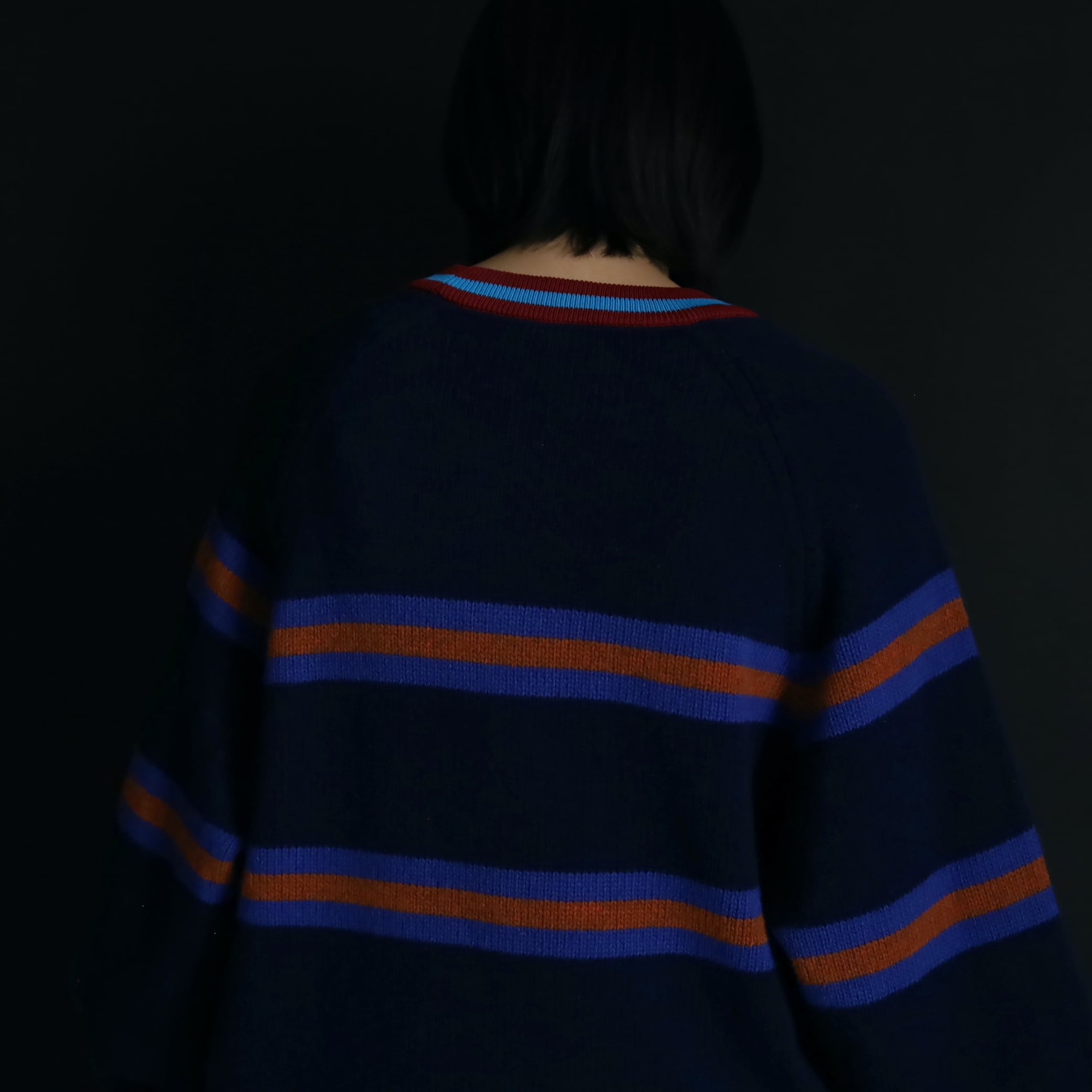 ネイビーカラーのボディをべーすとして,ブルー×テラコッタのボーダーデザイン.