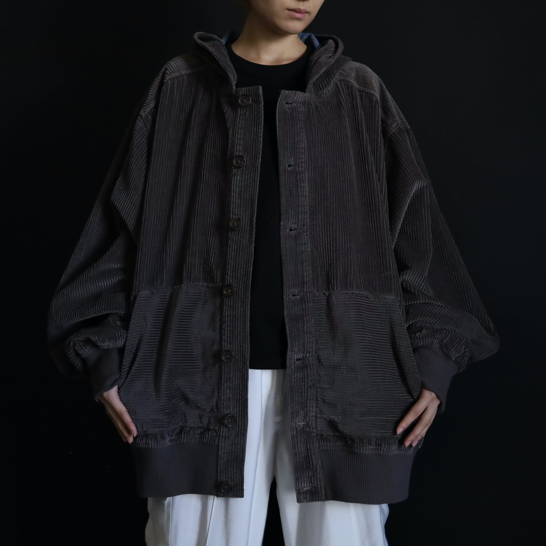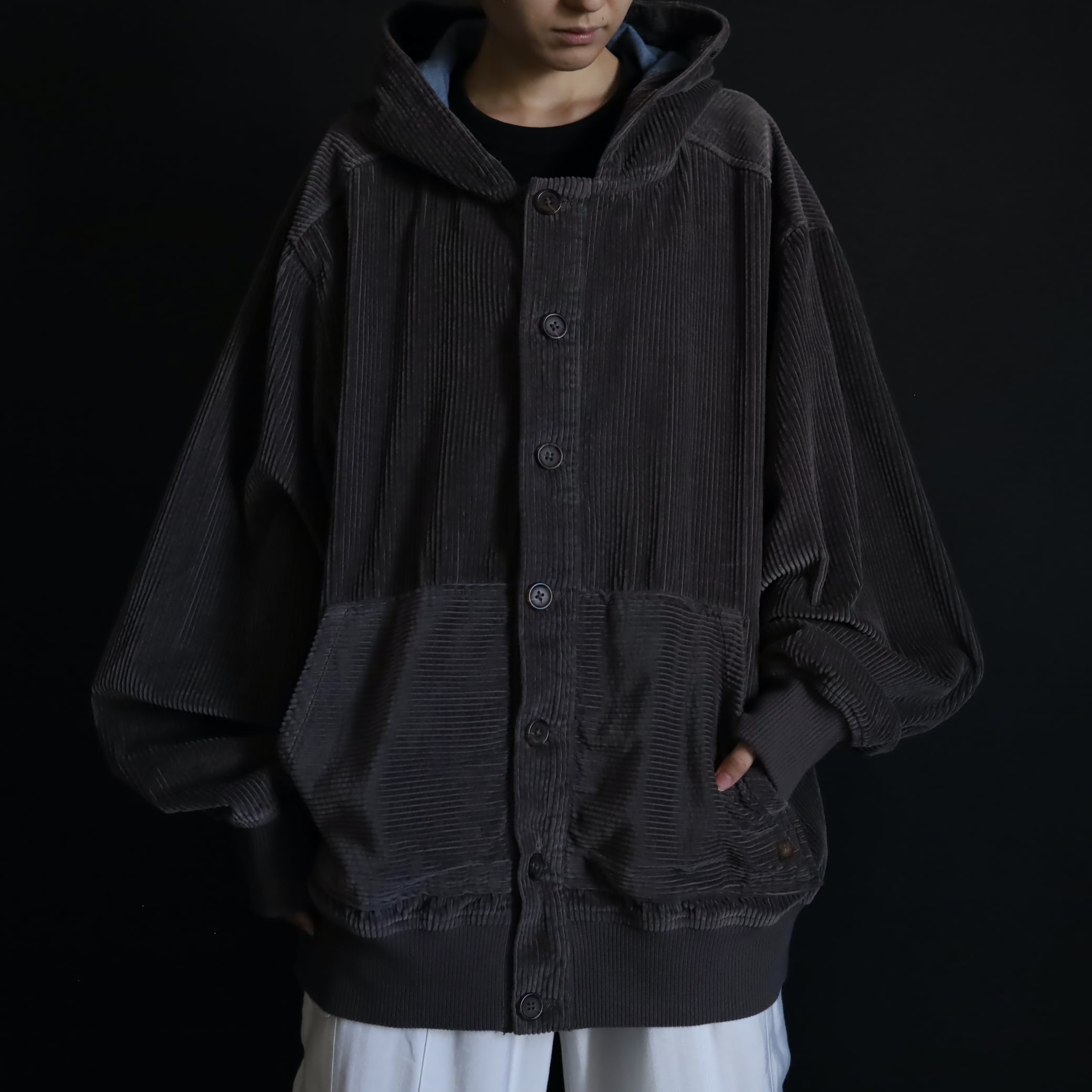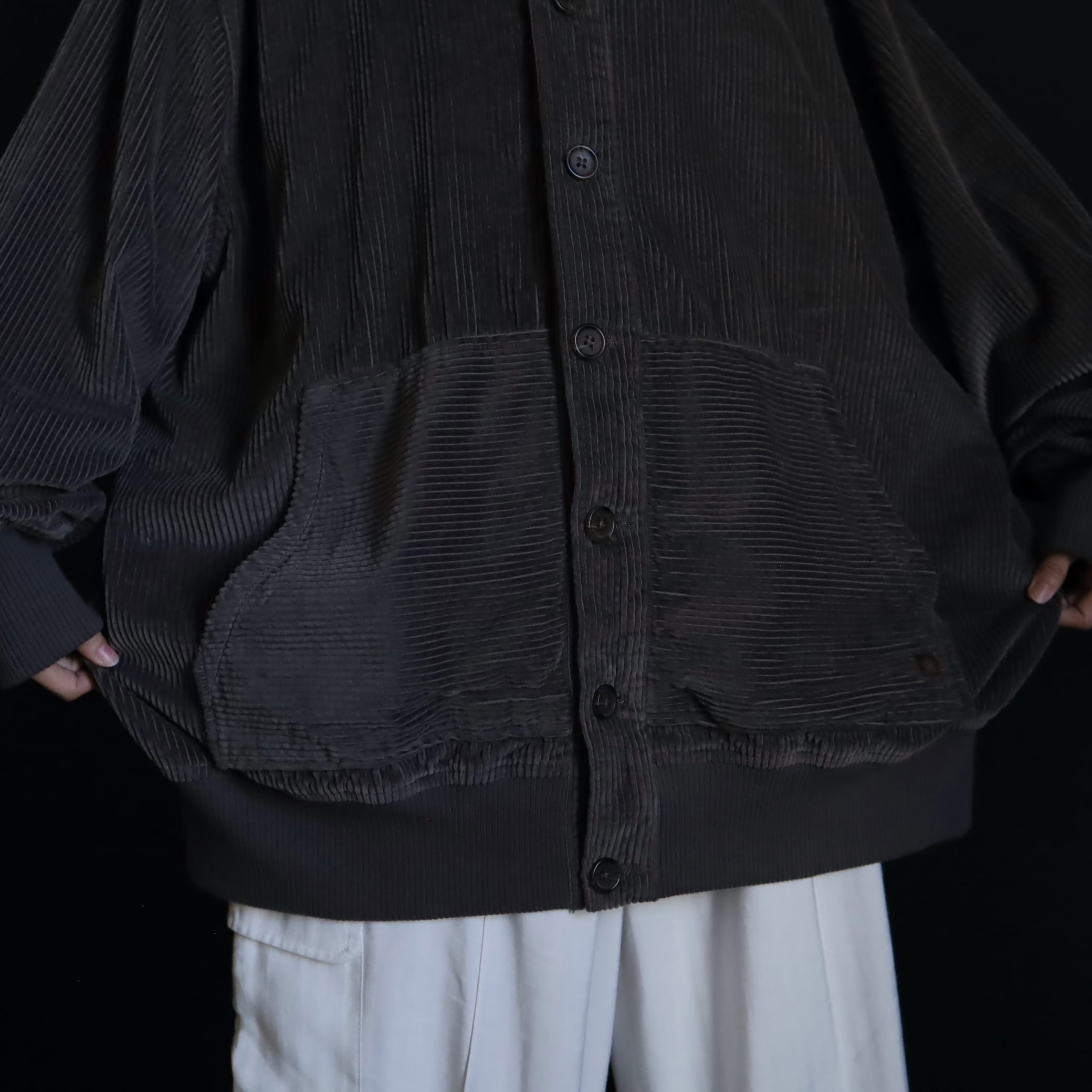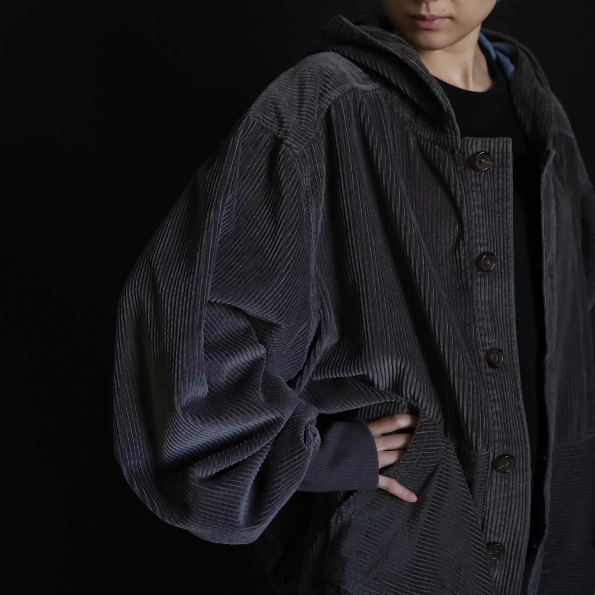 前立てがジップではなくボタン開閉という点と,コーデュロイの方向がボディとポケットで切替わる,ユーモア性を兼ね備えた1着.