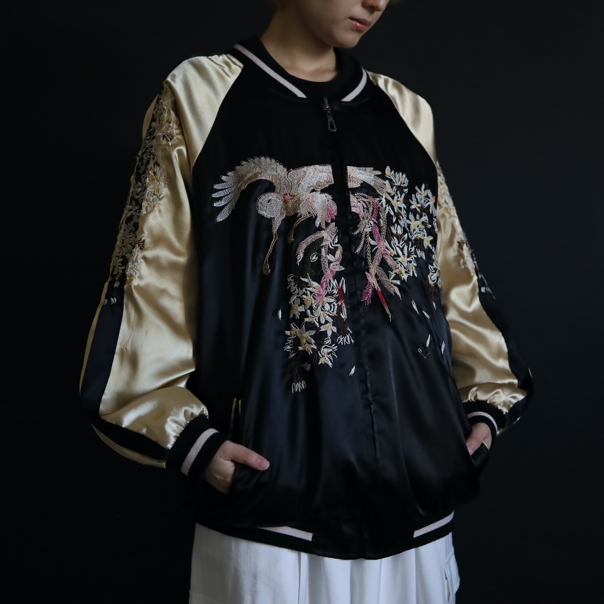 表面はブラック×ゴールドのサテンボディに,フロント,バック,袖に鶴や小花の刺繍.