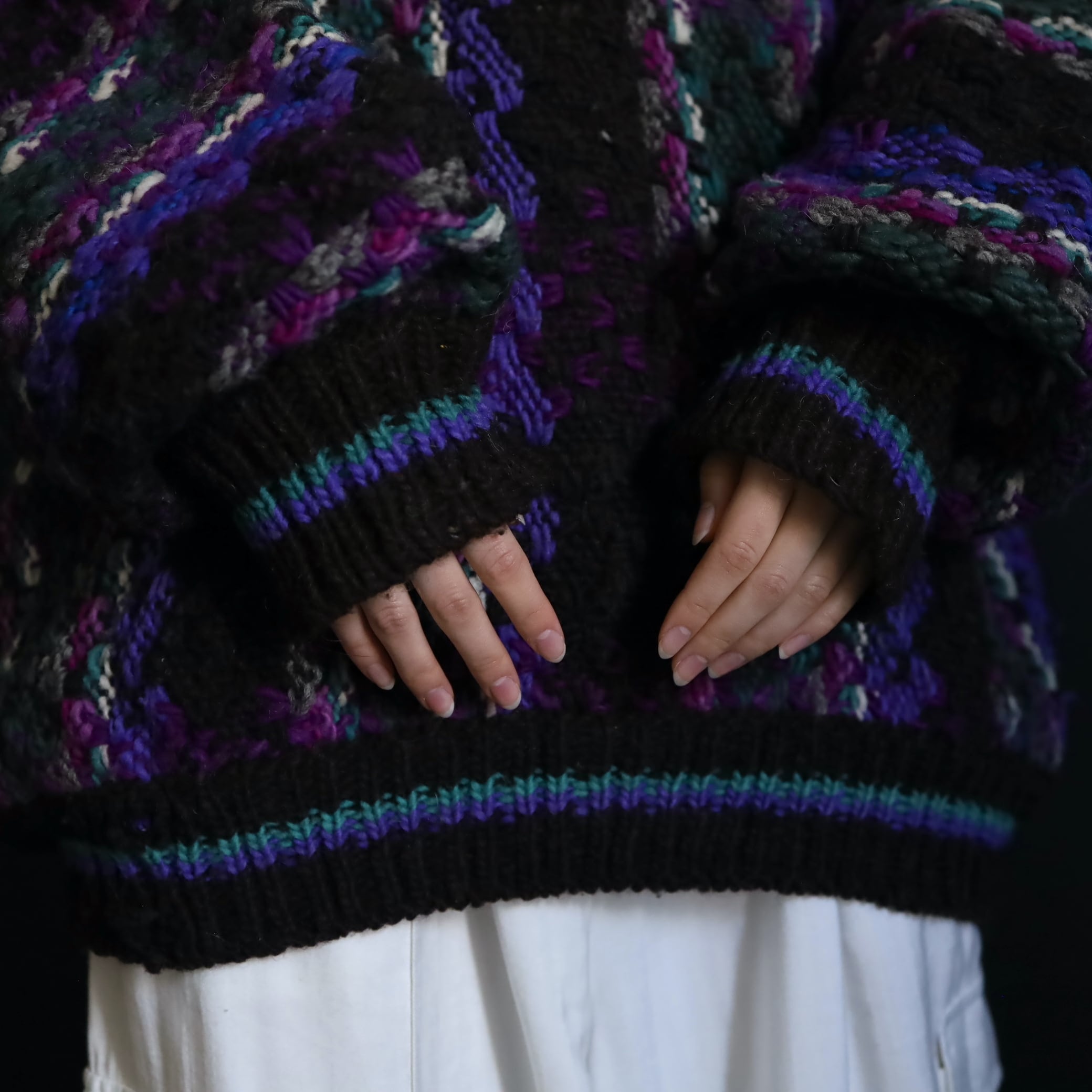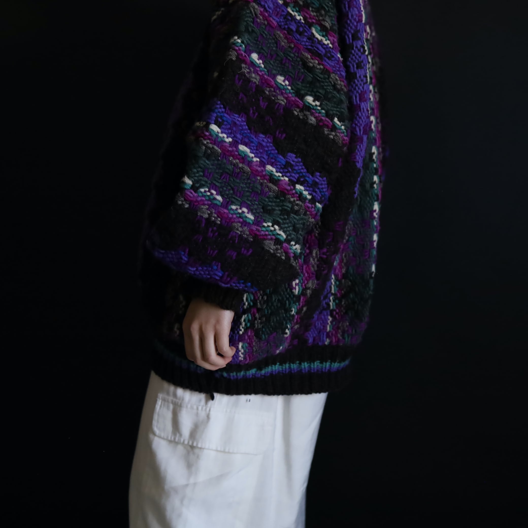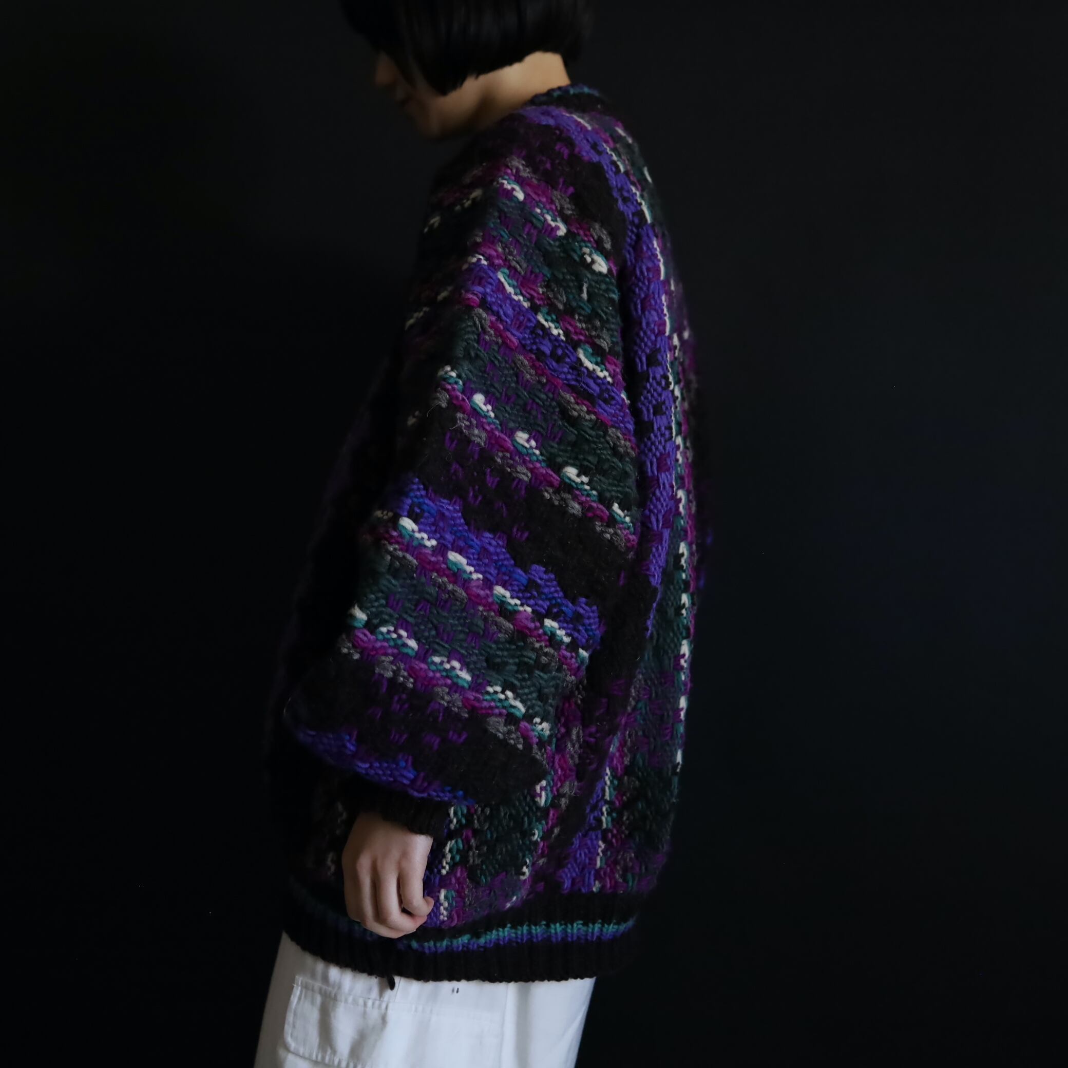 パープル,グリーン,ダークブラウン,グレー,ホワイトなど,多色の太い毛糸をざっくり編み込んだローゲージニット.