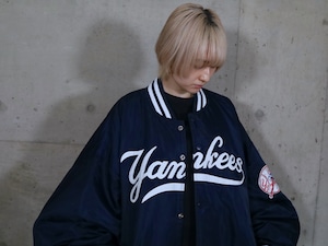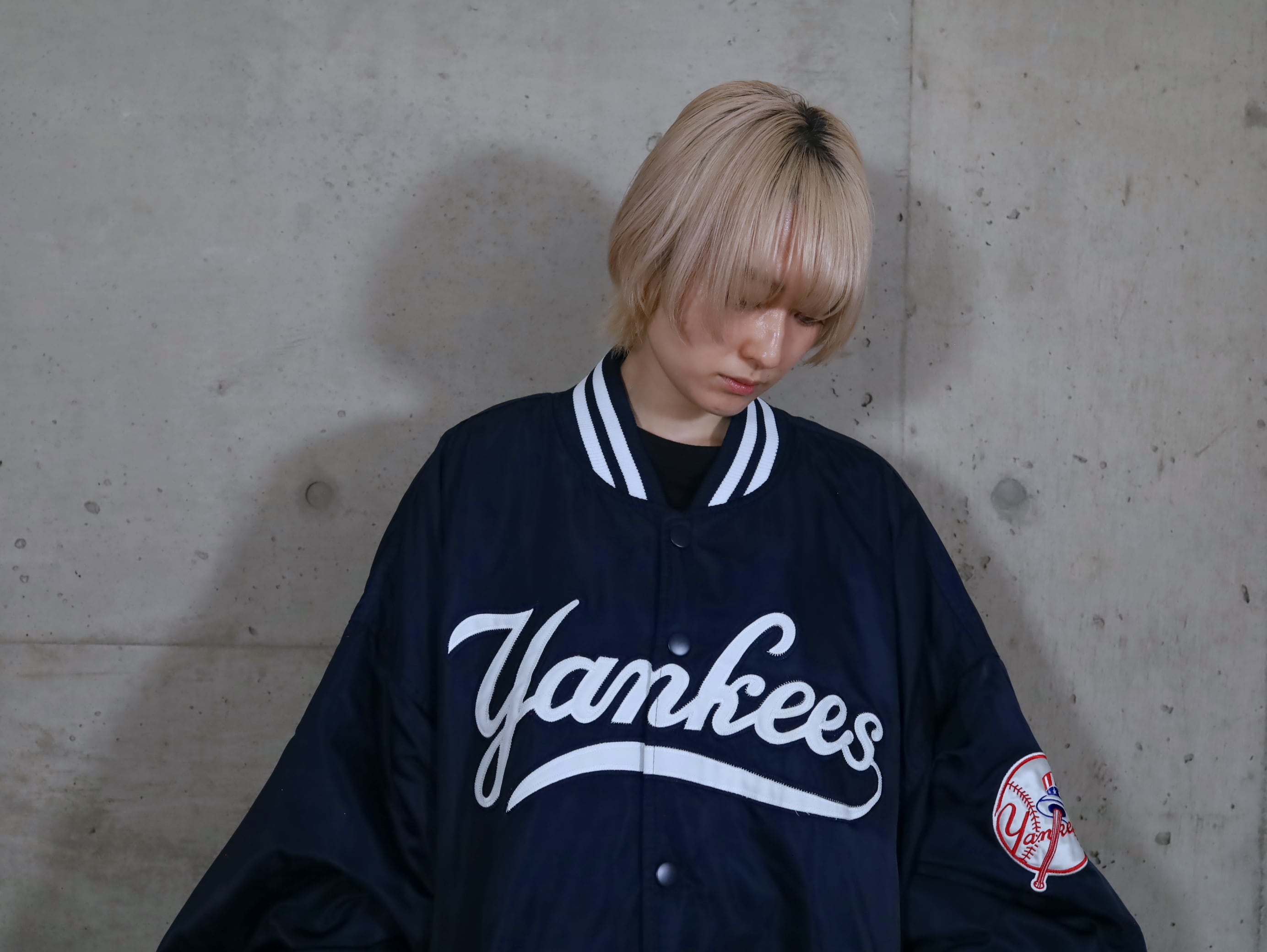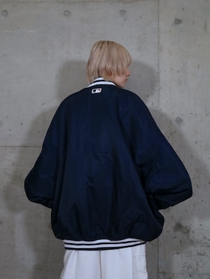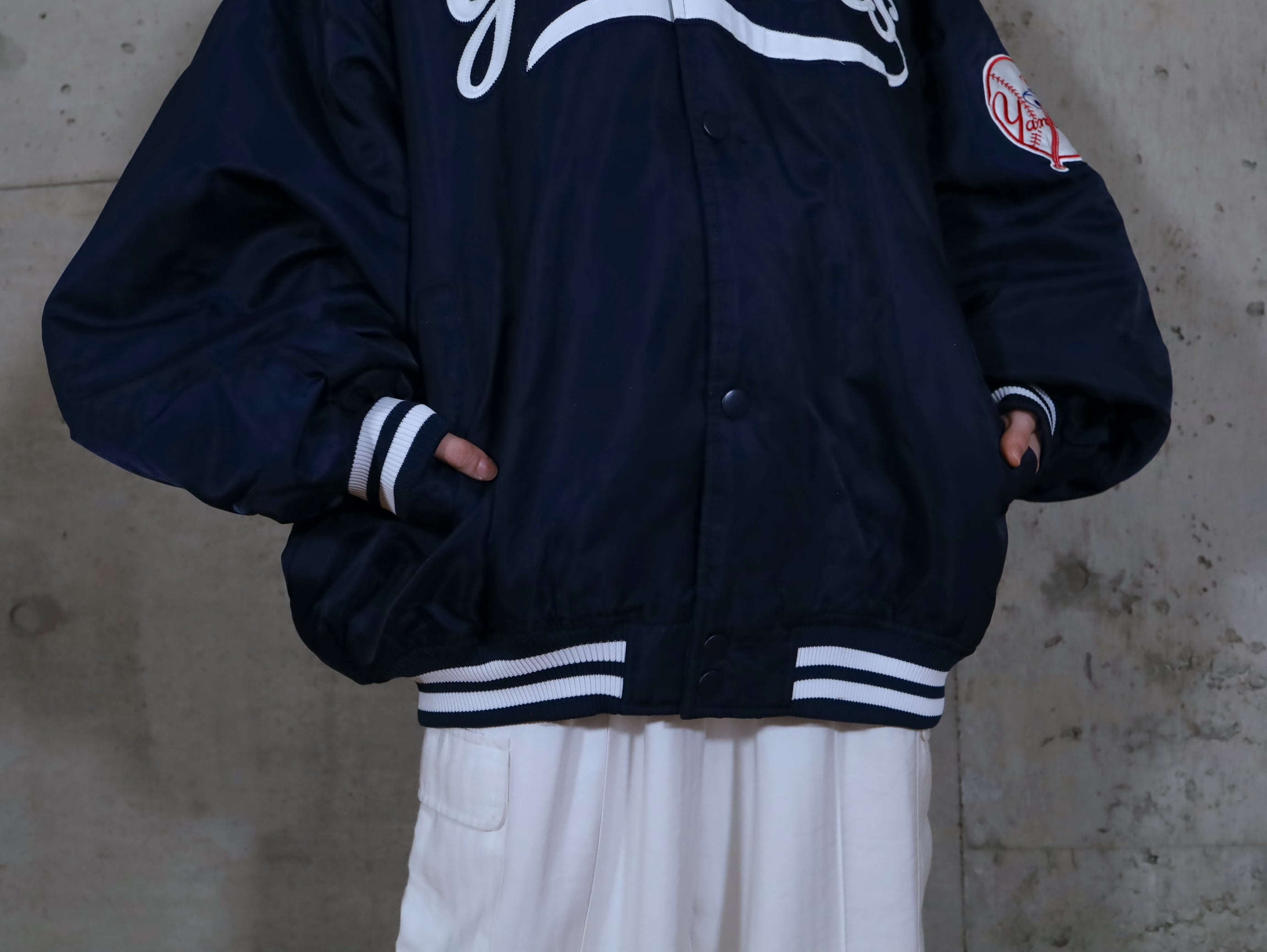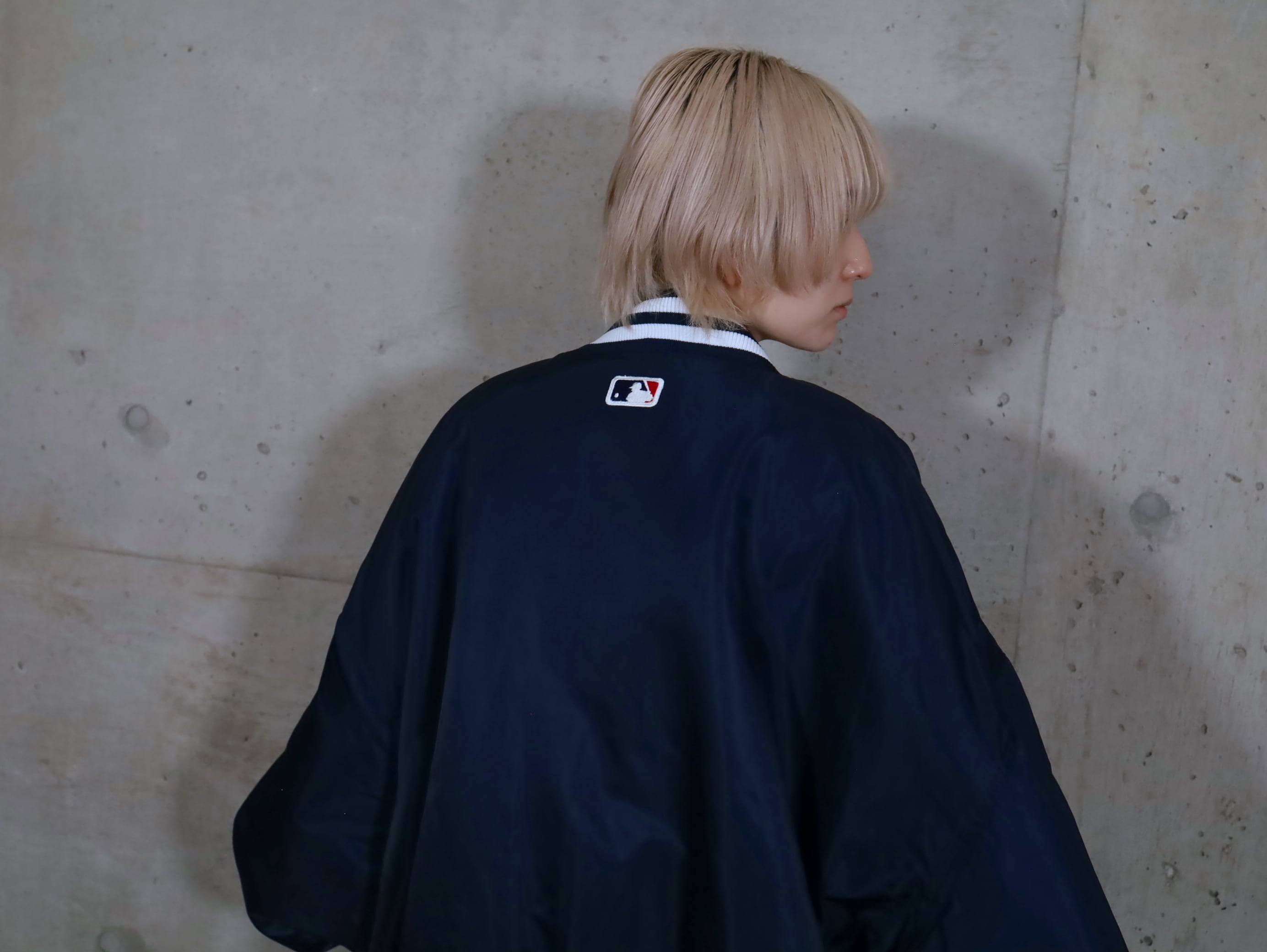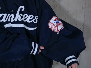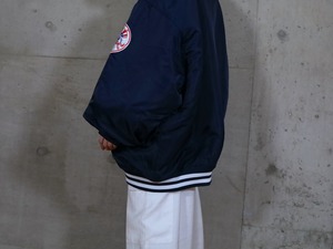 ネイビーカラーのナイロンボディをシェルに,フロントにMLB New York Yankeesの刺繍,左袖にはワッペンがデザインされた1着.