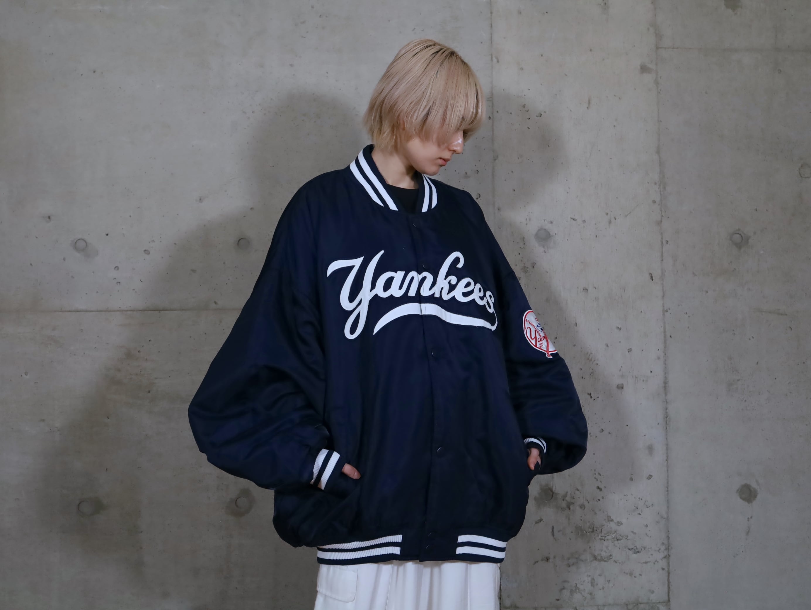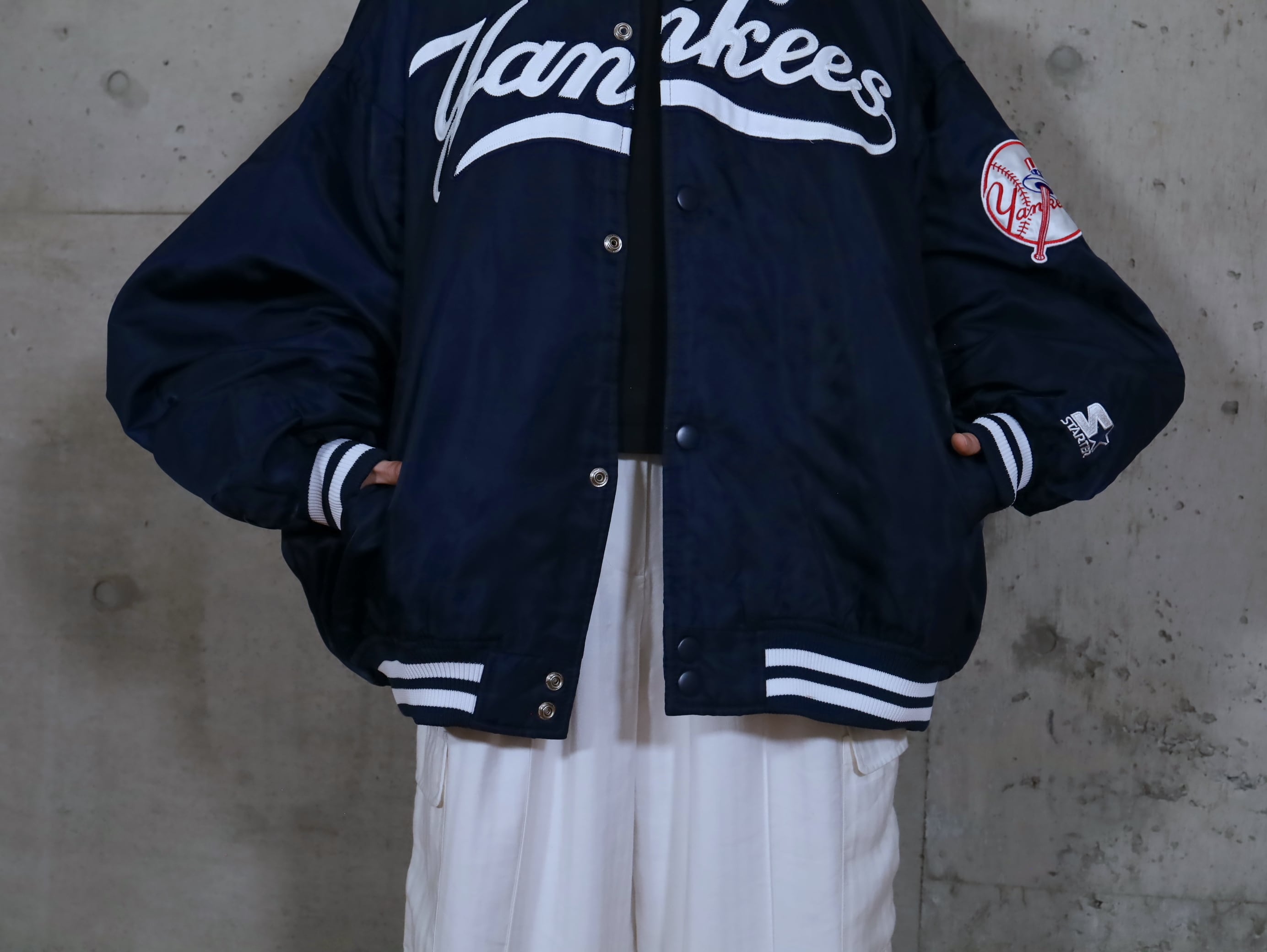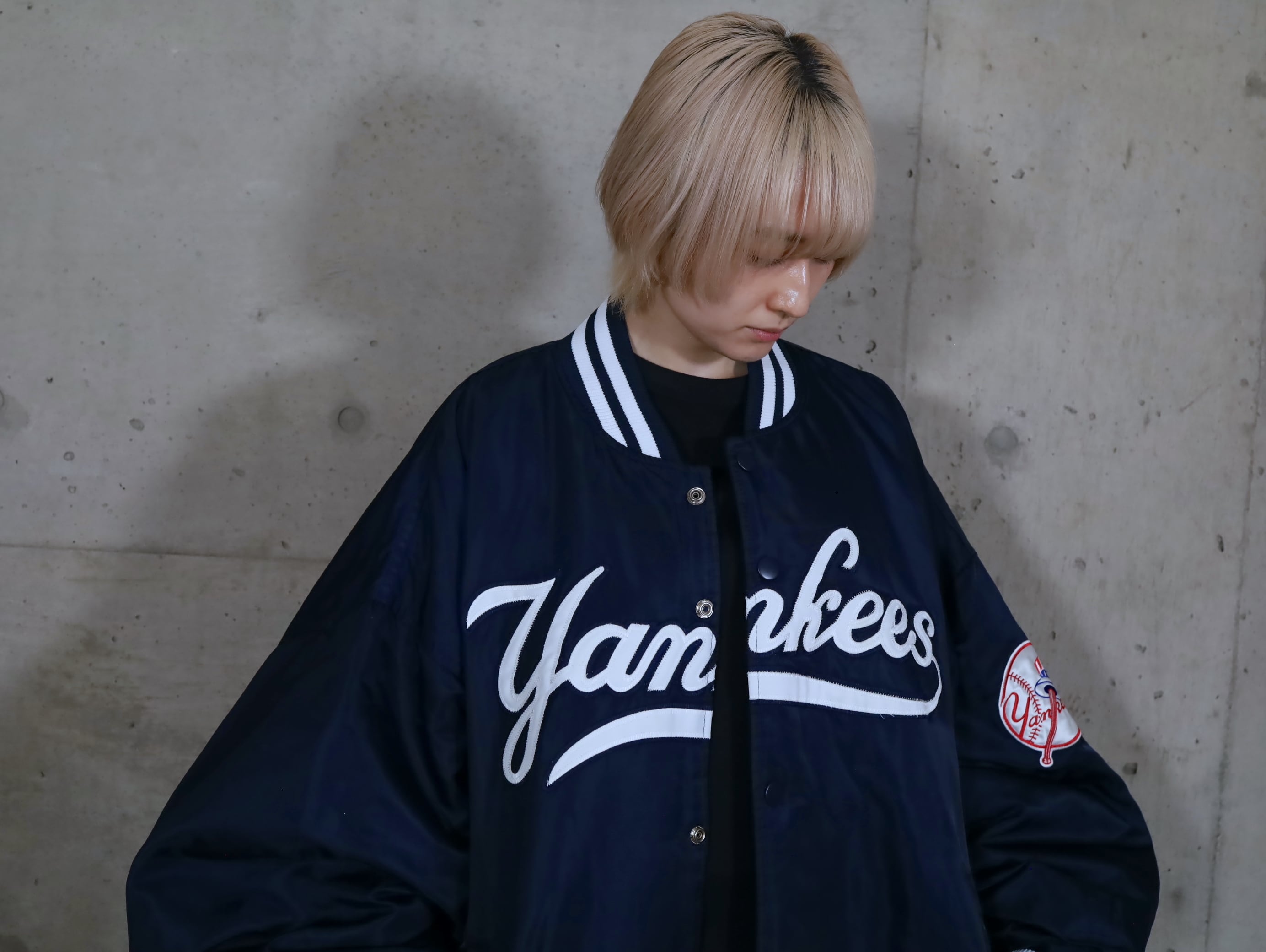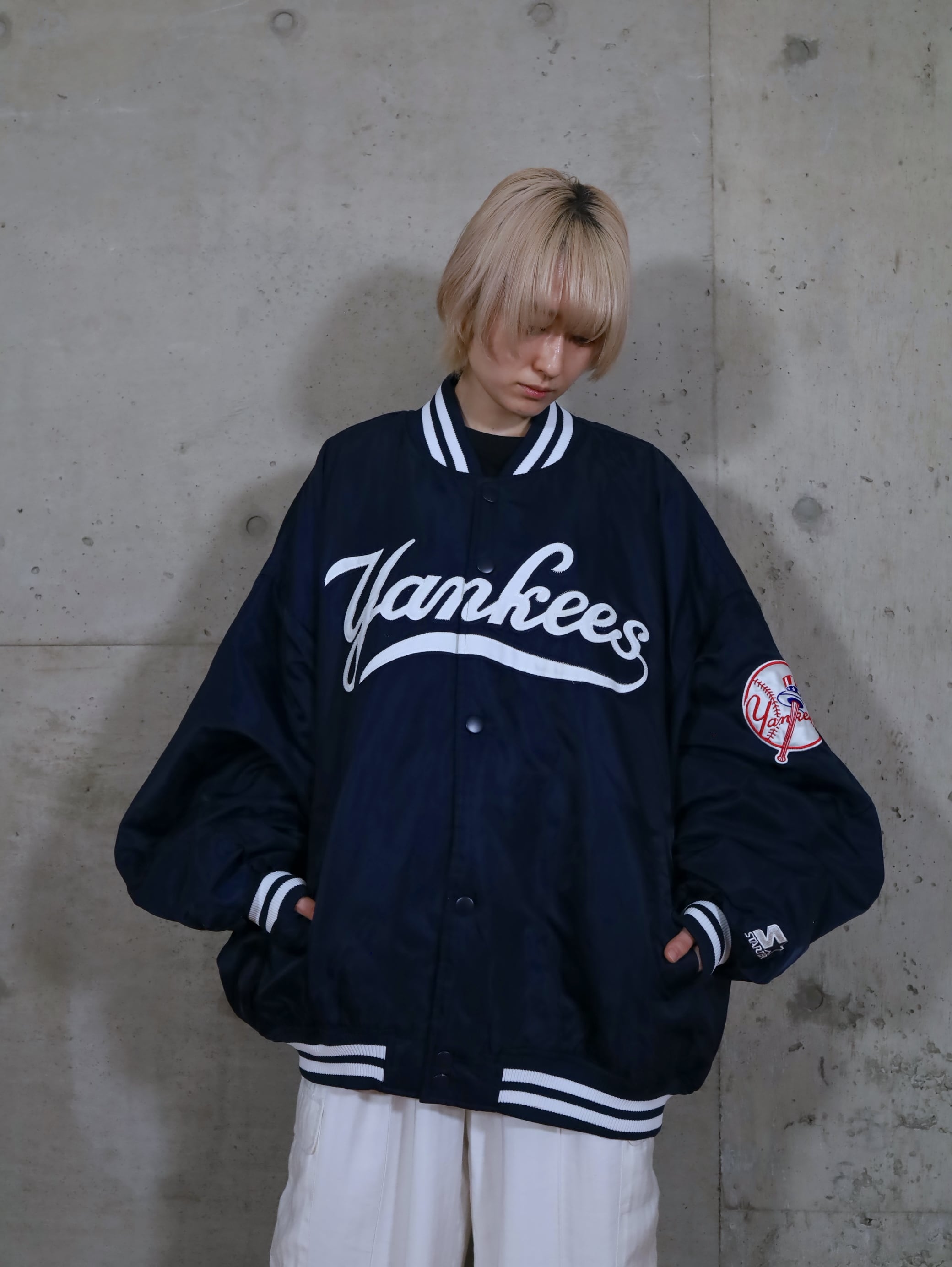 ネイビーカラーのナイロンボディをシェルに,フロントにMLB New York Yankeesの刺繍,左袖にはワッペンがデザインされた1着.
