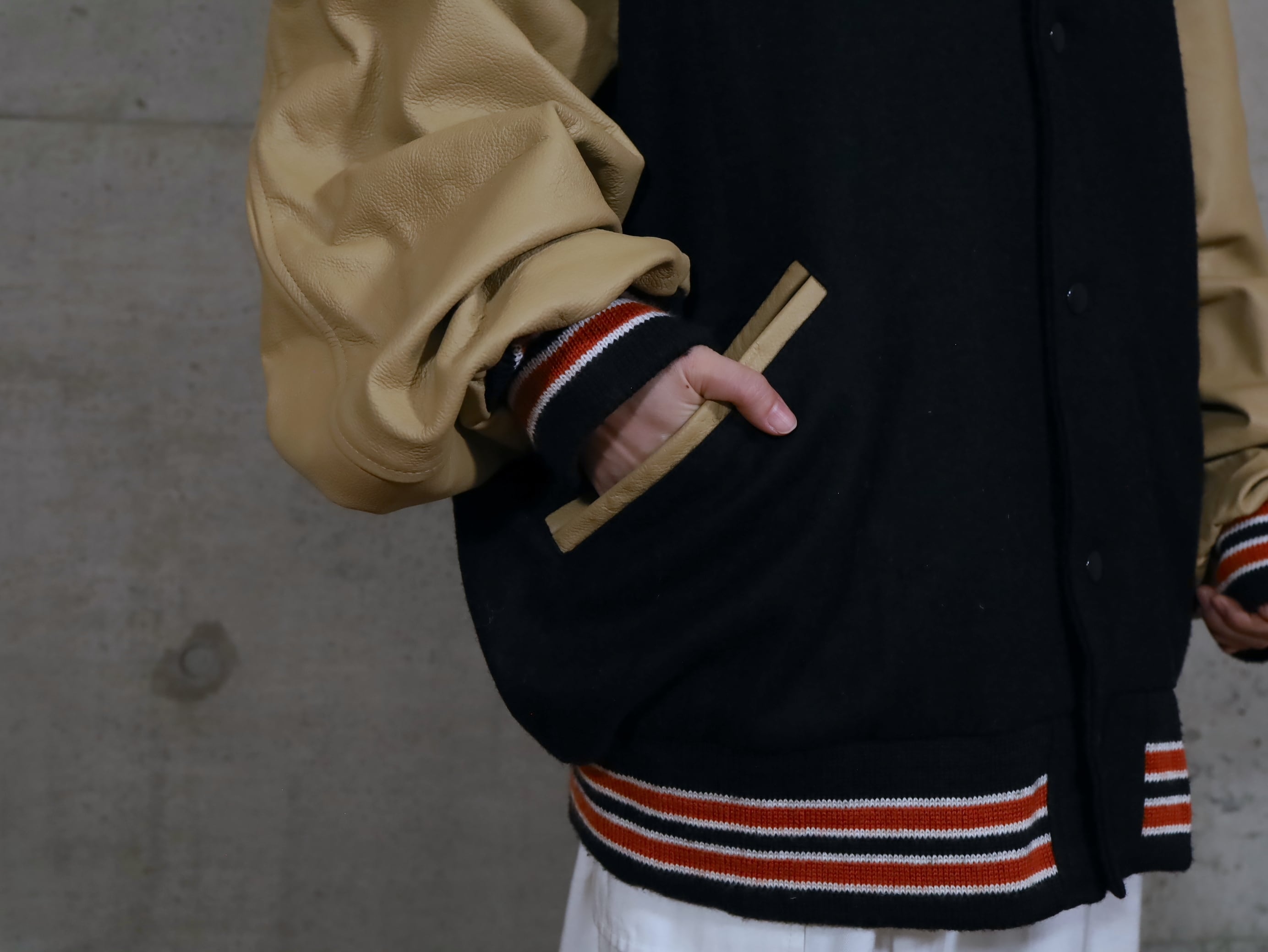 袖はベージュカラーの本革切替デザイン.