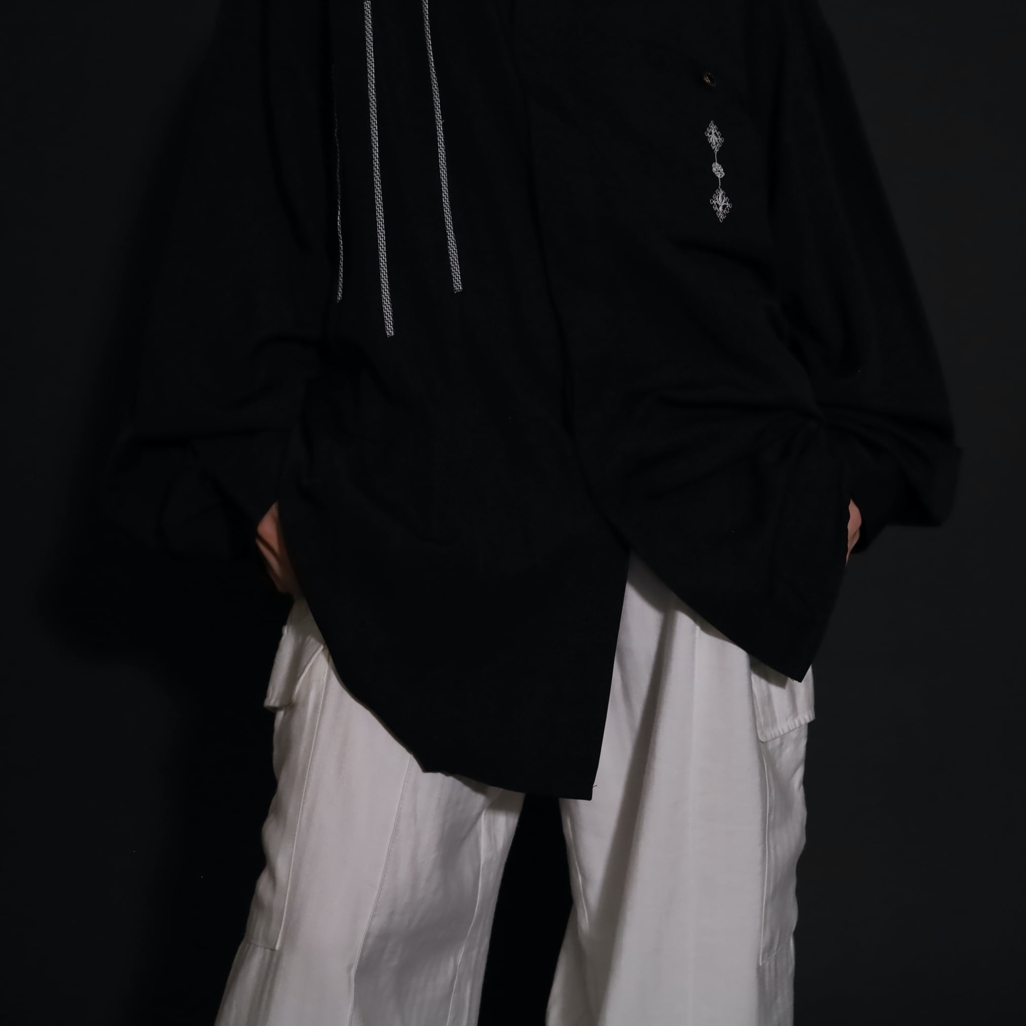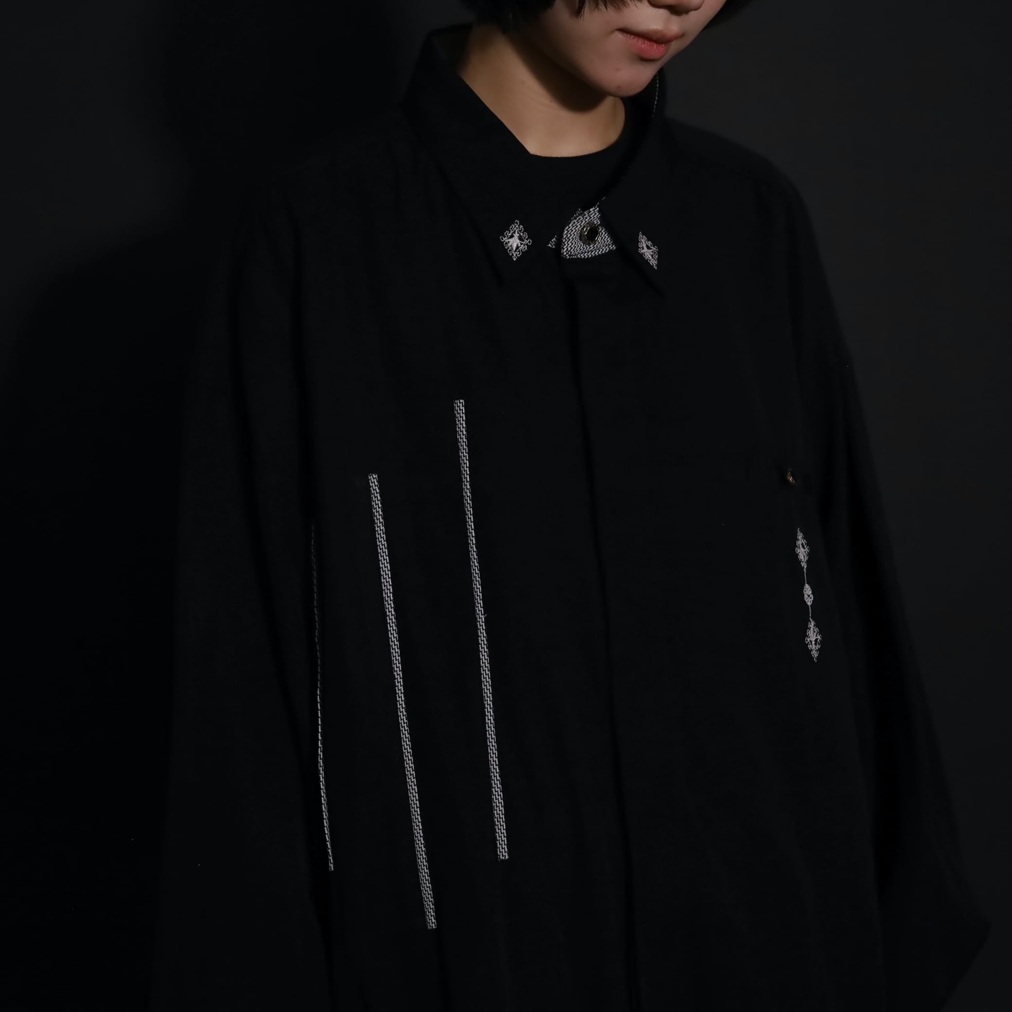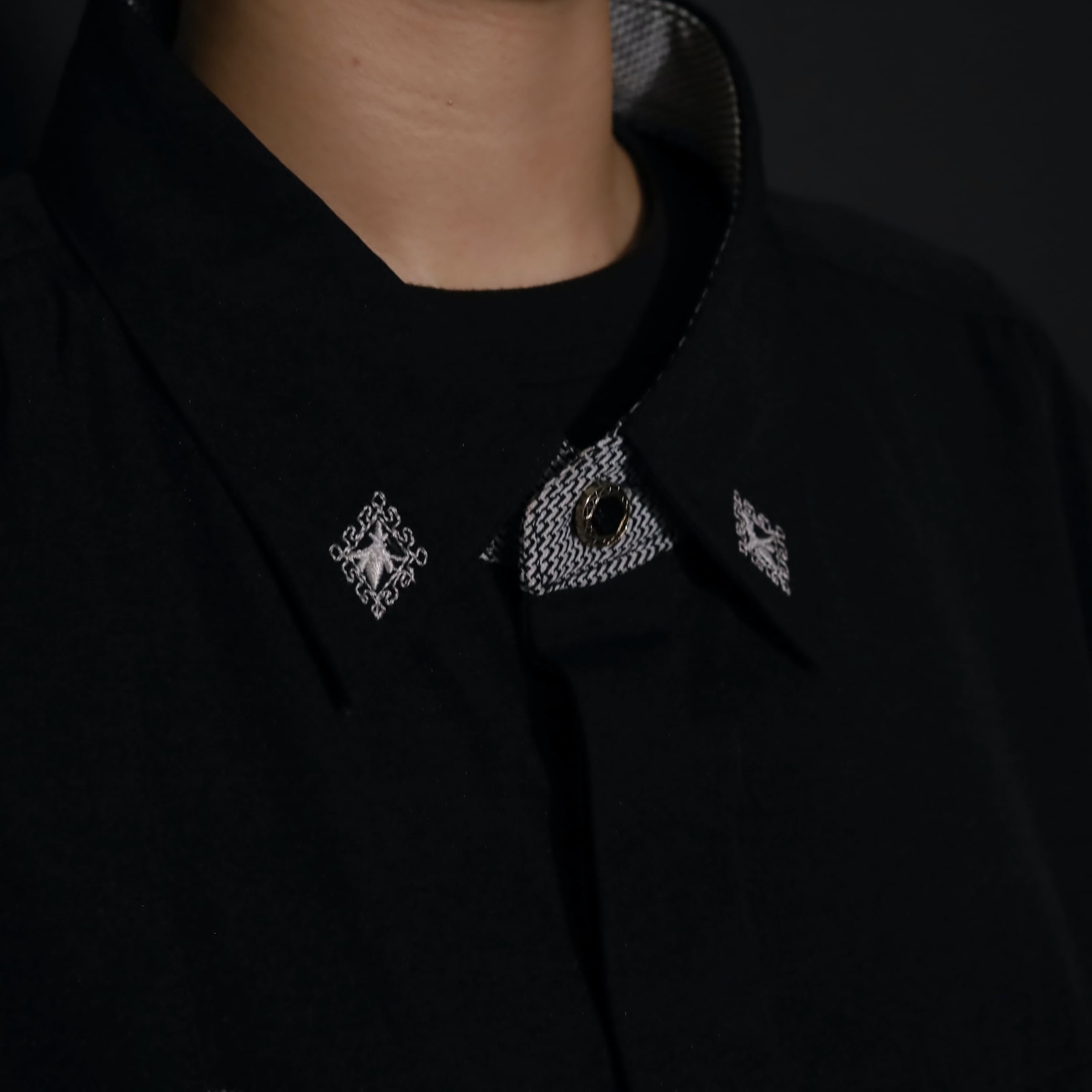 襟,右胸,左胸ポケット上にホワイトの刺繍デザイン.