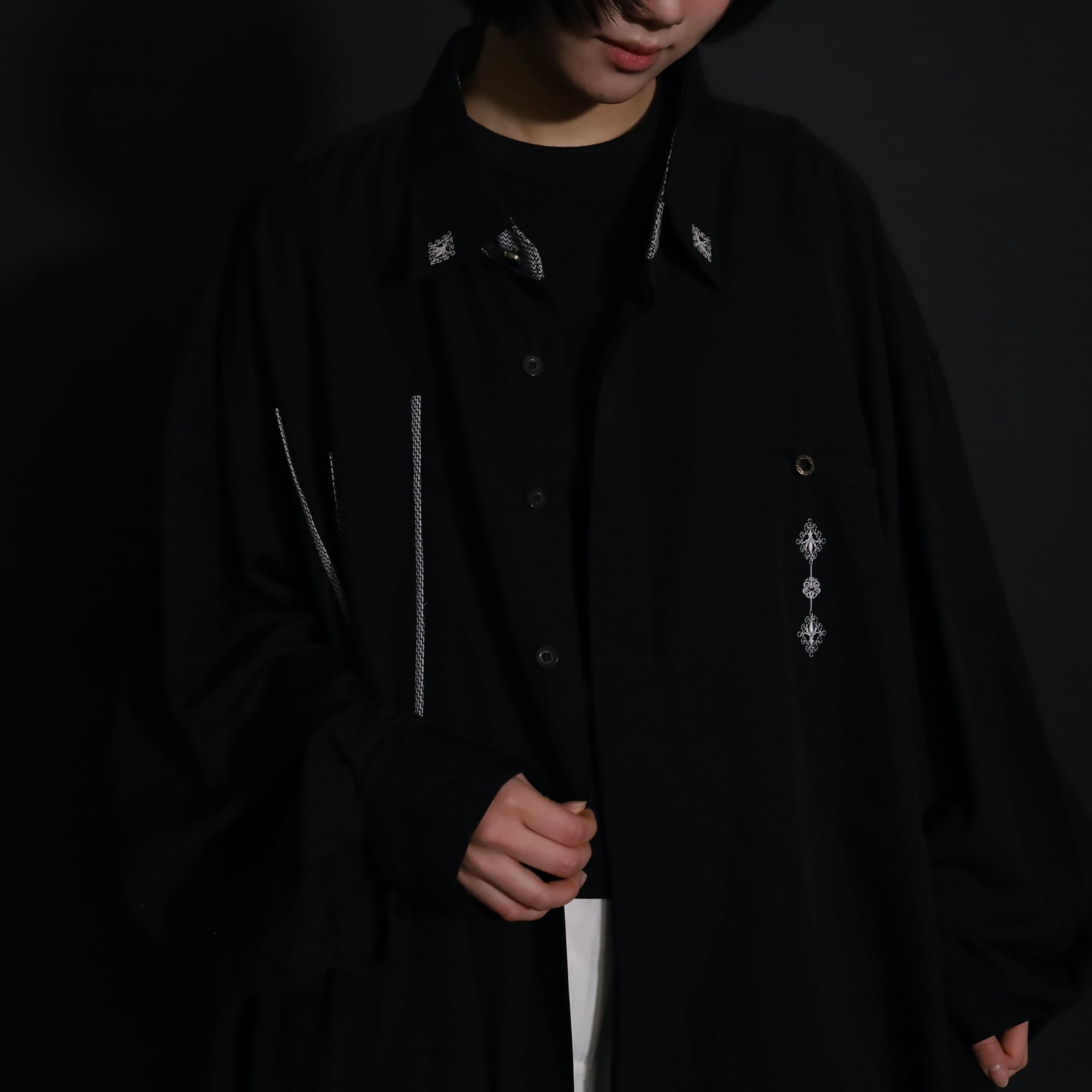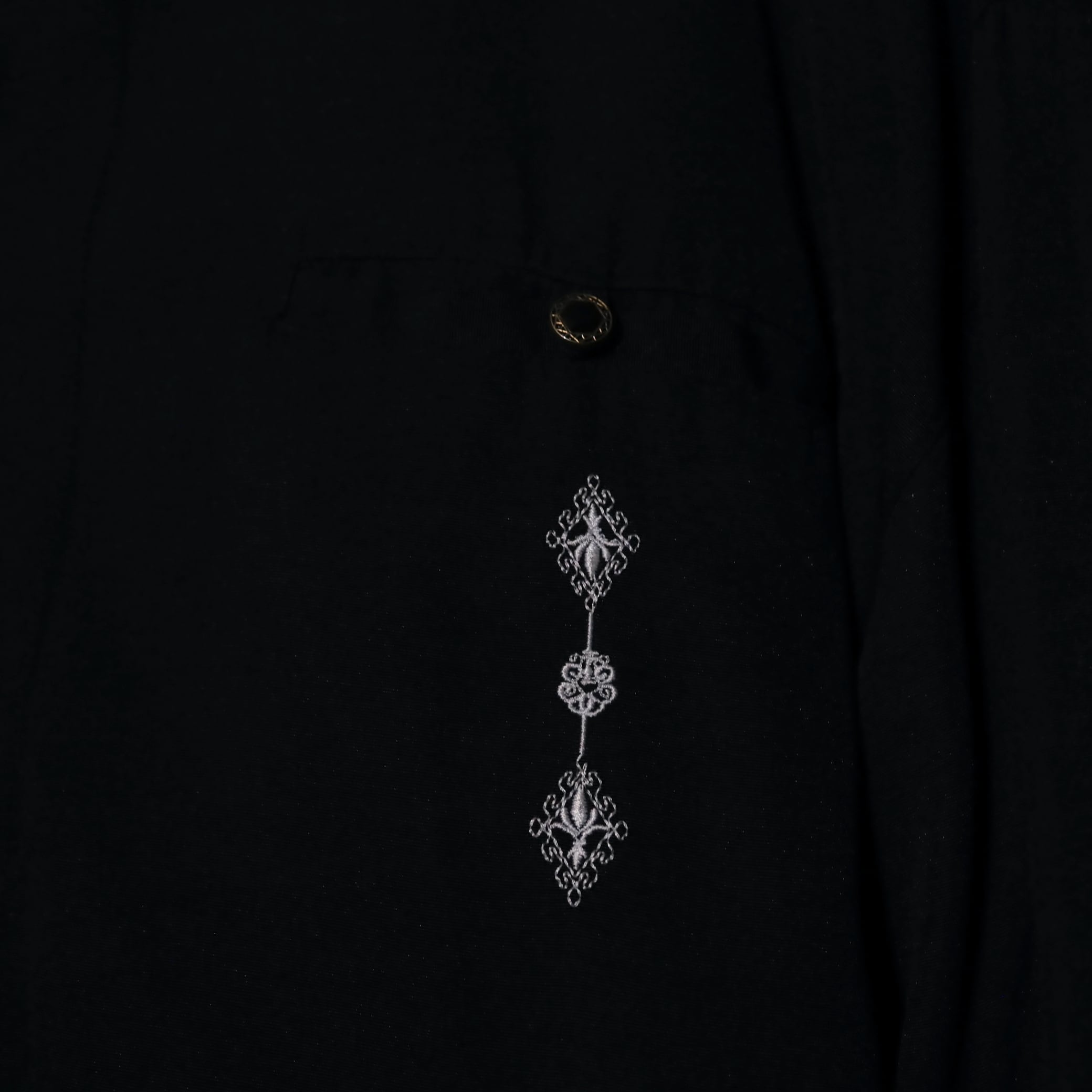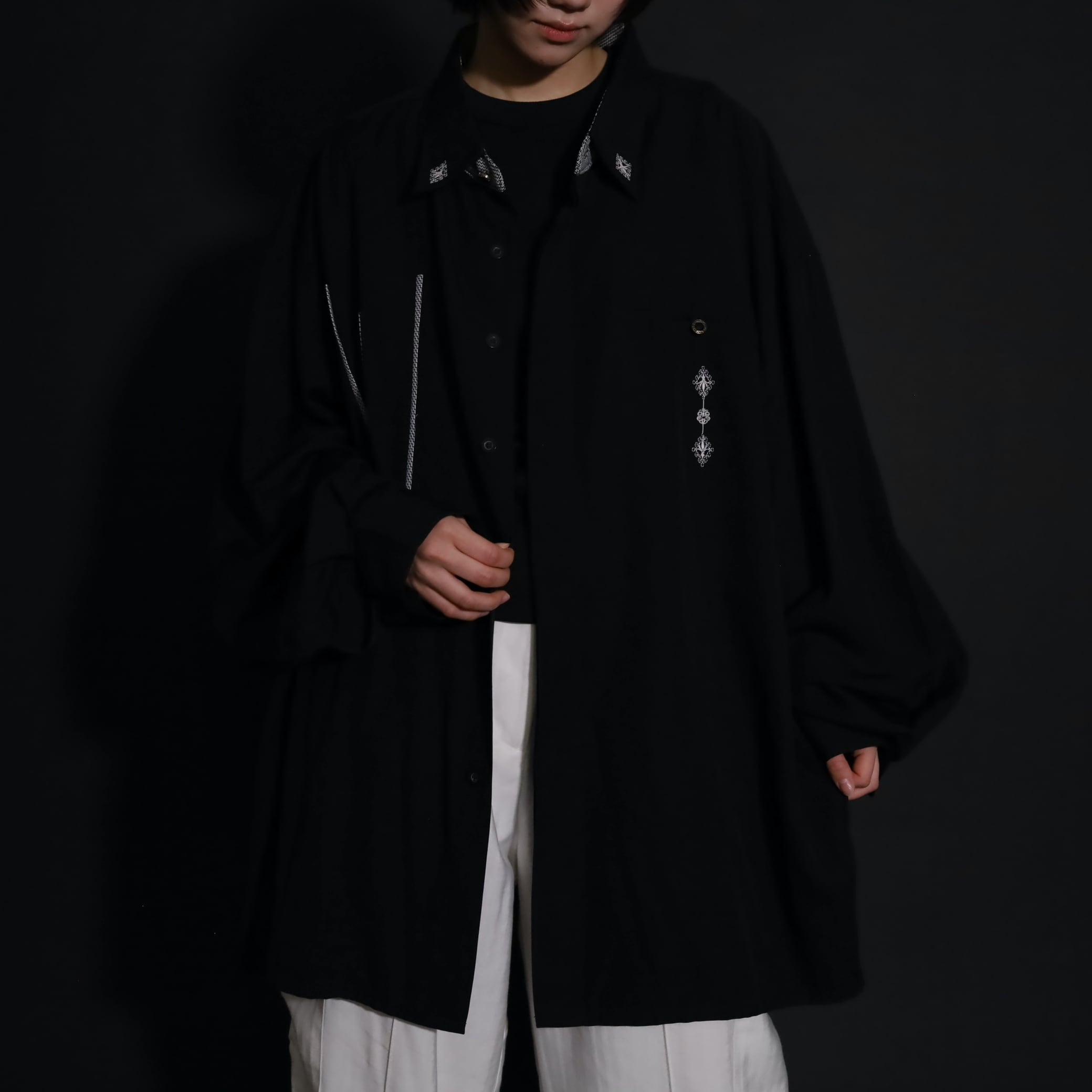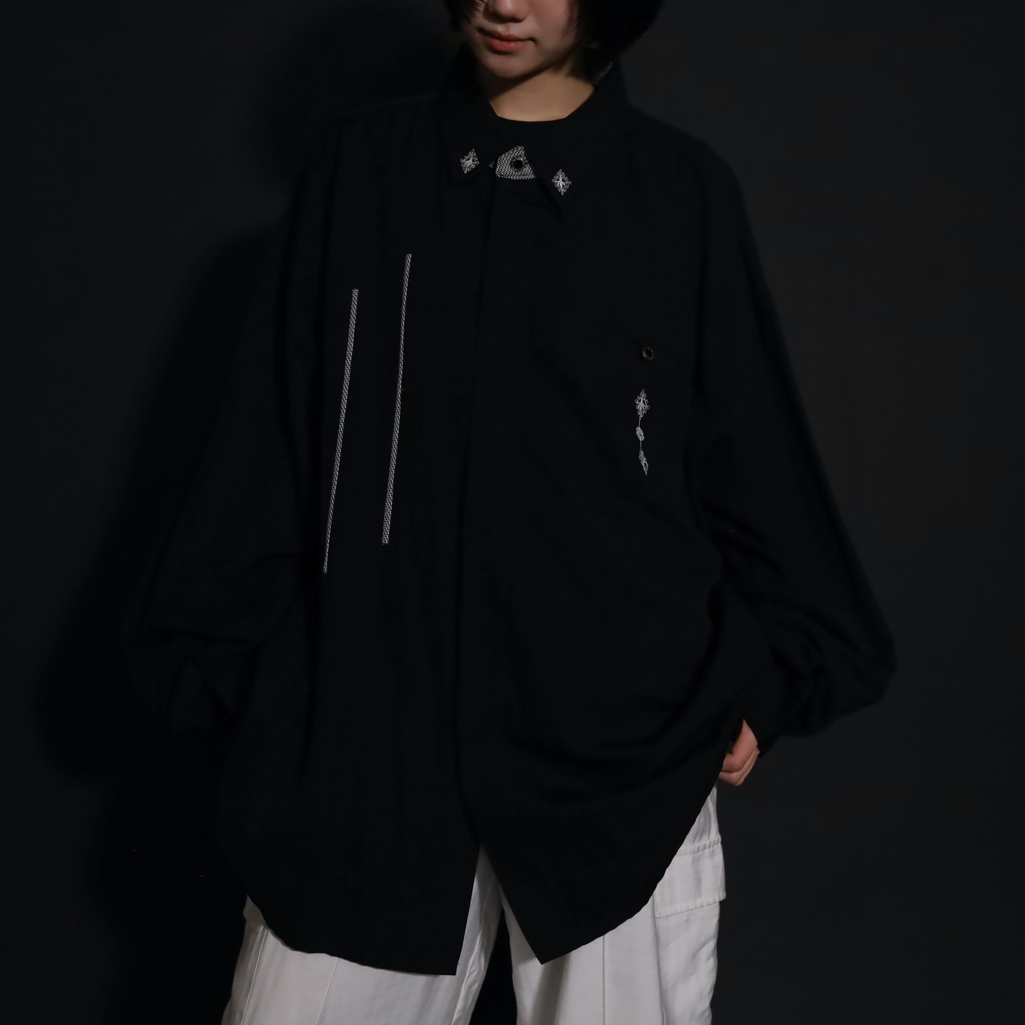 装飾が効いたブラックレーヨンシャツ.