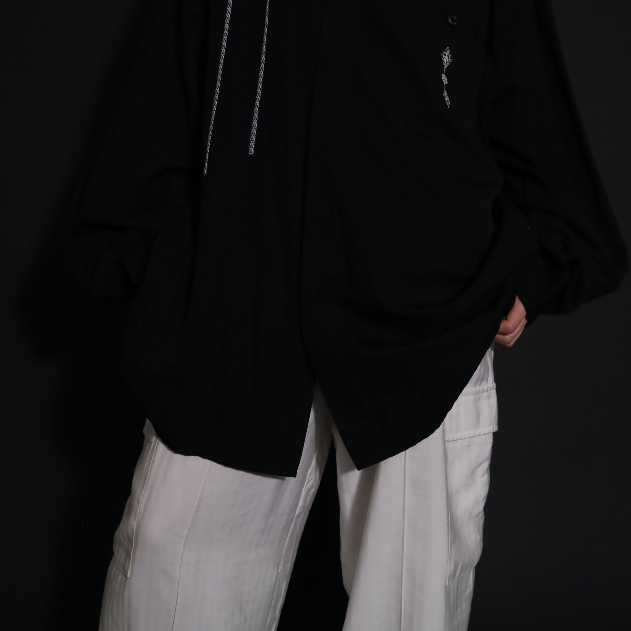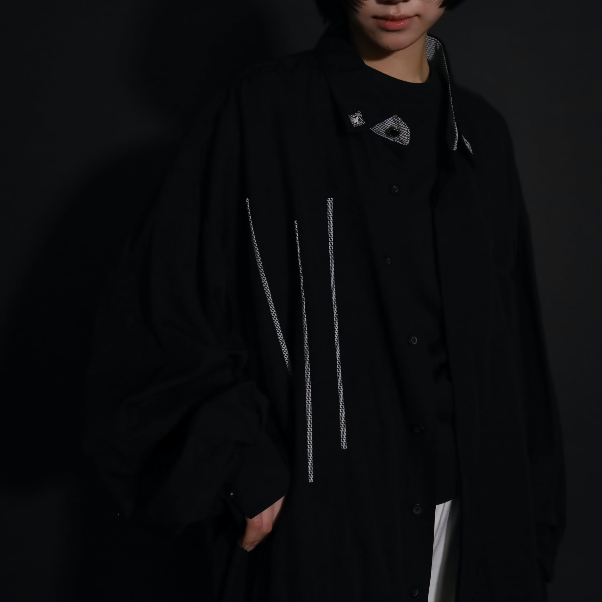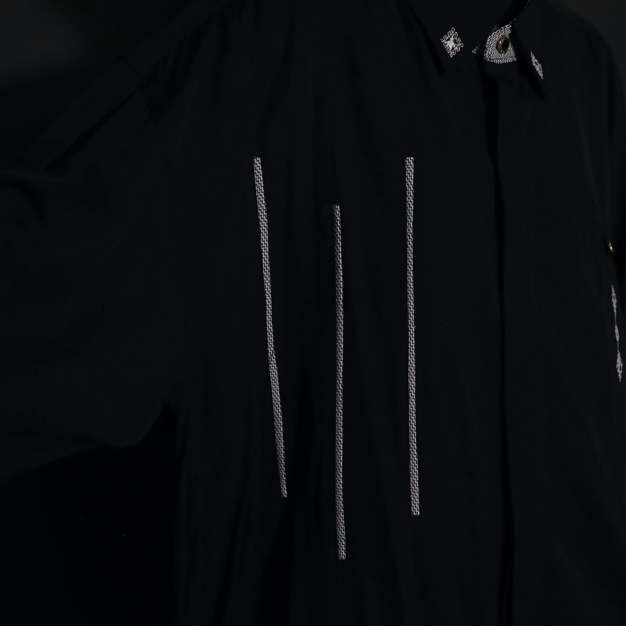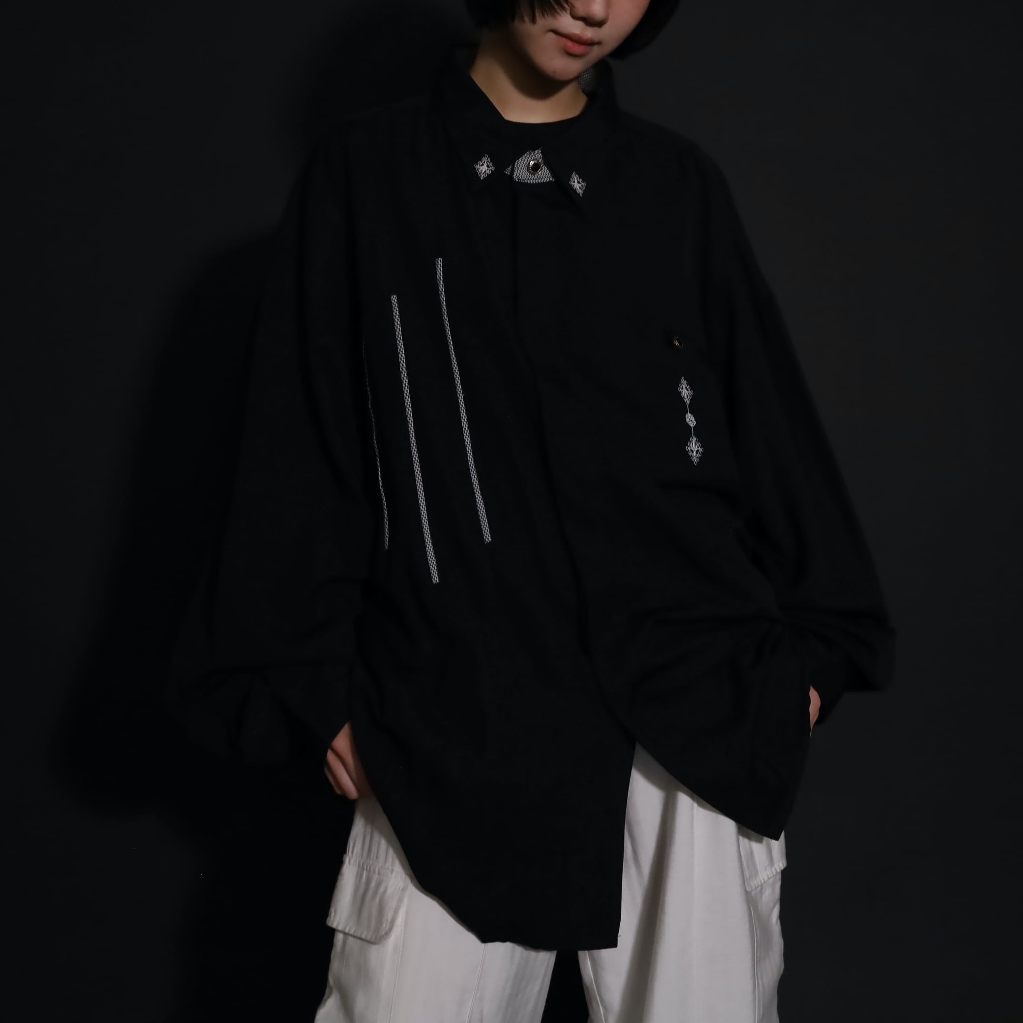 装飾が効いたブラックレーヨンシャツ.