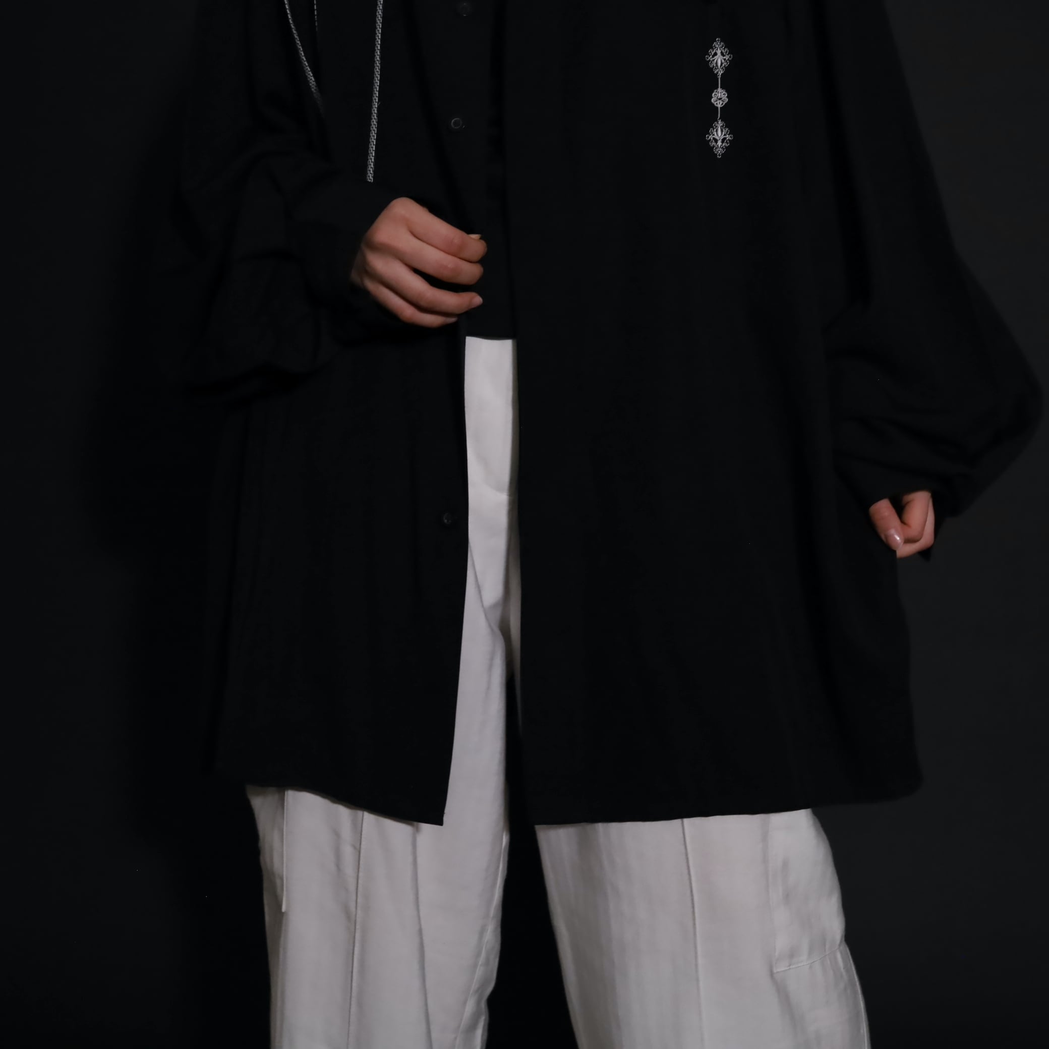 刺繍やボタンのデザインが凝った一枚,ゆったりとしたルーズなサイズ感も良し.