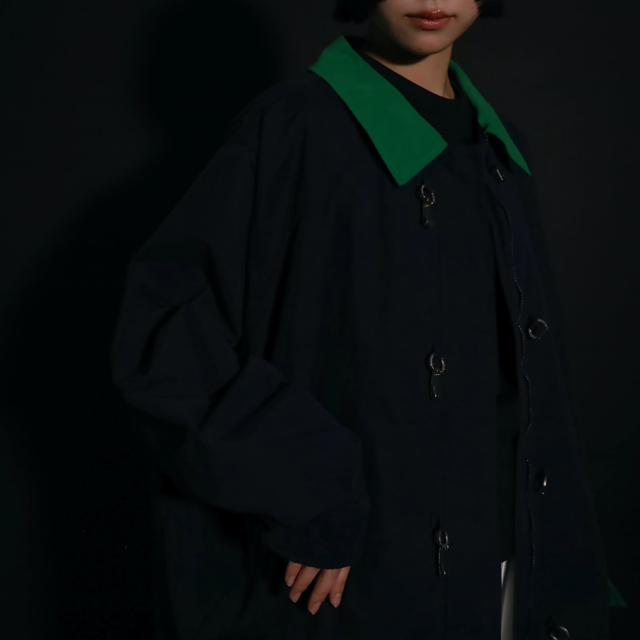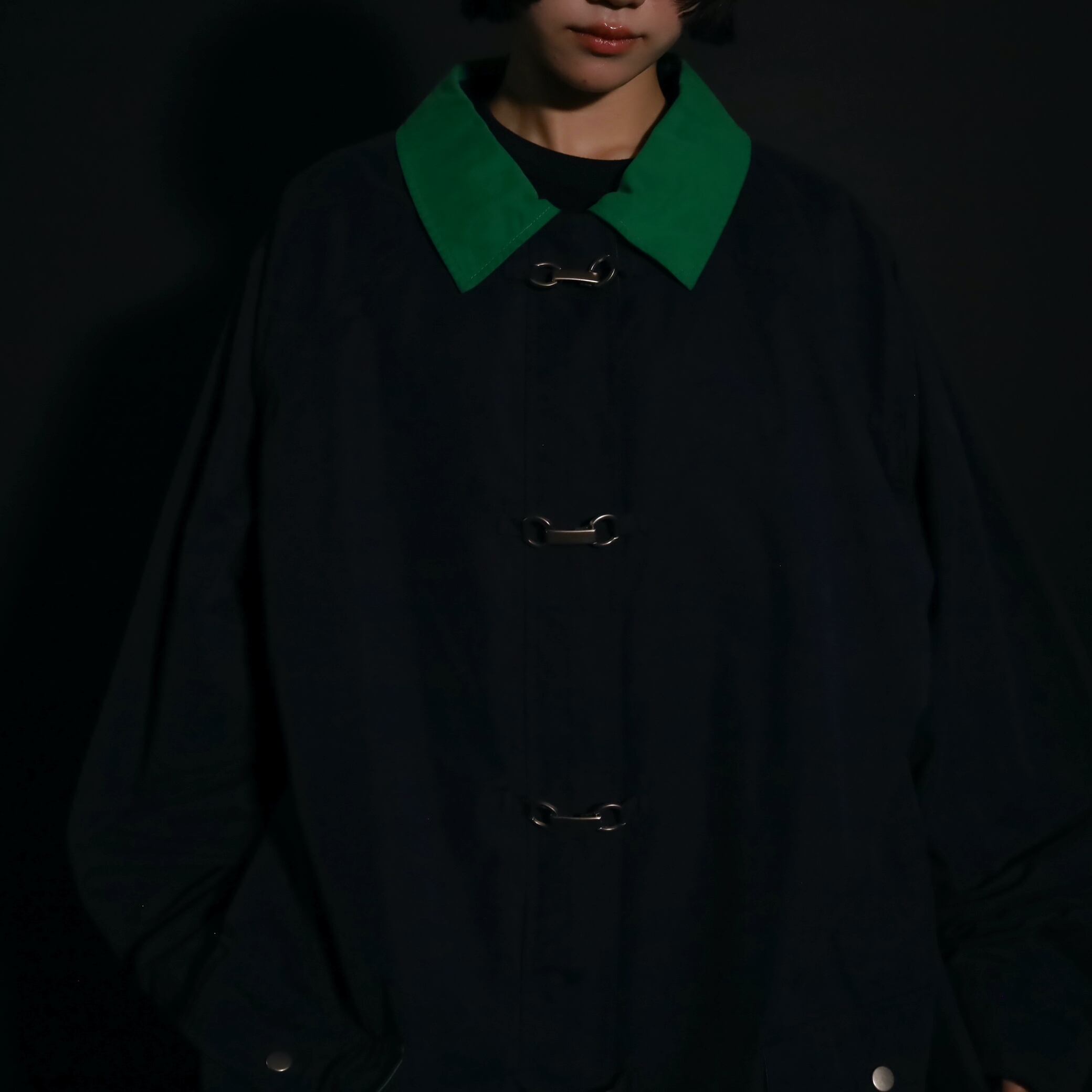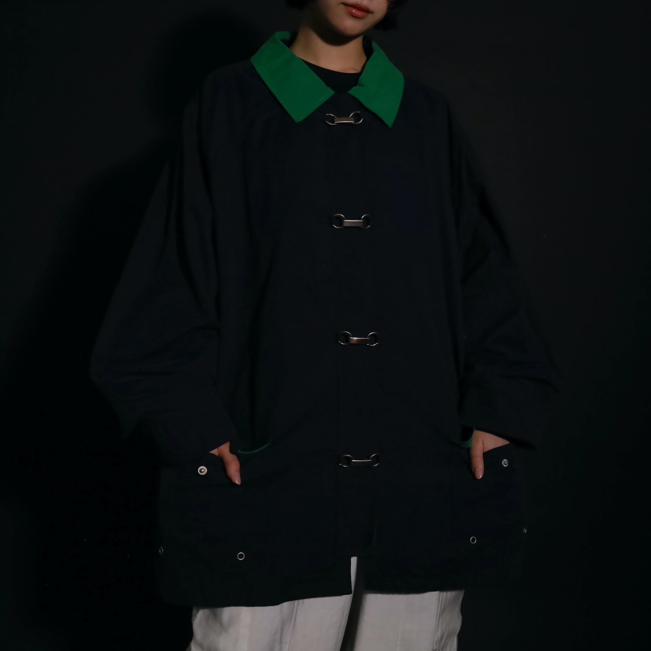 ネイビーカラーのボディをベースに,襟はグリーンカラーに切替わるバイカラーデザイン.