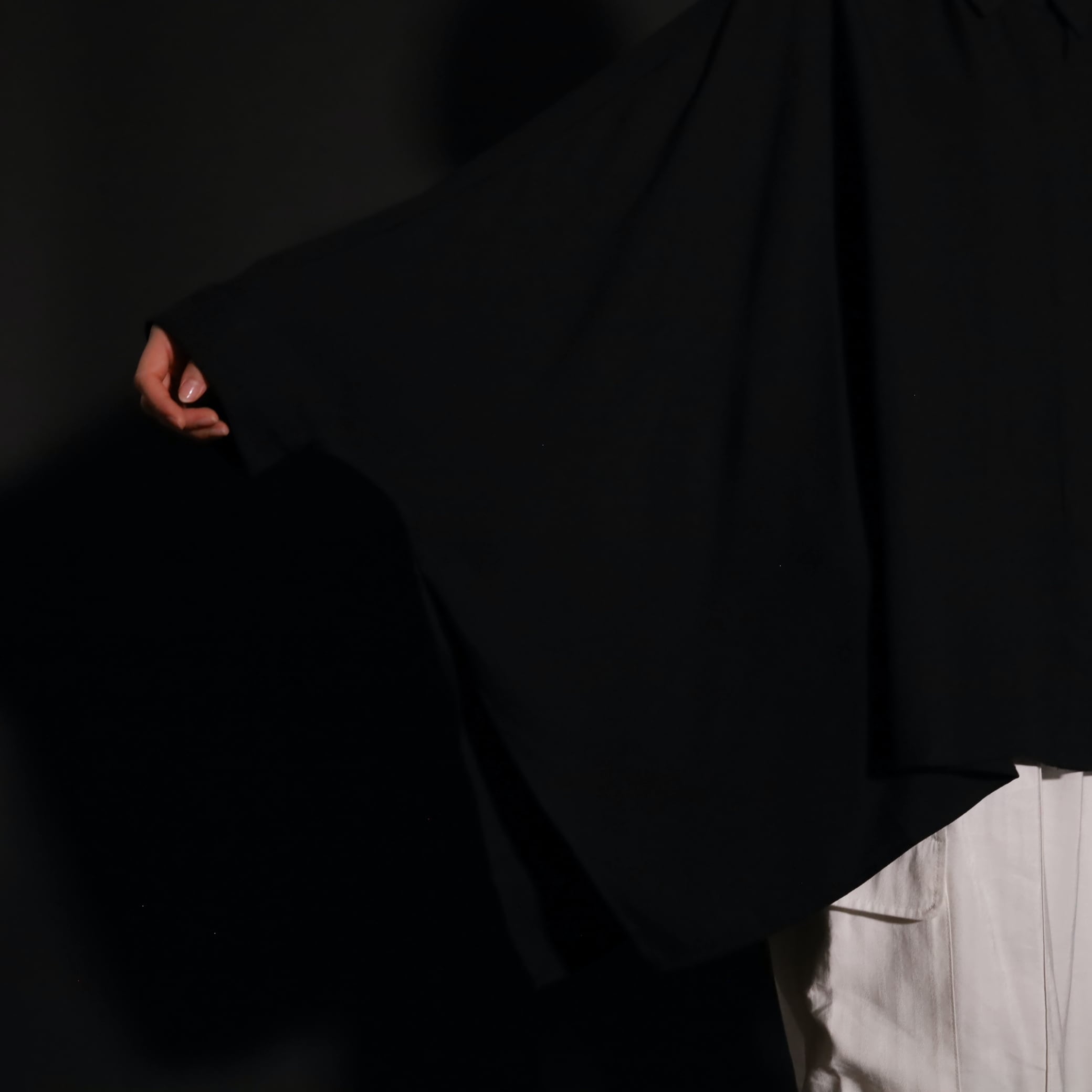 袖先から裾まで緩やかな弧を描くように繋がった,モモンガのような広がりのある形状.