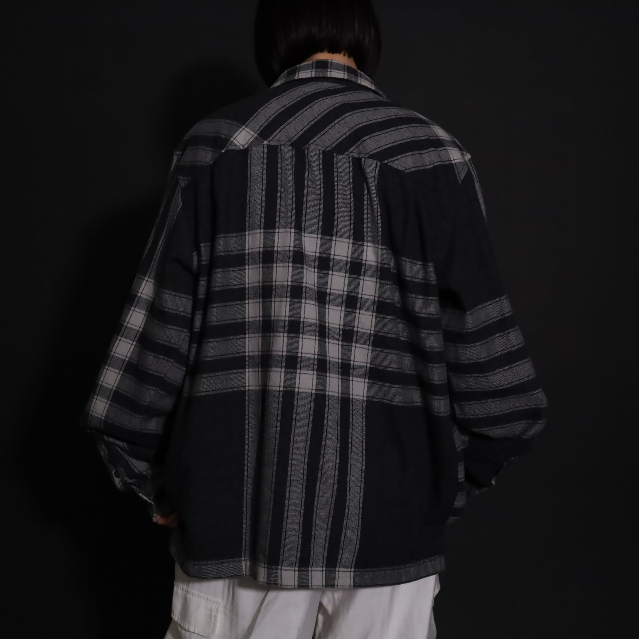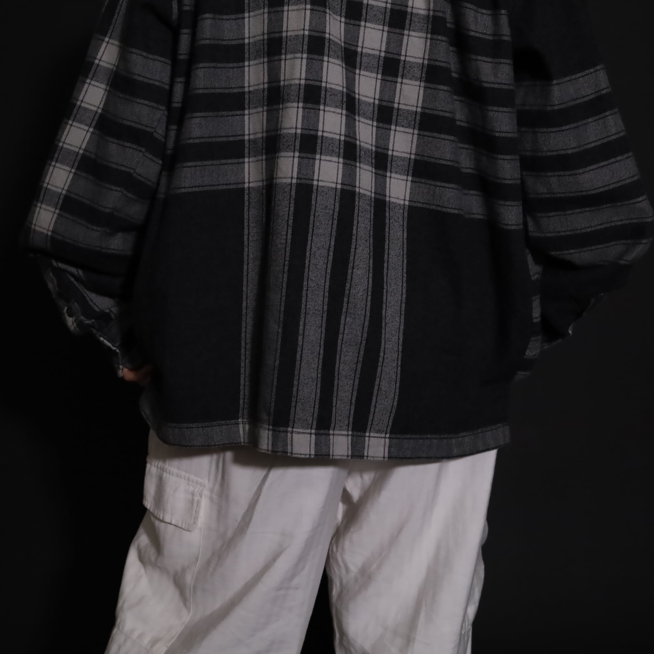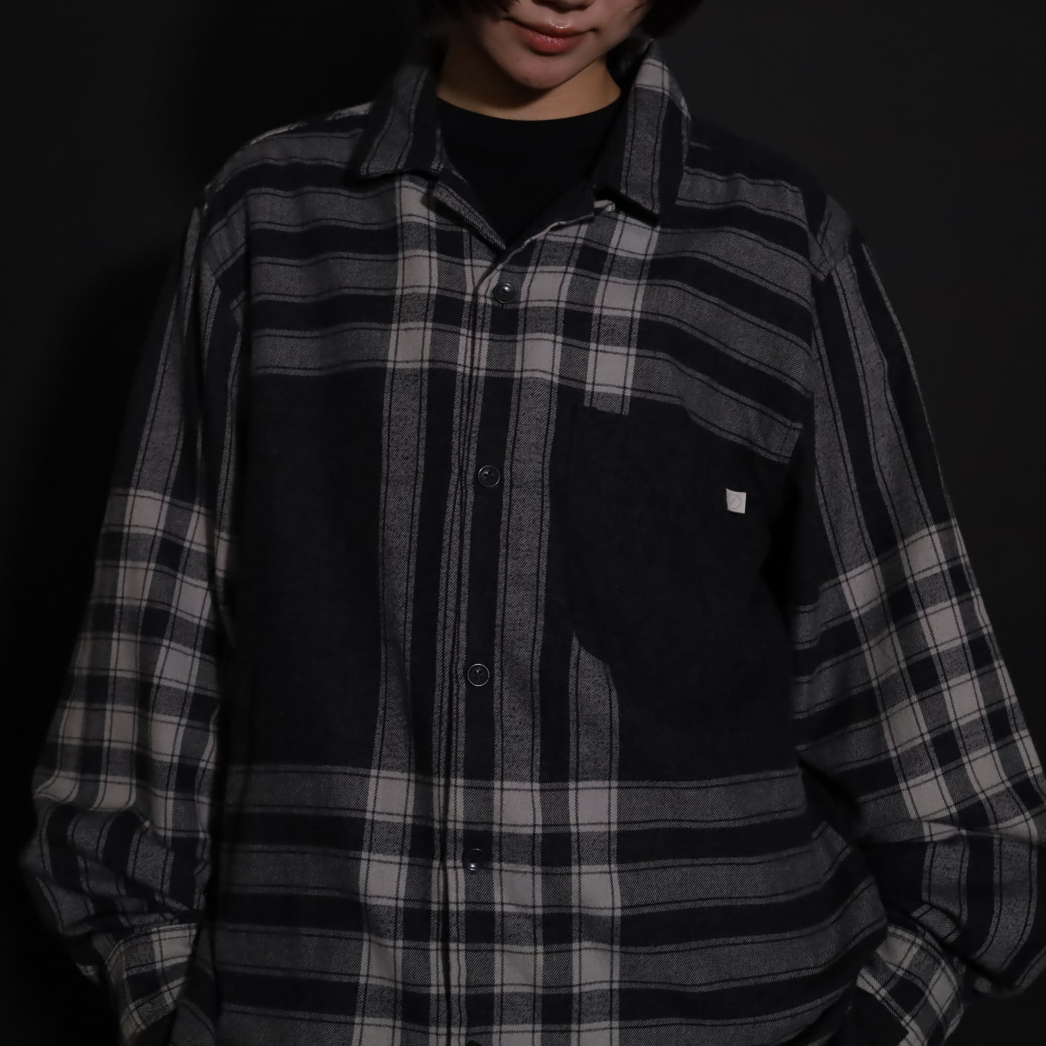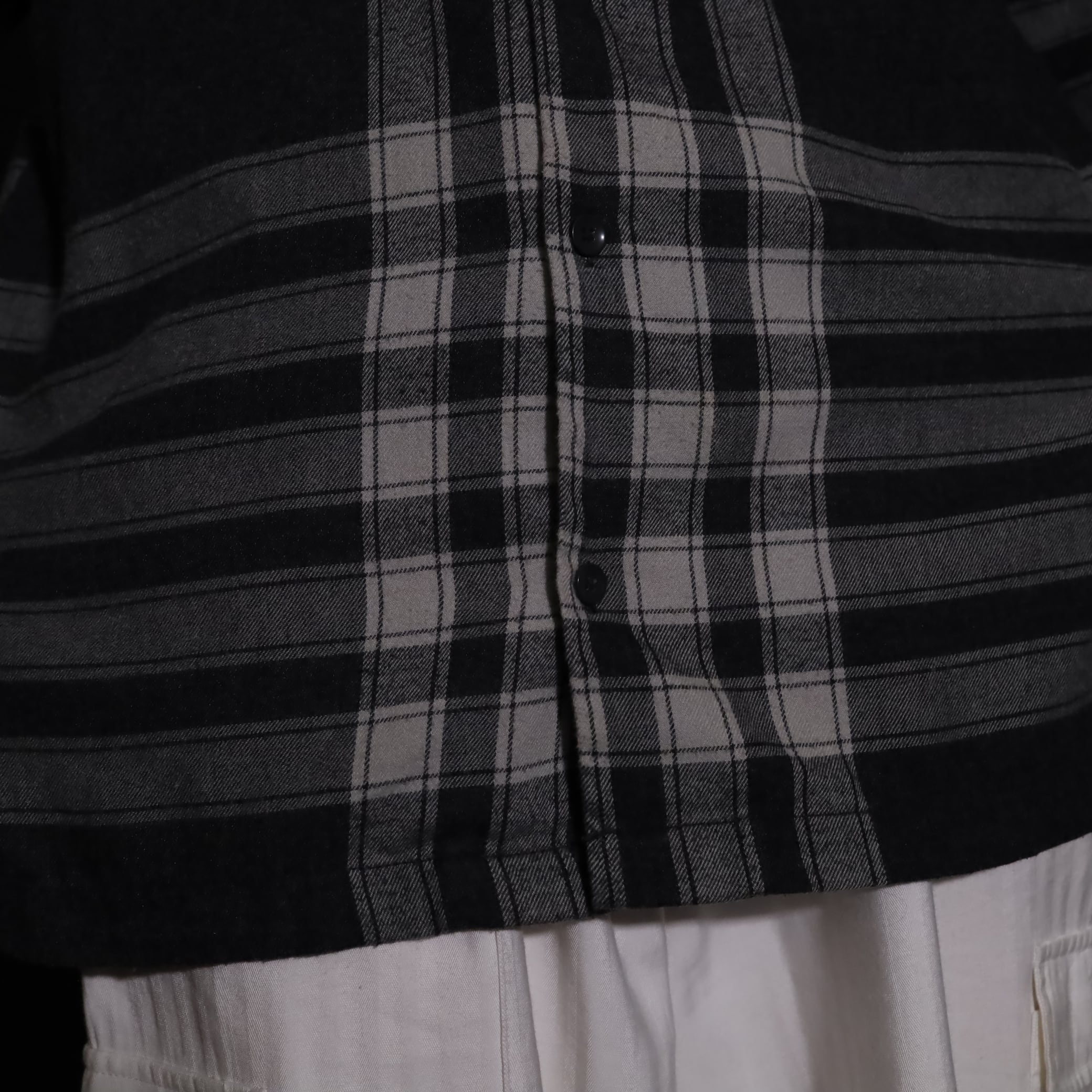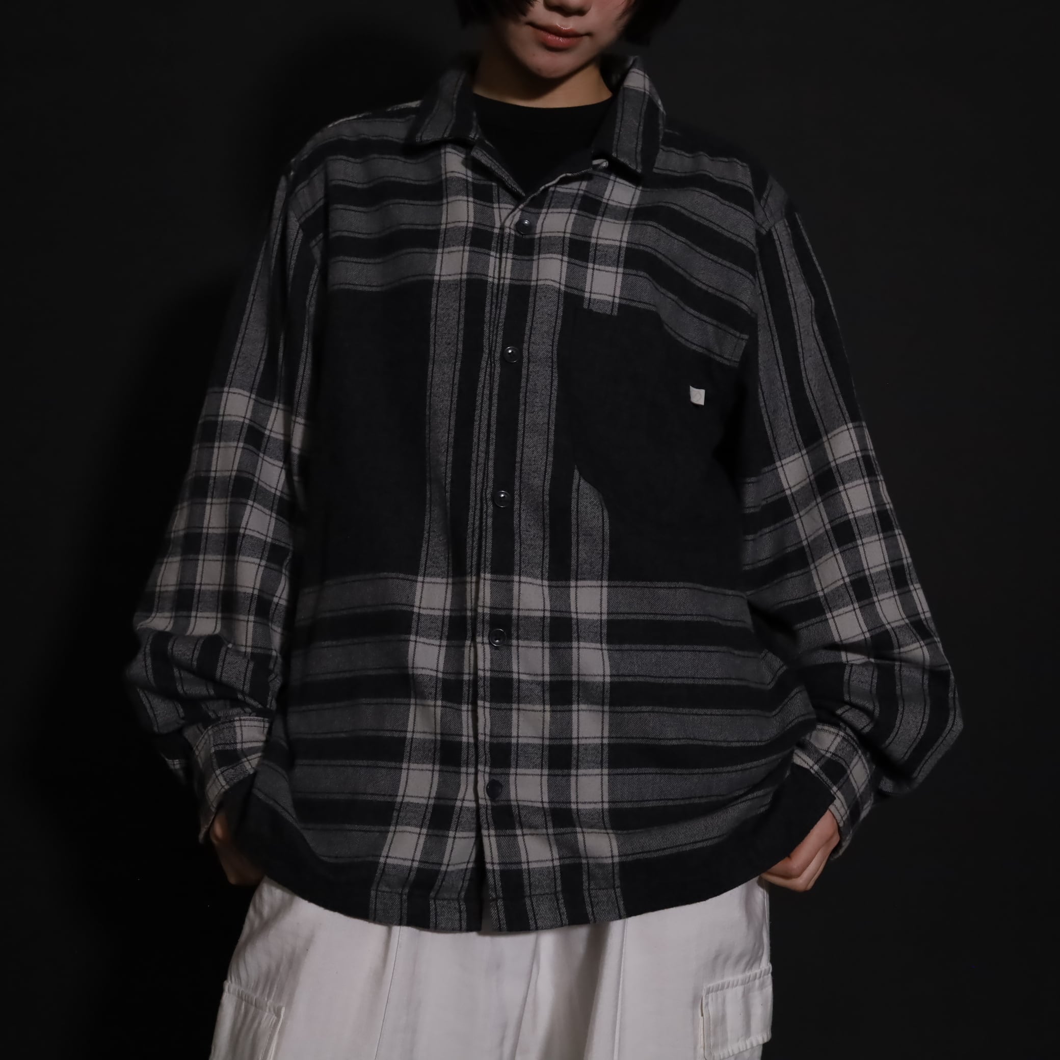 大きく分別すればチェック柄なのでしょうが,無地部分や縦横ラインのみの部分もあり,チェックシャツの中ではやや変わった印象の一枚.