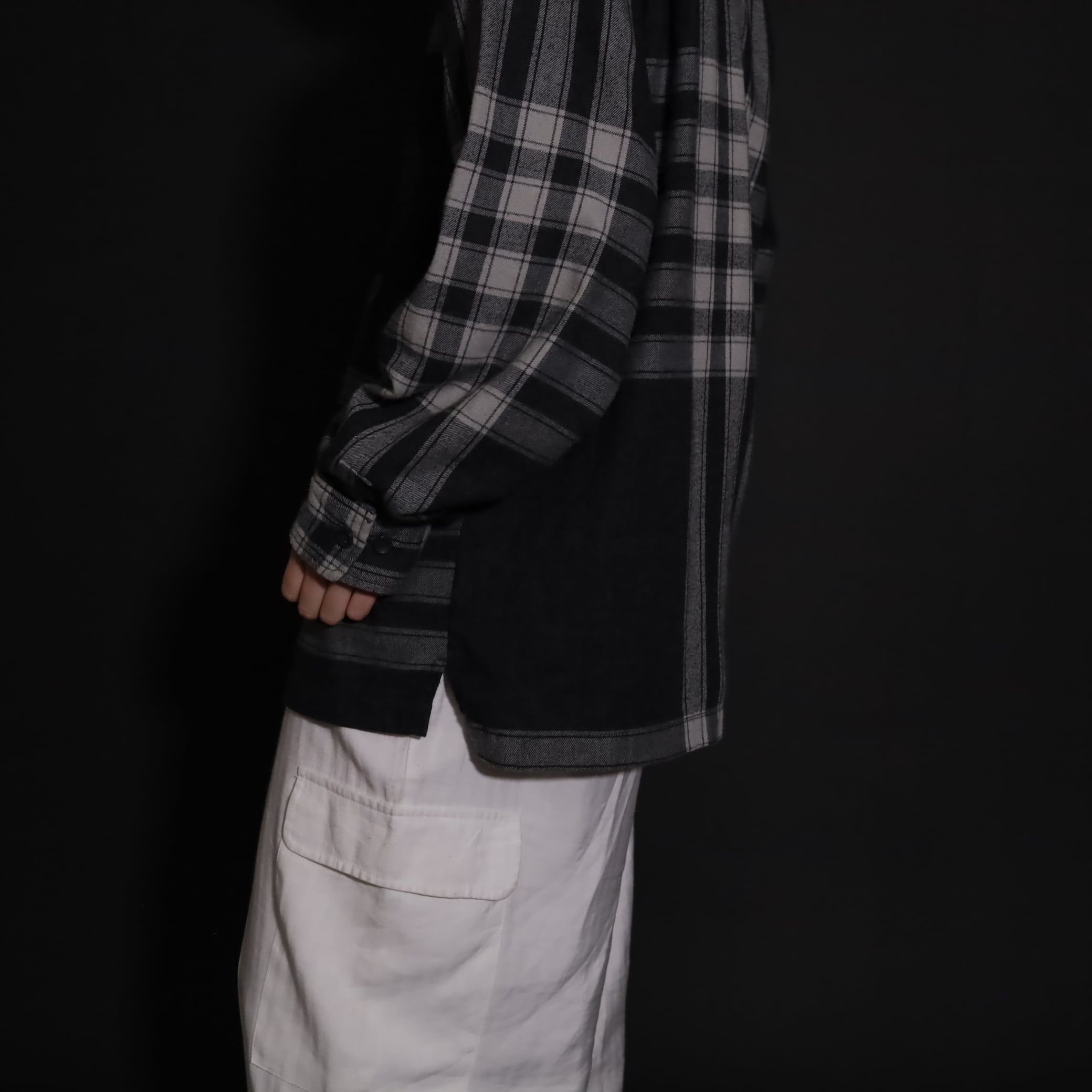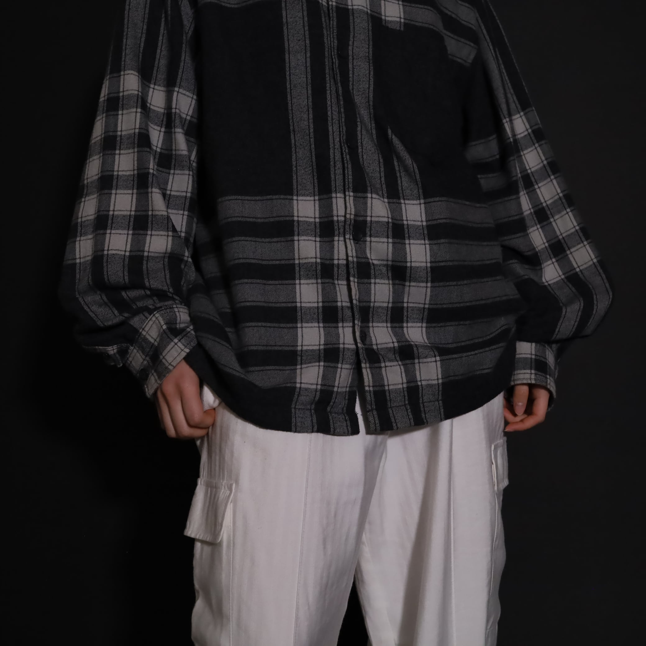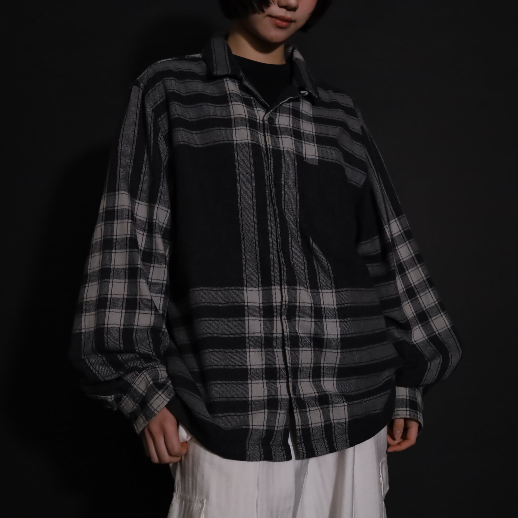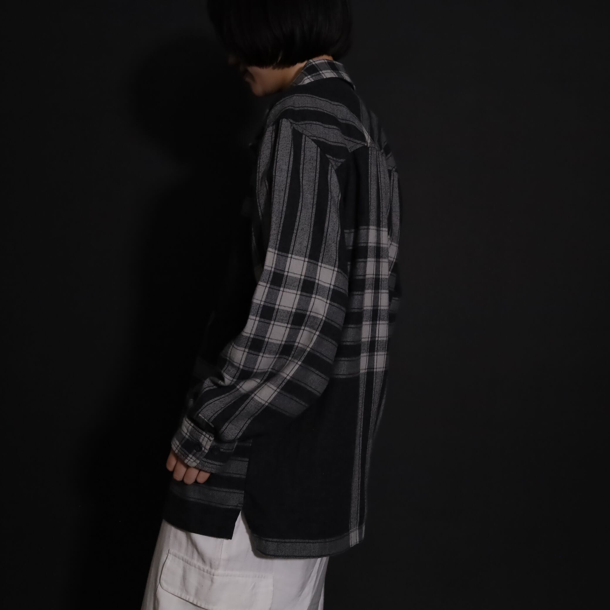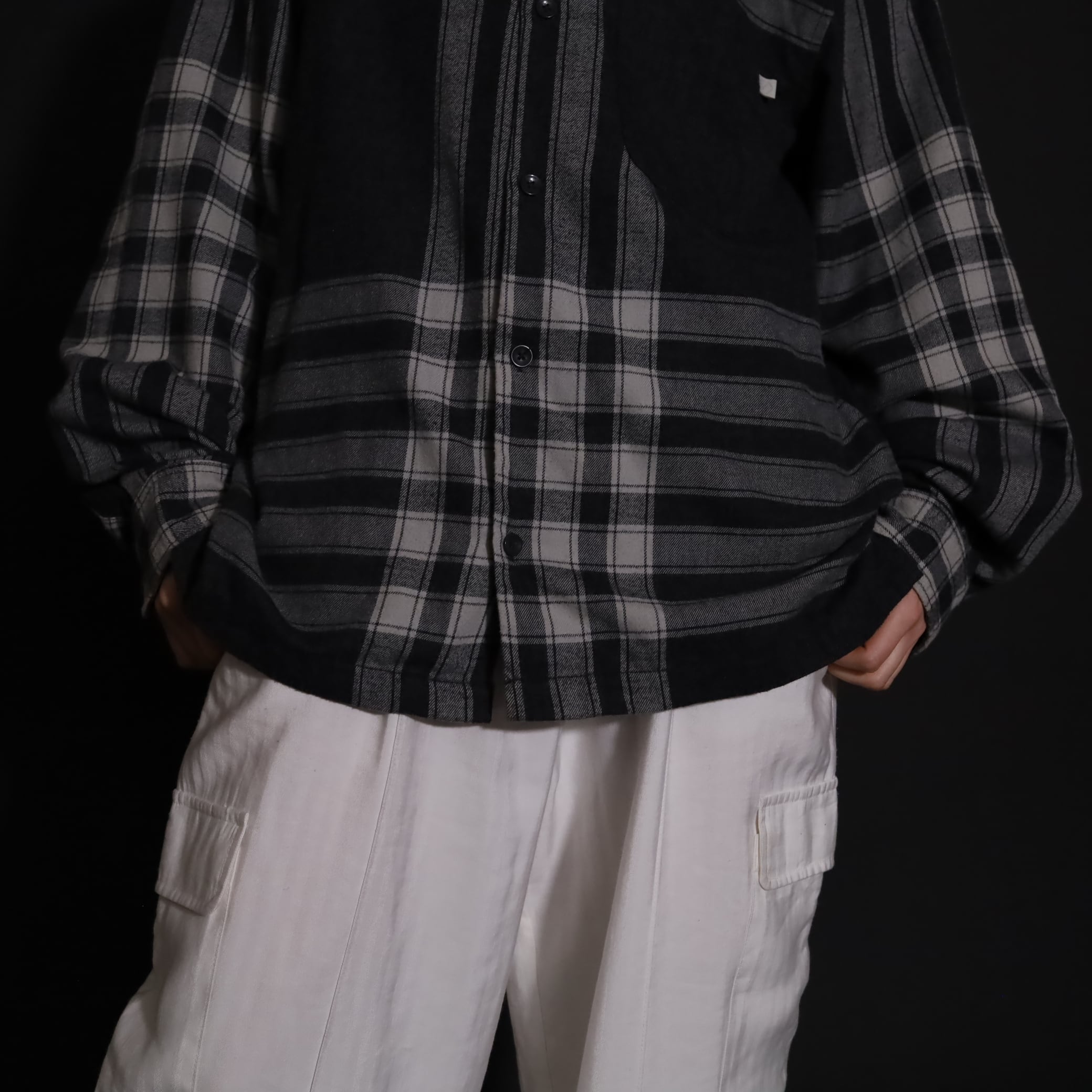 大きく分別すればチェック柄なのでしょうが,無地部分や縦横ラインのみの部分もあり,チェックシャツの中ではやや変わった印象の一枚.