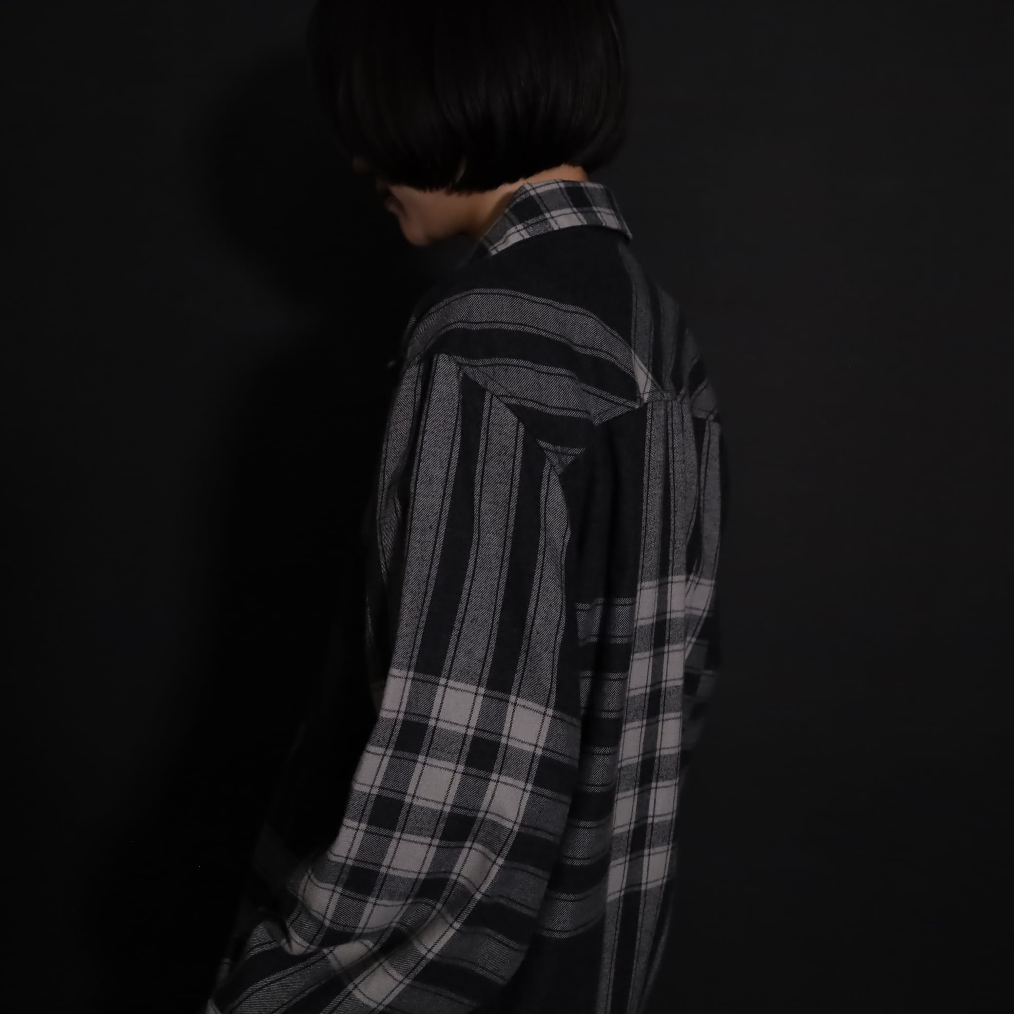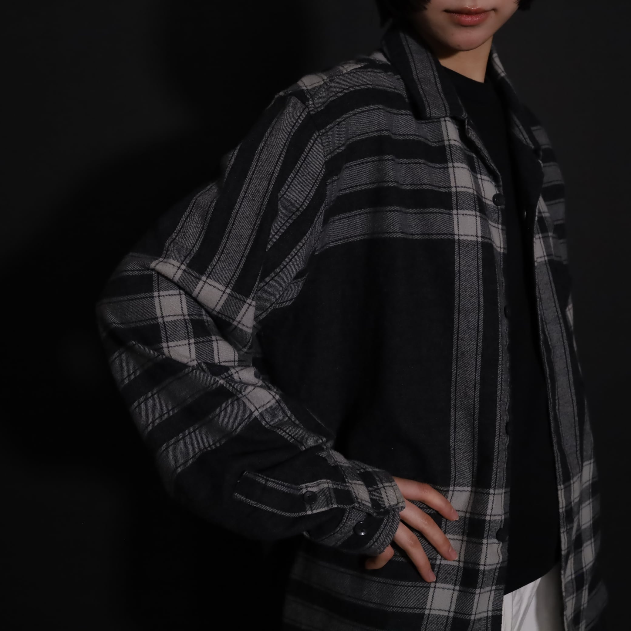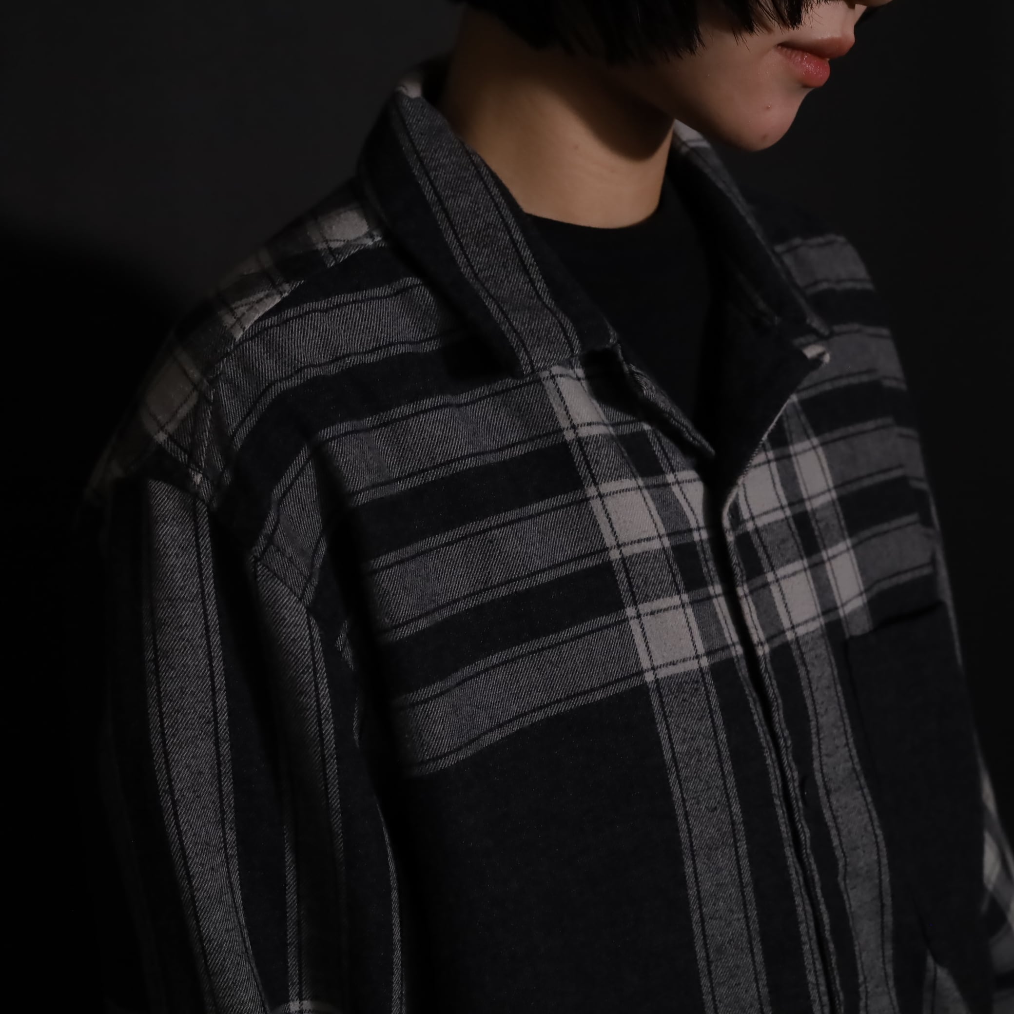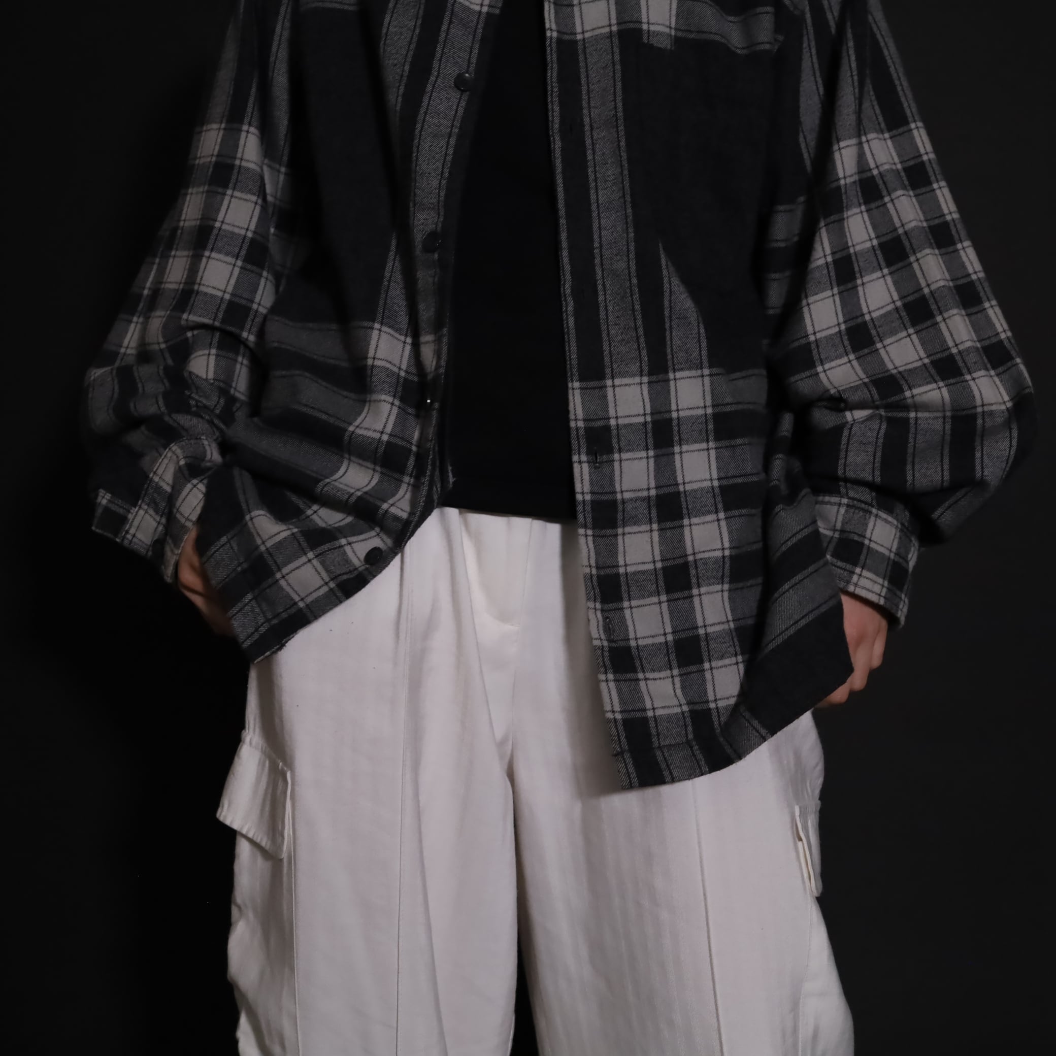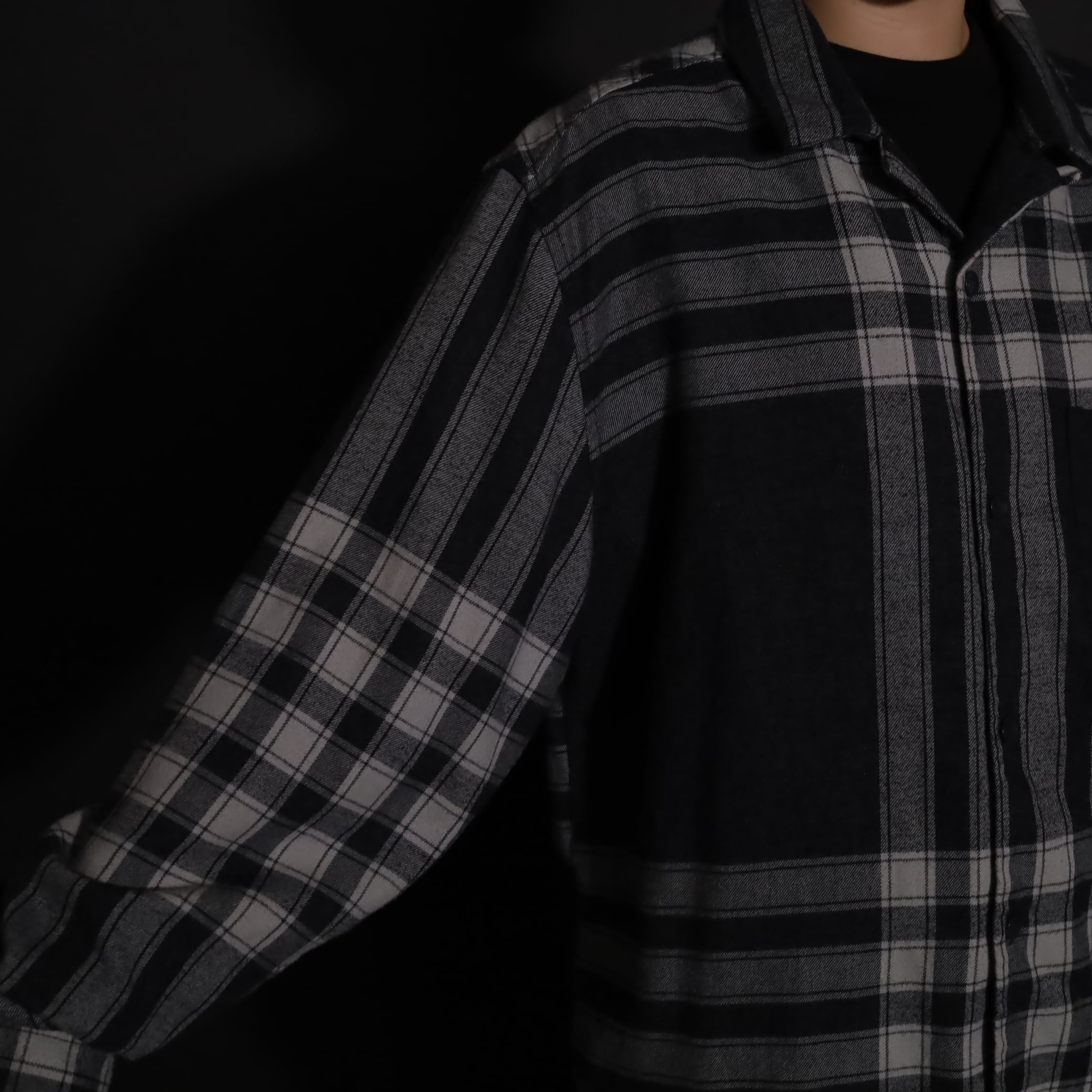 大きく分別すればチェック柄なのでしょうが,無地部分や縦横ラインのみの部分もあり,チェックシャツの中ではやや変わった印象の一枚.
